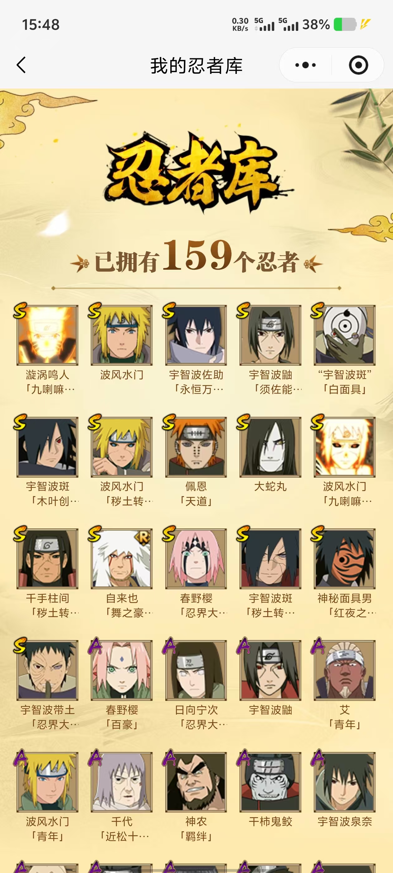 2228376-ios/16s忍/32a忍/战力836w/v10/区服553 【s忍者】 宇智波斑「秽土转生·解」,宇智波佐助「永恒万花筒」,神秘面具男「红夜之刃」,春野樱「忍界大战」,漩涡鸣人「九喇嘛连结」,宇智波斑「木叶创立」,宇智波带土「忍界大战」,千手柱间「秽土转生」,自来也「舞之豪杰」,宇智波斑「白面具」,波风水门「秽土转生」,宇智波鼬「须佐能乎」,佩恩「天道」,波风水门,大蛇丸,