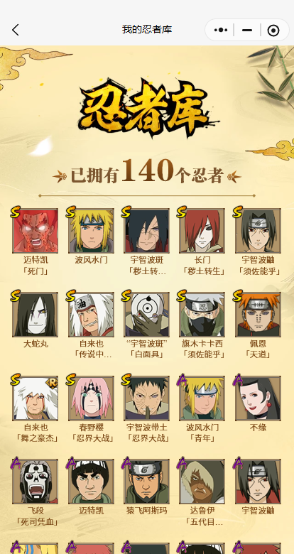13s忍/22a忍/战力697w/v2/区服2896 【s忍者】 宇智波斑「秽土转生·解」,春野樱「忍界大战」,迈特凯「死门」,宇智波带土「忍界大战」,自来也「舞之豪杰」,旗木卡卡西「须佐能乎」,自来也「传说中的三忍」,宇智波斑「白面具」,长门「秽土转生」,宇智波鼬「须佐能乎」,佩恩「天道」,波风水门,大蛇丸, 【a忍者】 不缘,漩涡博人「桃式显现」,旗木卡卡西「幻之真容」,李洛克「忍界大战」,蝎