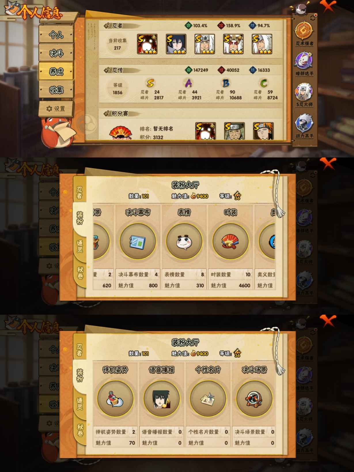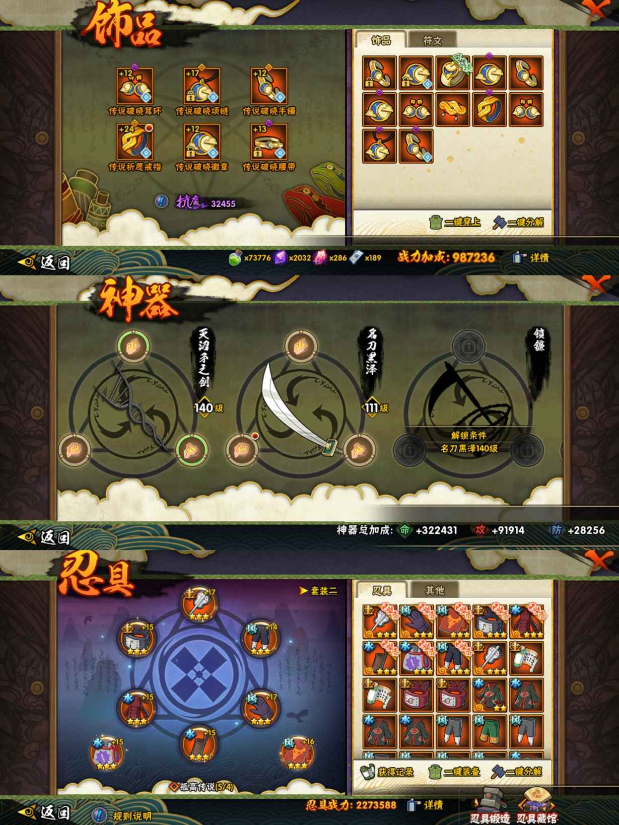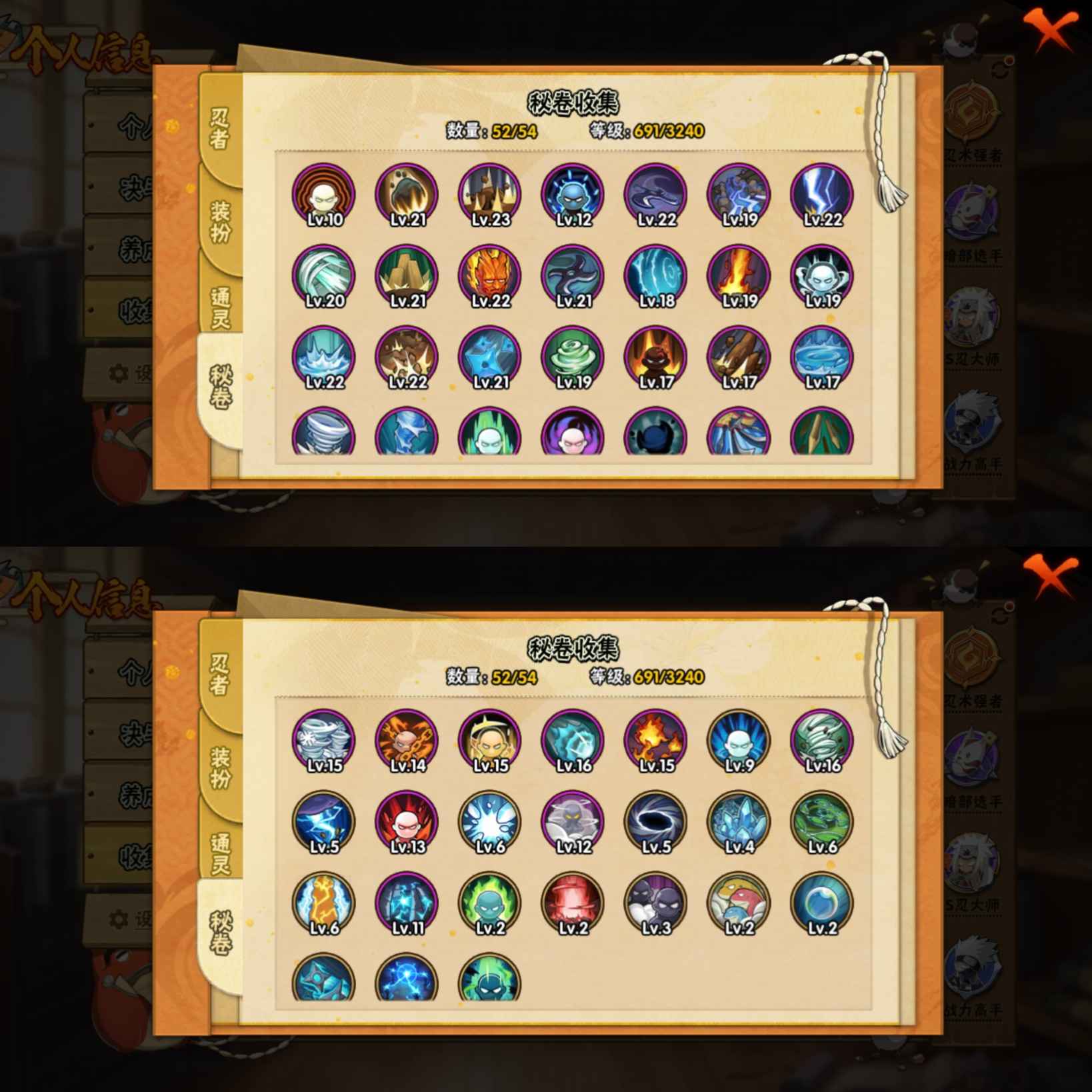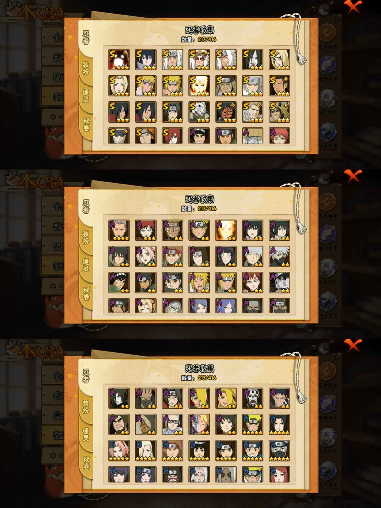 【24s忍者 44a忍者 20通灵】【安卓q-1023区-150级-v11-1235万战力】【s级】 鸣人暴怒六尾 永恒万花筒佐助 自来也 豪杰自来也 传说中的三忍自来也 大蛇丸 百豪纲手 纲手 波风水门 秽土水门 波风水门-九喇嘛连结 秽土日斩 秽土扉间 创立柱间 秽土斑 秽土解斑 须佐鼬 白面具 红夜带土 鬼灯幻月 秽土金银角 秽土无 佩恩 秽土长门 【a级】 凯 猿飞阿斯