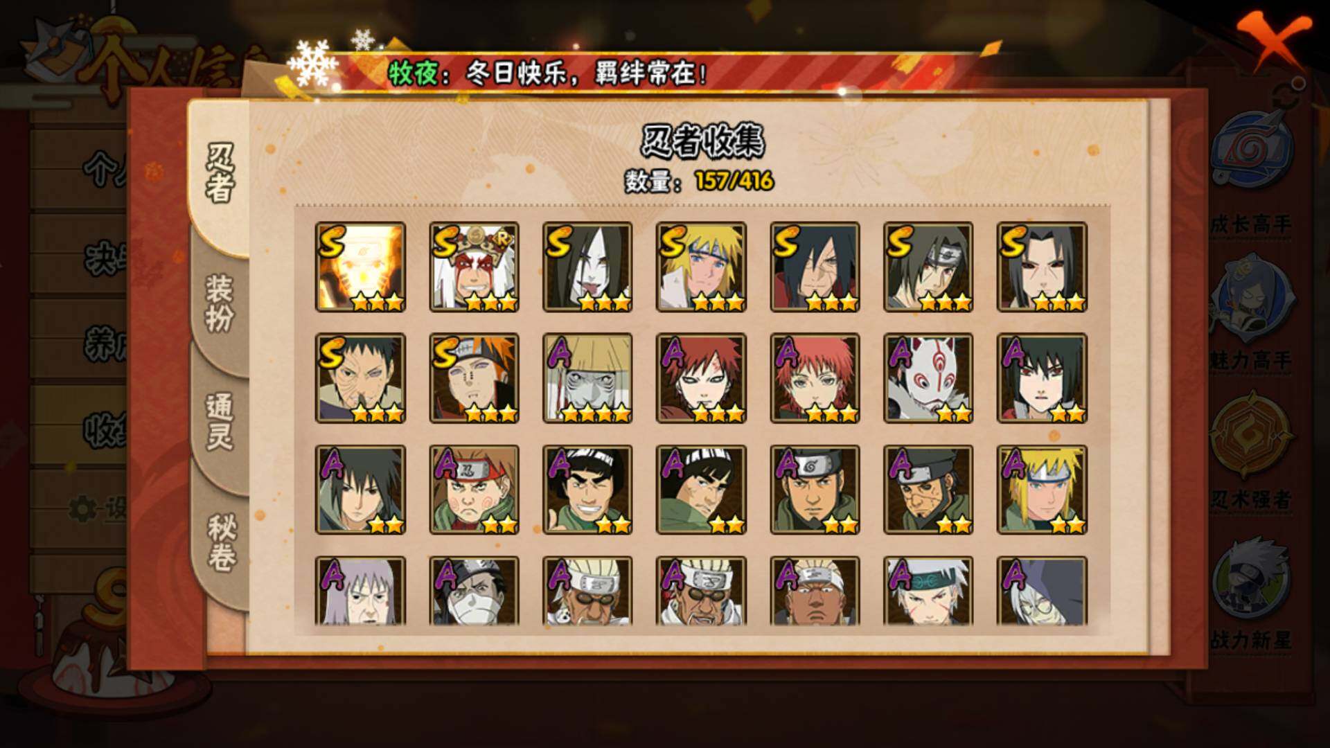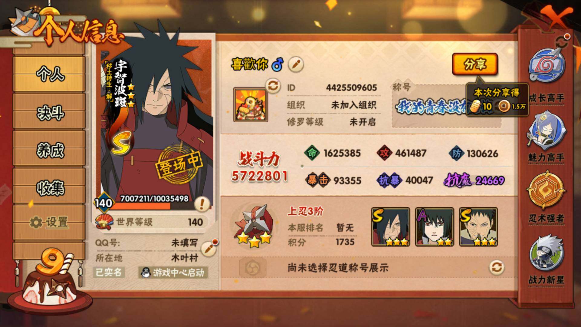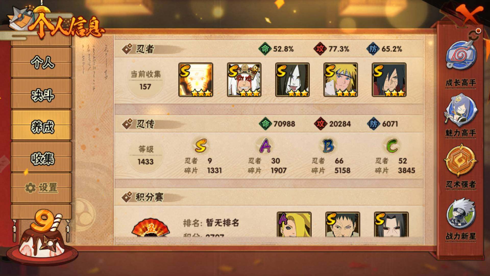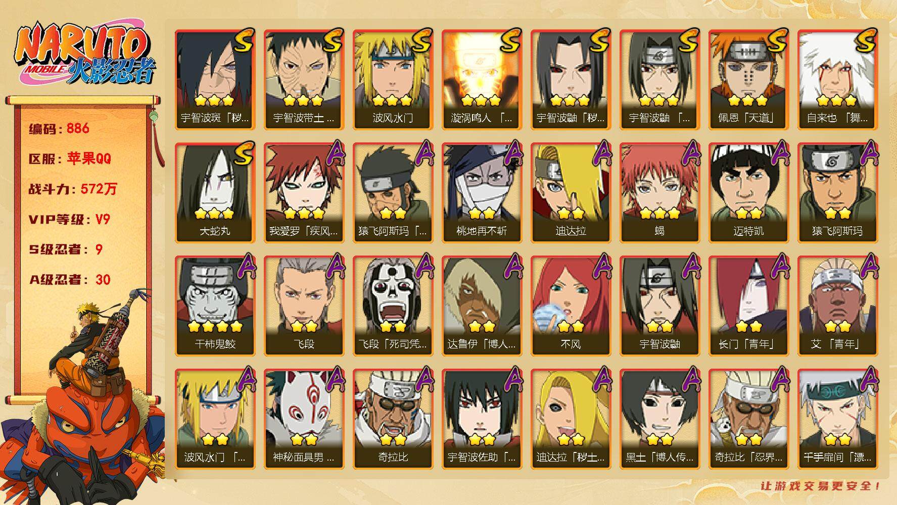 [14550104]v9 9s 30a 572万战力 点卷a面麻、秽土阿斯玛、漂泊扉间。侠隐兜等 yy1601 【s级忍者】:宇智波鼬「秽土转生」3星,宇智波斑「秽土转生·解」3星,宇智波带土「忍界大战」3星,宇智波鼬「须佐能乎」3星,自来也「舞之豪杰」3星,大蛇丸3星,波风水门3星,漩涡鸣人「九喇嘛连结」3星,佩恩「天道」3星 【a级忍者】:艾「青年」2星,长门「青年」2星,波风水门「青年」2星,达鲁伊「博人传」2星,迪达拉2星,迪达拉「秽土转生」2星,大蛇丸「晓」2星,奇拉比2星,奇拉比「忍界大战」2星,飞段2星,飞段「死司凭血」2星,干柿鬼鲛4星,漩涡博人「桃式显现」2星,迈特凯2星,桃地再不斩2星,我爱罗「疾风传」3星,蝎3星,猿飞阿斯玛2星,猿飞阿斯玛「秽土转生」2星,宇智波鼬2星,宇智波佐助「万花筒写轮眼」2星,药师兜「侠影江湖」2星,神秘面具男「忍者之路」2星,黑土「博人传」2星,千手扉间「漂泊武士」2星,秋道丁次「忍界大战」2星,千代「近松十人卫」2星,不风2星,宇智波泉奈2星,迈特凯「青春爆炸」2星