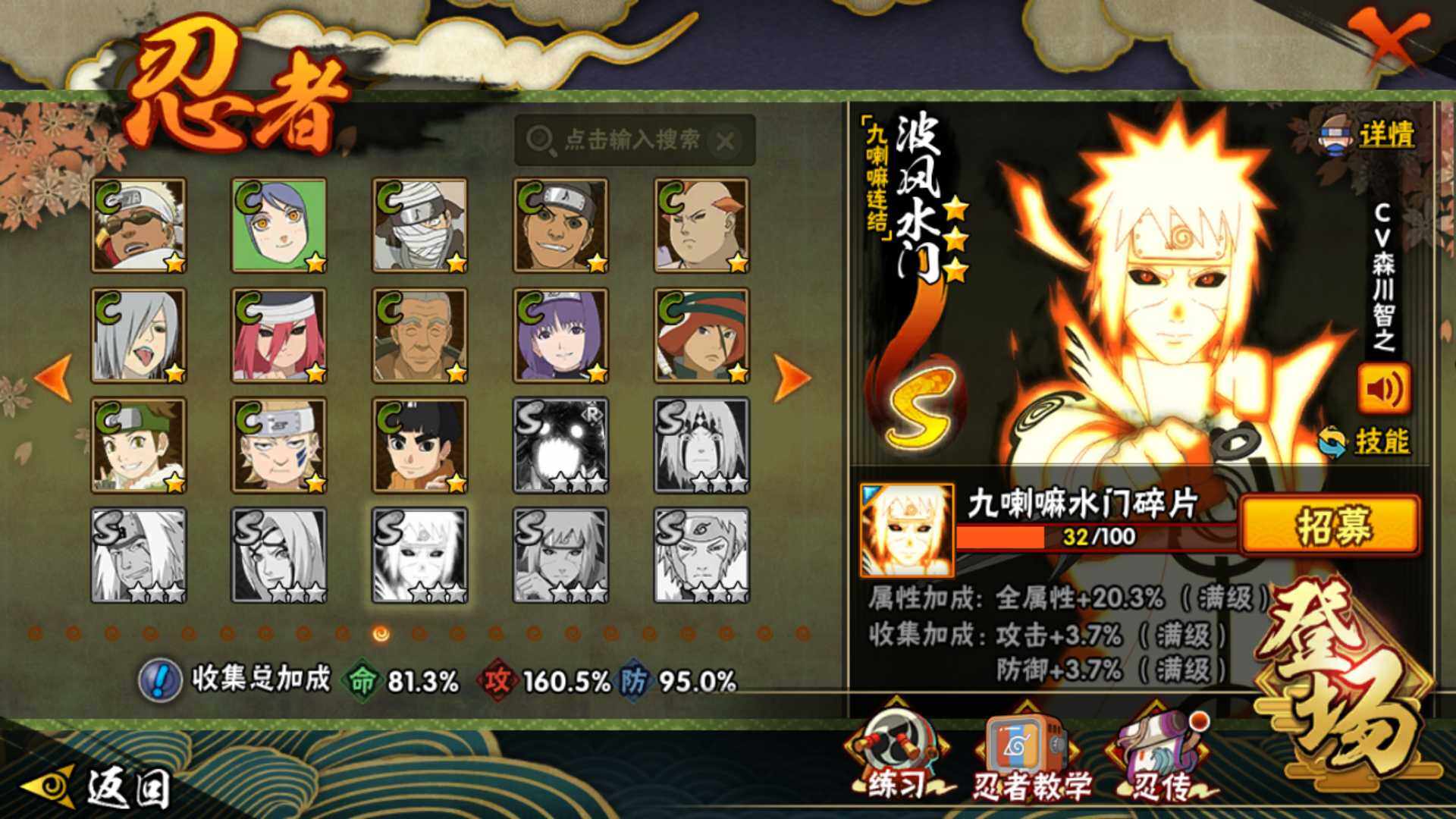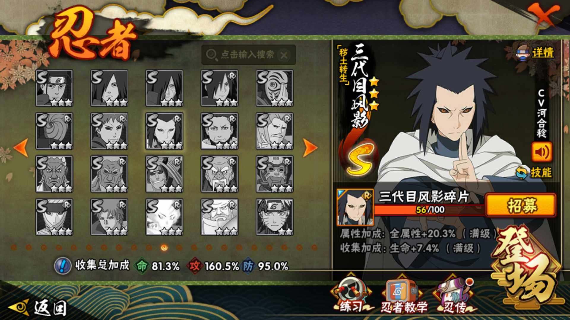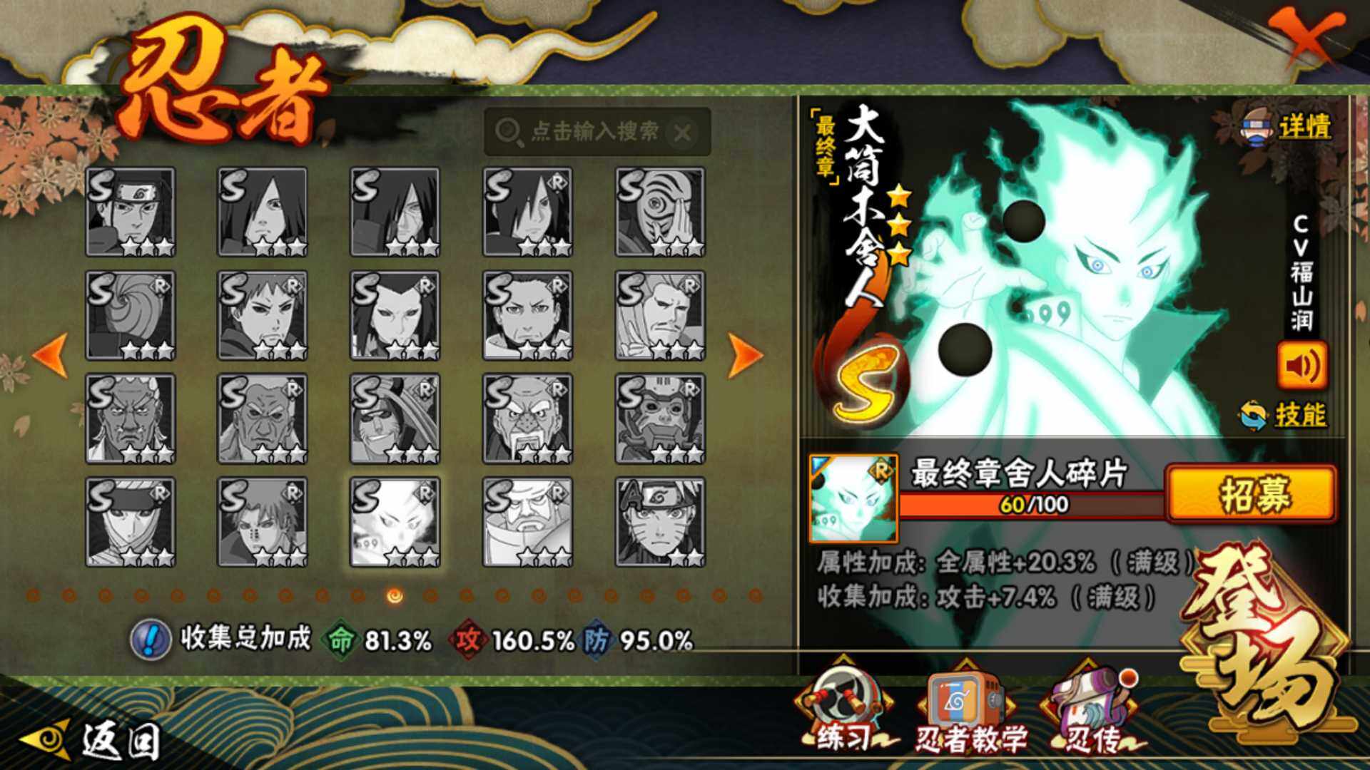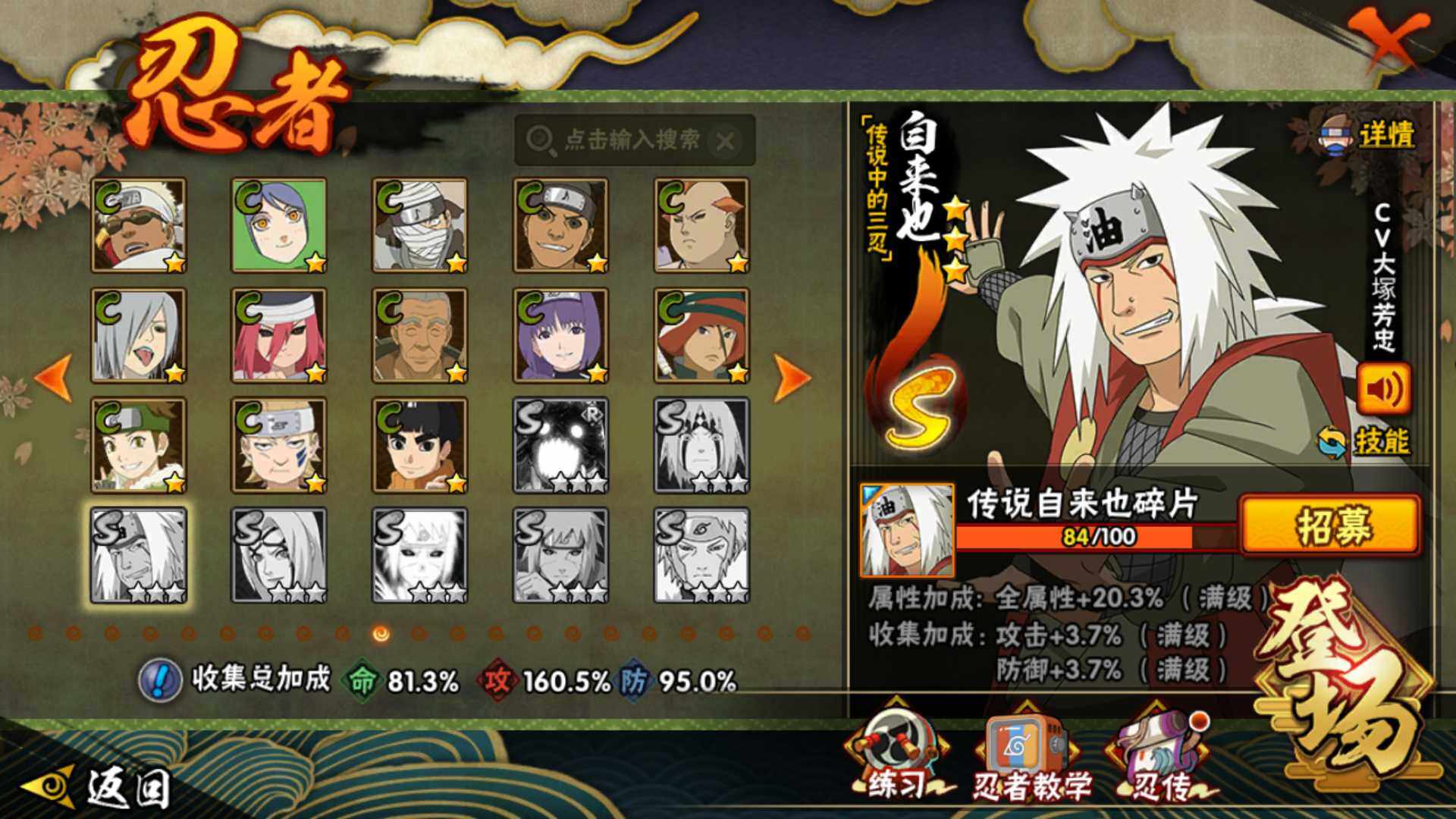 [14550976]v10,28s,34a,1285万战力,585点卷,800限时点卷,有熊猫。热门a忍有漂泊小南、秽土角都等。碎片传说自来也84片,无40片,三代风影56片,舍人60片,yy1528 【s级忍者】:长门「秽土转生」3星,猿飞日斩「秽土转生」3星,千手扉间「秽土转生」3星,千手柱间「秽土转生」3星,宇智波鼬「秽土转生」3星,宇智波斑「秽土转生·解」3星,大野木「忍界大战」3星,宇智波带土「忍界大战」3星,艾「忍界大战」3星,宇智波鼬「须佐能乎」3星,宇智波止水「须佐能乎」3星,旗木卡卡西「须佐能乎」3星,千手柱间「木叶创立」3星,自来也3星,自来也「仙人模式」3星,自来也「舞之豪杰」3星,大蛇丸3星,纲手4星,猿飞日斩3星,波风水门3星,药师兜「仙人模式」3星,神秘面具男「红夜之刃」3星,漩涡鸣人「九喇嘛连结」3星,迈特凯「死门」3星,佩恩「天道」3星,宇智波佐助「永恒万花筒」3星,宇智波斑 「白面具」3星宇智波斑「白面具」,大筒木桃式3星 【a级忍者】:艾「青年」2星,波风水门「青年」2星,达鲁伊「博人传」2星,迪达拉「秽土转生」2星,大蛇丸「晓」2星,奇拉比「忍界大战」2星,飞段3星,飞段「死司凭血」2星,干柿鬼鲛5星,漩涡博人「桃式显现」2星,漩涡鸣人「九尾查克拉」2星,迈特凯5星,我爱罗「疾风传」3星,蝎4星,蝎「绯流琥」2星,小南「漂泊浪客」2星,角都「秽土转生」2星,猿飞阿斯玛5星,宇智波止水2星,宇智波鼬2星,宇智波佐助「须佐能乎」2星,宇智波佐助「万花筒写轮眼」2星,药师兜「半蛇斗篷」2星,照美冥「五代目水影」2星,日向宁次「忍界大战」2星,日向雏田「最终章」2星,长十郎「六代目水影」2星,李洛克「忍界大战」2星,猿飞木叶丸「博人传」2星,黑土「博人传」2星,秋道丁次「忍界大战」2星,千代「近松十人卫」2星,不缘2星,宇智波泉奈2星 【永久主场景】:木叶周年庆,博人传 【通灵兽】:熊猫