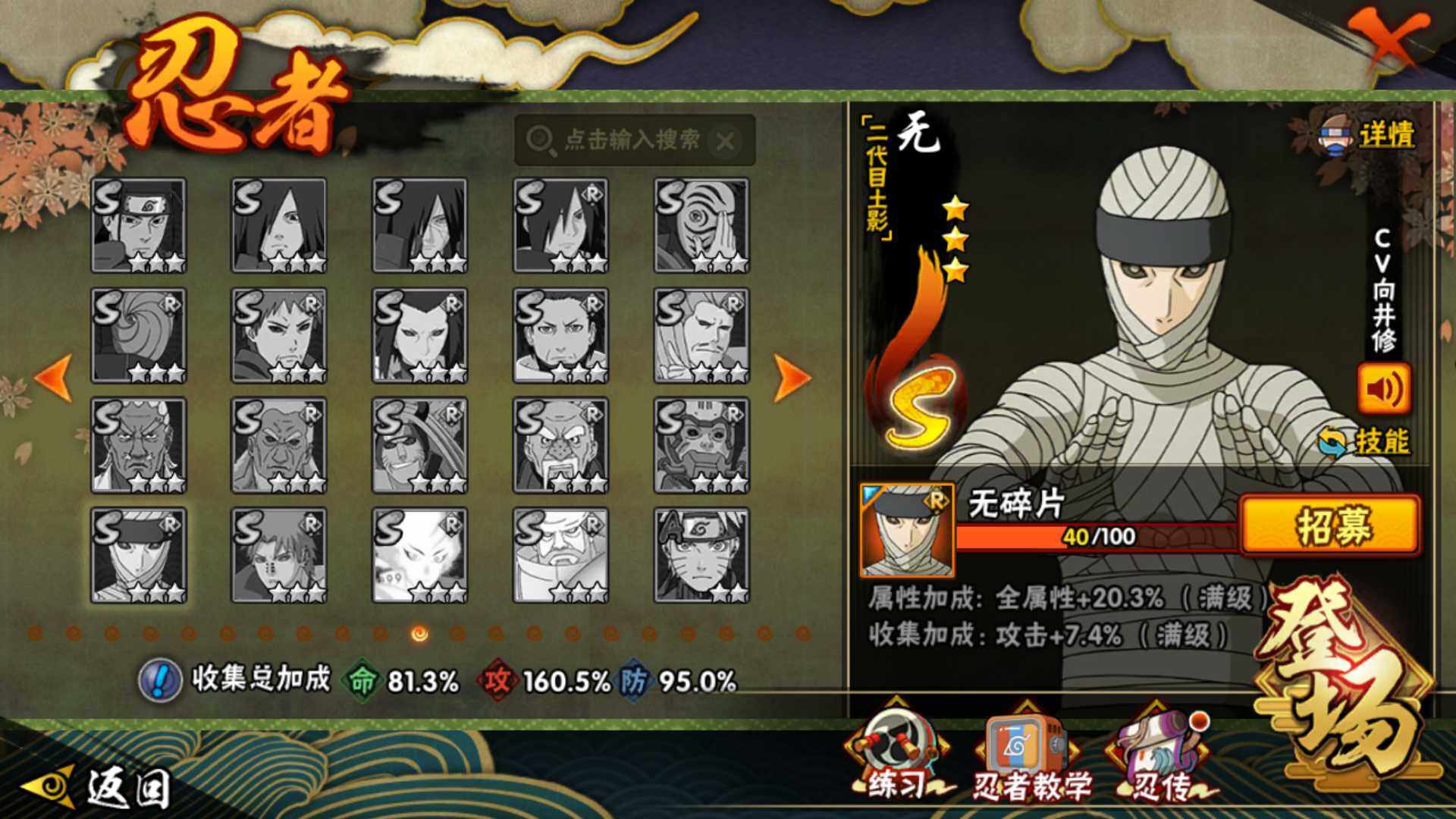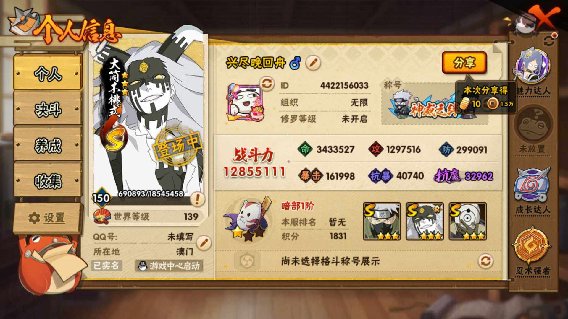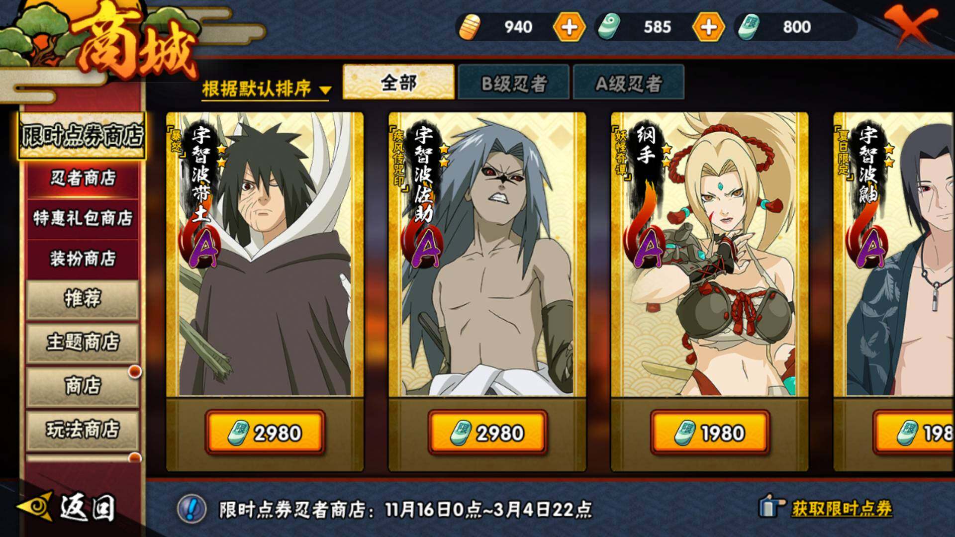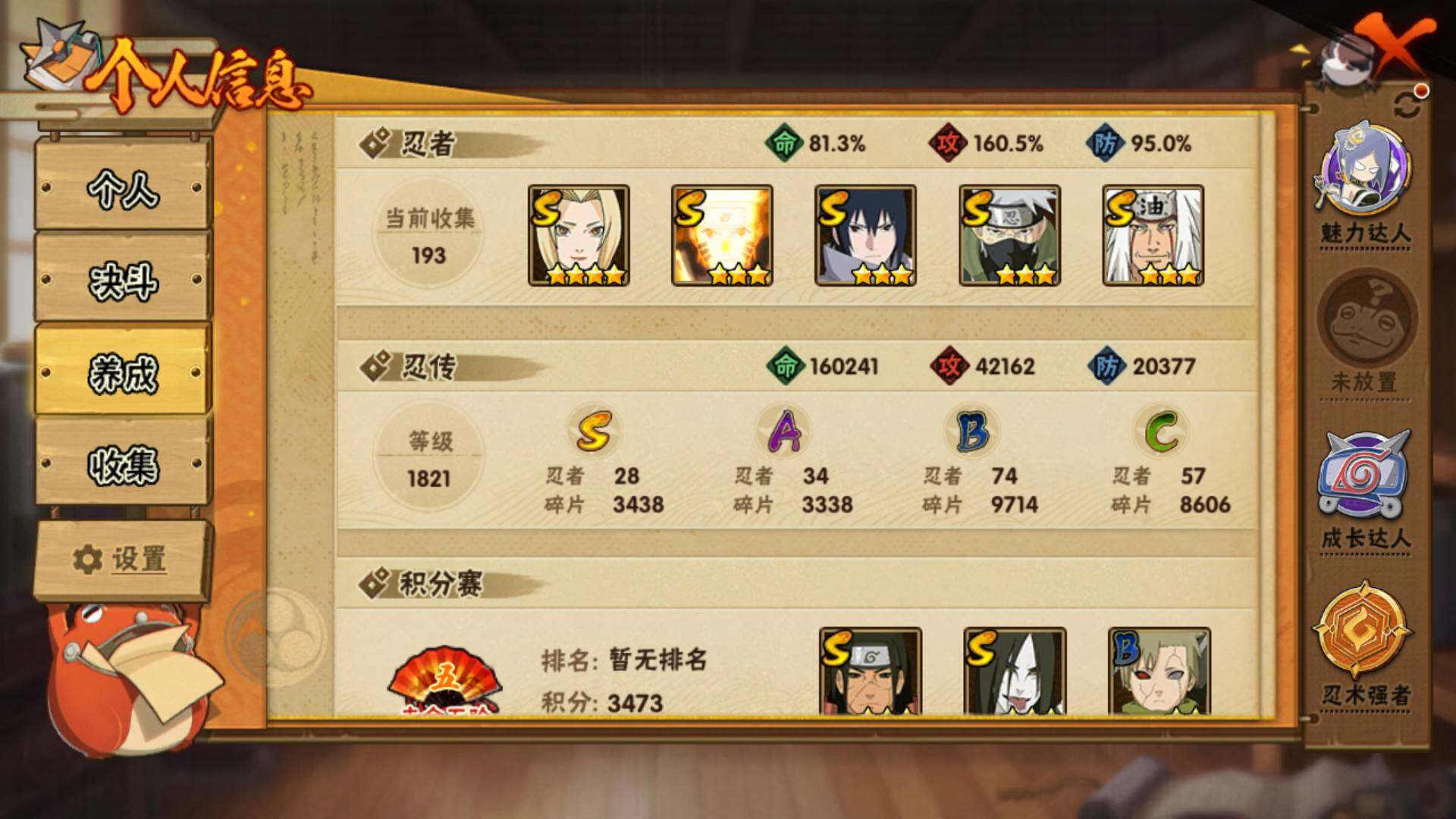 [14550976]v10,28s,34a,1285万战力,585点卷,800限时点卷,有熊猫。热门a忍有漂泊小南、秽土角都等。碎片传说自来也84片,无40片,三代风影56片,舍人60片,yy1528 【s级忍者】:长门「秽土转生」3星,猿飞日斩「秽土转生」3星,千手扉间「秽土转生」3星,千手柱间「秽土转生」3星,宇智波鼬「秽土转生」3星,宇智波斑「秽土转生·解」3星,大野木「忍界大战」3星,宇智波带土「忍界大战」3星,艾「忍界大战」3星,宇智波鼬「须佐能乎」3星,宇智波止水「须佐能乎」3星,旗木卡卡西「须佐能乎」3星,千手柱间「木叶创立」3星,自来也3星,自来也「仙人模式」3星,自来也「舞之豪杰」3星,大蛇丸3星,纲手4星,猿飞日斩3星,波风水门3星,药师兜「仙人模式」3星,神秘面具男「红夜之刃」3星,漩涡鸣人「九喇嘛连结」3星,迈特凯「死门」3星,佩恩「天道」3星,宇智波佐助「永恒万花筒」3星,宇智波斑 「白面具」3星宇智波斑「白面具」,大筒木桃式3星 【a级忍者】:艾「青年」2星,波风水门「青年」2星,达鲁伊「博人传」2星,迪达拉「秽土转生」2星,大蛇丸「晓」2星,奇拉比「忍界大战」2星,飞段3星,飞段「死司凭血」2星,干柿鬼鲛5星,漩涡博人「桃式显现」2星,漩涡鸣人「九尾查克拉」2星,迈特凯5星,我爱罗「疾风传」3星,蝎4星,蝎「绯流琥」2星,小南「漂泊浪客」2星,角都「秽土转生」2星,猿飞阿斯玛5星,宇智波止水2星,宇智波鼬2星,宇智波佐助「须佐能乎」2星,宇智波佐助「万花筒写轮眼」2星,药师兜「半蛇斗篷」2星,照美冥「五代目水影」2星,日向宁次「忍界大战」2星,日向雏田「最终章」2星,长十郎「六代目水影」2星,李洛克「忍界大战」2星,猿飞木叶丸「博人传」2星,黑土「博人传」2星,秋道丁次「忍界大战」2星,千代「近松十人卫」2星,不缘2星,宇智波泉奈2星 【永久主场景】:木叶周年庆,博人传 【通灵兽】:熊猫