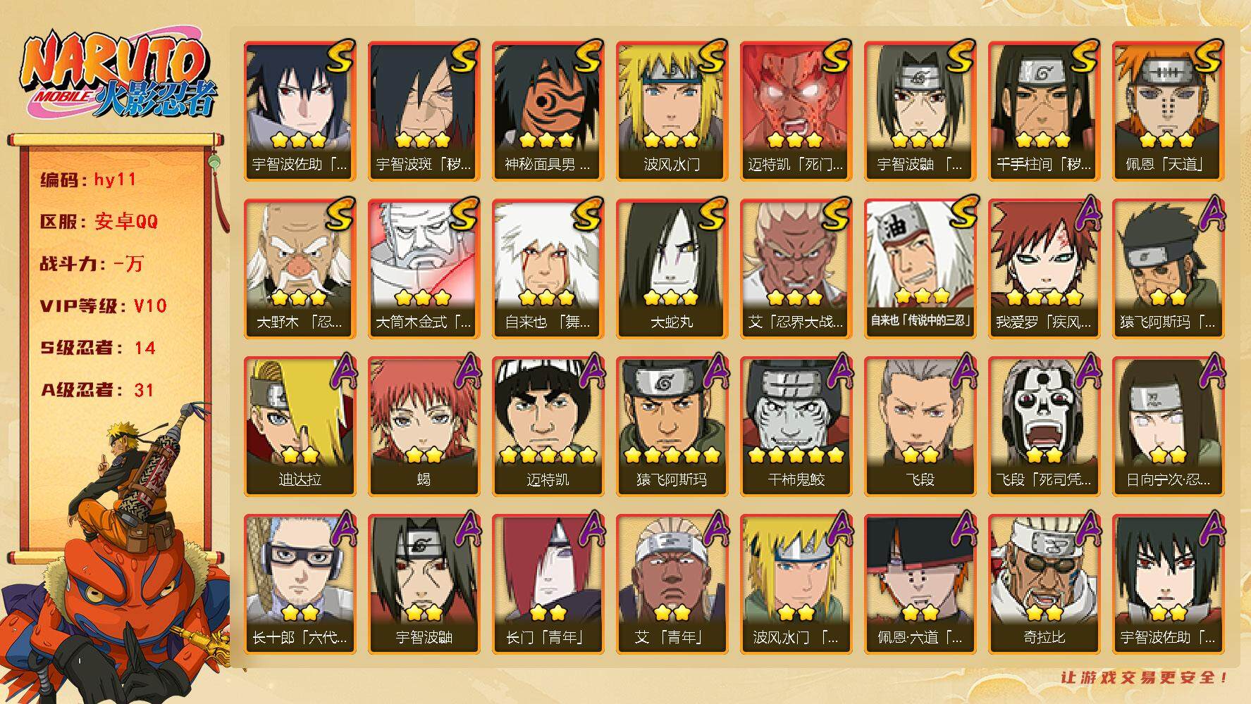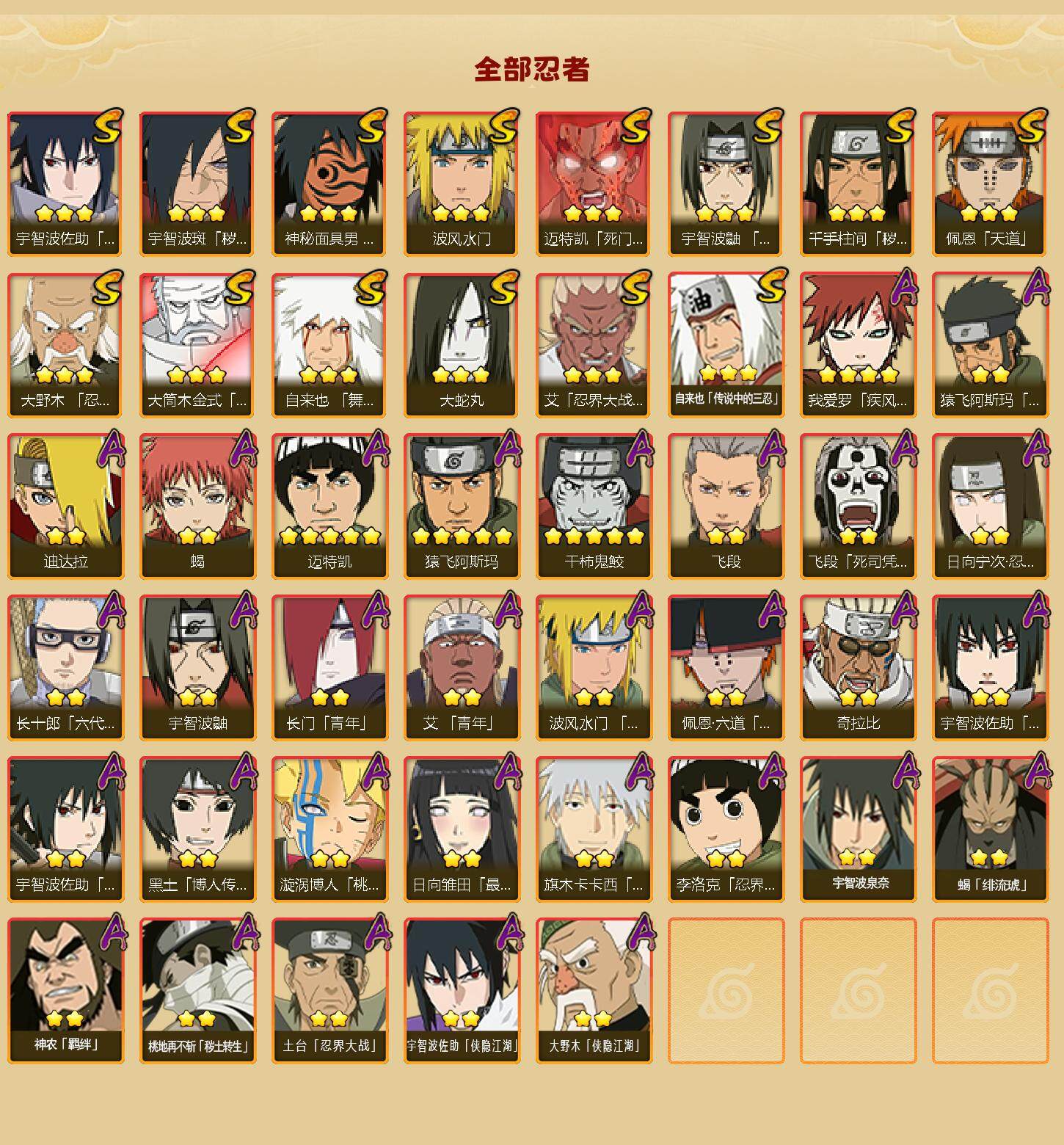 [14606587]14s级忍者数-31a级忍者数 【s级忍者】:千手柱间「秽土转生」3星,宇智波斑「秽土转生·解」3星,大野木「忍界大战」3星,艾「忍界大战」3星,宇智波鼬「须佐能乎」3星,自来也「舞之豪杰」3星,大蛇丸3星,自来也「传说中的三忍」3星,波风水门3星,神秘面具男「红夜之刃」3星,迈特凯「死门」3星,佩恩「天道」3星,宇智波佐助「永恒万花筒」3星,大筒木金式3星 【a级忍者】:艾「青年」2星,长门「青年」2星,波风水门「青年」2星,迪达拉2星,奇拉比2星,飞段2星,飞段「死司凭血」2星,干柿鬼鲛5星,漩涡博人「桃式显现」2星,迈特凯5星,旗木卡卡西「幻之真容」2星,桃地再不斩「秽土转生」2星,我爱罗「疾风传」4星,蝎2星,蝎「绯流琥」2星,猿飞阿斯玛5星,猿飞阿斯玛「秽土转生」2星,宇智波鼬2星,宇智波佐助「须佐能乎」2星,宇智波佐助「万花筒写轮眼」2星,宇智波佐助「侠隐江湖」2星,日向宁次「忍界大战」2星,日向雏田「最终章」2星,长十郎「六代目水影」2星,佩恩·六道「漂泊浪客」2星,李洛克「忍界大战」2星,黑土「博人传」2星,神农「羁绊」2星,土台「忍界大战」2星,宇智波泉奈2星,大野木「侠隐江湖」2星