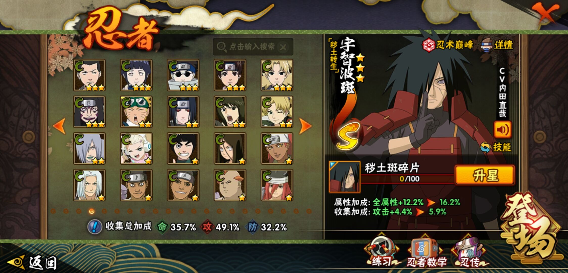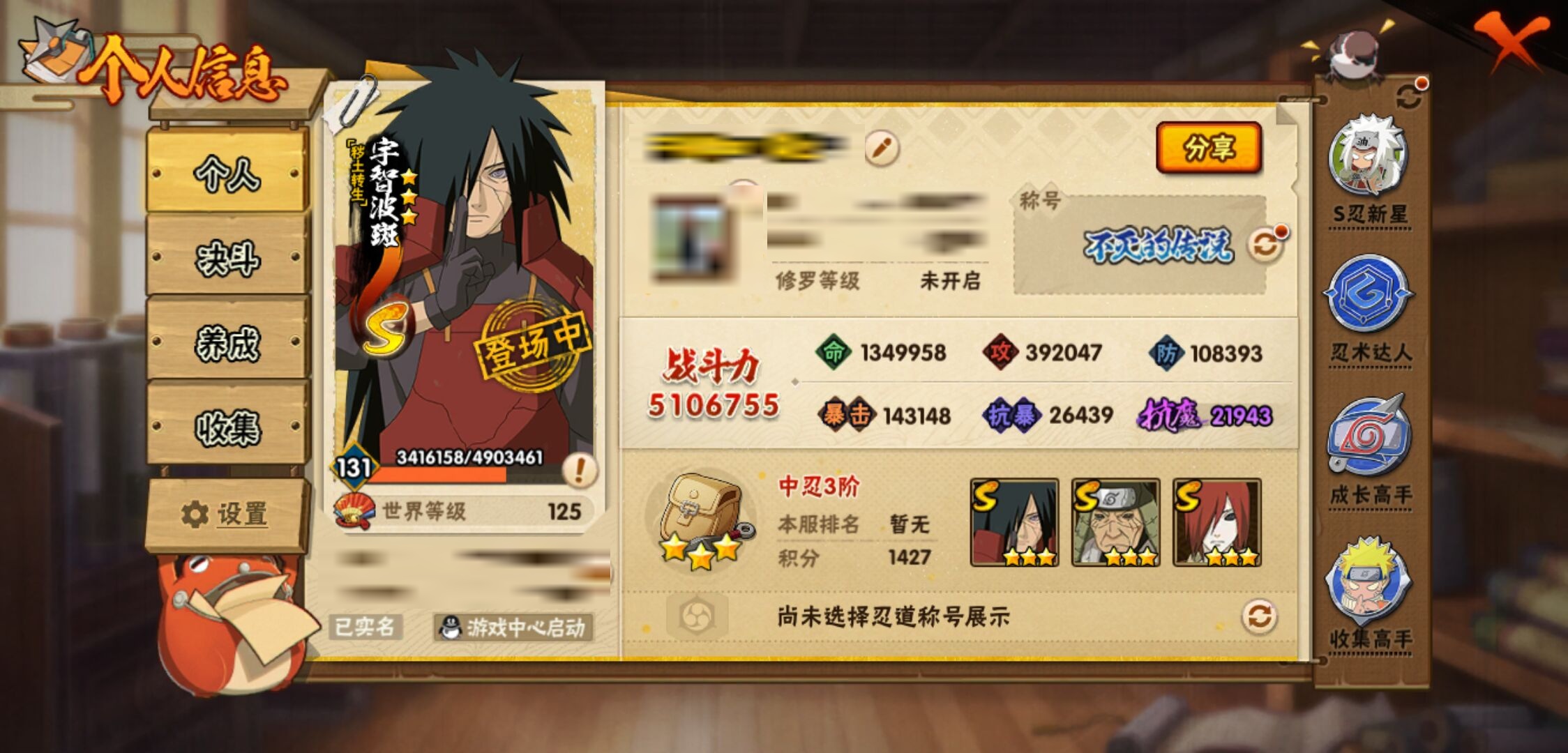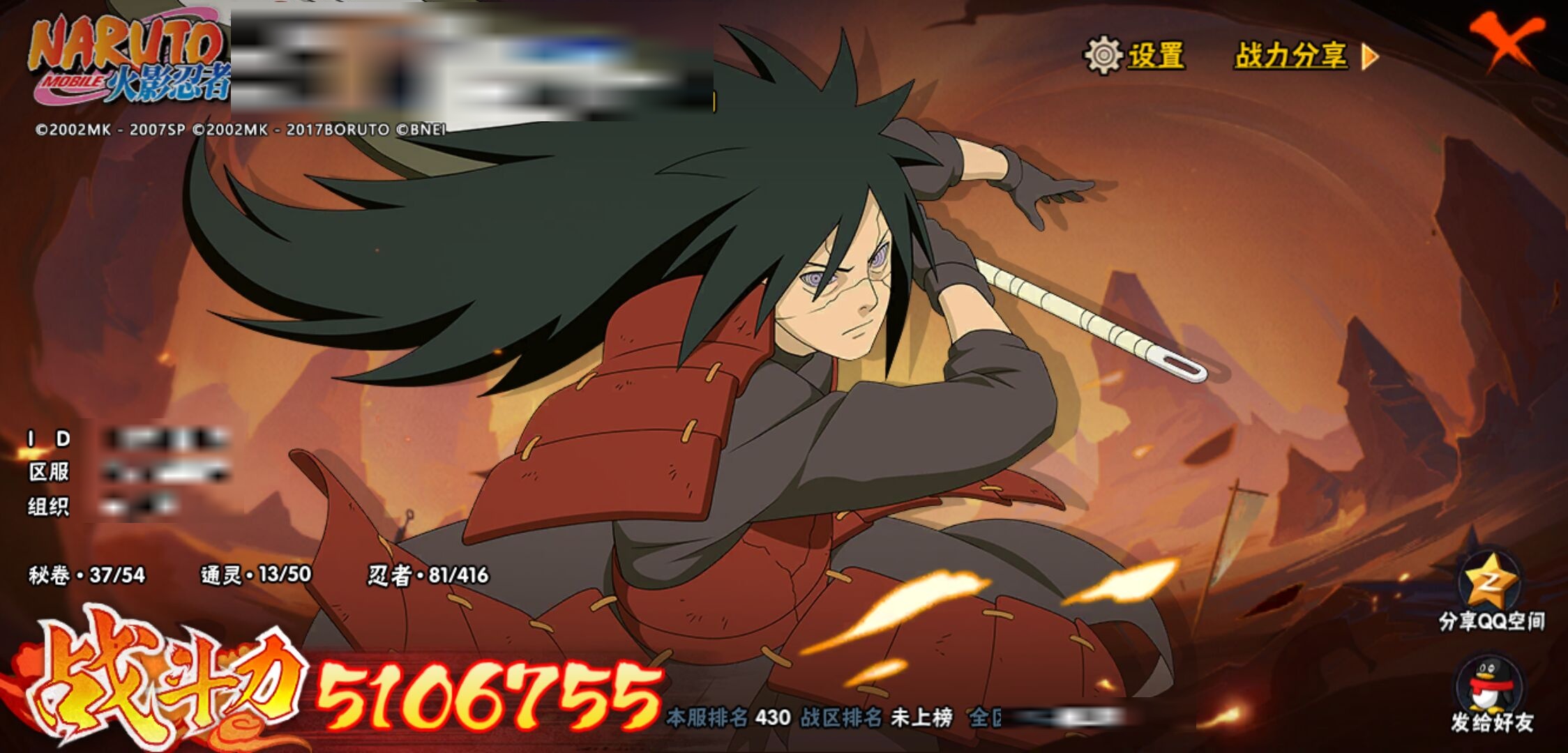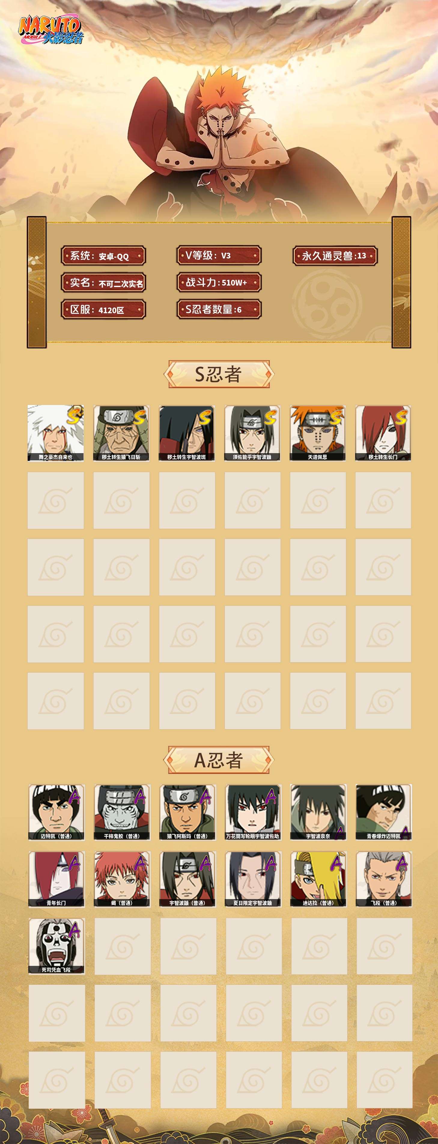 【火影忍者】【lyhy9337】战斗力:510w;段位:中忍3阶;本服排名:430;vip:v3级;s忍:6个;a忍:13个;通灵兽:13个,s忍:舞之豪杰自来也|秽土转生猿飞日斩|秽土转生宇智波斑|须佐能乎宇智波鼬|天道佩恩|秽土转生长门__a忍:迈特凯(普通) 4星|干柿鬼鲛(普通) 4星|猿飞阿斯玛(普通) 3星|万花筒写轮眼宇智波佐助|宇智波泉奈|青春爆炸迈特凯|青年长门|蝎(普通)|宇智波鼬(普通)|夏日限定宇智波鼬|迪达拉(普通)|飞段(普通)|死司凭血飞段__通灵兽:忍犬(普通)|蓝蛇|蛤蟆吉|忍龟|砂之守鹤|镰鼬|猿魔|山椒鱼|蜃|蛤蟆仙人|鲛鲨|蛤蟆健|乌鸦(普通)