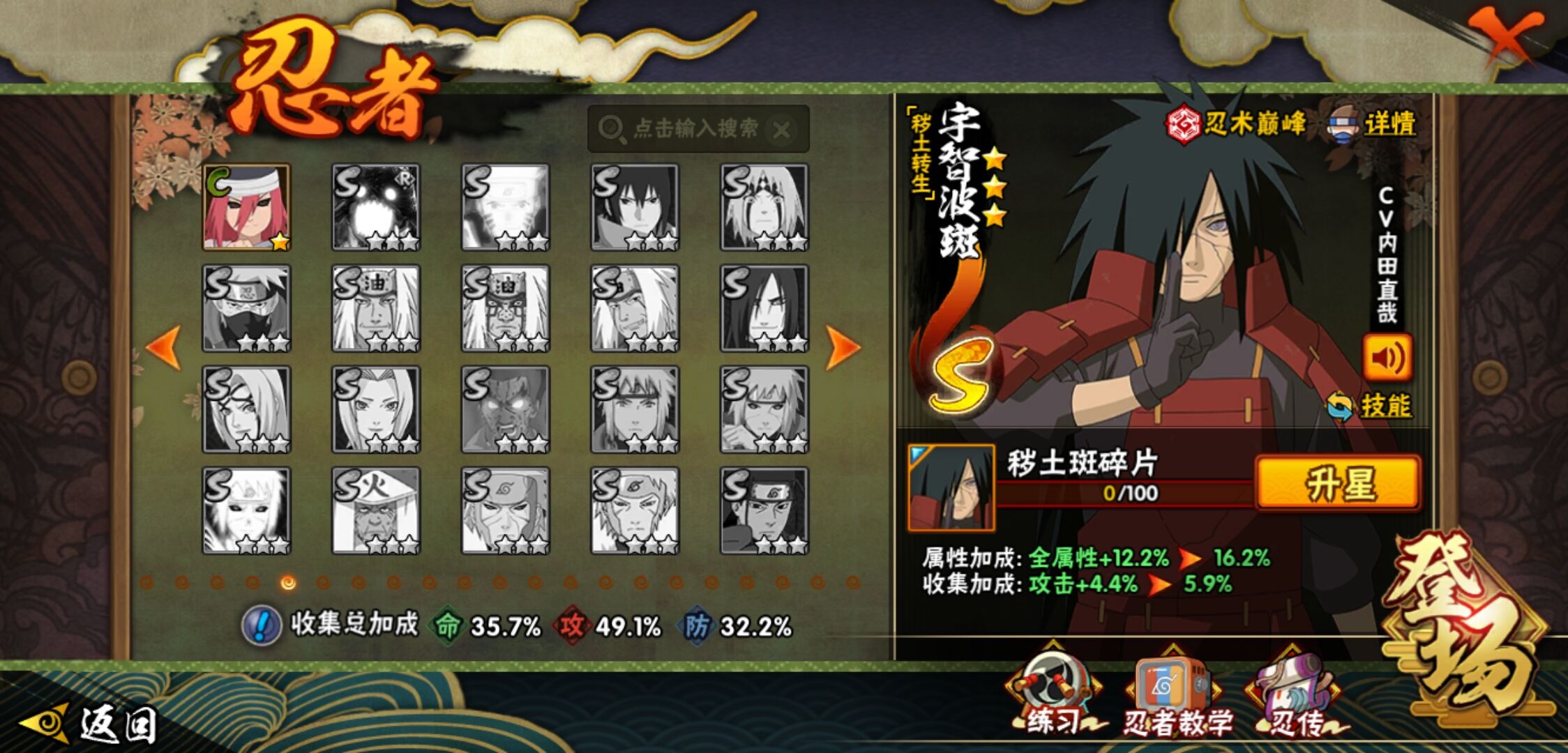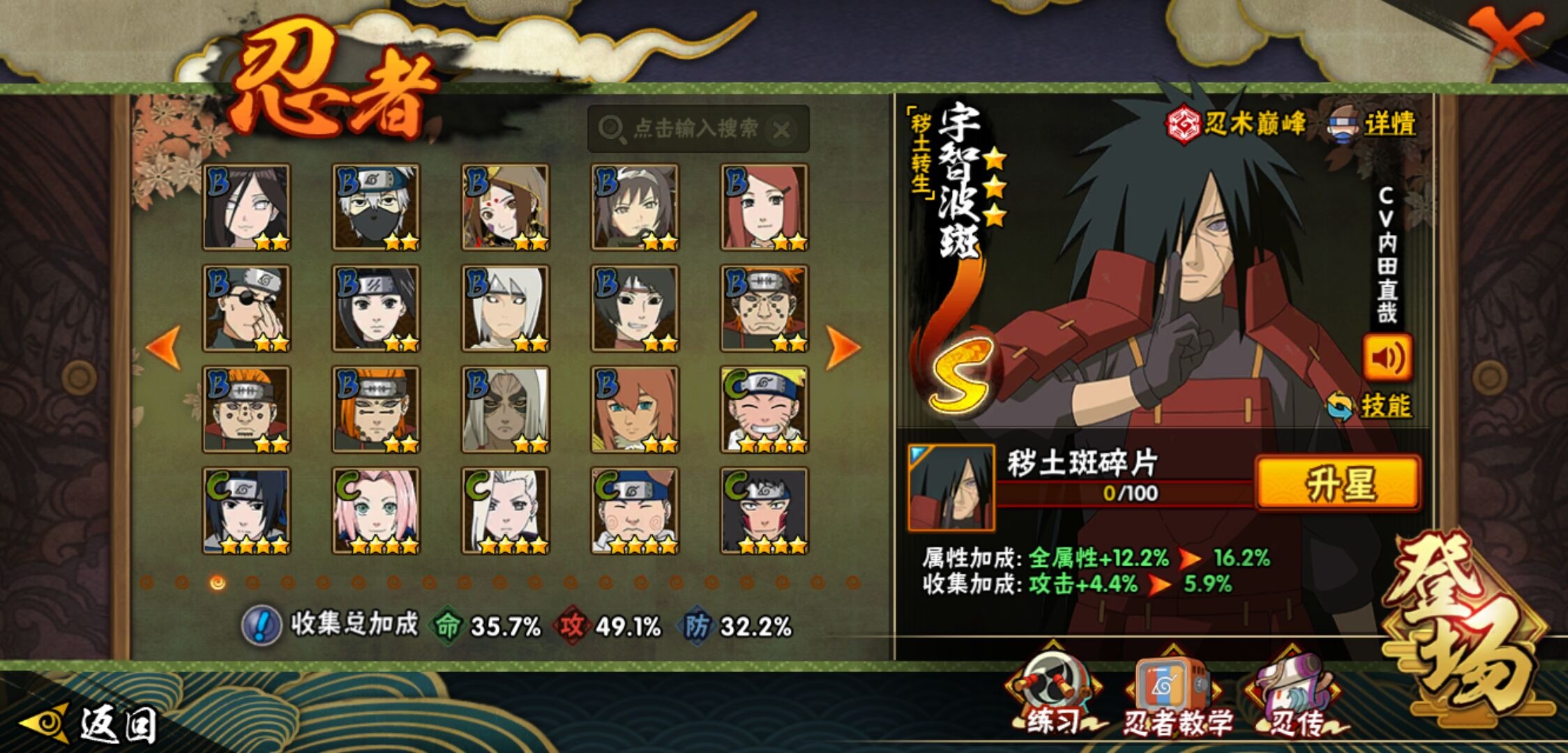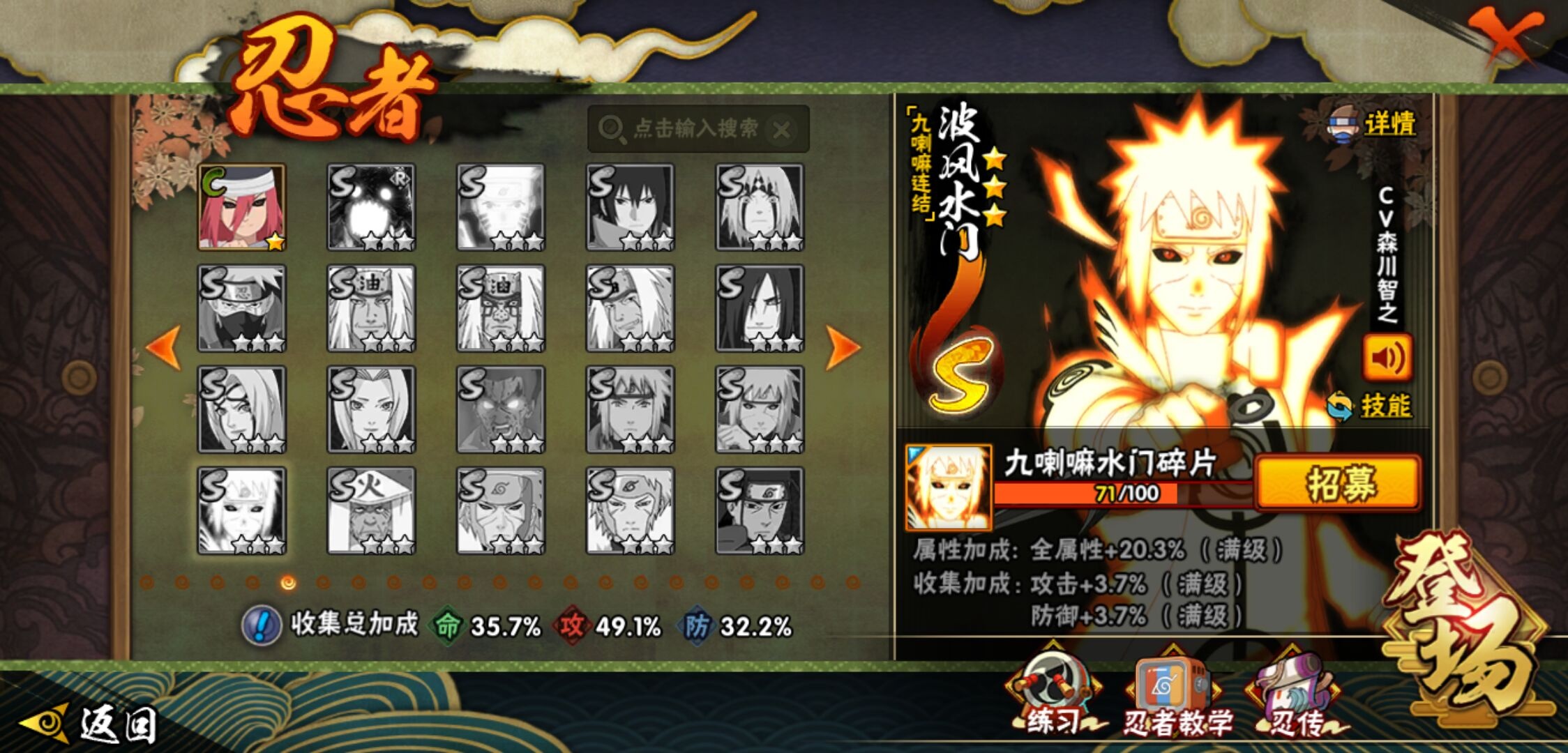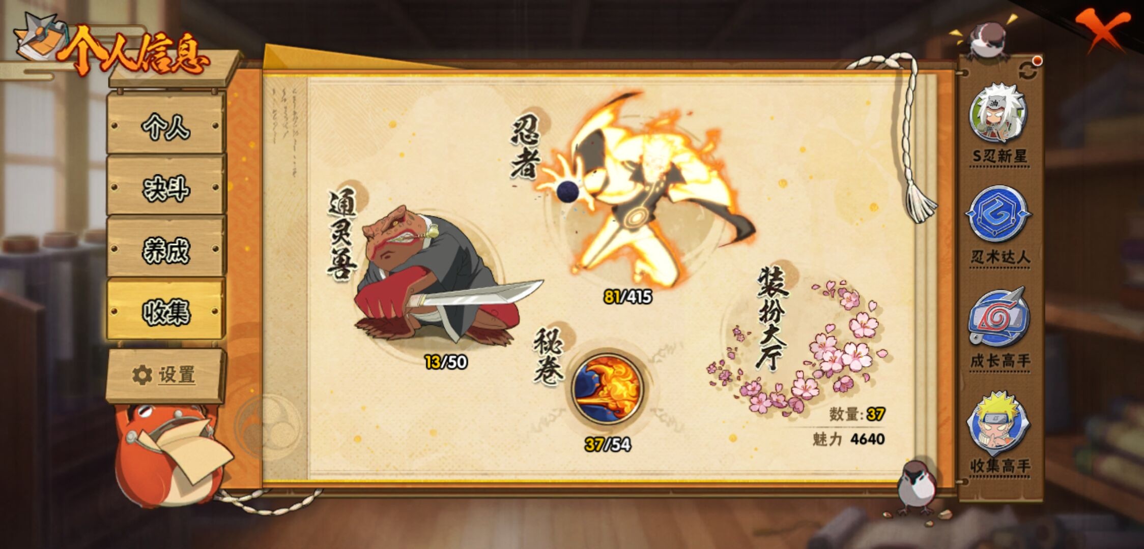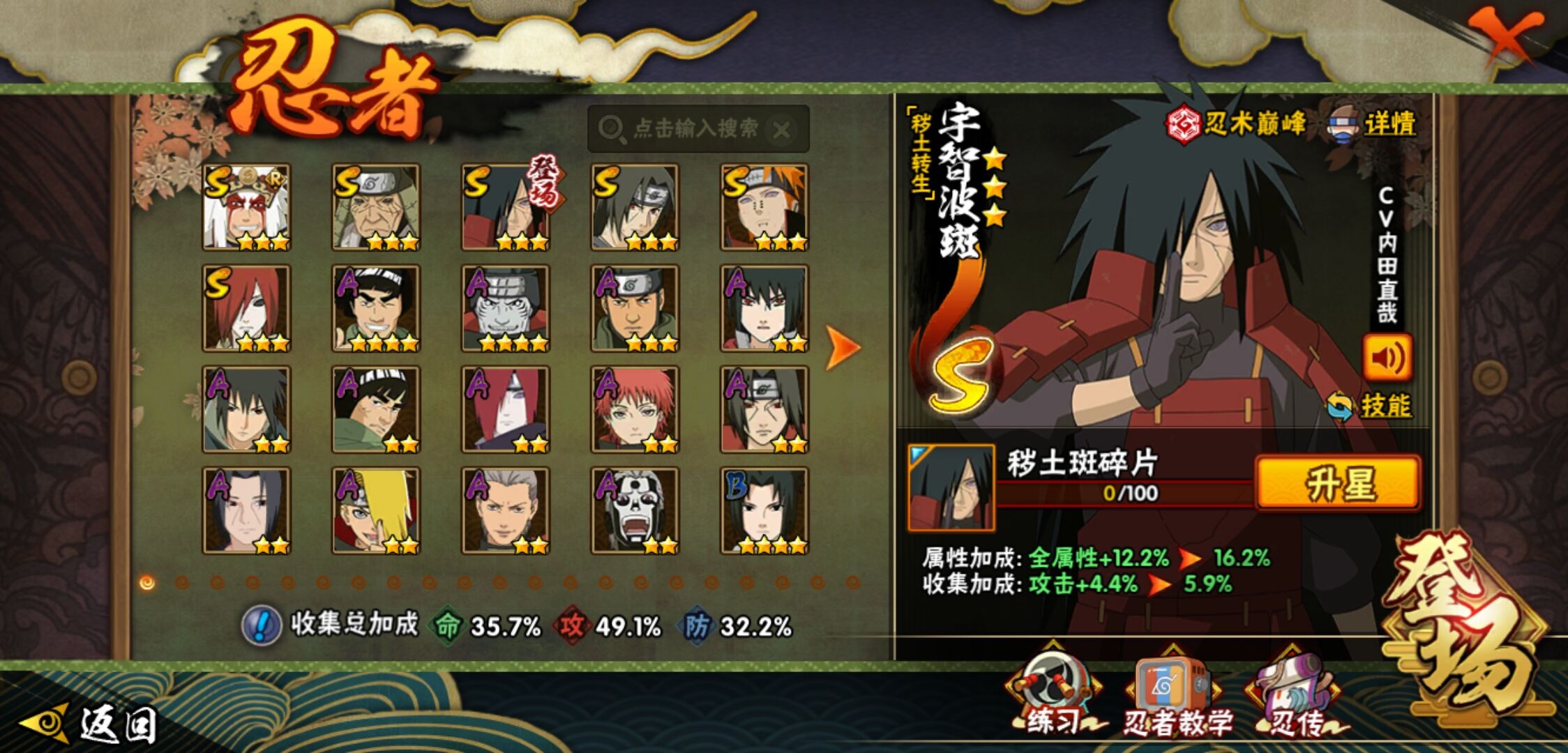 【火影忍者】【lyhy9337】战斗力:510w;段位:中忍3阶;本服排名:430;vip:v3级;s忍:6个;a忍:13个;通灵兽:13个,s忍:舞之豪杰自来也|秽土转生猿飞日斩|秽土转生宇智波斑|须佐能乎宇智波鼬|天道佩恩|秽土转生长门__a忍:迈特凯(普通) 4星|干柿鬼鲛(普通) 4星|猿飞阿斯玛(普通) 3星|万花筒写轮眼宇智波佐助|宇智波泉奈|青春爆炸迈特凯|青年长门|蝎(普通)|宇智波鼬(普通)|夏日限定宇智波鼬|迪达拉(普通)|飞段(普通)|死司凭血飞段__通灵兽:忍犬(普通)|蓝蛇|蛤蟆吉|忍龟|砂之守鹤|镰鼬|猿魔|山椒鱼|蜃|蛤蟆仙人|鲛鲨|蛤蟆健|乌鸦(普通)