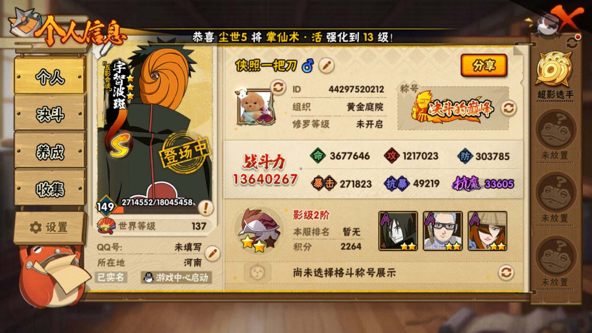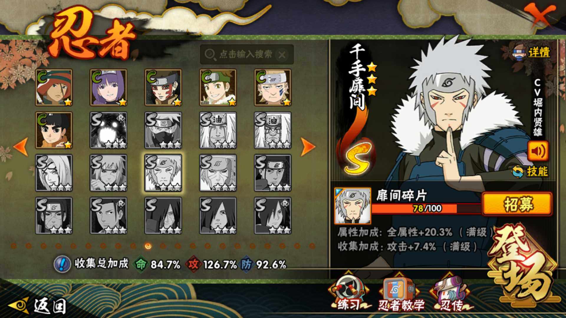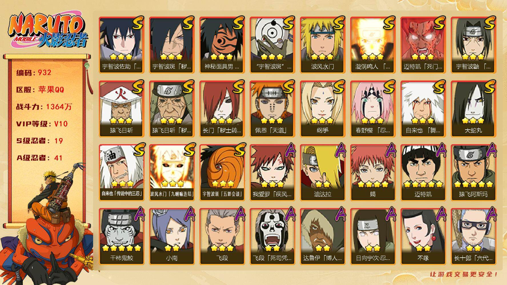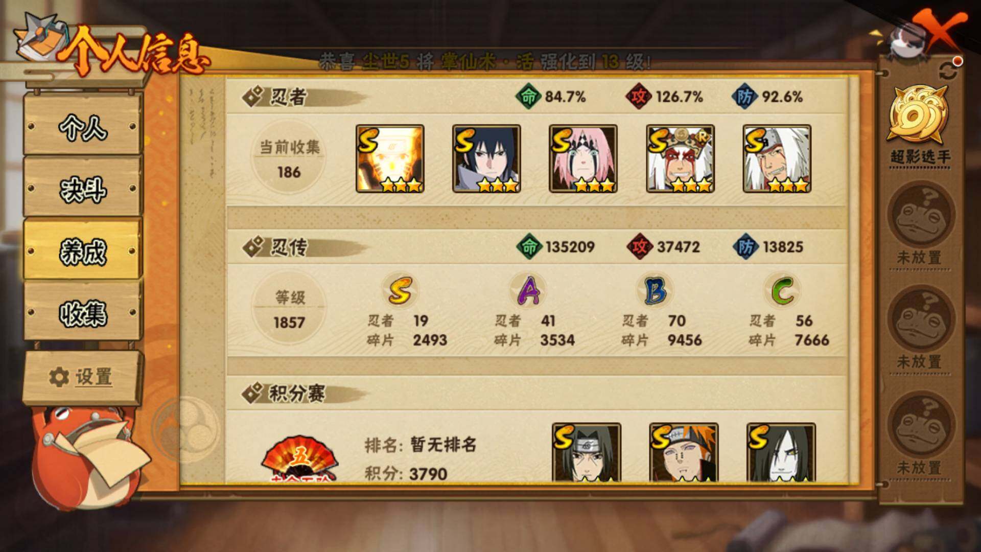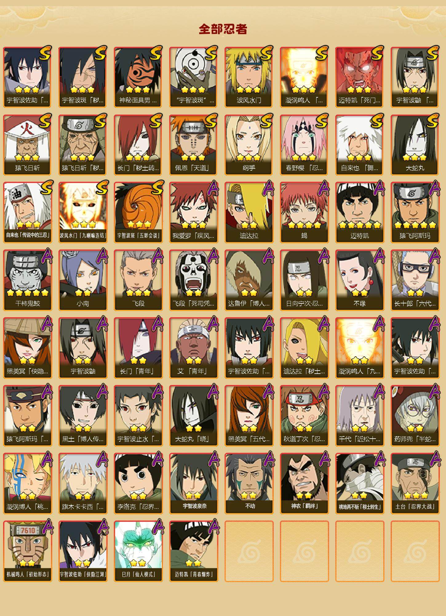 [14616660]v10 19s 41a 1364万战力 热门a侠隐佐助、七夕阿斯玛、新春止水、侠隐照美冥。扉间78片、自来也72片、仙人自来也48片、忍战大野木75片、忍战艾31片。yy1621 【s级忍者】:长门「秽土转生」3星,猿飞日斩「秽土转生」3星,宇智波斑「秽土转生·解」3星,春野樱「忍界大战」3星,宇智波鼬「须佐能乎」3星,自来也「舞之豪杰」3星,大蛇丸3星,自来也「传说中的三忍」3星,纲手3星,猿飞日斩3星,波风水门3星,神秘面具男「红夜之刃」3星,漩涡鸣人「九喇嘛连结」3星,迈特凯「死门」3星,佩恩「天道」3星,宇智波佐助「永恒万花筒」3星,宇智波斑 「白面具」3星宇智波斑「白面具」,波风水门「九喇嘛连结」3星,宇智波斑「五影会谈」3星 【a级忍者】:艾「青年」2星,长门「青年」2星,达鲁伊「博人传」2星,迪达拉2星,迪达拉「秽土转生」2星,大蛇丸「晓」2星,飞段3星,飞段「死司凭血」2星,干柿鬼鲛5星,漩涡博人「桃式显现」2星,漩涡鸣人「九尾查克拉」2星,机械鸣人「初始形态」2星,迈特凯5星,旗木卡卡西「幻之真容」2星,桃地再不斩「秽土转生」2星,我爱罗「疾风传」3星,蝎4星,小南2星,猿飞阿斯玛5星,猿飞阿斯玛「七夕限定」2星,宇智波止水「新春限定」2星,宇智波鼬2星,宇智波佐助「须佐能乎」2星,宇智波佐助「万花筒写轮眼」2星,宇智波佐助「侠隐江湖」2星,药师兜「半蛇斗篷」2星,照美冥「侠隐江湖」2星,照美冥「五代目水影」2星,日向宁次「忍界大战」2星,长十郎「六代目水影」2星,李洛克「忍界大战」2星,黑土「博人传」2星,秋道丁次「忍界大战」2星,千代「近松十人卫」2星,神农「羁绊」2星,土台「忍界大战」3星,不缘2星,宇智波泉奈2星,不动2星,巳月「仙人模式」2星,迈特凯「青春爆炸」2星