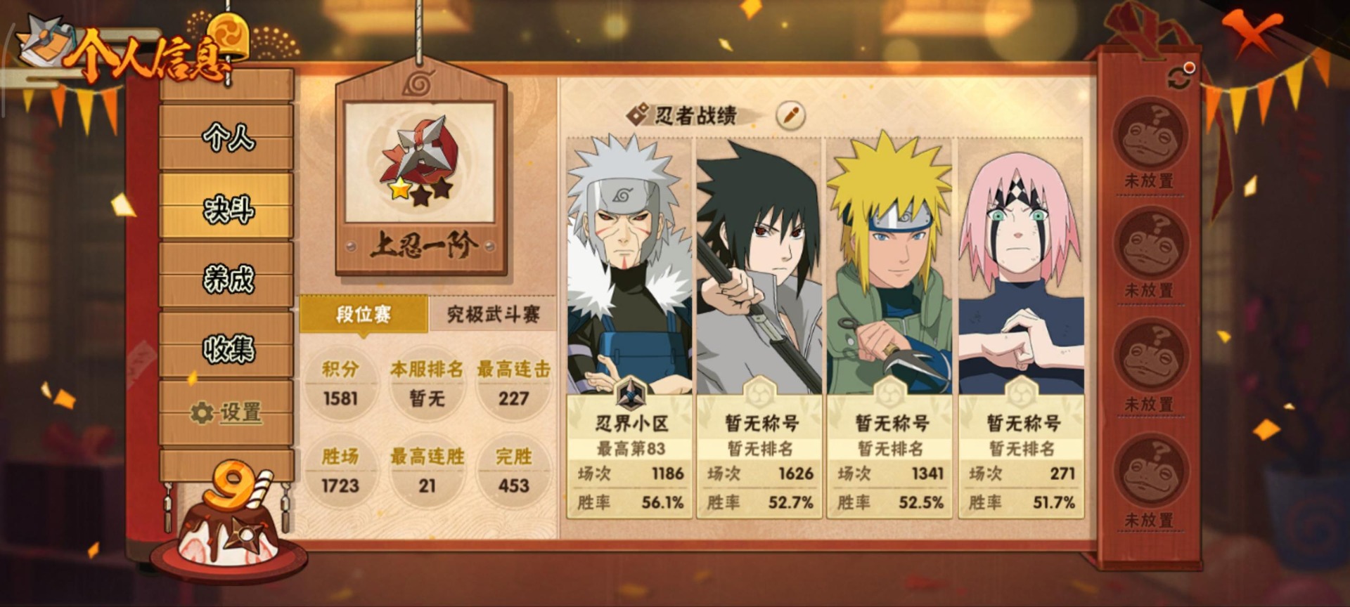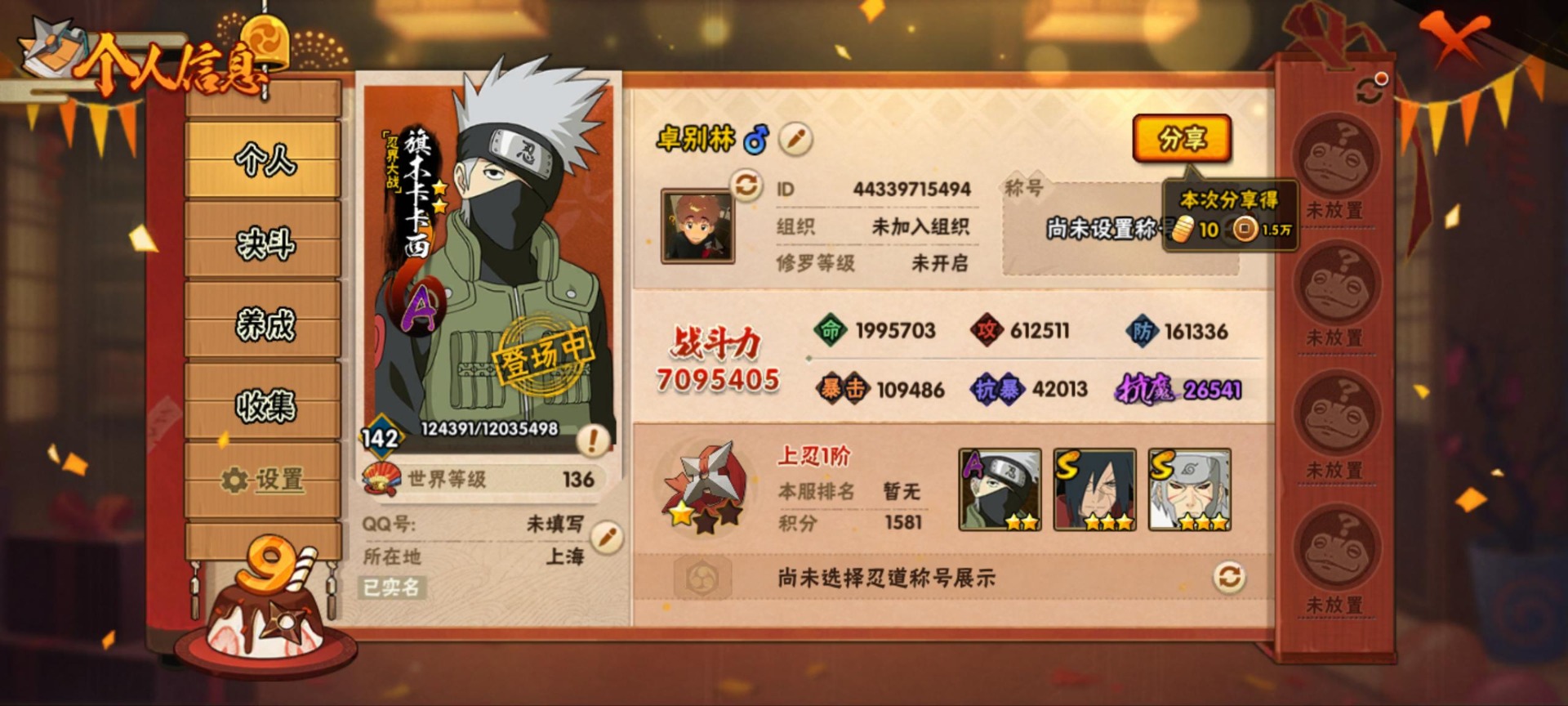 v4 9s忍 22a忍 15通灵 709.5w战力 可二次 可修改实名 【s级忍者】:宇智波斑「秽土转生·解」春野樱 「忍界大战」自来也 「舞之豪杰」旗木卡卡西「须佐能乎」千手扉间「秽土转生」波风水门「秽土转生」宇智波鼬 「须佐能乎」佩恩「天道」波风水门