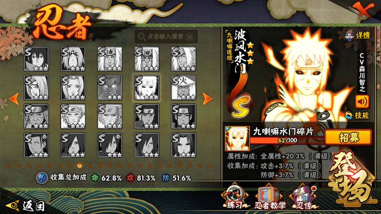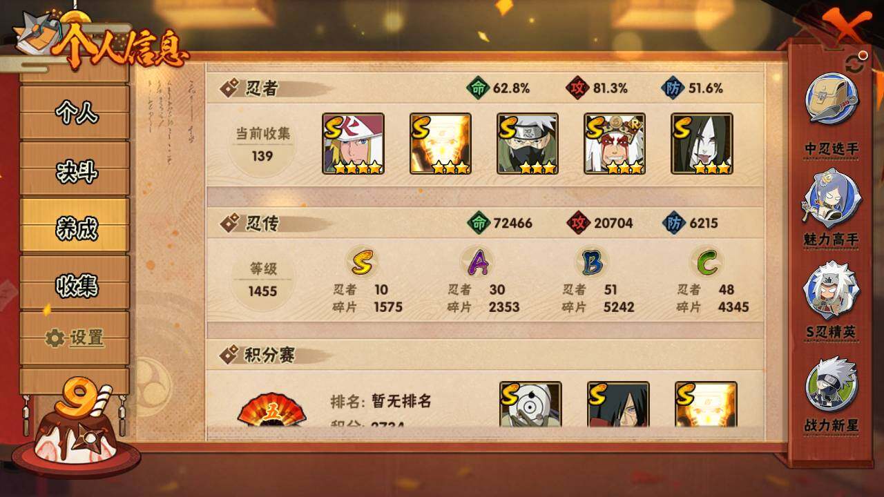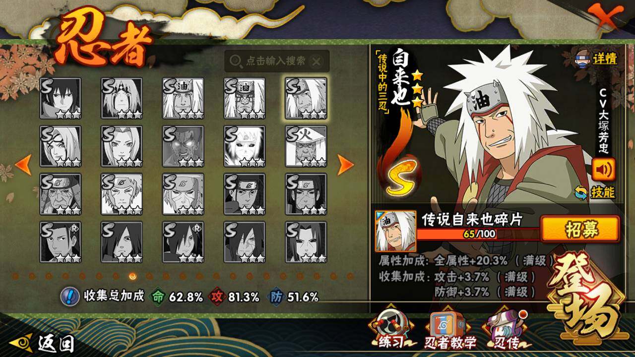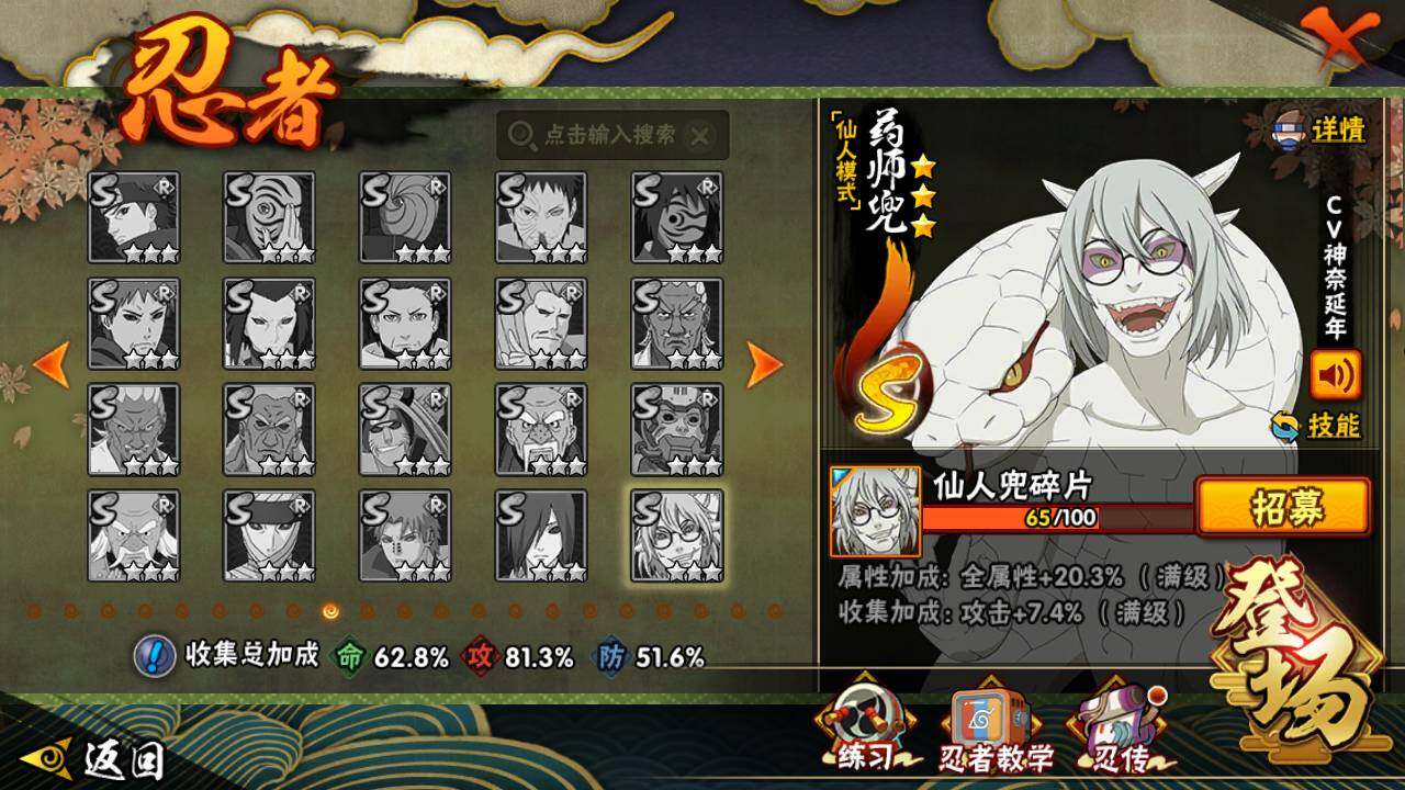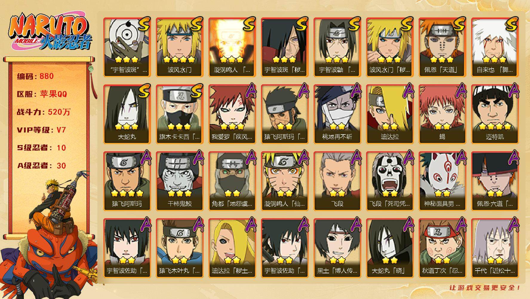 [14641024]v7 520万战力 10s-30a 仙人兜65片 九喇嘛水门62片 传说自来也65片 ll5533 【s级忍者】:波风水门「秽土转生」3星,宇智波斑「秽土转生」3星,宇智波鼬「须佐能乎」3星,旗木卡卡西「须佐能乎」3星,自来也「舞之豪杰」3星,大蛇丸3星,波风水门4星,漩涡鸣人「九喇嘛连结」3星,佩恩「天道」3星,宇智波斑 「白面具」3星宇智波斑「白面具」 【a级忍者】:迪达拉2星,迪达拉「秽土转生」2星,大蛇丸「晓」2星,飞段2星,飞段「死司凭血」2星,干柿鬼鲛3星,漩涡博人「桃式显现」2星,漩涡鸣人「仙人模式」2星,迈特凯4星,旗木卡卡西「幻之真容」2星,桃地再不斩2星,我爱罗「疾风传」3星,蝎2星,蝎「绯流琥」2星,角都「地怨虞」2星,猿飞阿斯玛4星,猿飞阿斯玛「秽土转生」2星,宇智波佐助「须佐能乎」2星,宇智波佐助「万花筒写轮眼」2星,日向雏田「最终章」2星,神秘面具男「忍者之路」2星,佩恩·六道「漂泊浪客」2星,猿飞木叶丸「博人传」2星,黑土「博人传」2星,秋道丁次「忍界大战」2星,千代「近松十人卫」2星,神农「羁绊」2星,宇智波泉奈2星,大野木「侠隐江湖」2星,迈特凯「青春爆炸」2星