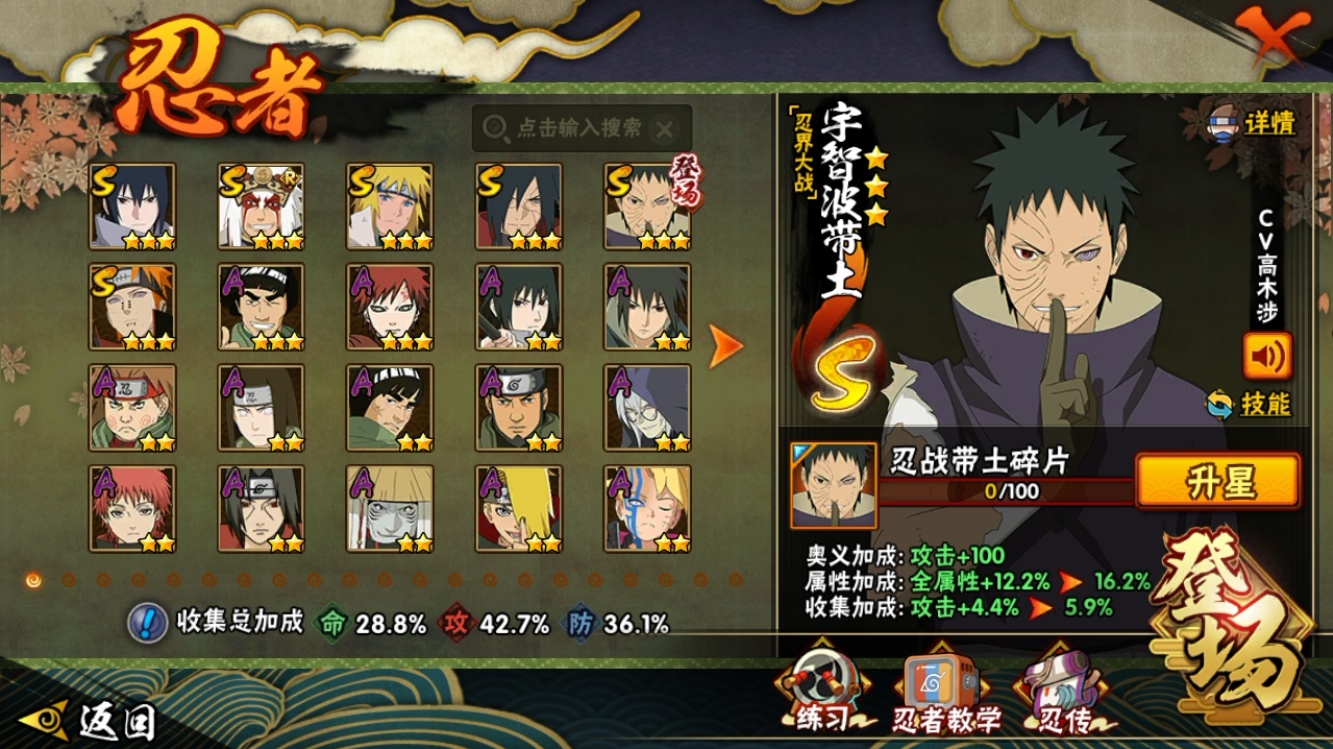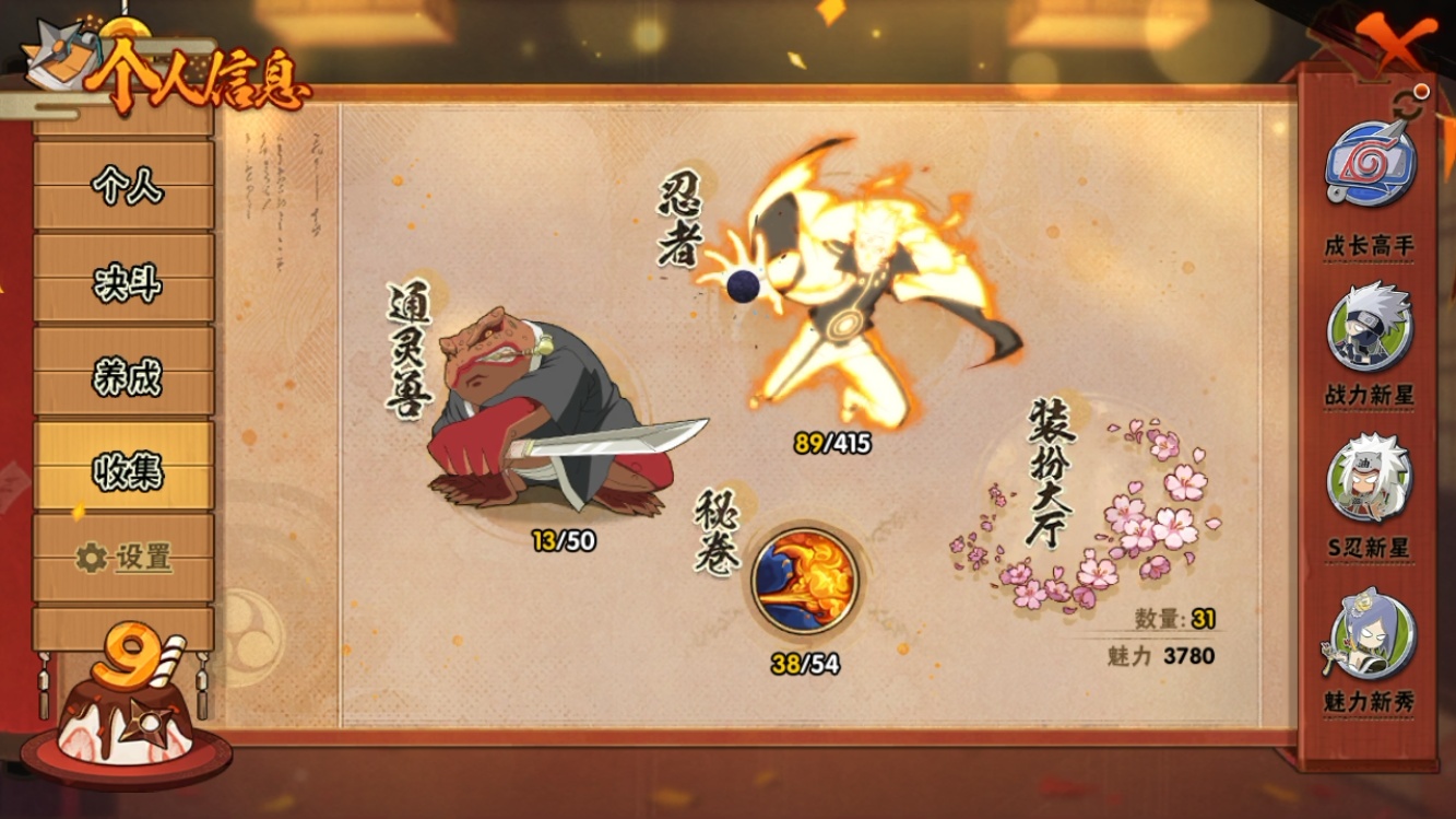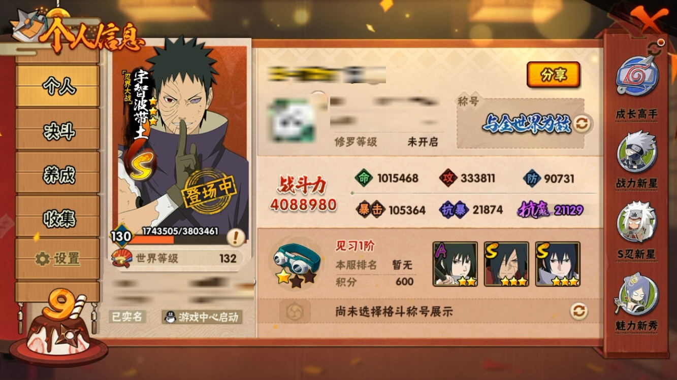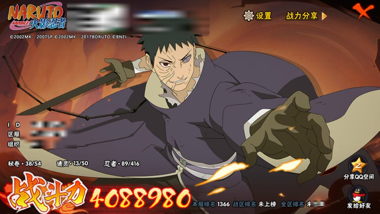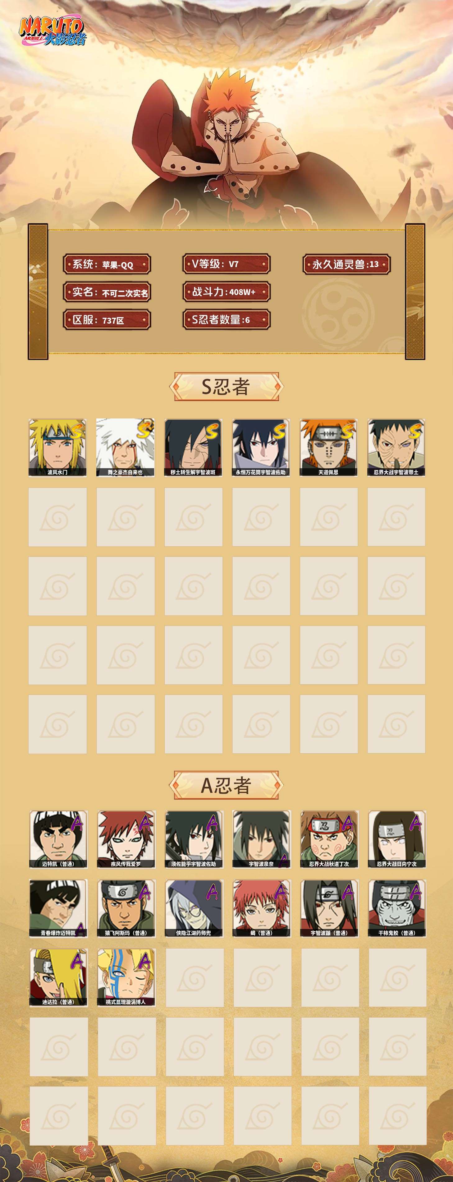 【火影忍者】【lyhy9340】s忍:波风水门|舞之豪杰自来也|秽土转生解宇智波斑|永恒万花筒宇智波佐助|天道佩恩|忍界大战宇智波带土__a忍:迈特凯(普通)|疾风传我爱罗|须佐能乎宇智波佐助|宇智波泉奈|忍界大战秋道丁次|忍界大战日向宁次|青春爆炸迈特凯|猿飞阿斯玛(普通)|侠隐江湖药师兜|蝎(普通)|宇智波鼬(普通)|干柿鬼鲛(普通)|迪达拉(普通)|桃式显现漩涡博人__通灵兽:忍犬(普通)|蓝蛇|蛤蟆吉|忍龟|镰鼬|猿魔|山椒鱼|蜃|蛤蟆仙人|鲛鲨|蛤蟆健|砂之守鹤|乌鸦(普通)1,战斗力:408w;vip:v7级