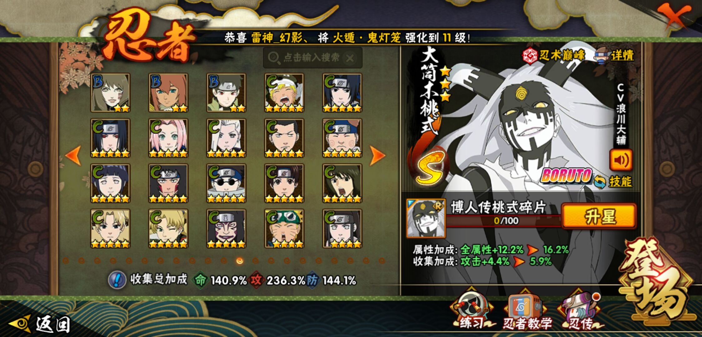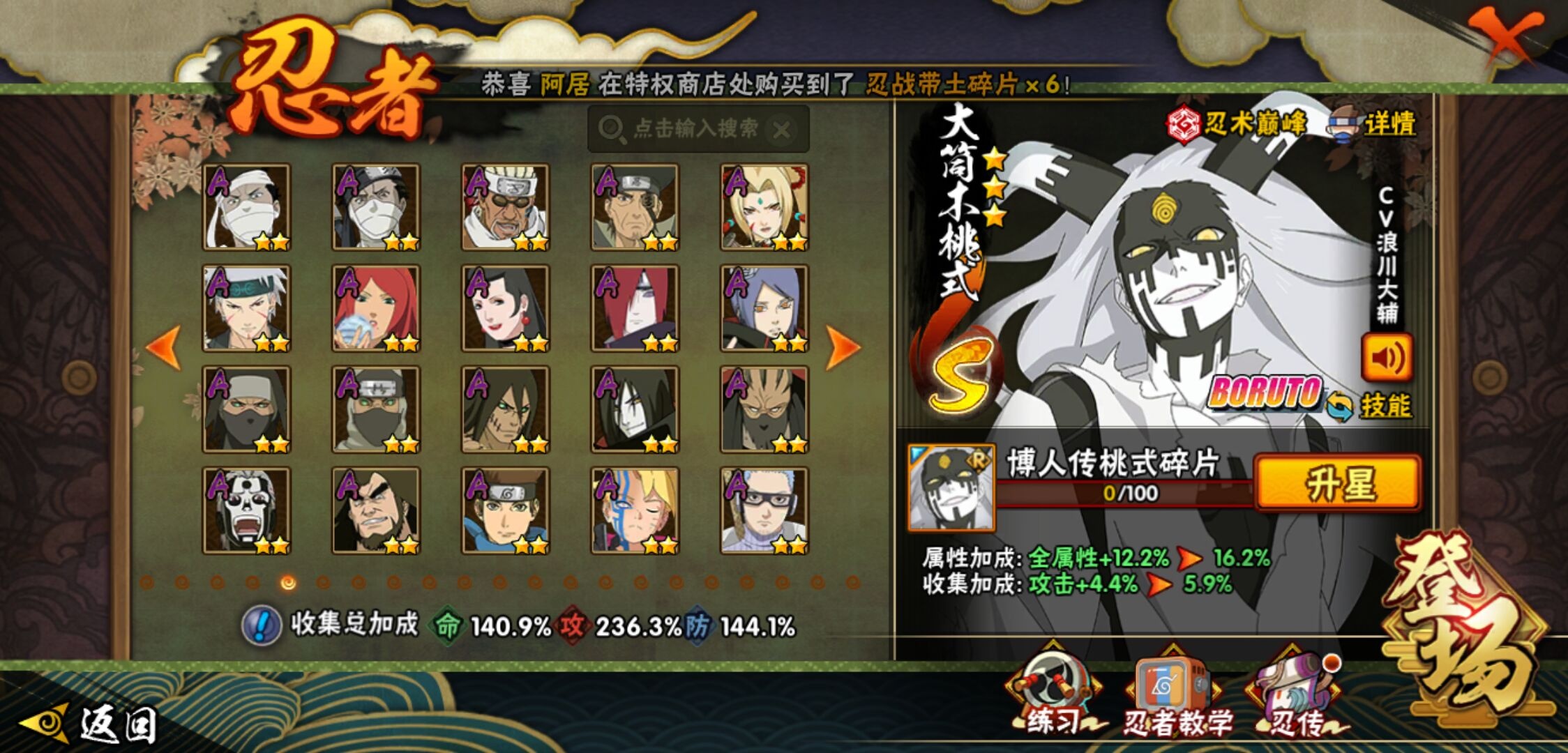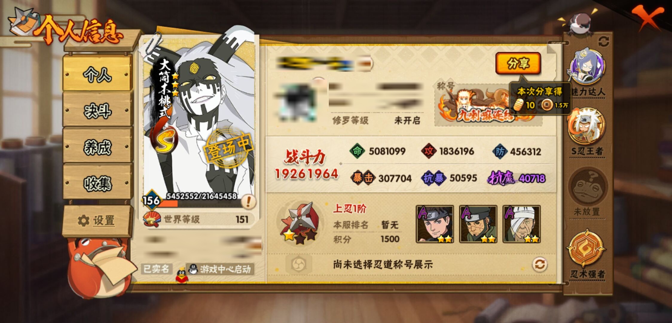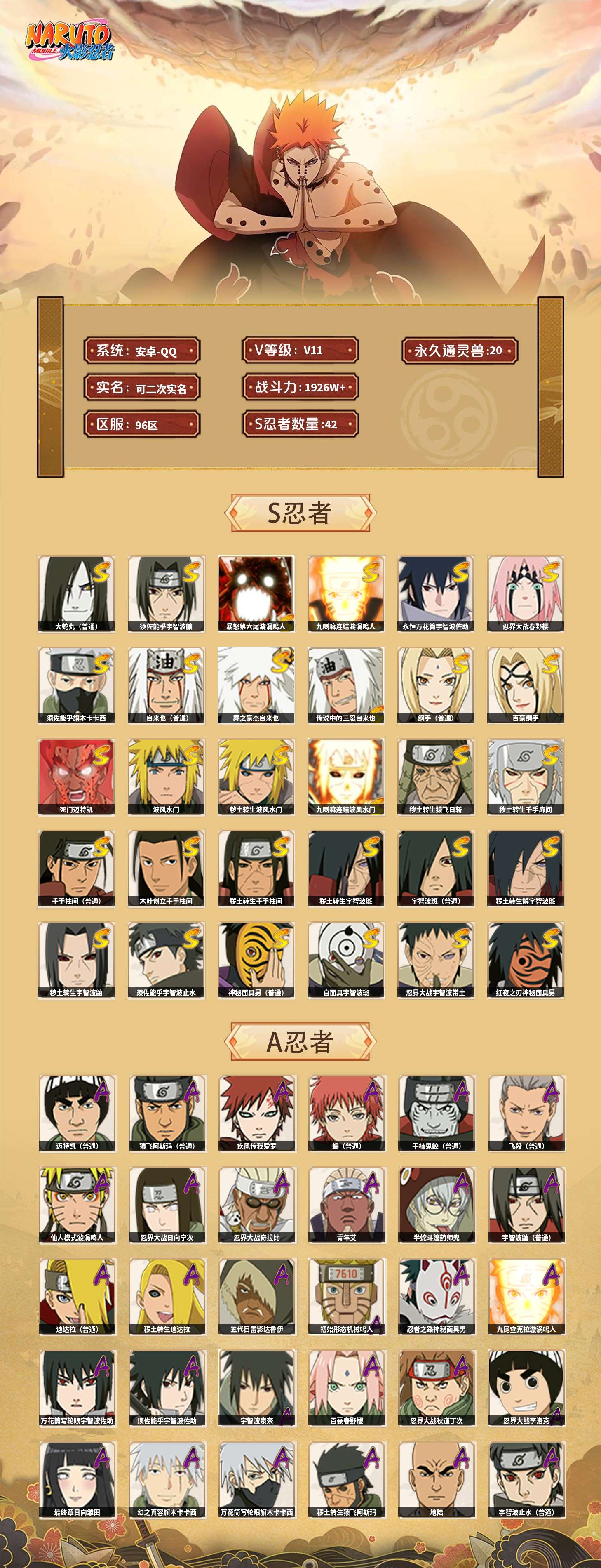 【火影忍者】【lyhy9381】战斗力:1926w;段位:上忍1阶;本服排名:298;vip:v11级;s忍:42个;a忍:59个;通灵兽:20个,s忍:大蛇丸(普通) 4星|须佐能乎宇智波鼬 4星|暴怒第六尾漩涡鸣人|九喇嘛连结漩涡鸣人|永恒万花筒宇智波佐助|忍界大战春野樱|须佐能乎旗木卡卡西|自来也(普通)|舞之豪杰自来也|传说中的三忍自来也|纲手(普通)|百豪纲手|死门迈特凯|波风水门|秽土转生波风水门|九喇嘛连结波风水门|秽土转生猿飞日斩|秽土转生千手扉间|千手柱间(普通)|木叶创立千手柱间|秽土转生千手柱间|秽土转生宇智波斑|宇智波斑(普通)|秽土转生解宇智波斑|秽土转生宇智波鼬|须佐能乎宇智波止水|神秘面具男(普通)|白面具宇智波斑|忍界大战宇智波带土|红夜之刃神秘面具男|四代目雷影艾|忍界大战艾|三代目雷影艾|秽土转生金角银角|秽土转生半藏|二代目土影无|忍界大战大野木|天道佩恩|秽土转生长门|仙人模式药师兜|最终章大筒木舍人|大筒木桃式__a忍:迈特凯(普通) 5星|猿飞阿斯玛(普通) 5星|疾风传我爱罗 5星|蝎(普通) 5星|干柿鬼鲛(普通) 5星|飞段(普通) 5星|仙人模式漩涡鸣人 3星|忍界大战日向宁次 3星|忍界大战奇拉比 3星|青年艾 3星|半蛇斗篷药师兜 3星|宇智波鼬(普通) 3星|迪达拉(普通) 3星|秽土转生迪达拉 3星|五代目雷影达鲁伊 3星|初始形态机械鸣人|忍者之路神秘面具男|九尾查克拉漩涡鸣人|万花筒写轮眼宇智波佐助|须佐能乎宇智波佐助|宇智波泉奈|百豪春野樱|忍界大战秋道丁次|忍界大战李洛克|最终章日向雏田|幻之真容旗木卡卡西|万花筒写轮眼旗木卡卡西|秽土转生猿飞阿斯玛|地陆|宇智波止水(普通)|志村团藏|火影继承人猿飞日斩|青年波风水门|忍界大战我爱罗|忍界大战勘九郎|近松十人卫千代|五代目水影照美冥|秽土转生桃地再不斩|漂泊武士桃地再不斩|桃地再不斩|奇拉比(普通)|忍界大战土台|妖怪奇谭纲手|漂泊武士千手扉间|不风|不缘|青年长门|小南(普通)|晓创生角都|地怨虞角都|秽土转生角都|晓大蛇丸|绯流琥蝎|死司凭血飞段|羁绊神农|木叶上忍猿飞木叶丸|桃式显现漩涡博人|六代目水影长十郎|四代目土影黑土__通灵兽:忍犬(普通)|蓝蛇|蛤蟆吉|忍龟|镰鼬|猿魔|山椒鱼|蜃|蛞蝓(普通)|蛤蟆仙人|鲛鲨|蛤蟆健|乌鸦(普通)|蛤蟆龙|砂之守鹤|蛤蟆广|梦貘|熊猫|鹰|蜘蛛