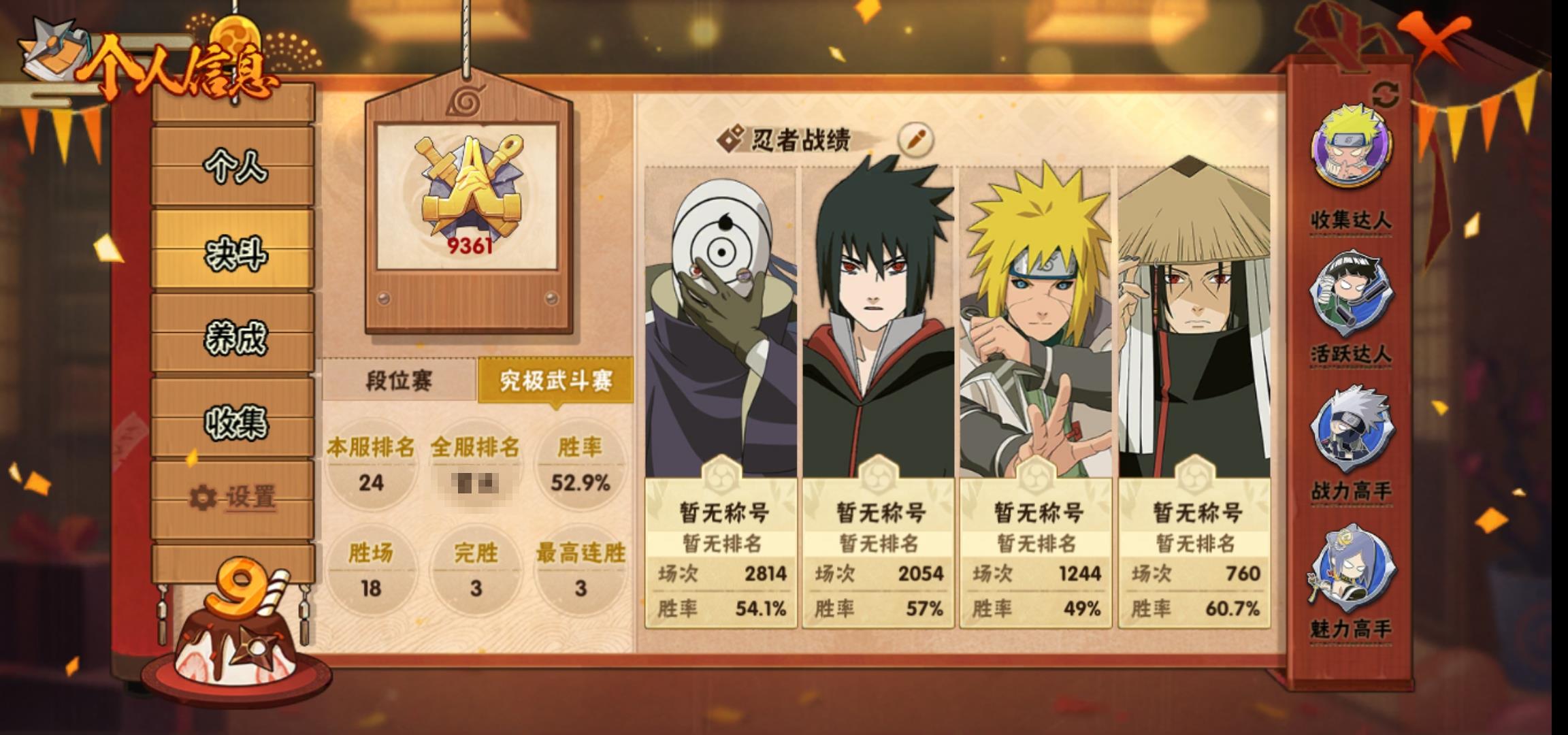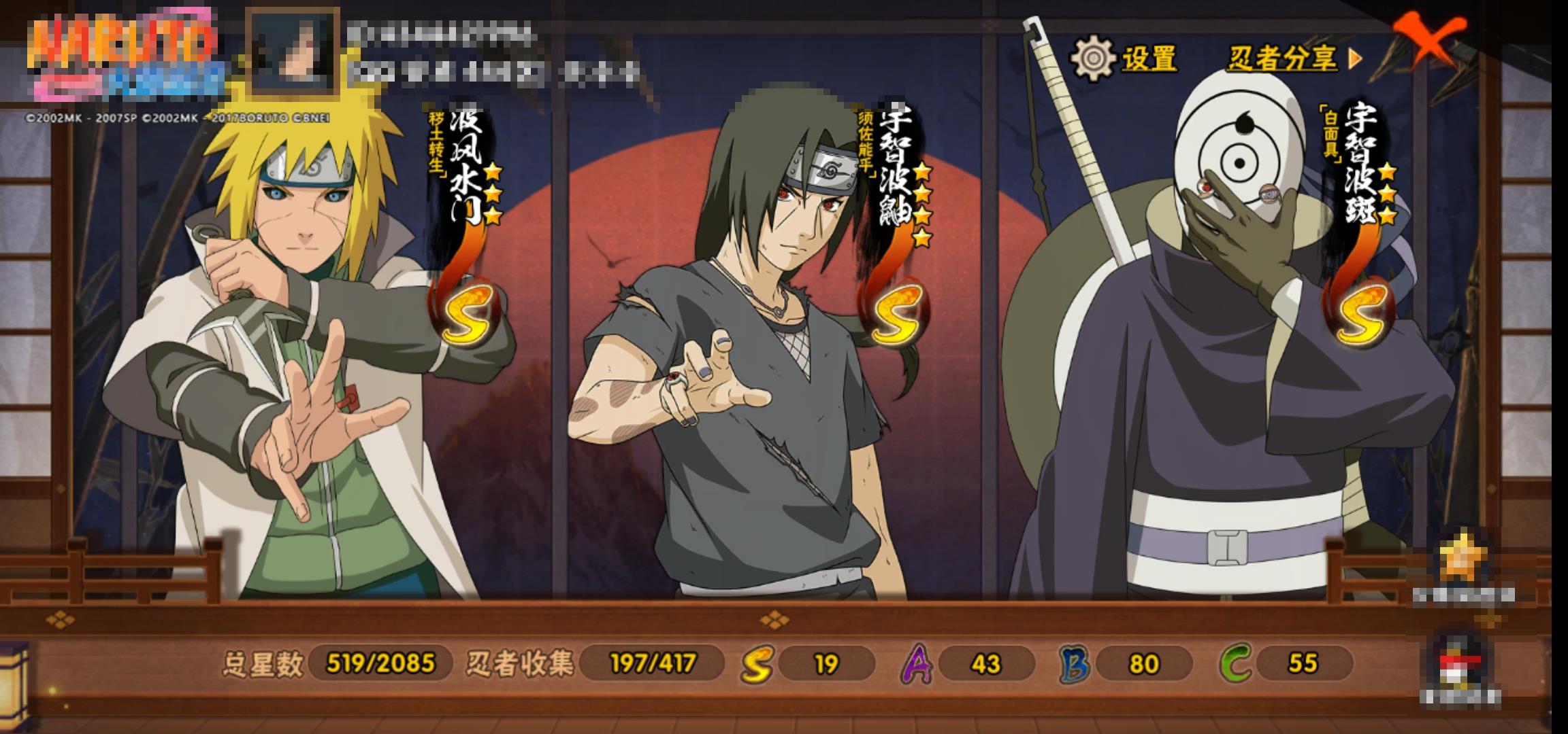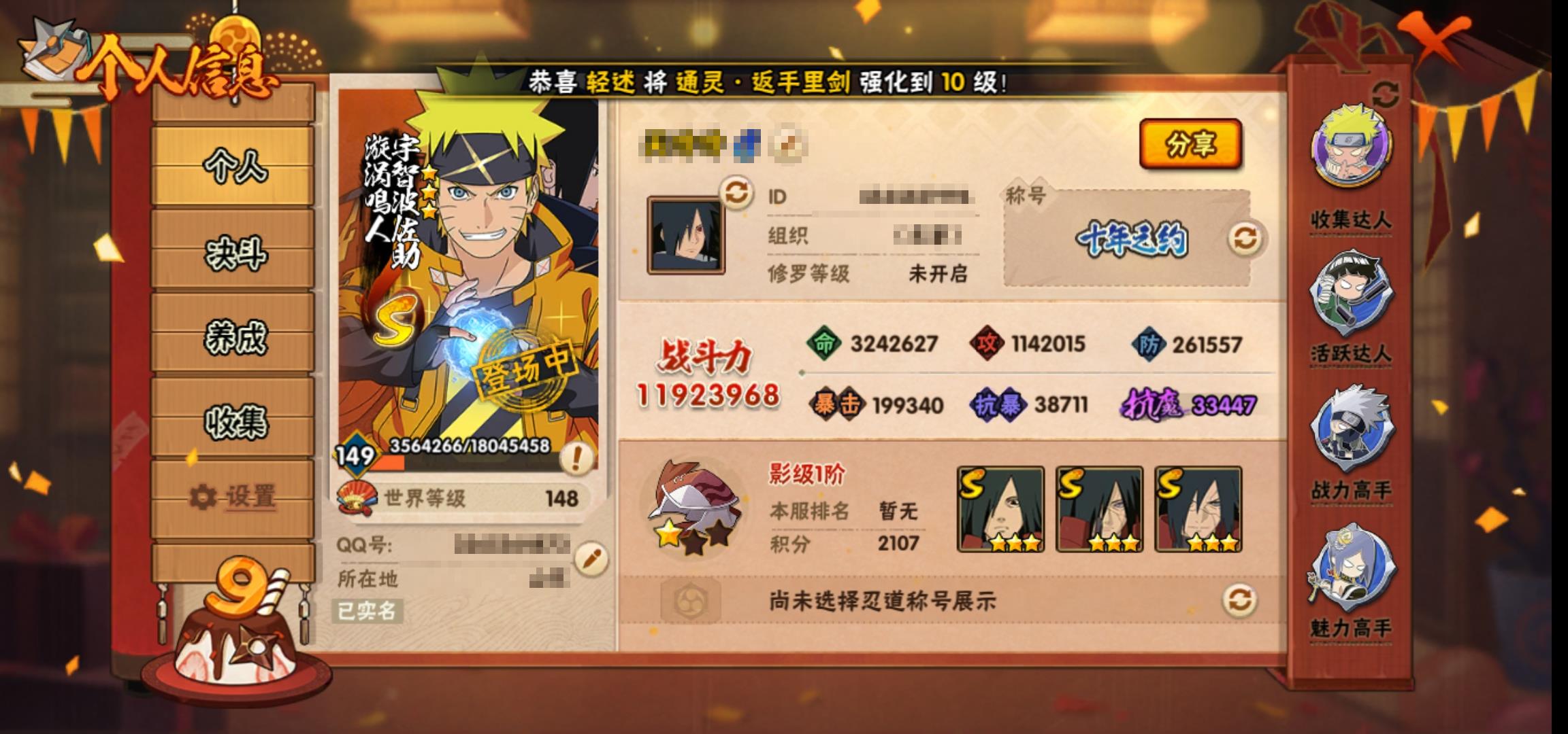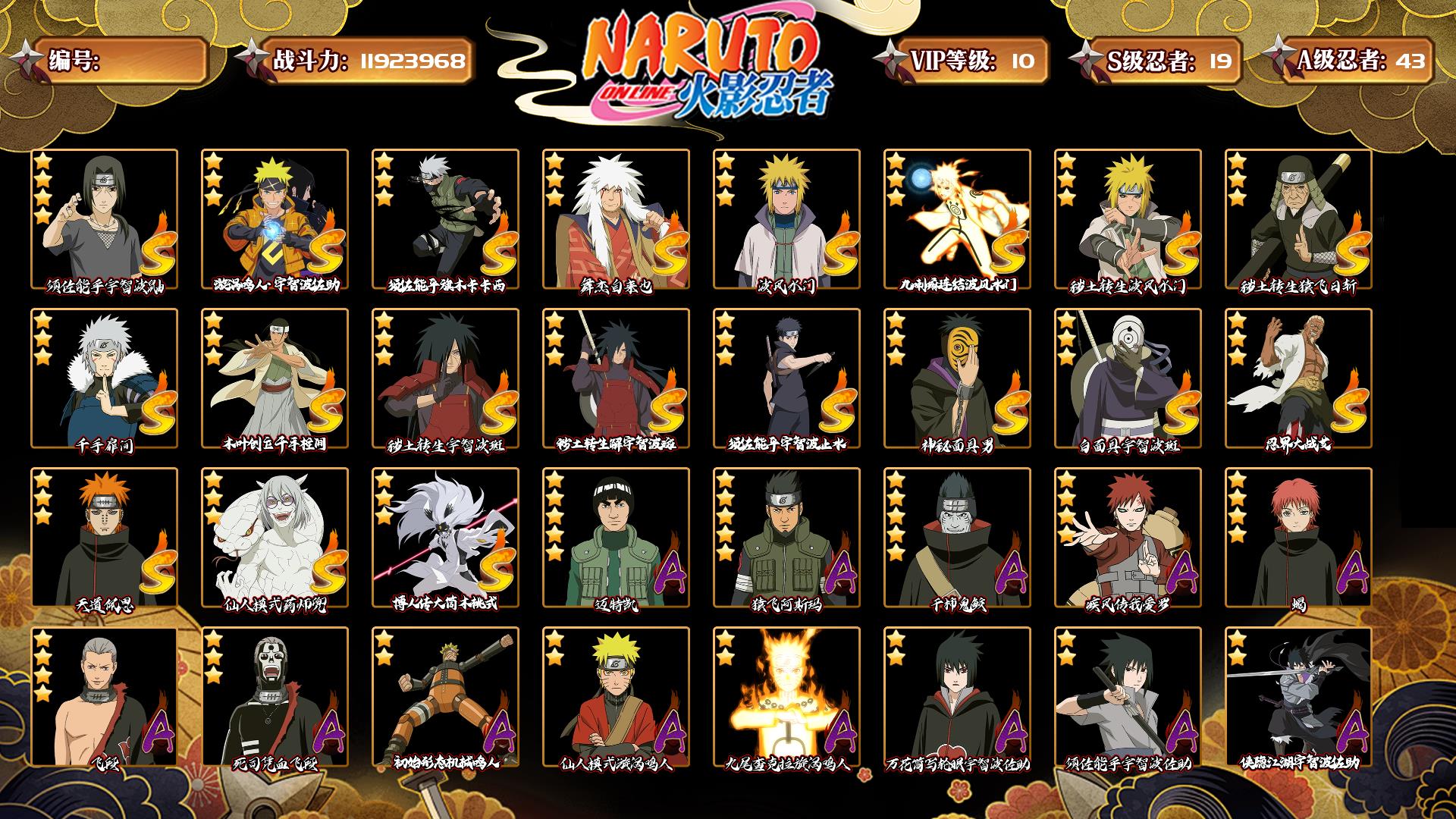 [14720957]0aqyud 号 vip10,1192w战力,s忍19个,a忍43个,本服排名578,战区排名未上榜,通灵兽317个,5时装,影级1阶,忍者星数519