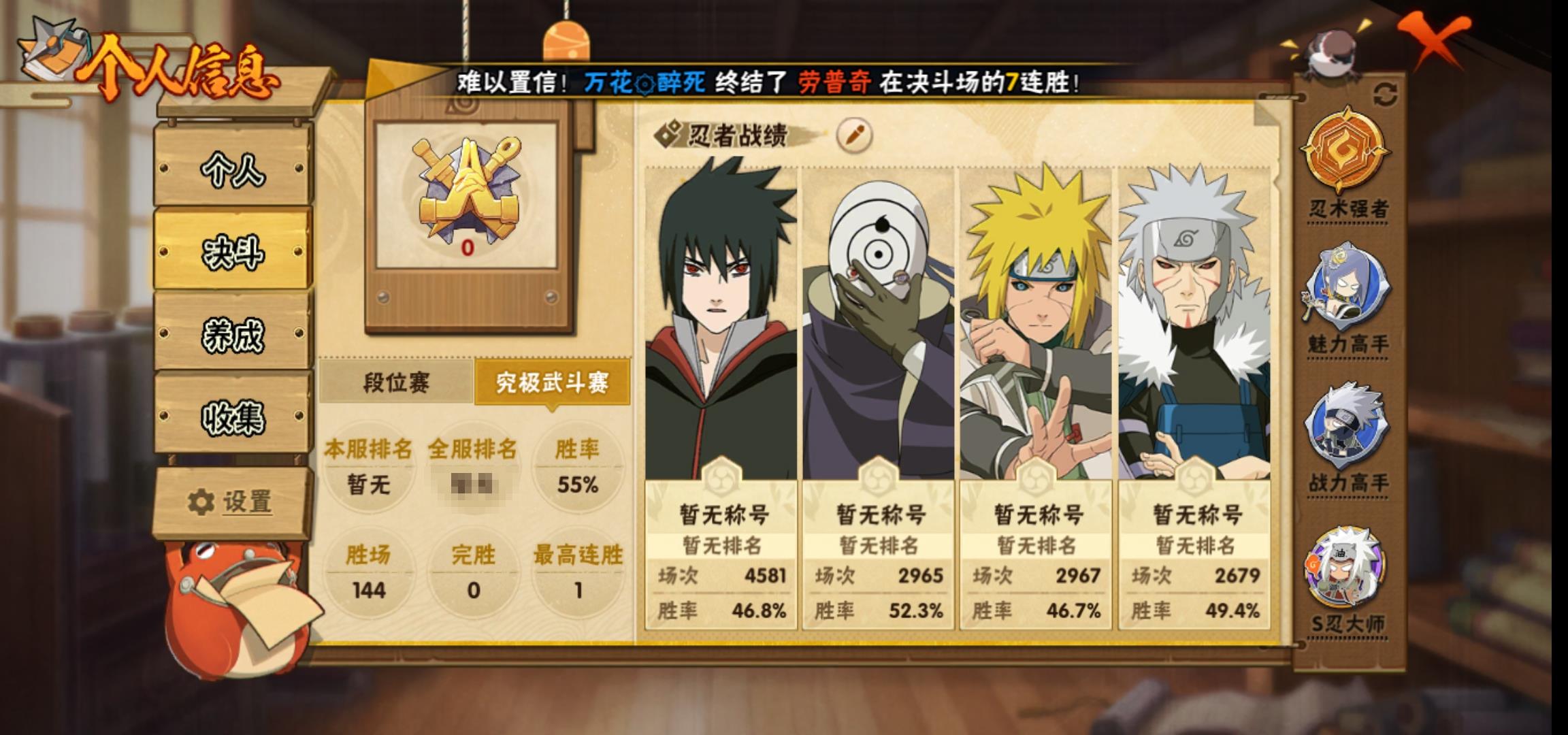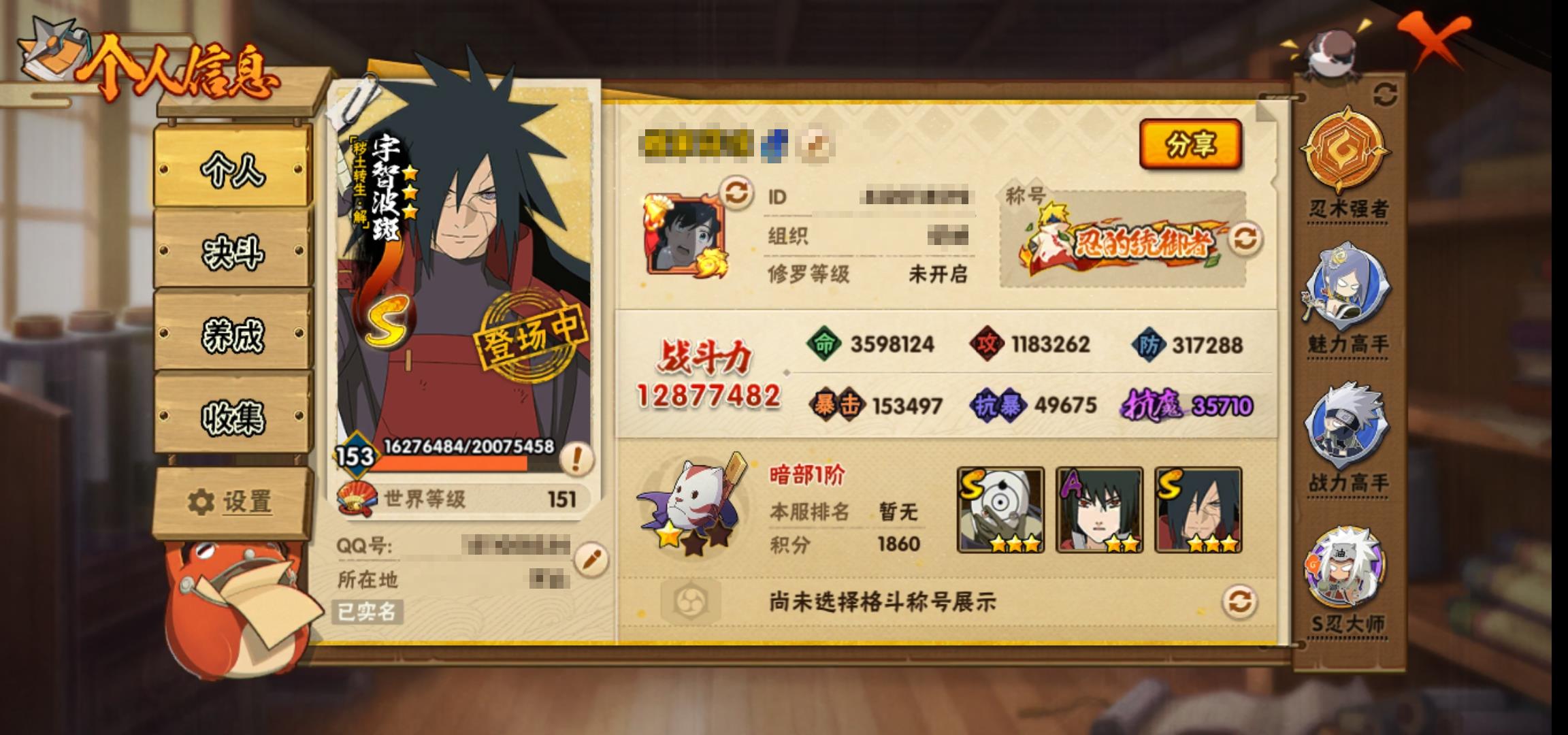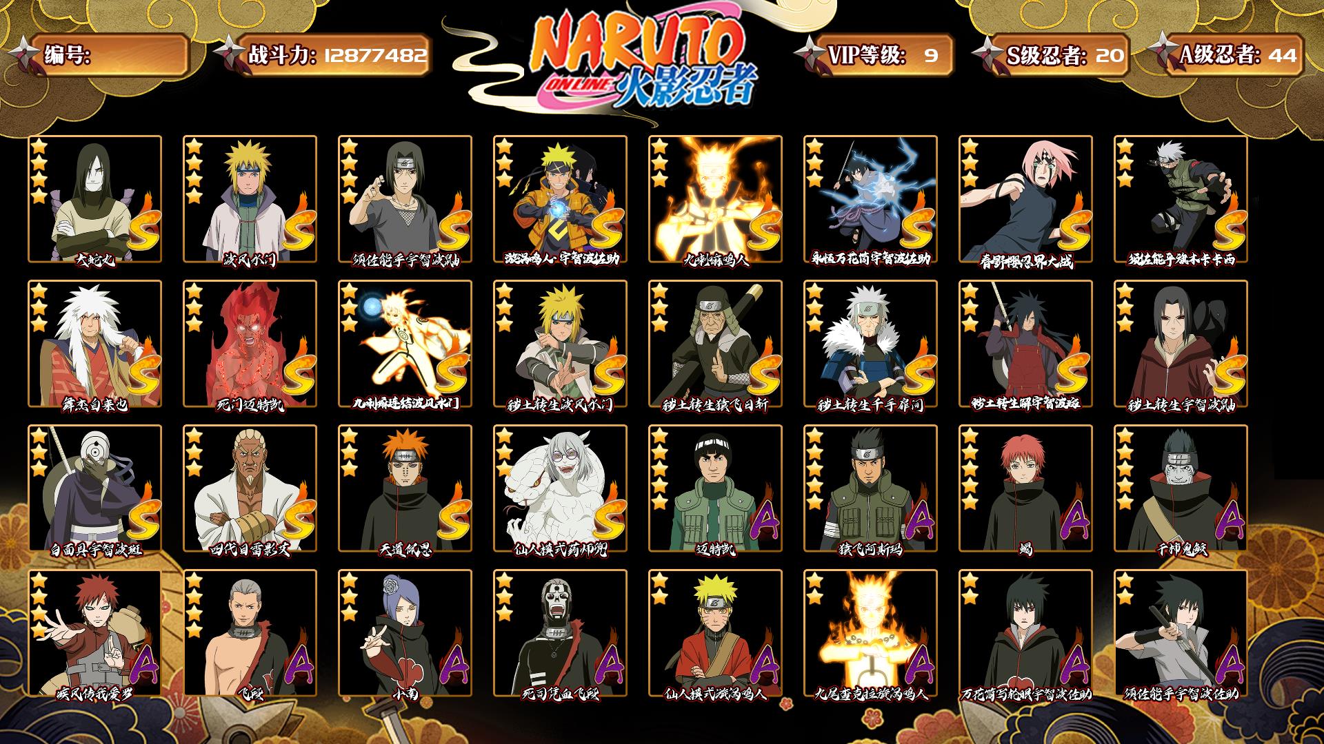 [14721529]0aqyts 号 vip9,1287w战力,s忍20个,a忍44个,本服排名672,战区排名未上榜,通灵兽317个,4时装,暗部1阶,忍者星数597