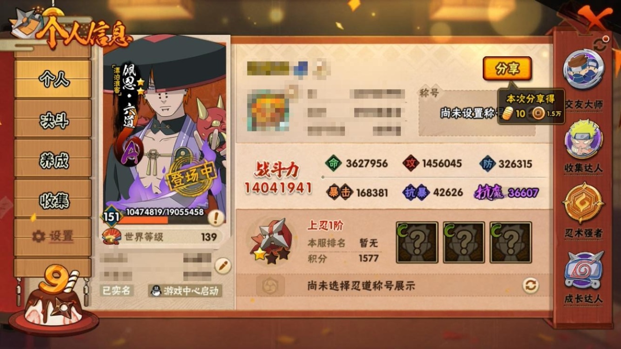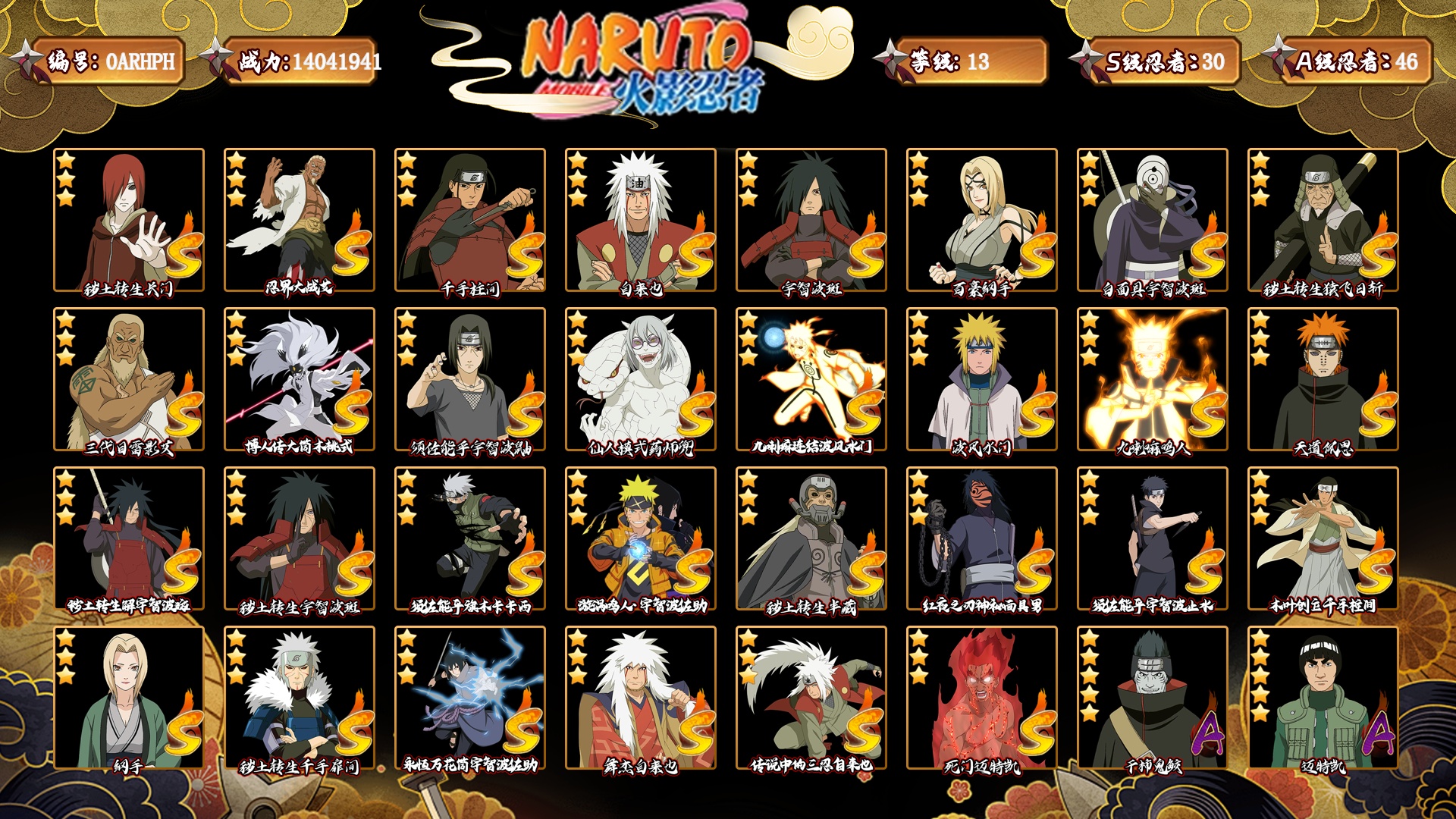 [14826303]0arhph 号,vip13,战力:14041941,s忍者数量:30,a忍者数量:46,本服排名:90,战区排名:未上榜,通灵兽数量:19,时装数:21,段位:上忍1阶,忍者星数:581