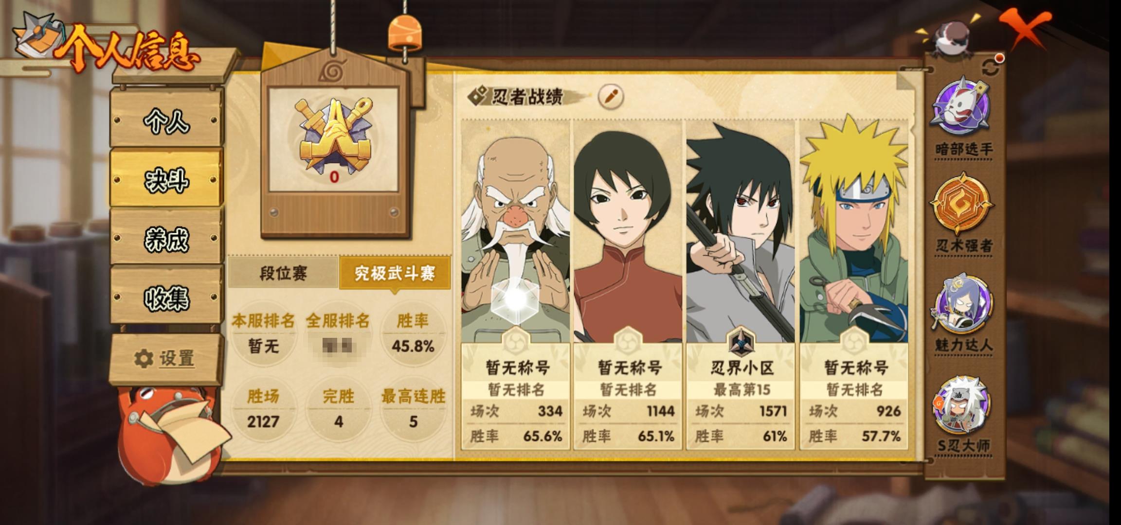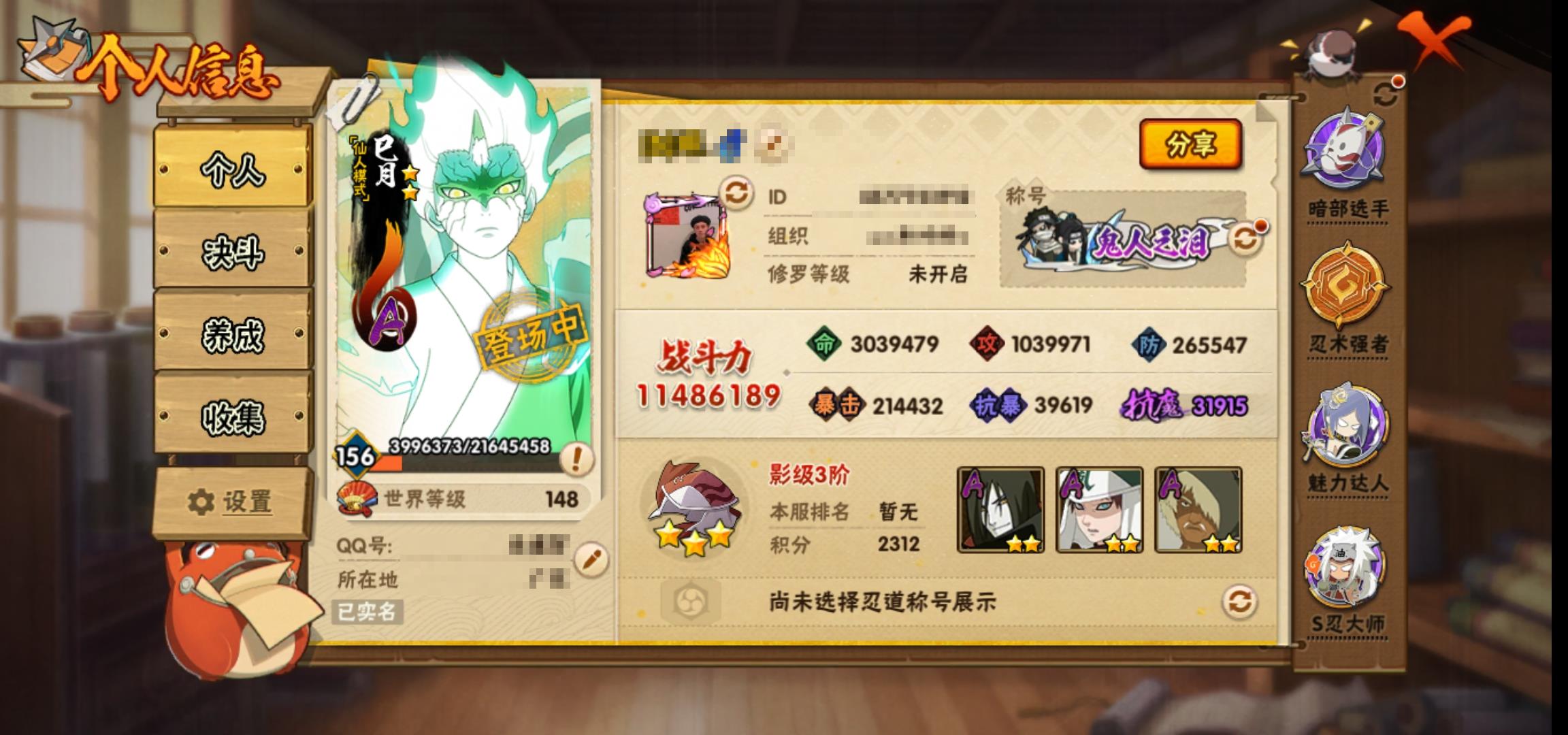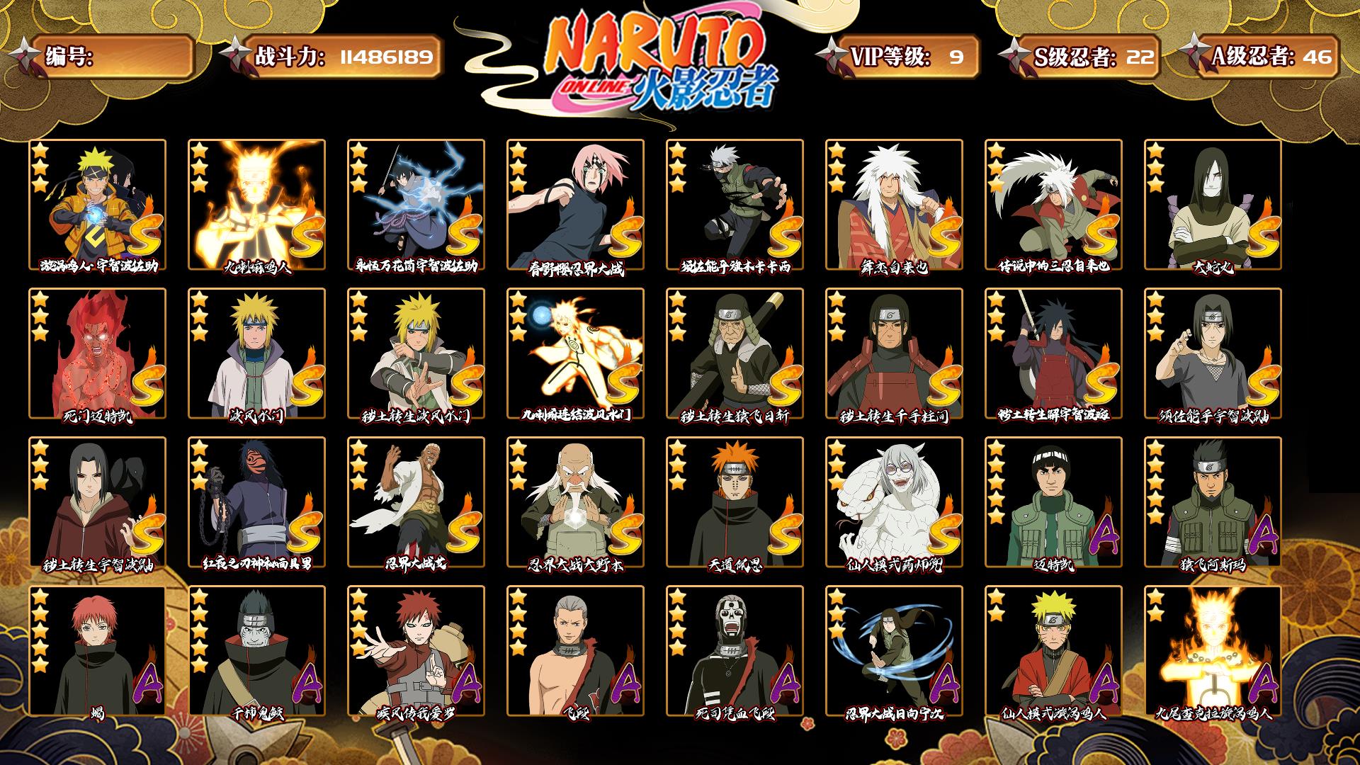 [14849070]0arpkn 号 vip9,1148w战力,s忍22个,a忍46个,本服排名573,战区排名未上榜,通灵兽318个,6时装,影级3阶,忍者星数540