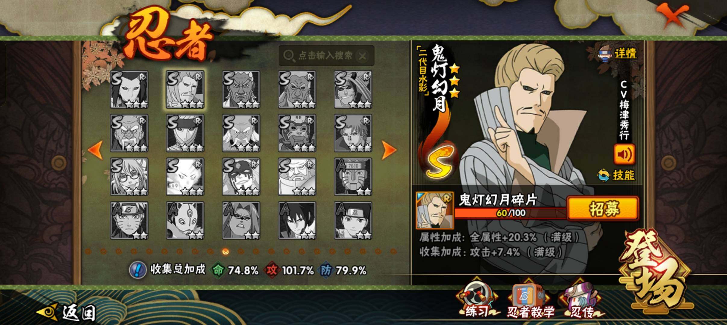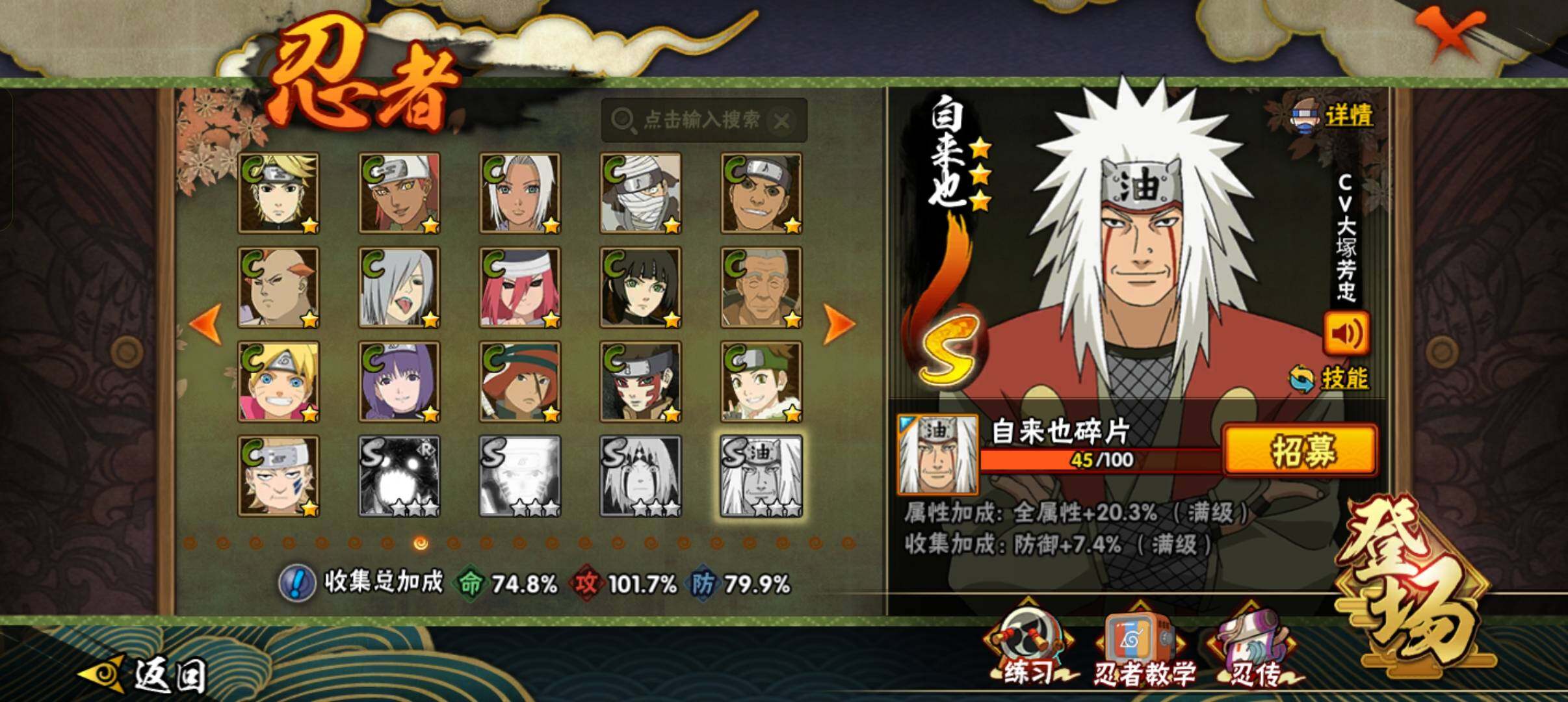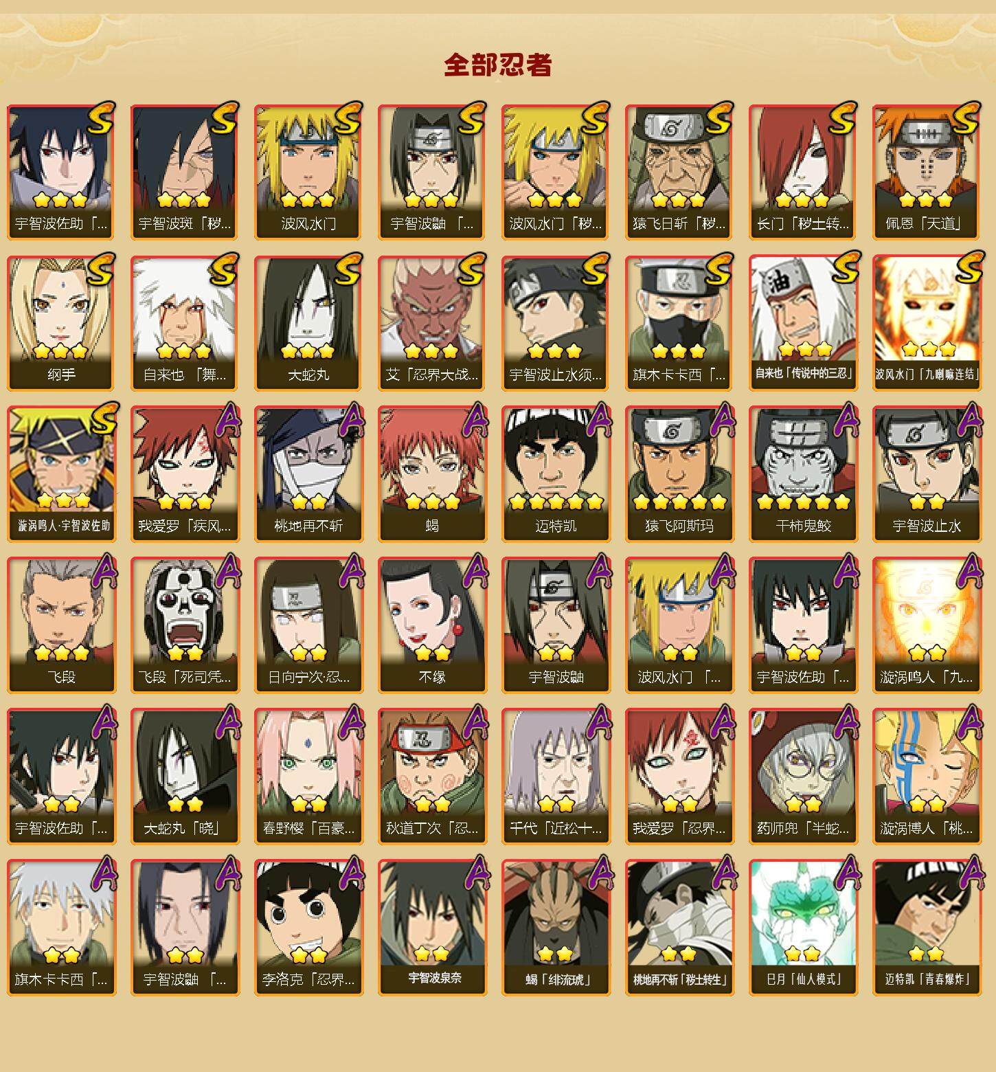 17s级忍者数-31a级忍者数 【s级忍者】:长门「秽土转生」3星,猿飞日斩「秽土转生」3星,波风水门「秽土转生」3星,宇智波斑「秽土转生·解」3星,艾「忍界大战」3星,宇智波鼬「须佐能乎」3星,宇智波止水「须佐能乎」3星,旗木卡卡西「须佐能乎」3星,自来也「舞之豪杰」3星,大蛇丸3星,自来也「传说中的三忍」3星,纲手3星,波风水门3星,佩恩「天道」3星,宇智波佐助「永恒万花筒」3星,波风水门「九喇嘛连结」3星,漩涡鸣人·宇智波佐助3星 【a级忍者】:波风水门「青年」2星,大蛇丸「晓」2星,飞段3星,飞段「死司凭血」2星,干柿鬼鲛5星,漩涡博人「桃式显现」2星,漩涡鸣人「九尾查克拉」2星,迈特凯5星,旗木卡卡西「幻之真容」2星,桃地再不斩2星,桃地再不斩「秽土转生」2星,我爱罗「疾风传」3星,我爱罗「忍界大战」2星,蝎3星,蝎「绯流琥」2星,猿飞阿斯玛5星,宇智波止水2星,宇智波鼬2星,宇智波鼬「夏日限定」2星,宇智波佐助「须佐能乎」2星,宇智波佐助「万花筒写轮眼」2星,药师兜「半蛇斗篷」2星,日向宁次「忍界大战」2星,李洛克「忍界大战」2星,春野樱「百豪」2星,秋道丁次「忍界大战」2星,千代「近松十人卫」2星,不缘2星,宇智波泉奈2星,巳月「仙人模式」2星,迈特凯「青春爆炸」2星