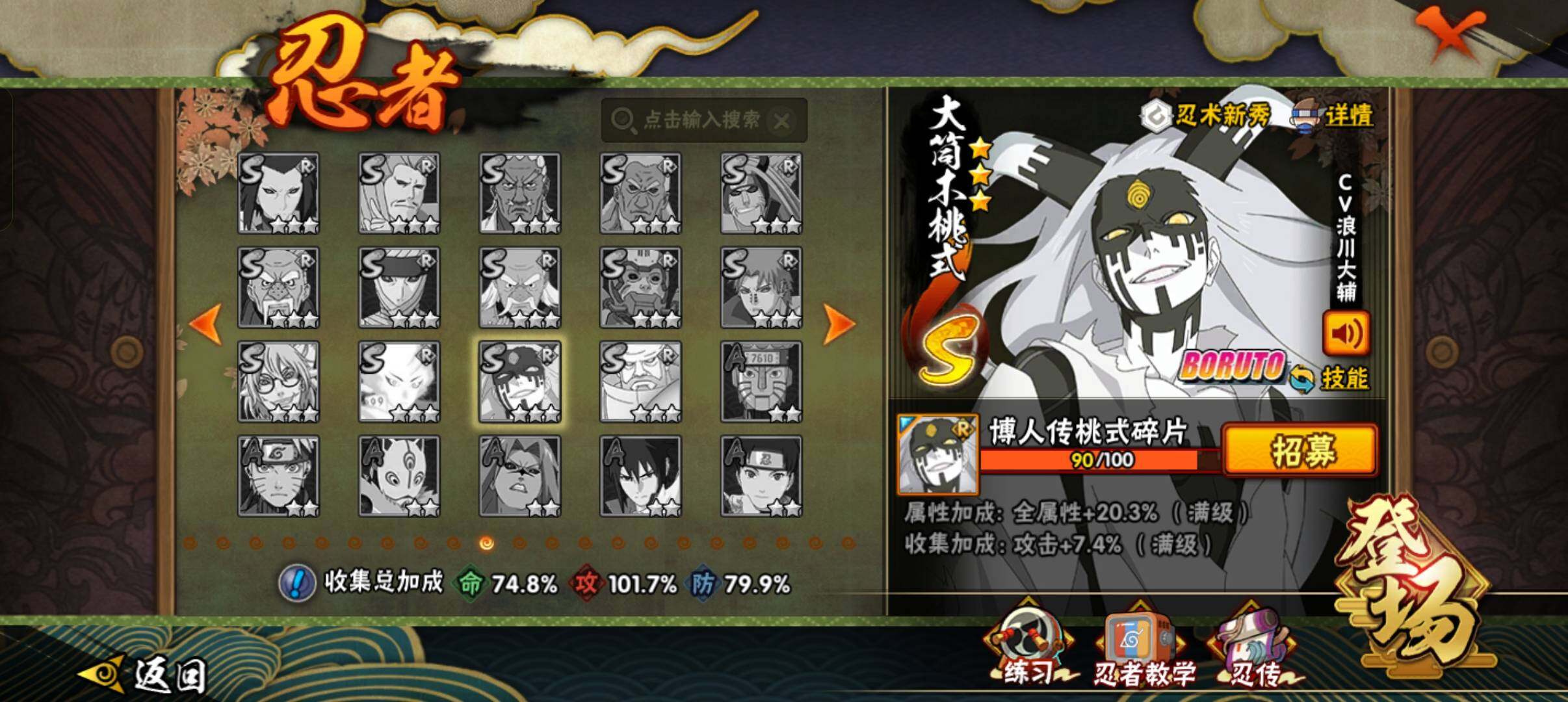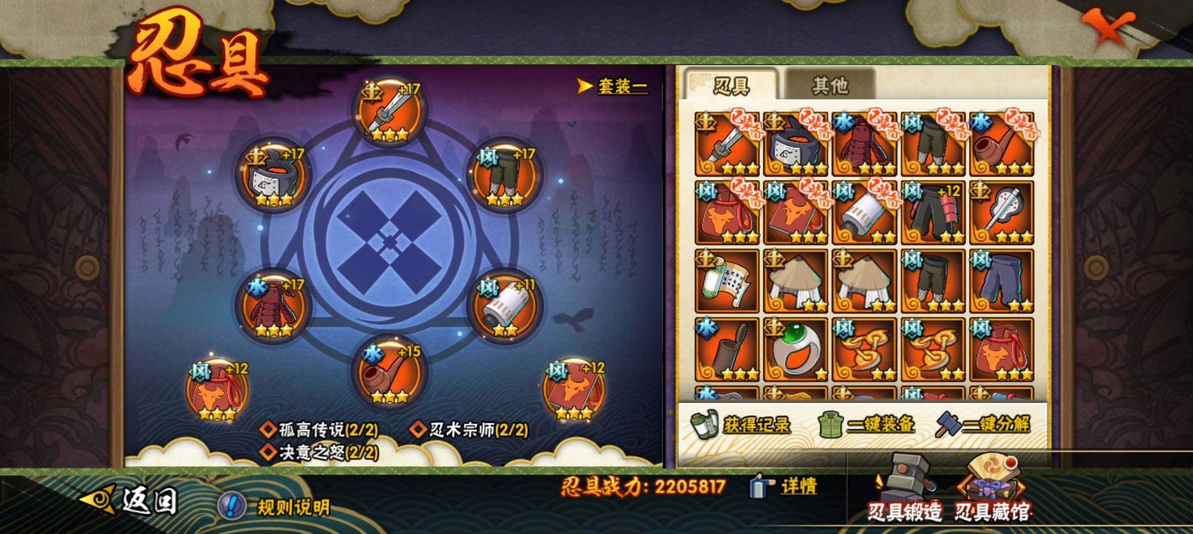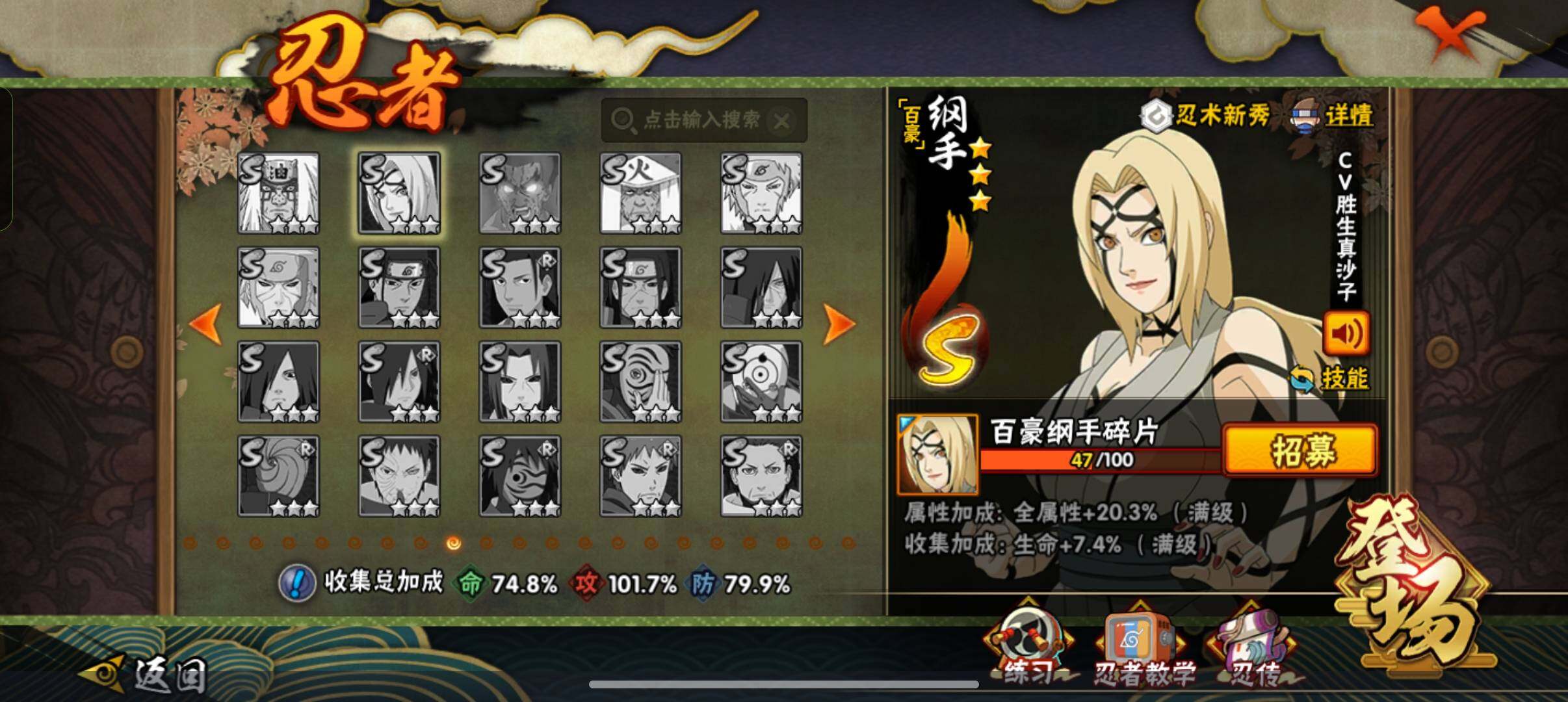 17s级忍者数-31a级忍者数 【s级忍者】:长门「秽土转生」3星,猿飞日斩「秽土转生」3星,波风水门「秽土转生」3星,宇智波斑「秽土转生·解」3星,艾「忍界大战」3星,宇智波鼬「须佐能乎」3星,宇智波止水「须佐能乎」3星,旗木卡卡西「须佐能乎」3星,自来也「舞之豪杰」3星,大蛇丸3星,自来也「传说中的三忍」3星,纲手3星,波风水门3星,佩恩「天道」3星,宇智波佐助「永恒万花筒」3星,波风水门「九喇嘛连结」3星,漩涡鸣人·宇智波佐助3星 【a级忍者】:波风水门「青年」2星,大蛇丸「晓」2星,飞段3星,飞段「死司凭血」2星,干柿鬼鲛5星,漩涡博人「桃式显现」2星,漩涡鸣人「九尾查克拉」2星,迈特凯5星,旗木卡卡西「幻之真容」2星,桃地再不斩2星,桃地再不斩「秽土转生」2星,我爱罗「疾风传」3星,我爱罗「忍界大战」2星,蝎3星,蝎「绯流琥」2星,猿飞阿斯玛5星,宇智波止水2星,宇智波鼬2星,宇智波鼬「夏日限定」2星,宇智波佐助「须佐能乎」2星,宇智波佐助「万花筒写轮眼」2星,药师兜「半蛇斗篷」2星,日向宁次「忍界大战」2星,李洛克「忍界大战」2星,春野樱「百豪」2星,秋道丁次「忍界大战」2星,千代「近松十人卫」2星,不缘2星,宇智波泉奈2星,巳月「仙人模式」2星,迈特凯「青春爆炸」2星