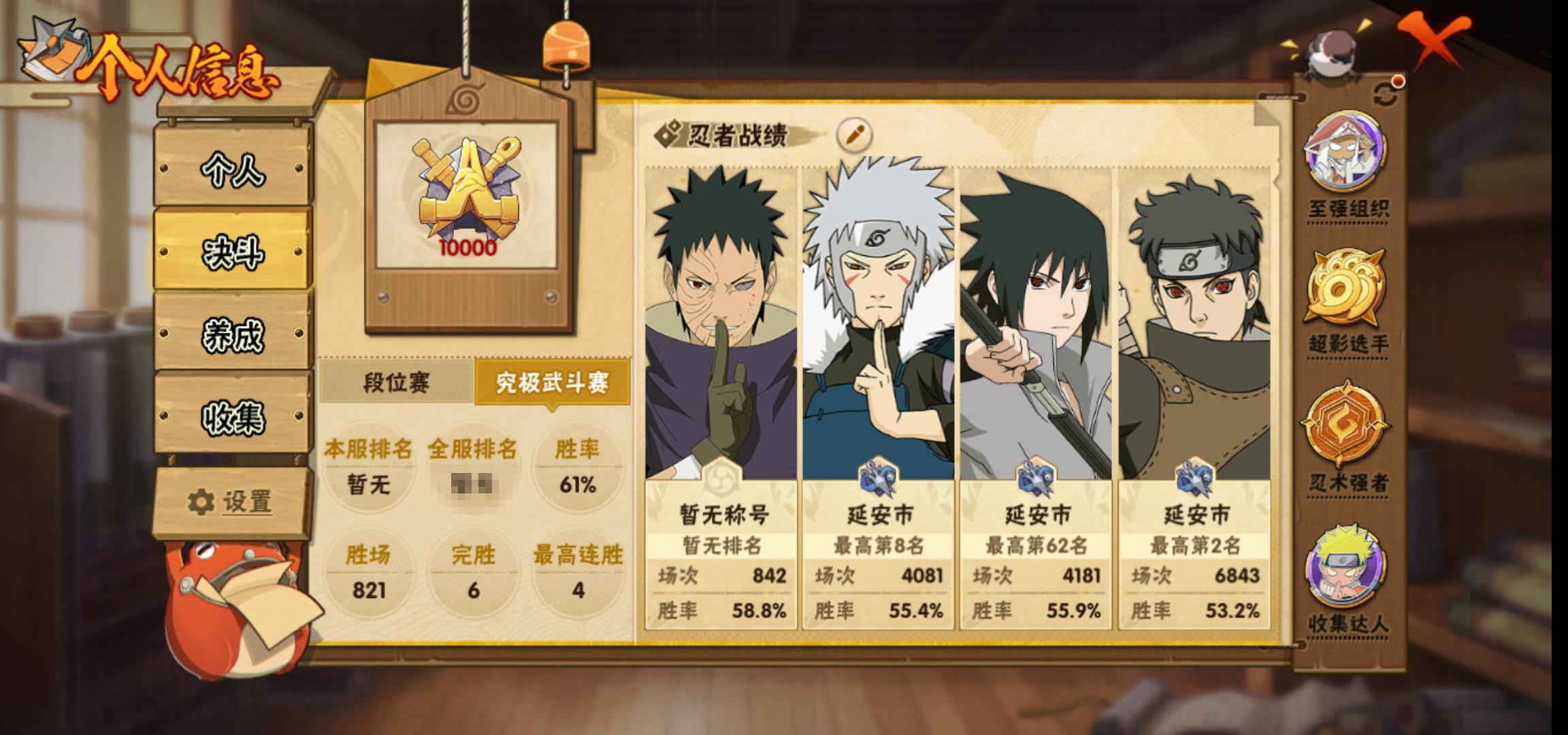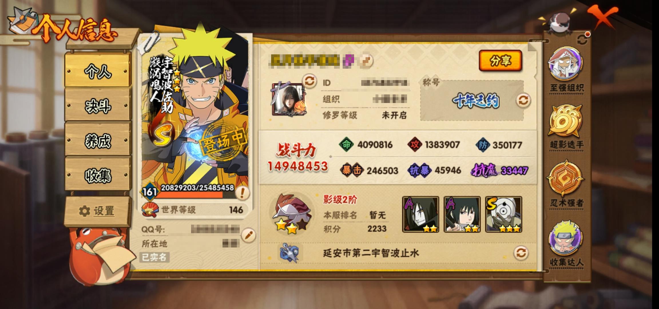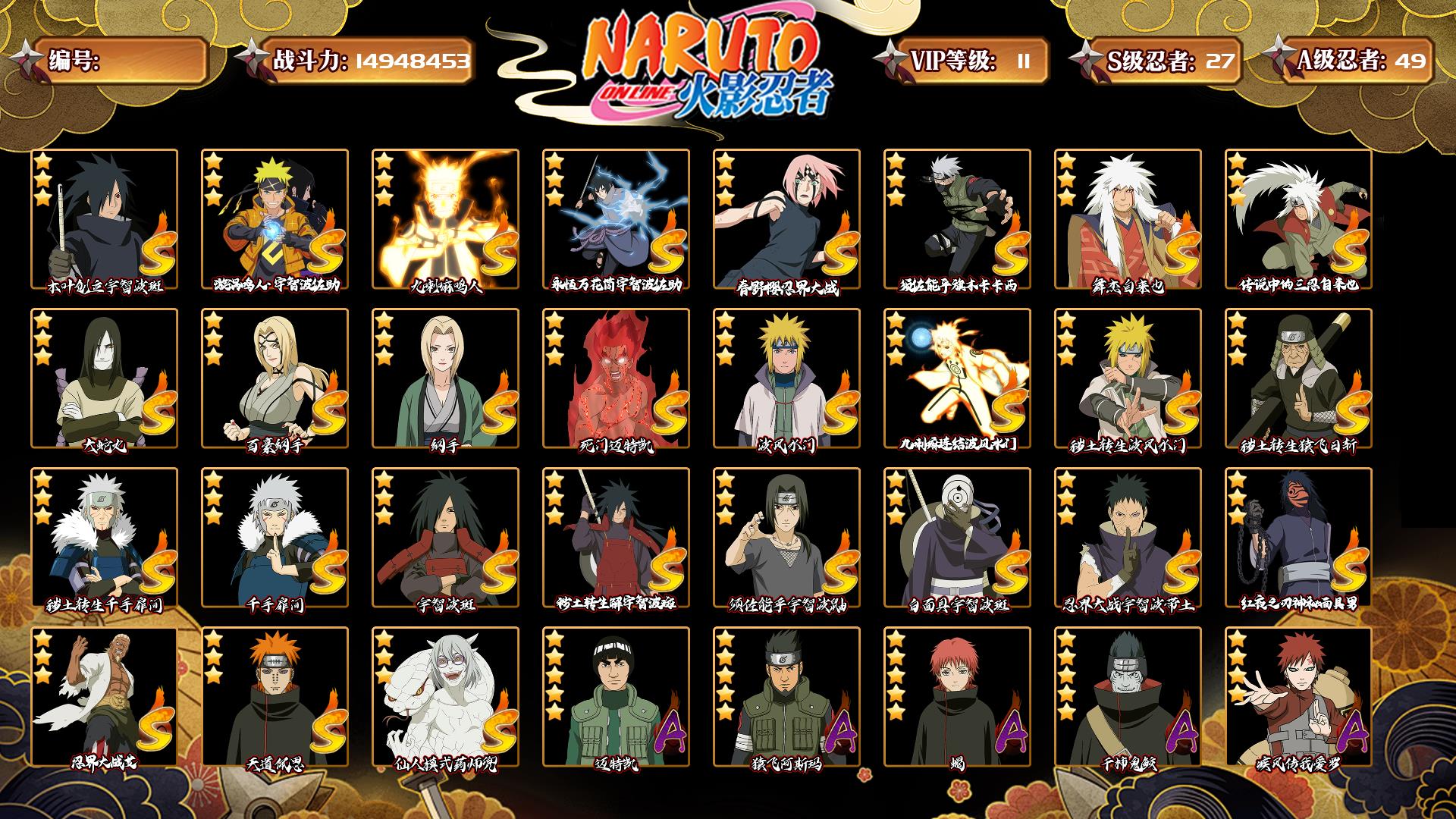 [15053650]0ass1q 号 vip11,1494w战力,s忍27个,a忍49个,本服排名243,战区排名未上榜,通灵兽322个,6时装,影级2阶,忍者星数676