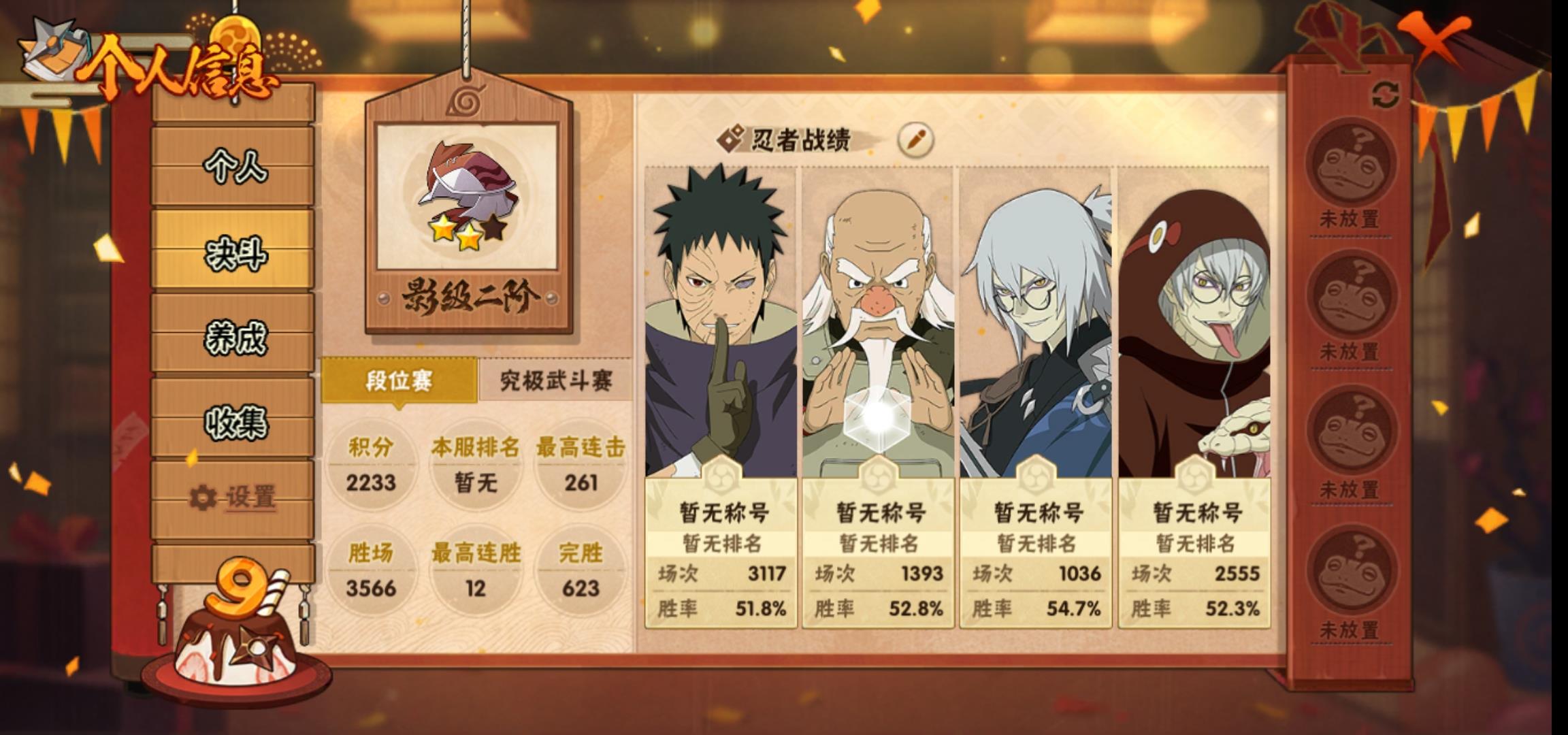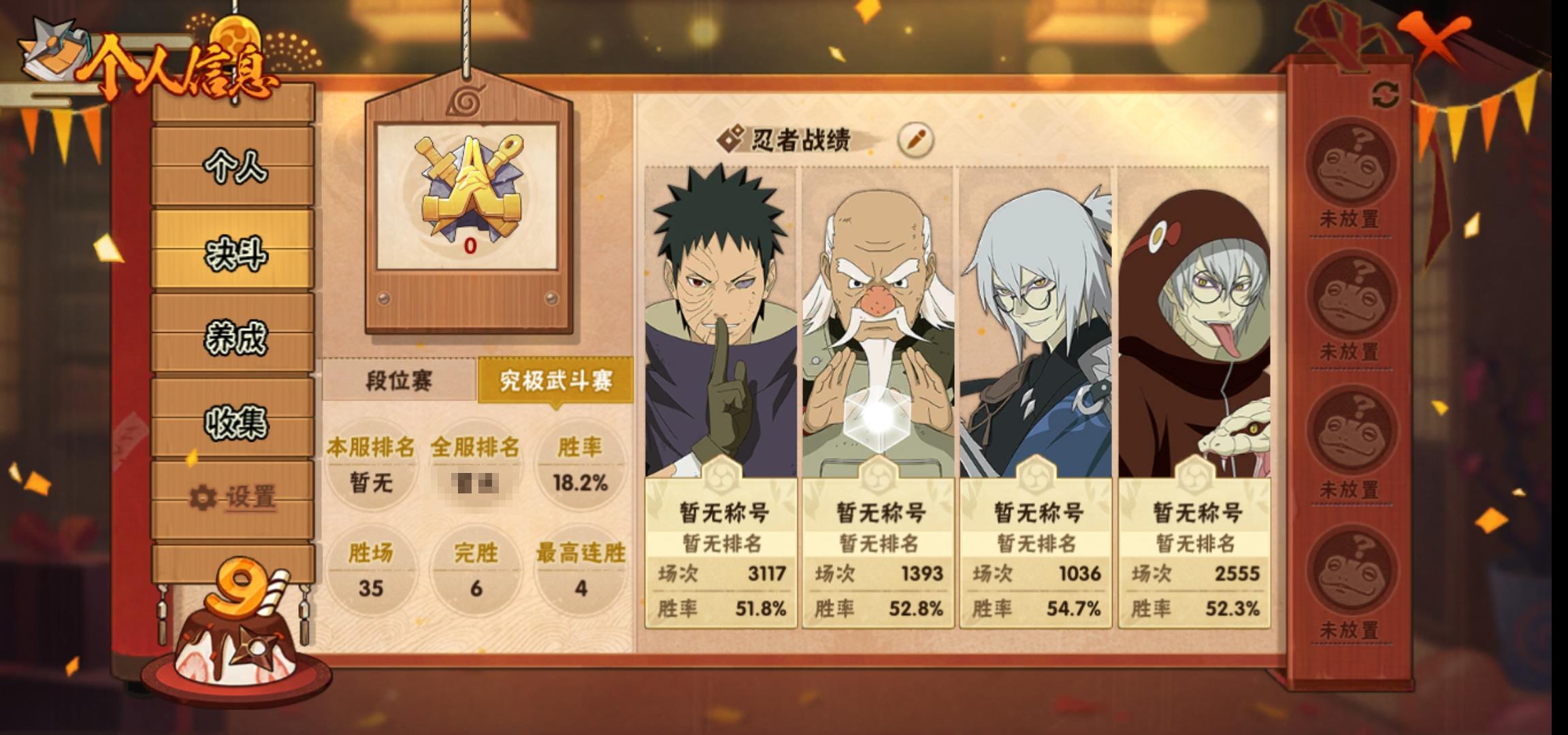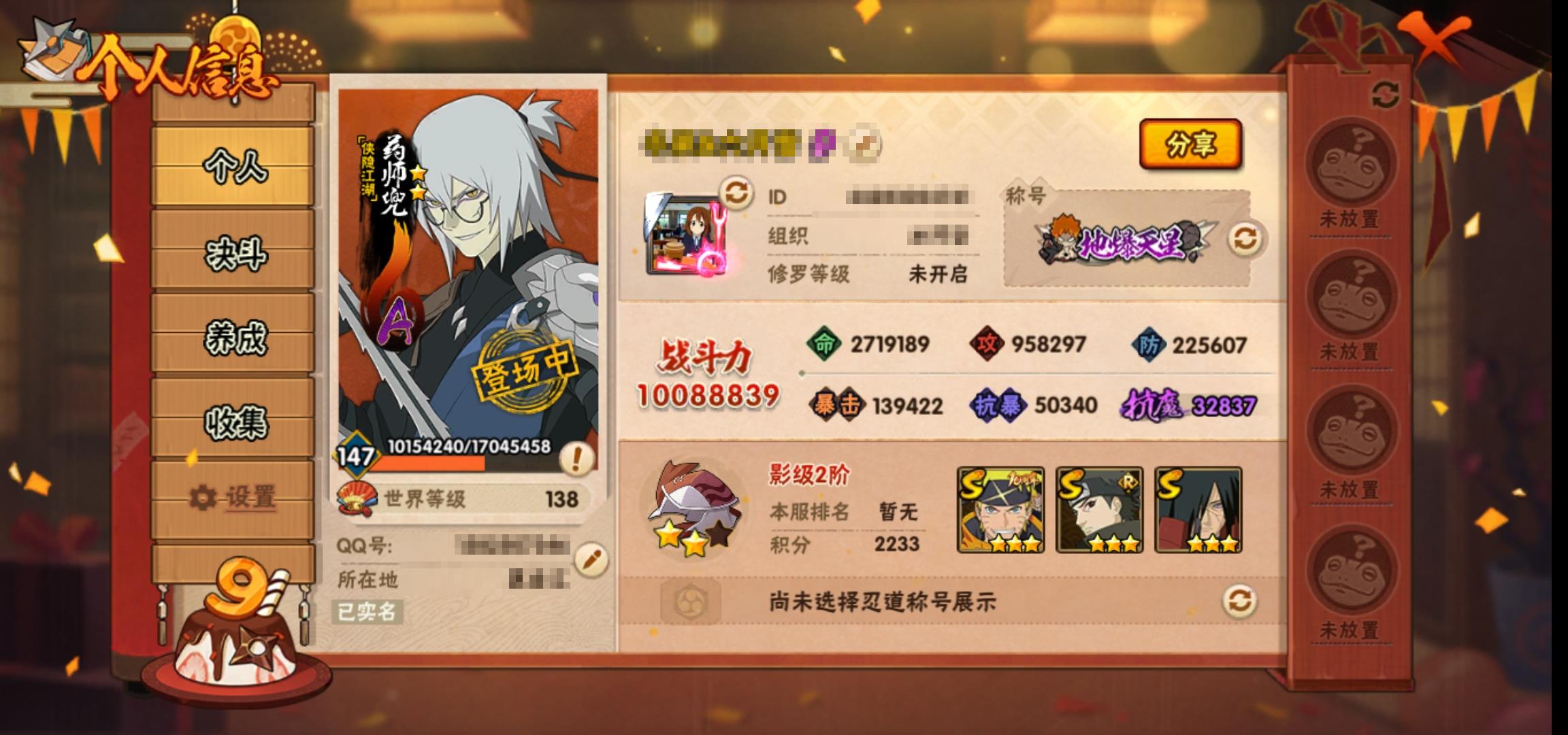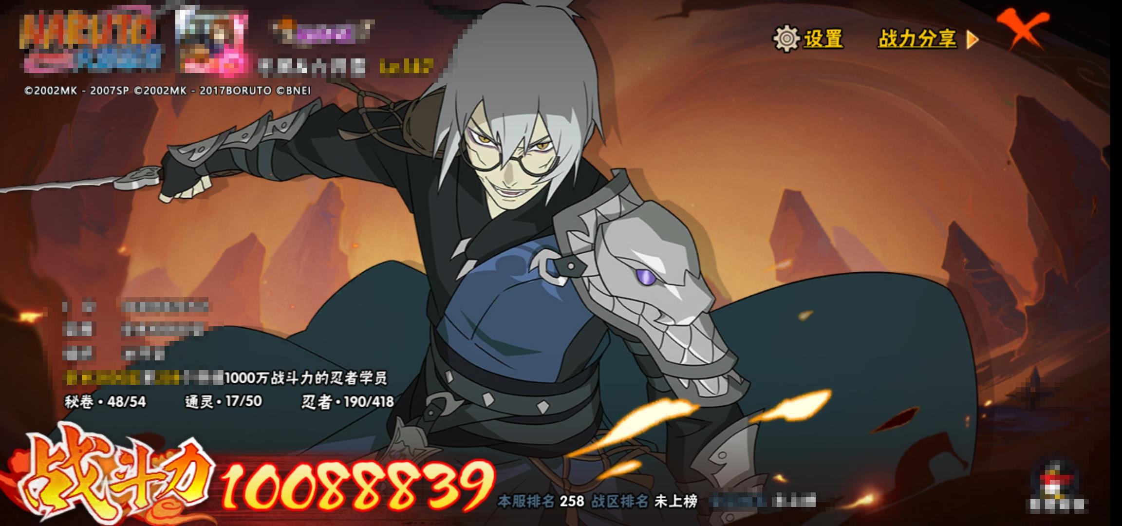 [15058313]0asrpn 号 vip10,1008w战力,s忍24个,a忍38个,本服排名258,战区排名未上榜,通灵兽317个,8时装,影级2阶,忍者星数494
