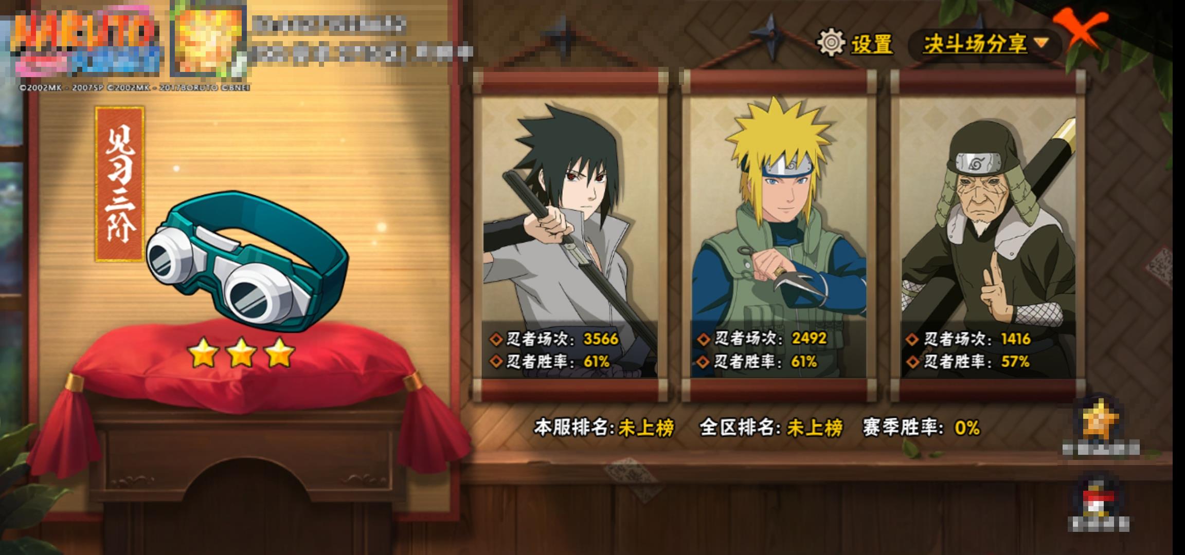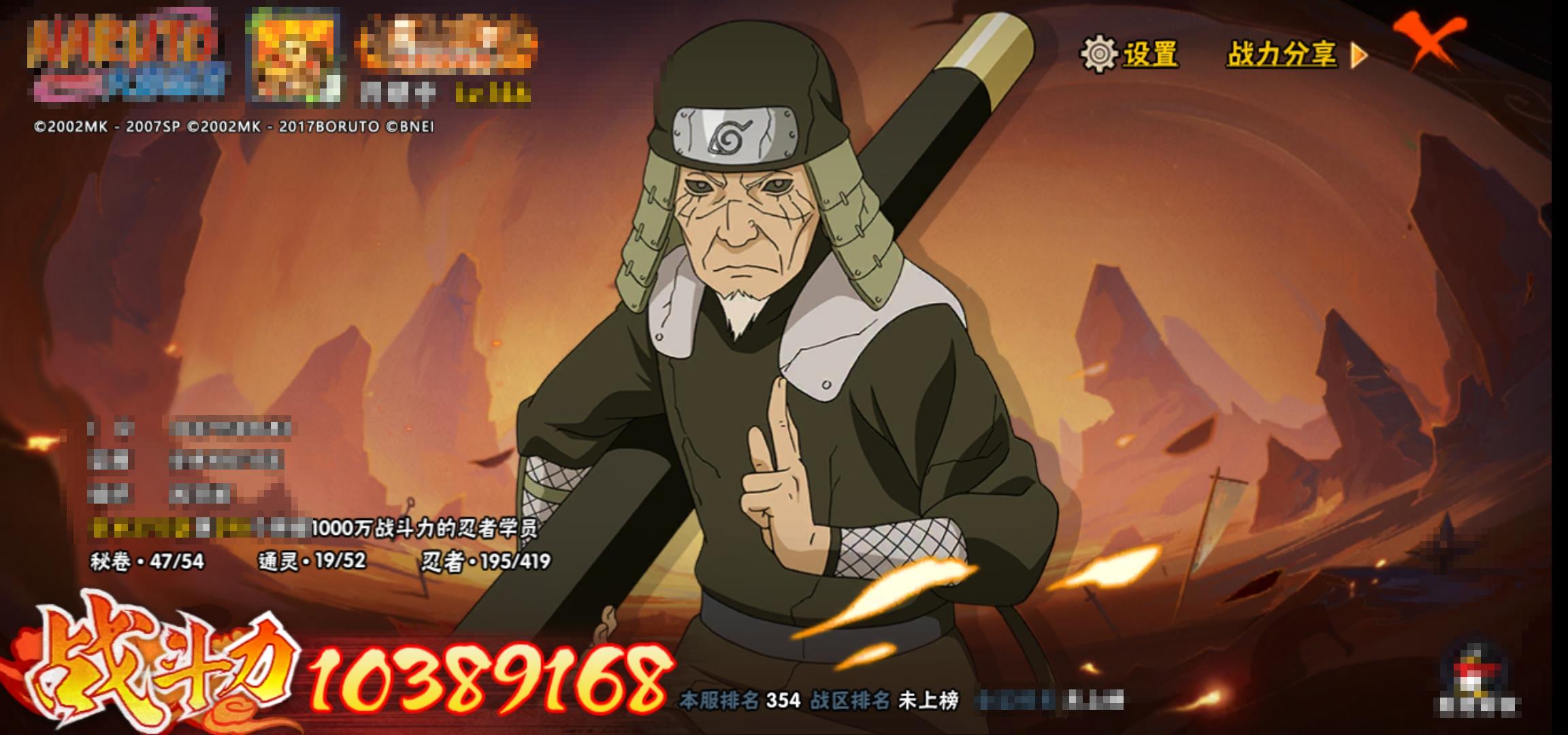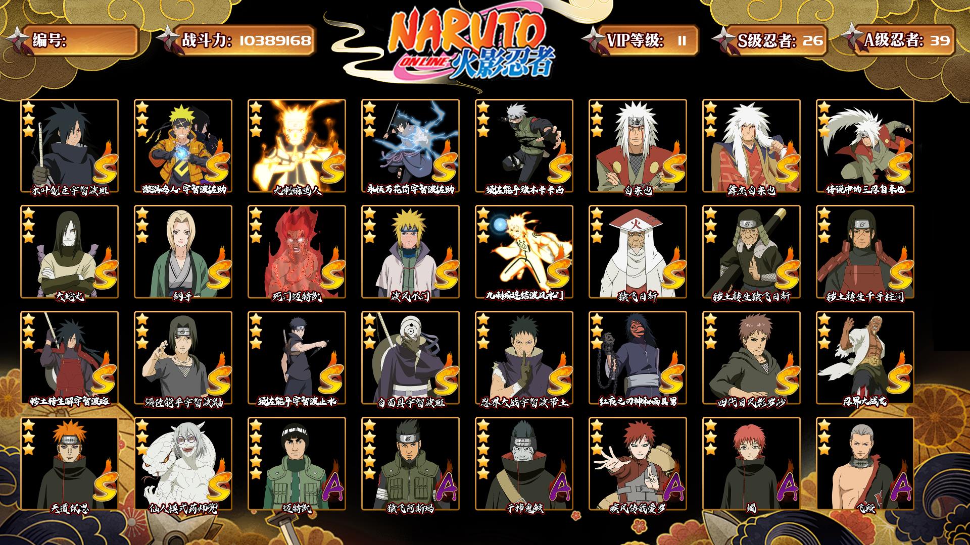 [15119817]0asz3v 号 vip11,1038w战力,s忍26个,a忍39个,本服排名354,战区排名未上榜,通灵兽319个,7时装,见习3阶,忍者星数508