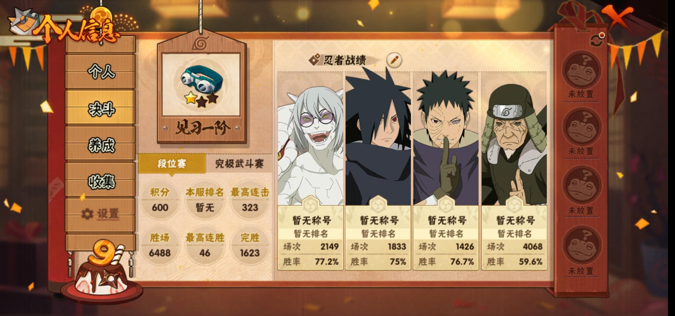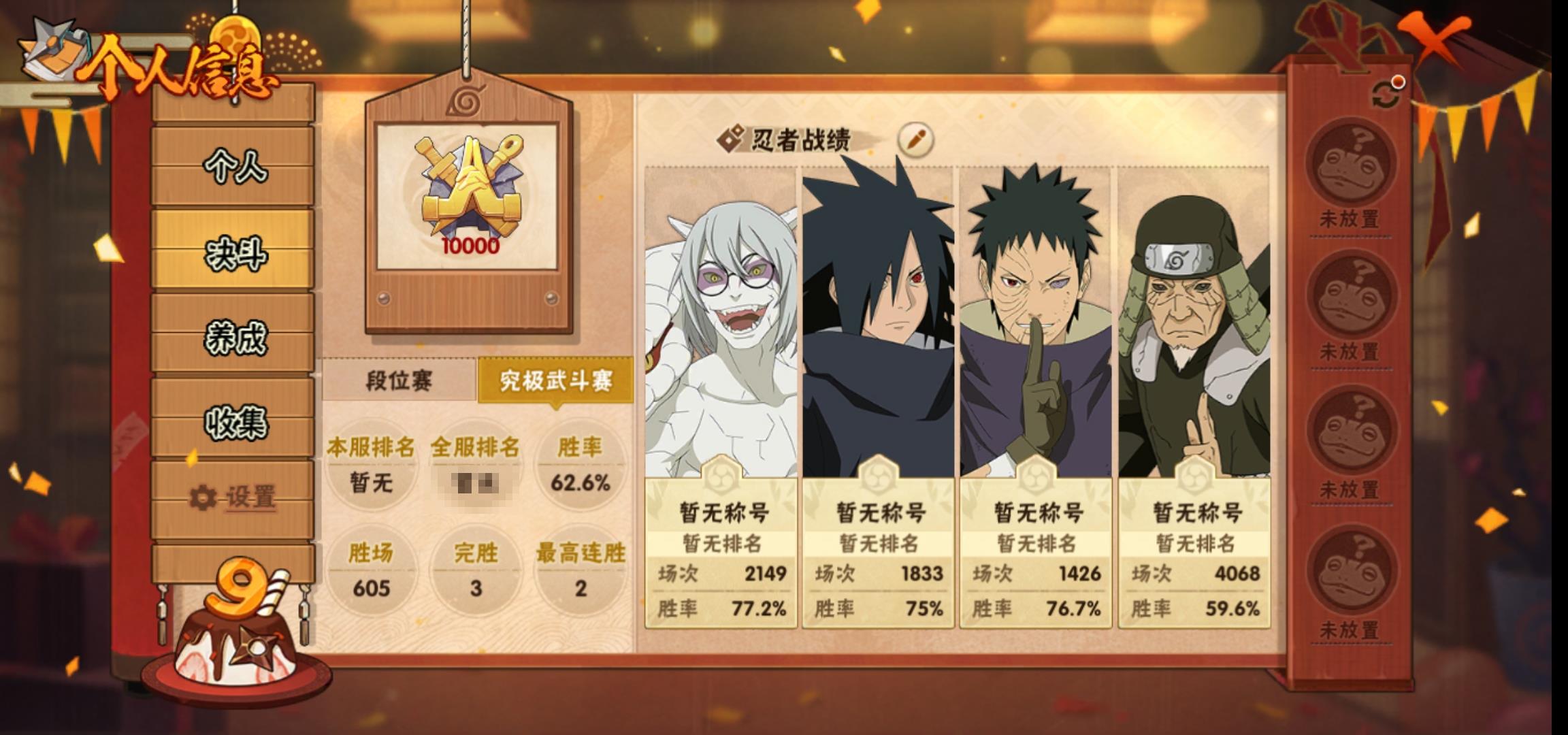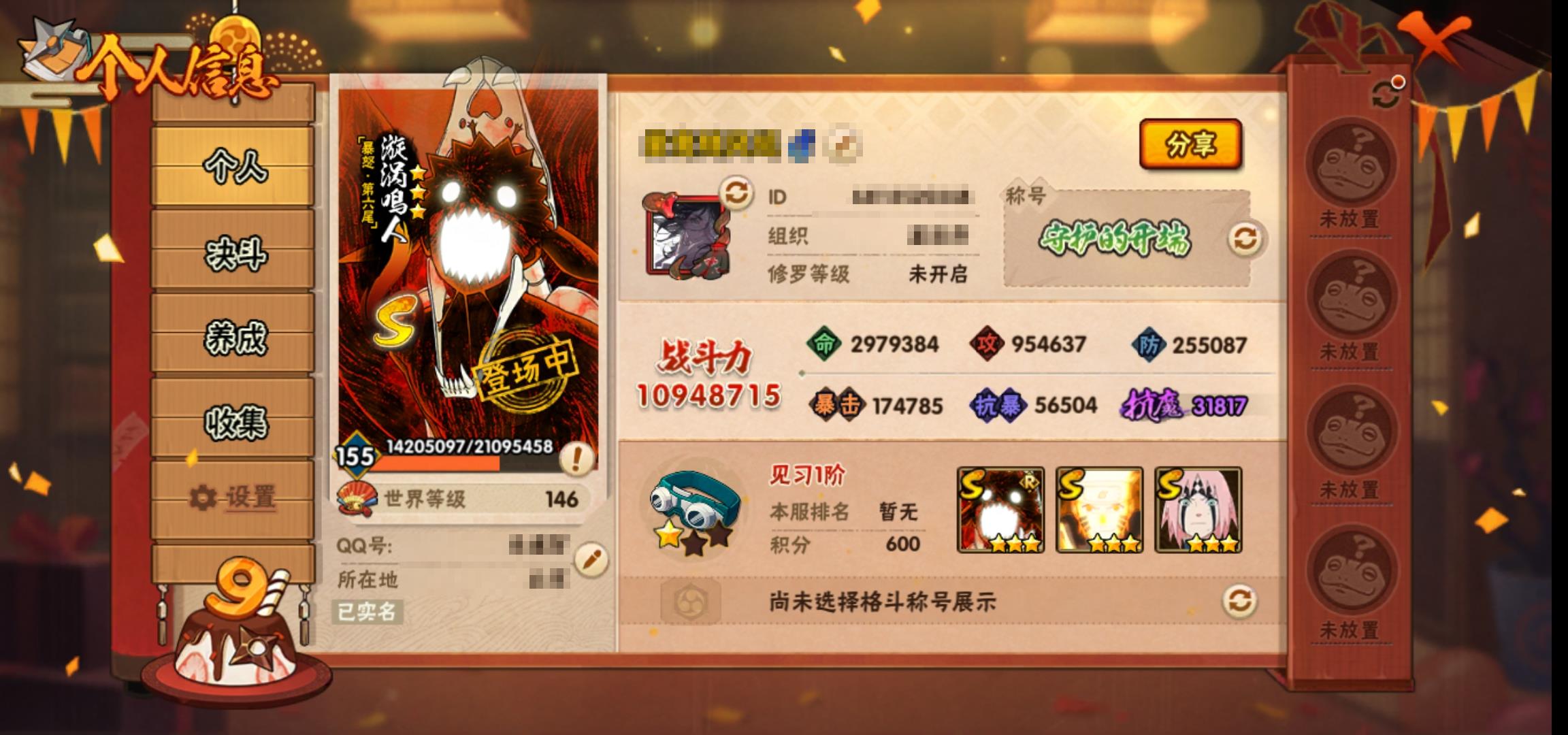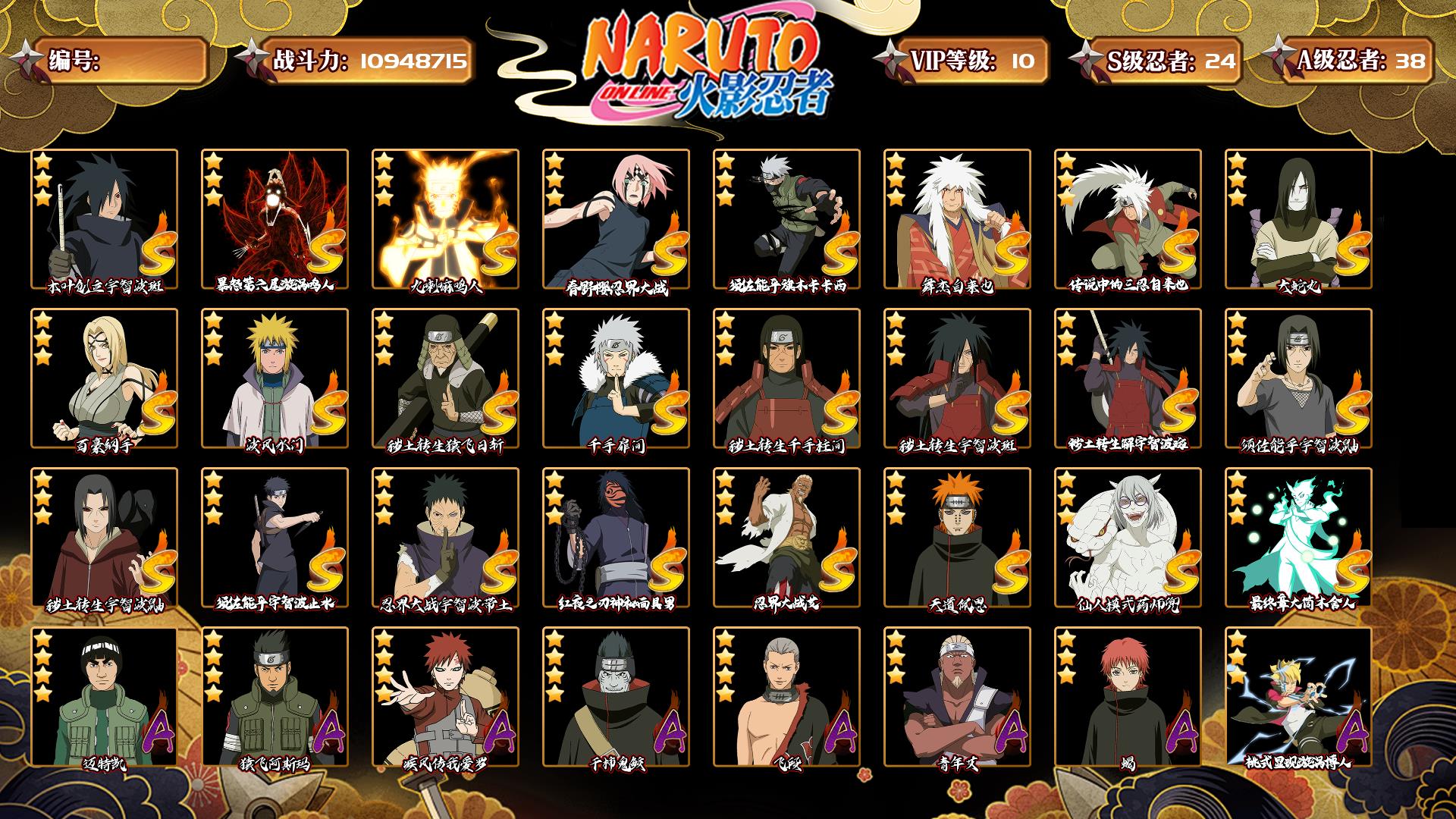 [15163386]0atfw4 号 vip10,1094w战力,s忍24个,a忍38个,本服排名565,战区排名未上榜,通灵兽318个,6时装,见习1阶,忍者星数520