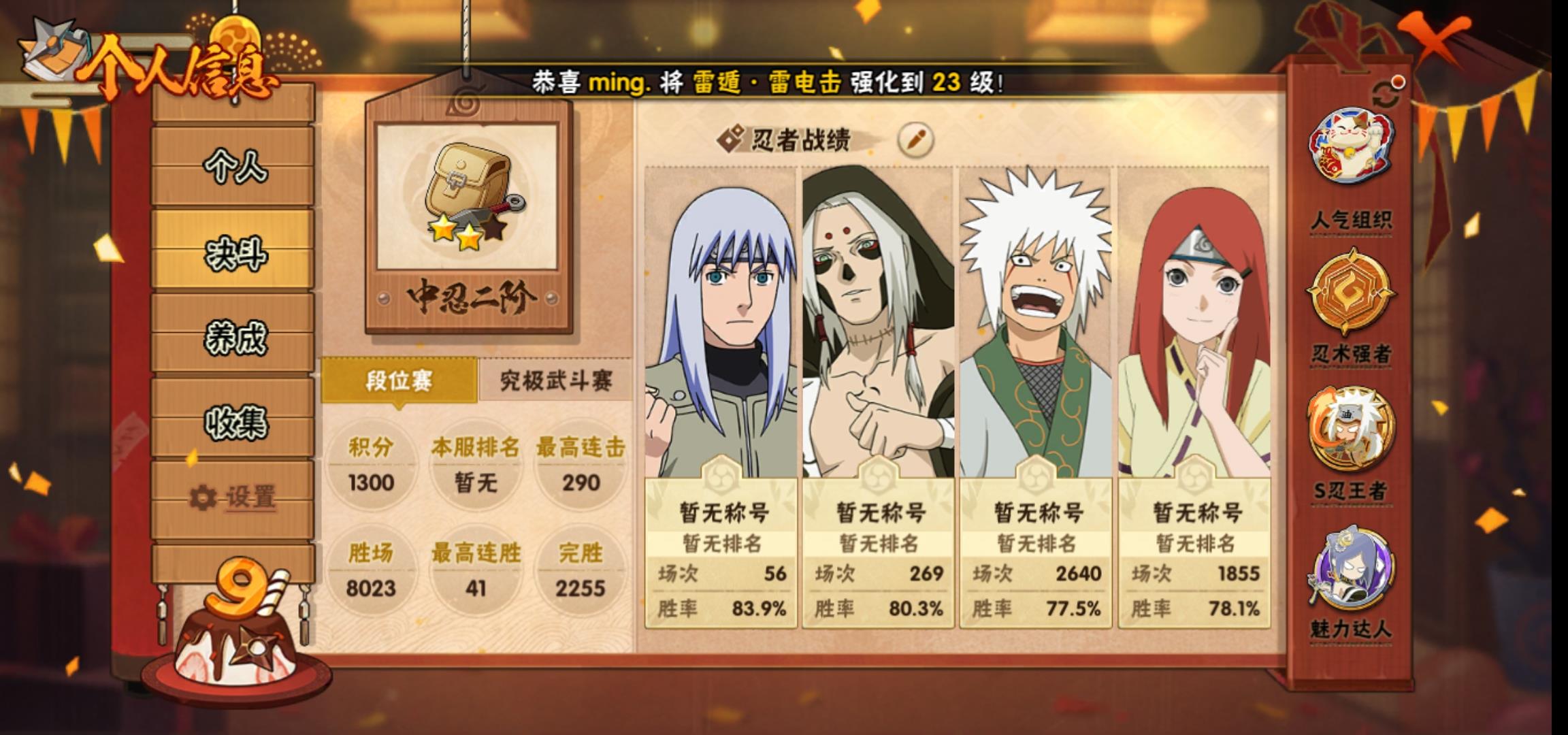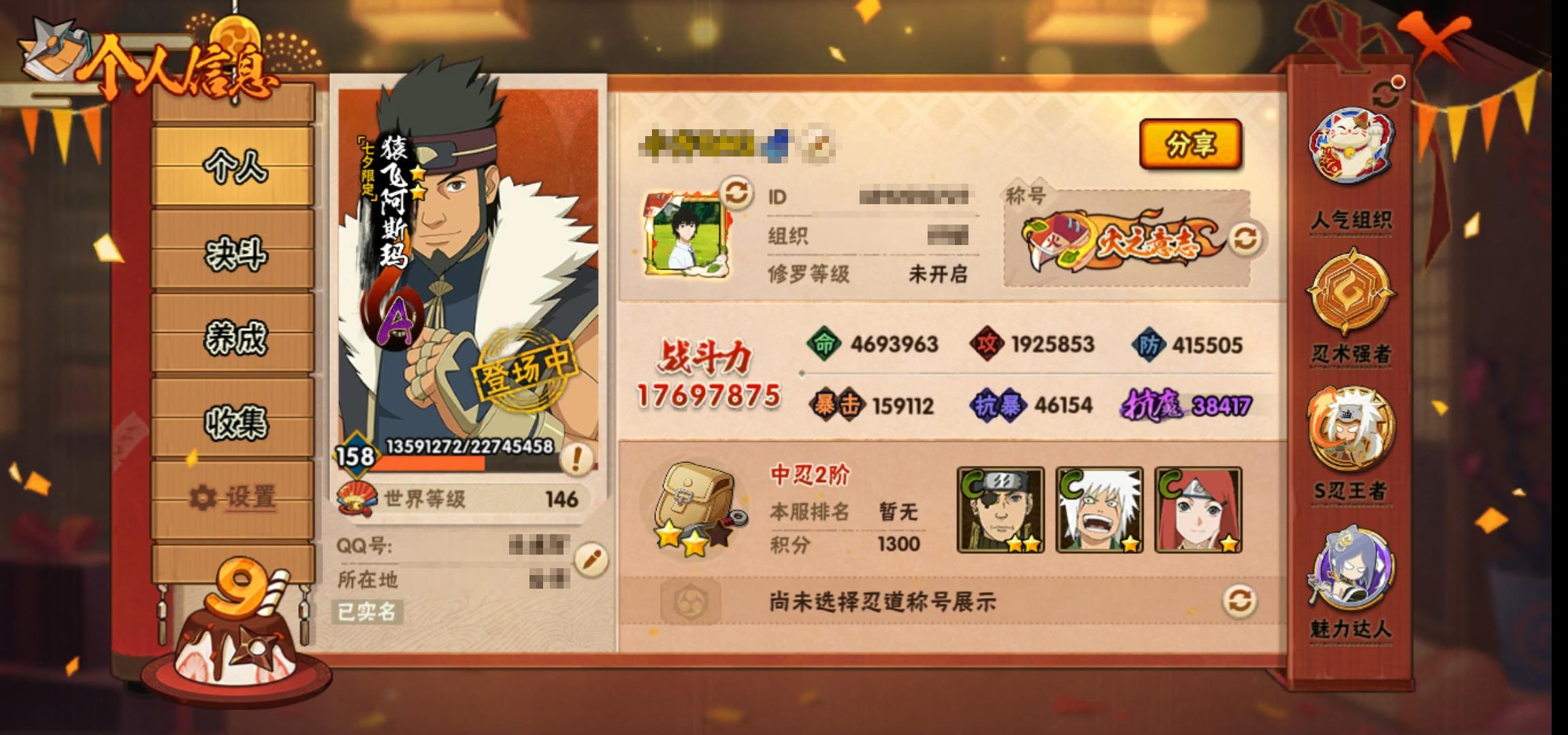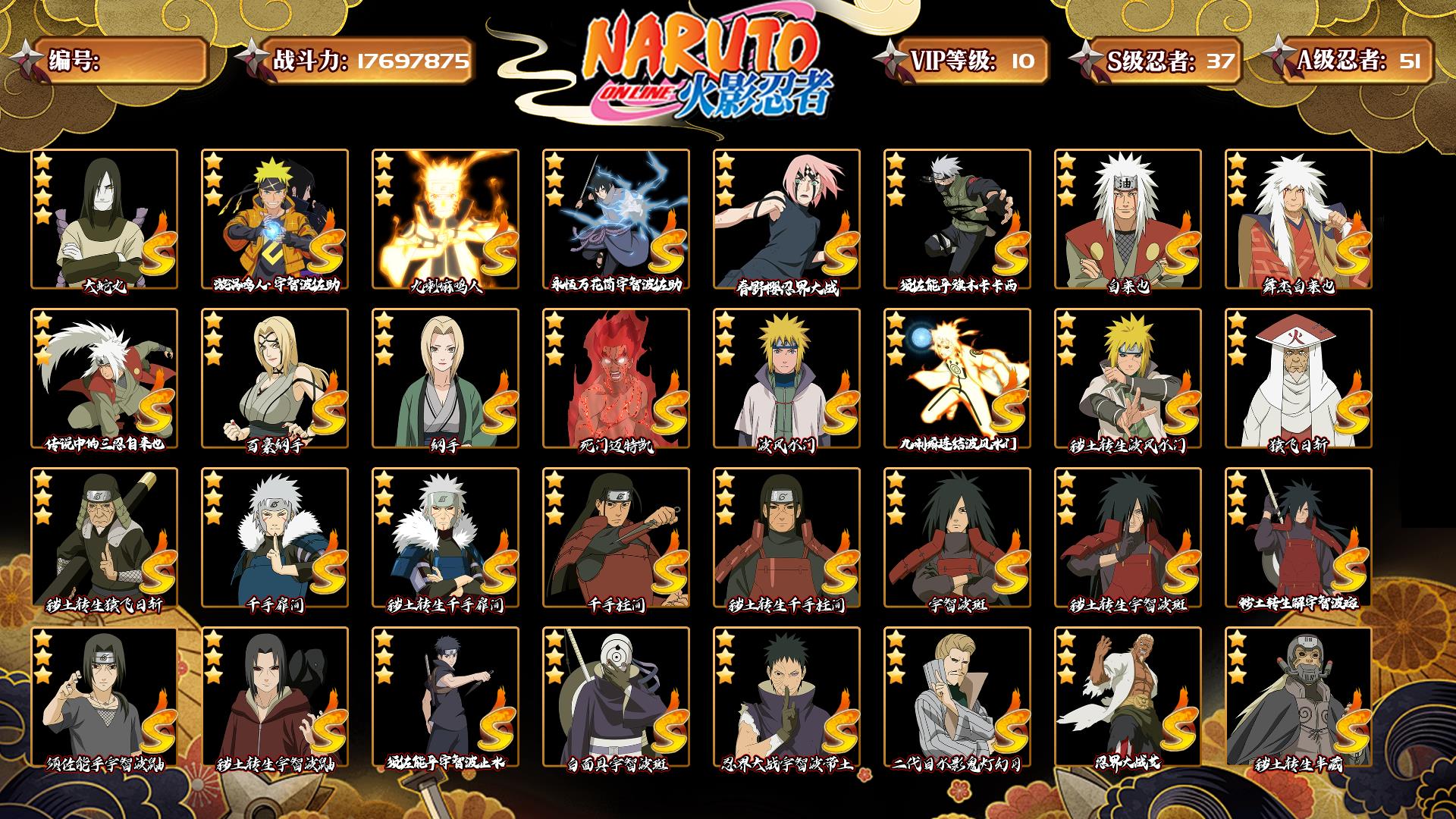 [15166105]0atftu 号 vip10,1769w战力,s忍37个,a忍51个,本服排名152,战区排名未上榜,通灵兽320个,8时装,中忍2阶,忍者星数679