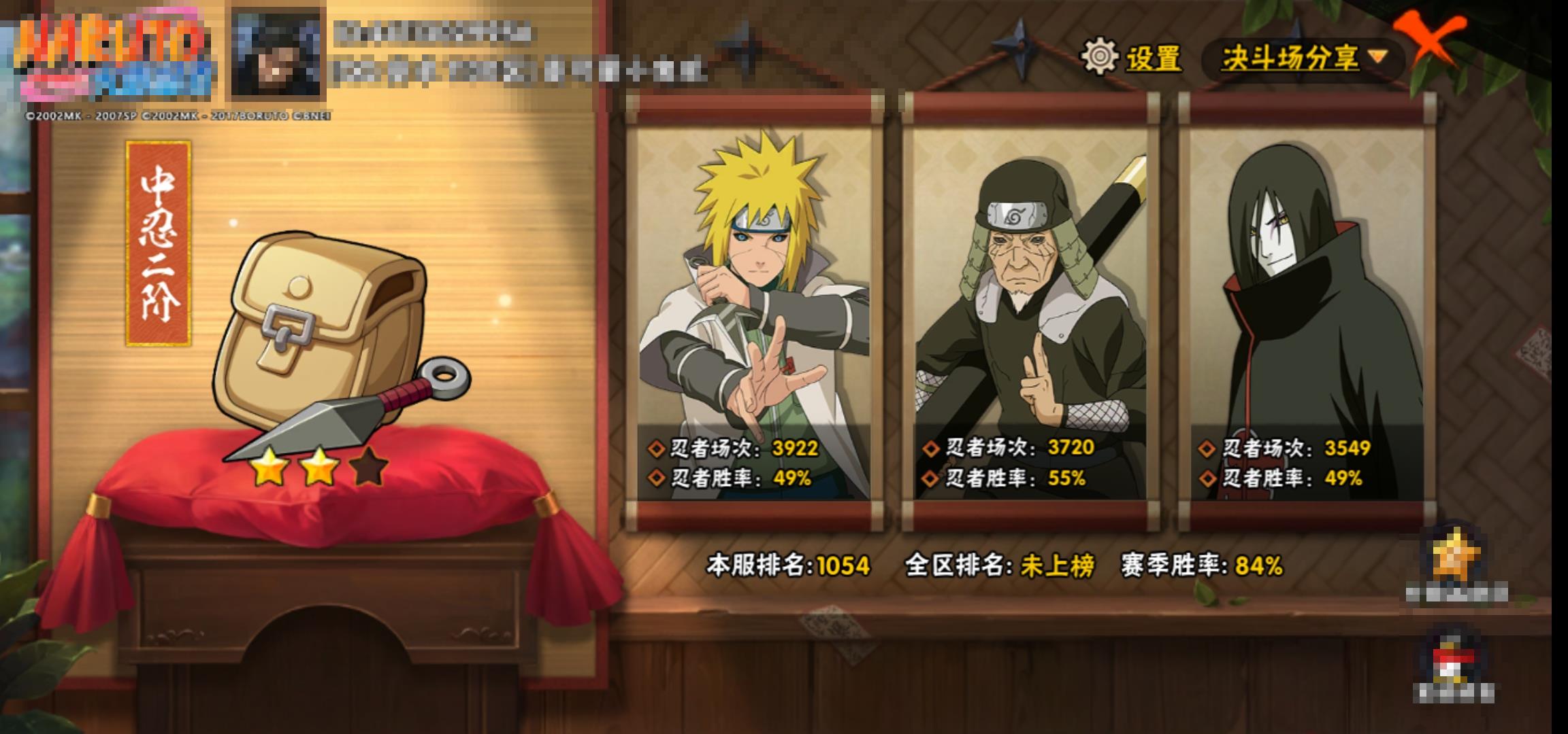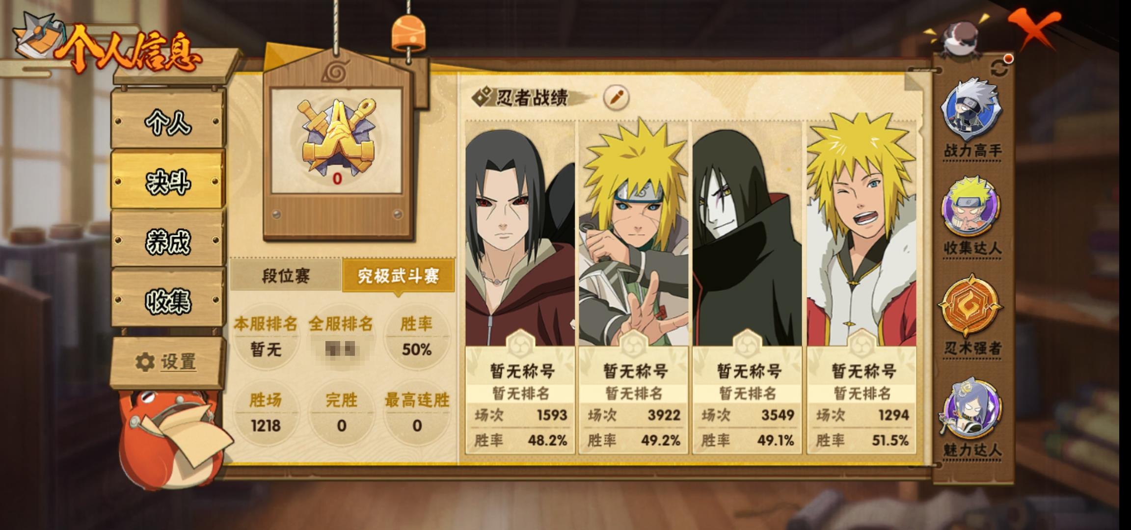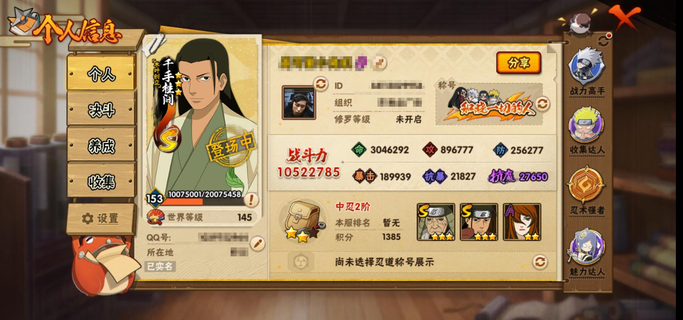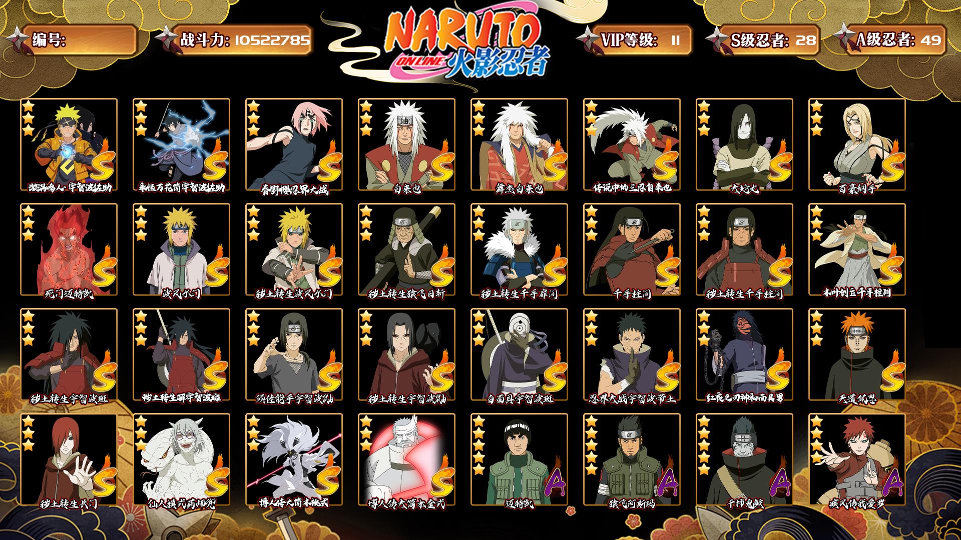 [15230404]0atshp 号 vip11,1052w战力,s忍28个,a忍49个,本服排名559,战区排名未上榜,通灵兽22个,6时装,中忍2阶,忍者星数654