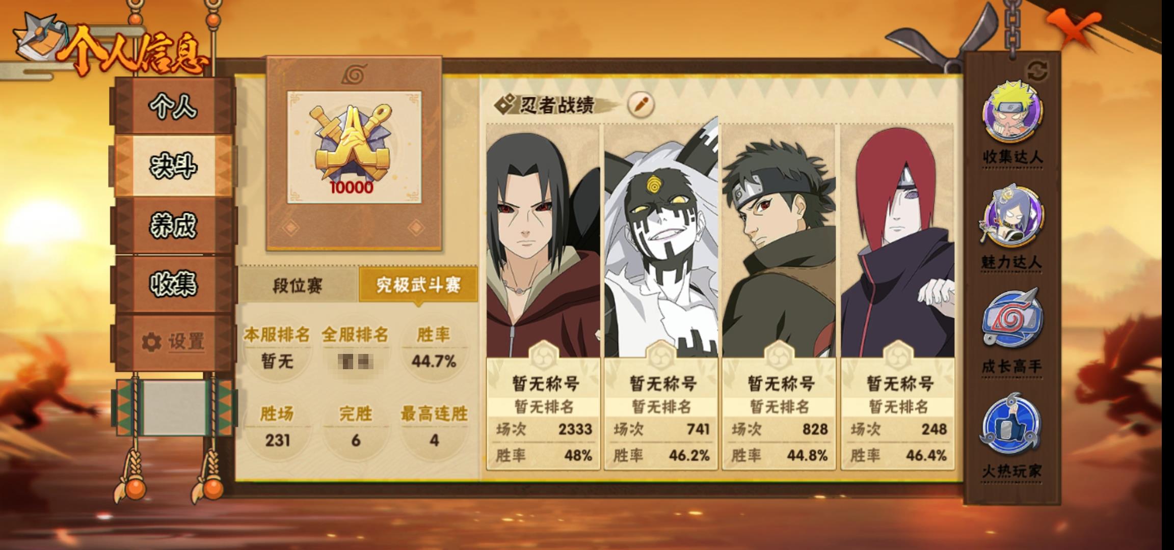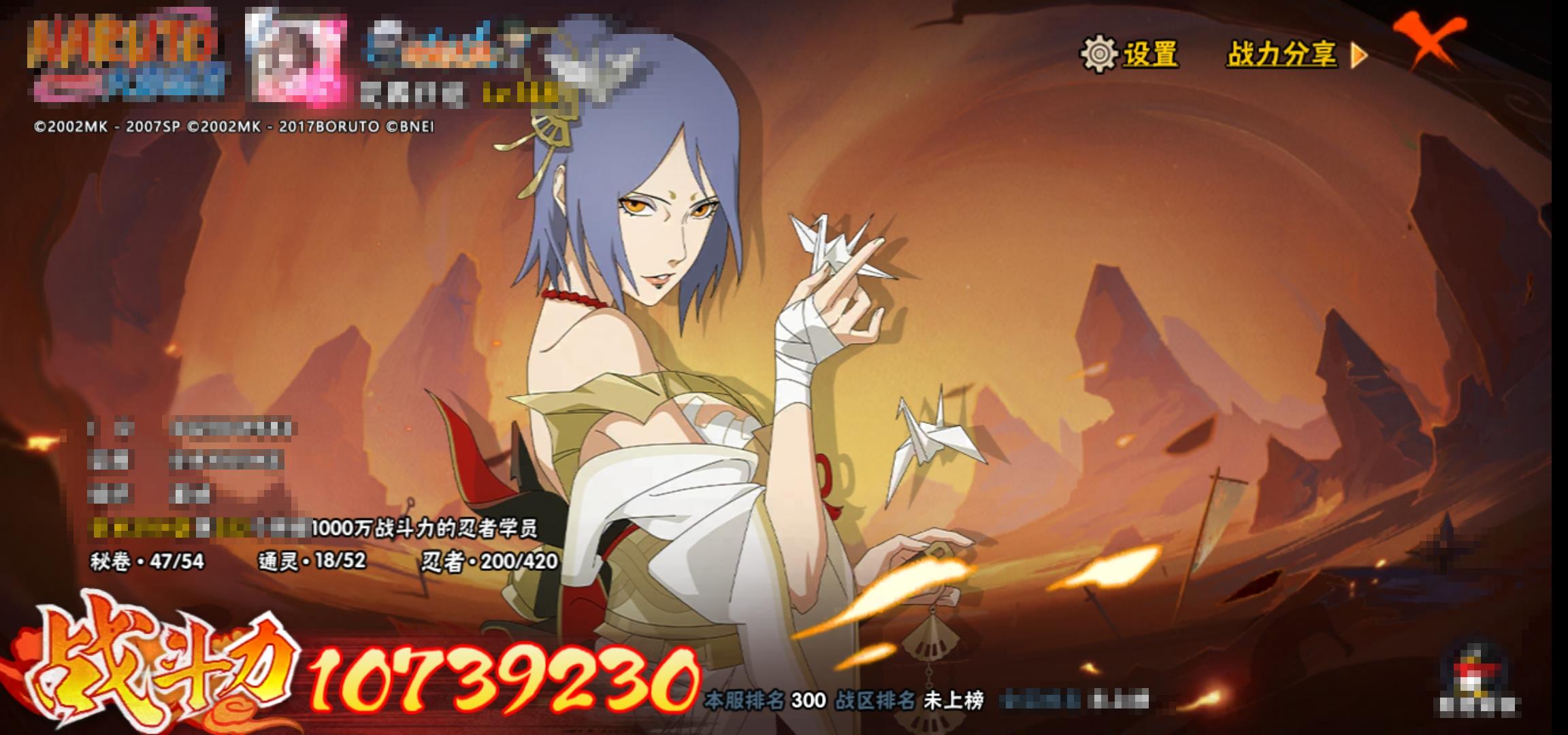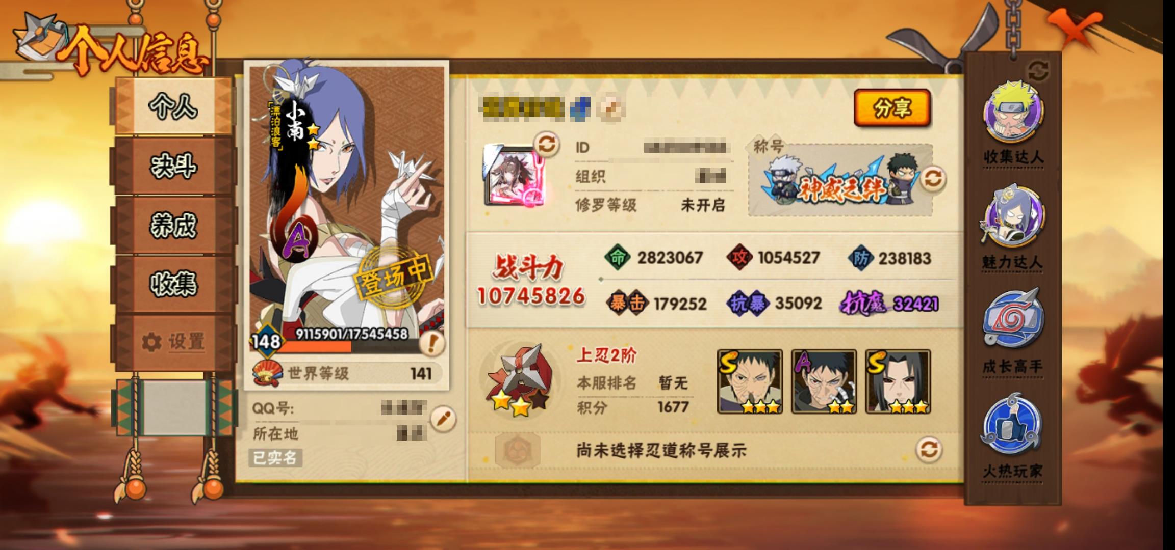[15230905]0atshc 号 vip11,1074w战力,s忍28个,a忍39个,本服排名300,战区排名未上榜,通灵兽18个,5时装,上忍2阶,忍者星数525