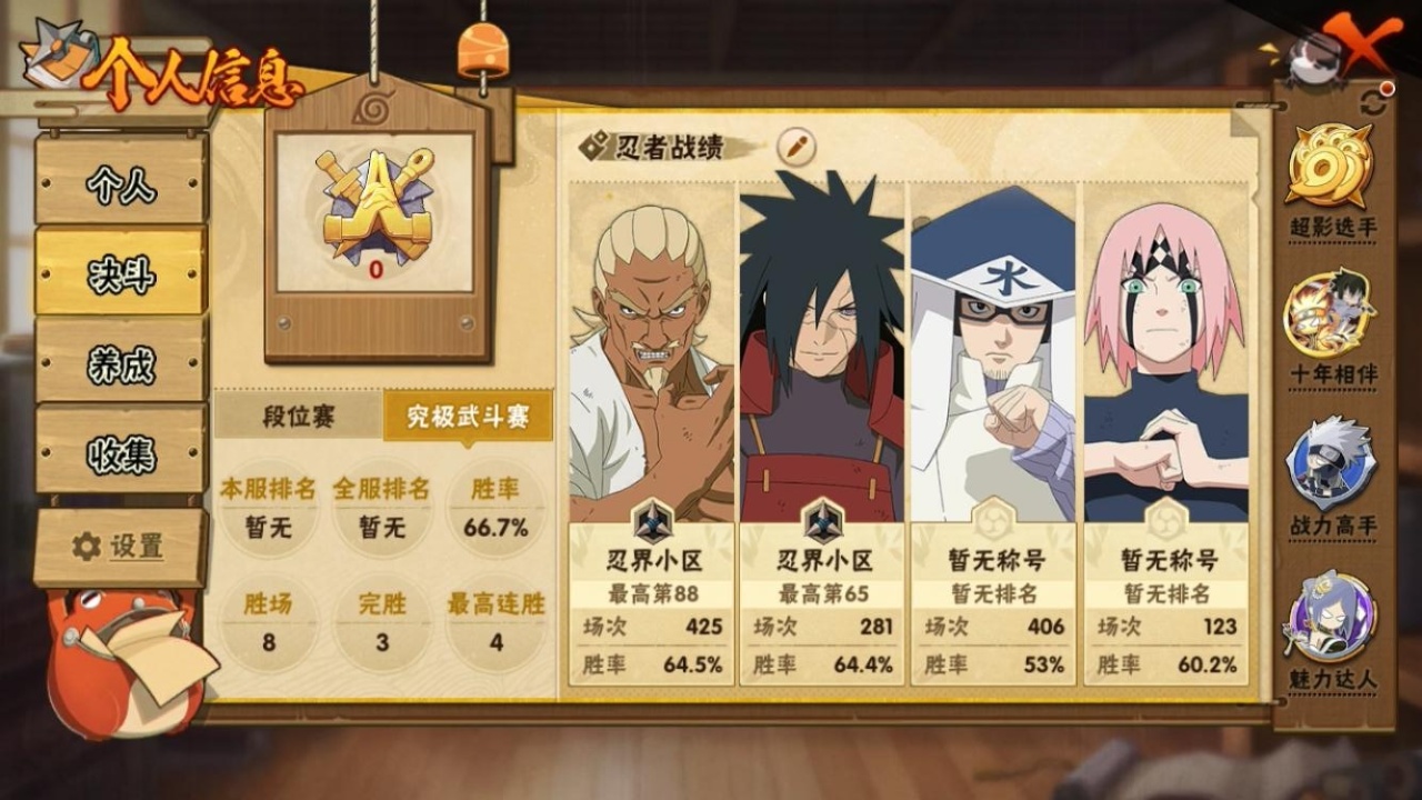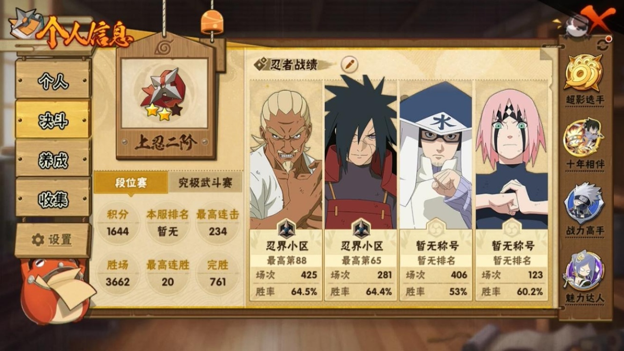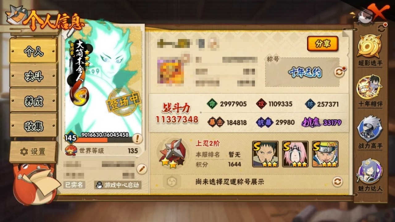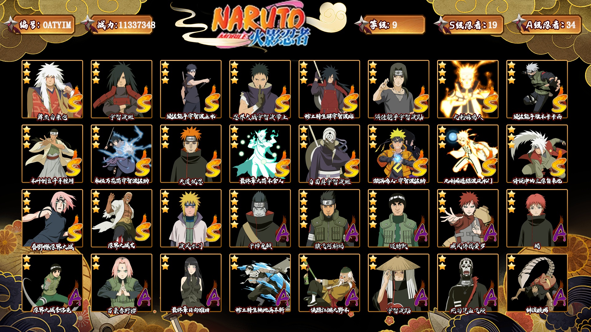 [15264041]0atyim 号,vip9,战力:11337348,s忍者数量:19,a忍者数量:34,本服排名:159,战区排名:未上榜,通灵兽数量:18,时装数:14,段位:上忍2阶,忍者星数:405