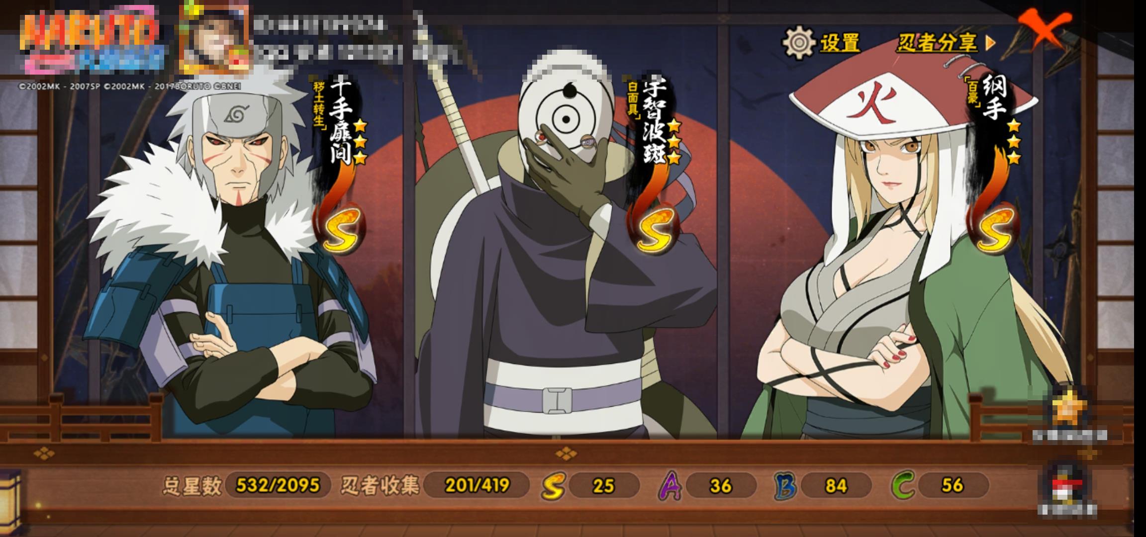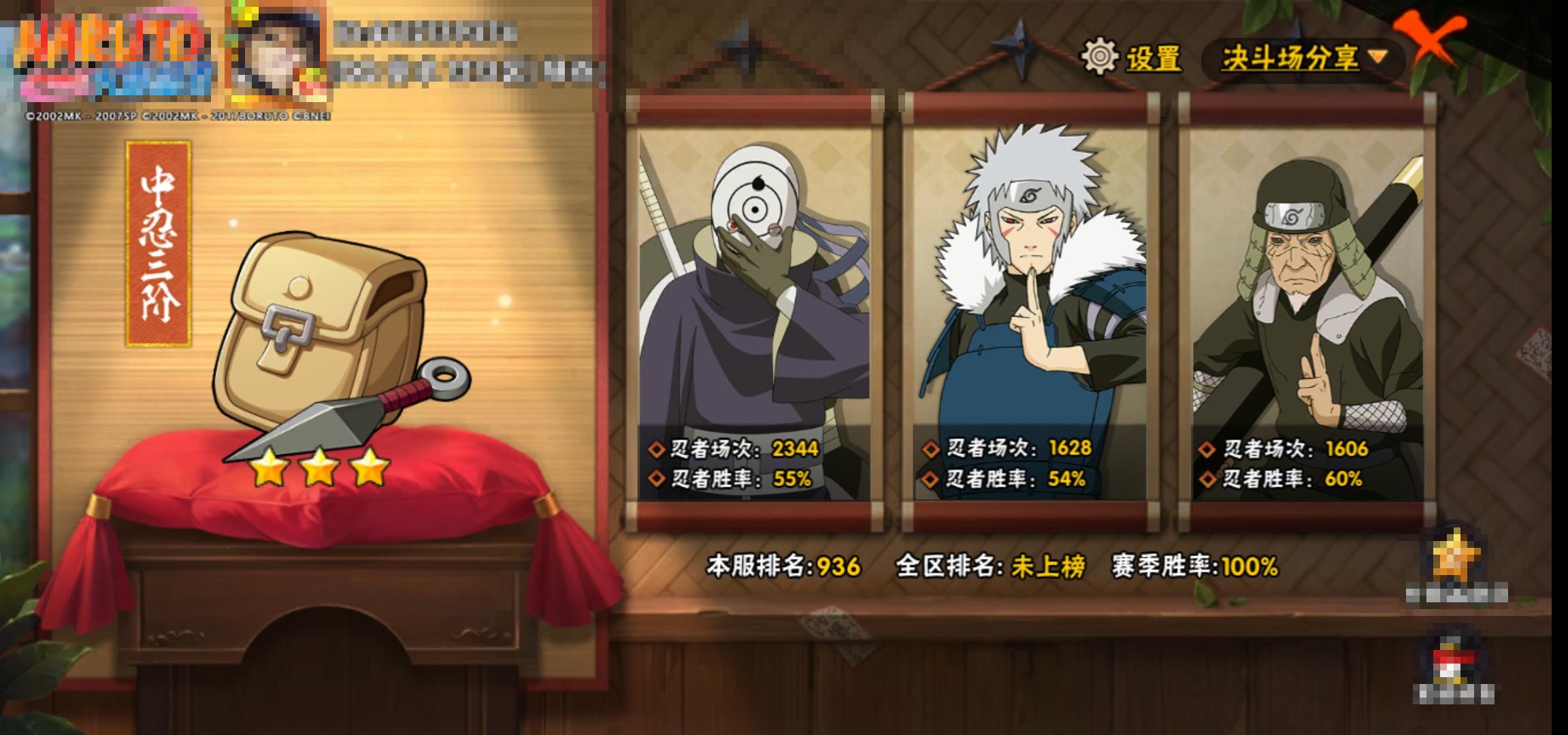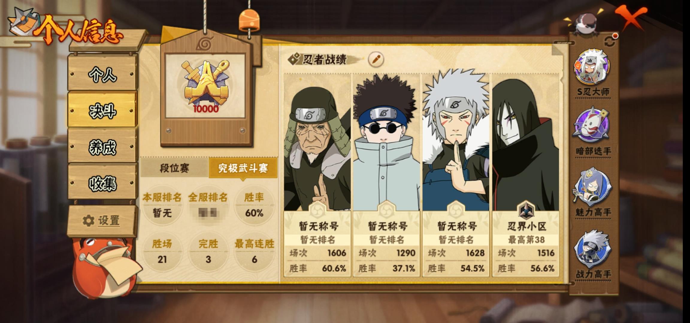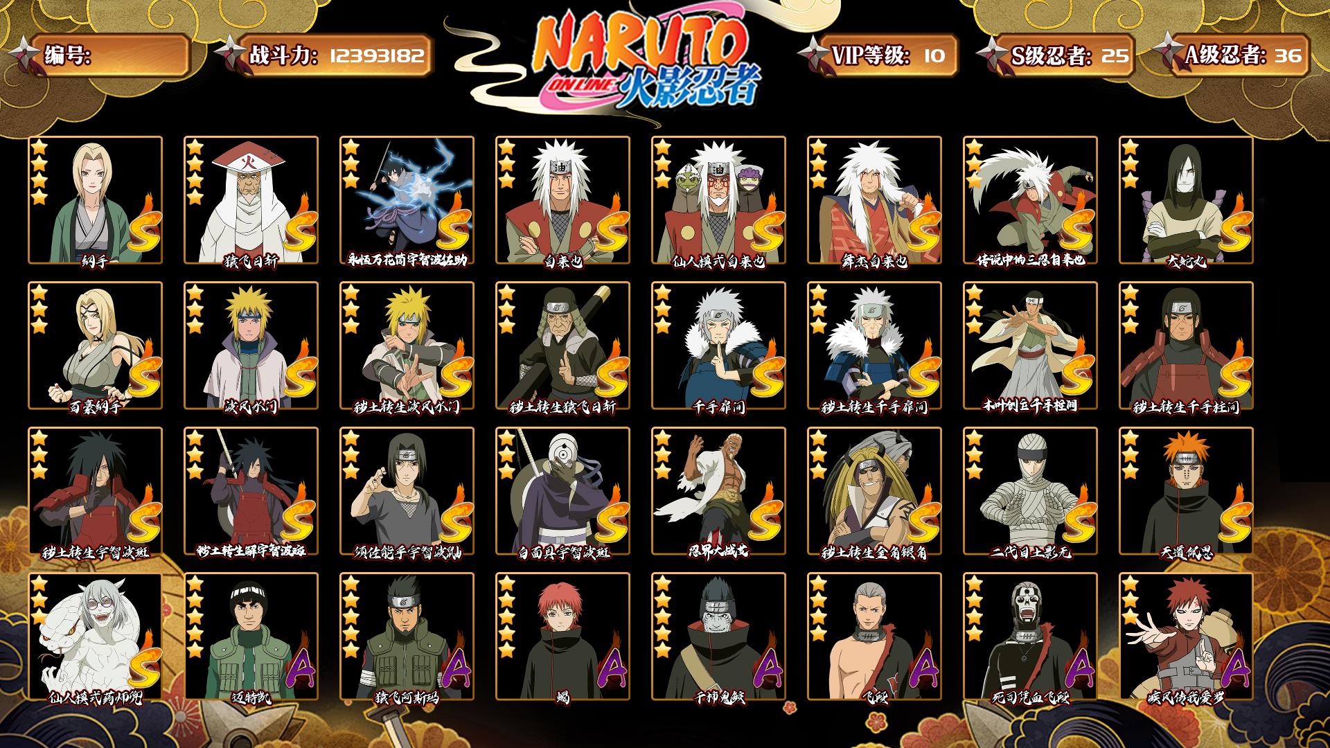 [15266525]0atypg 号 vip10,1239w战力,s忍25个,a忍36个,本服排名346,战区排名未上榜,通灵兽19个,6时装,中忍3阶,忍者星数532