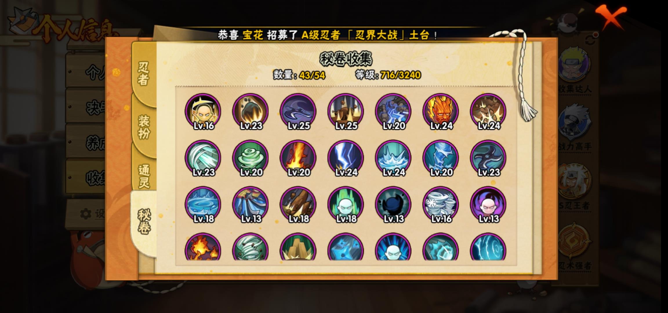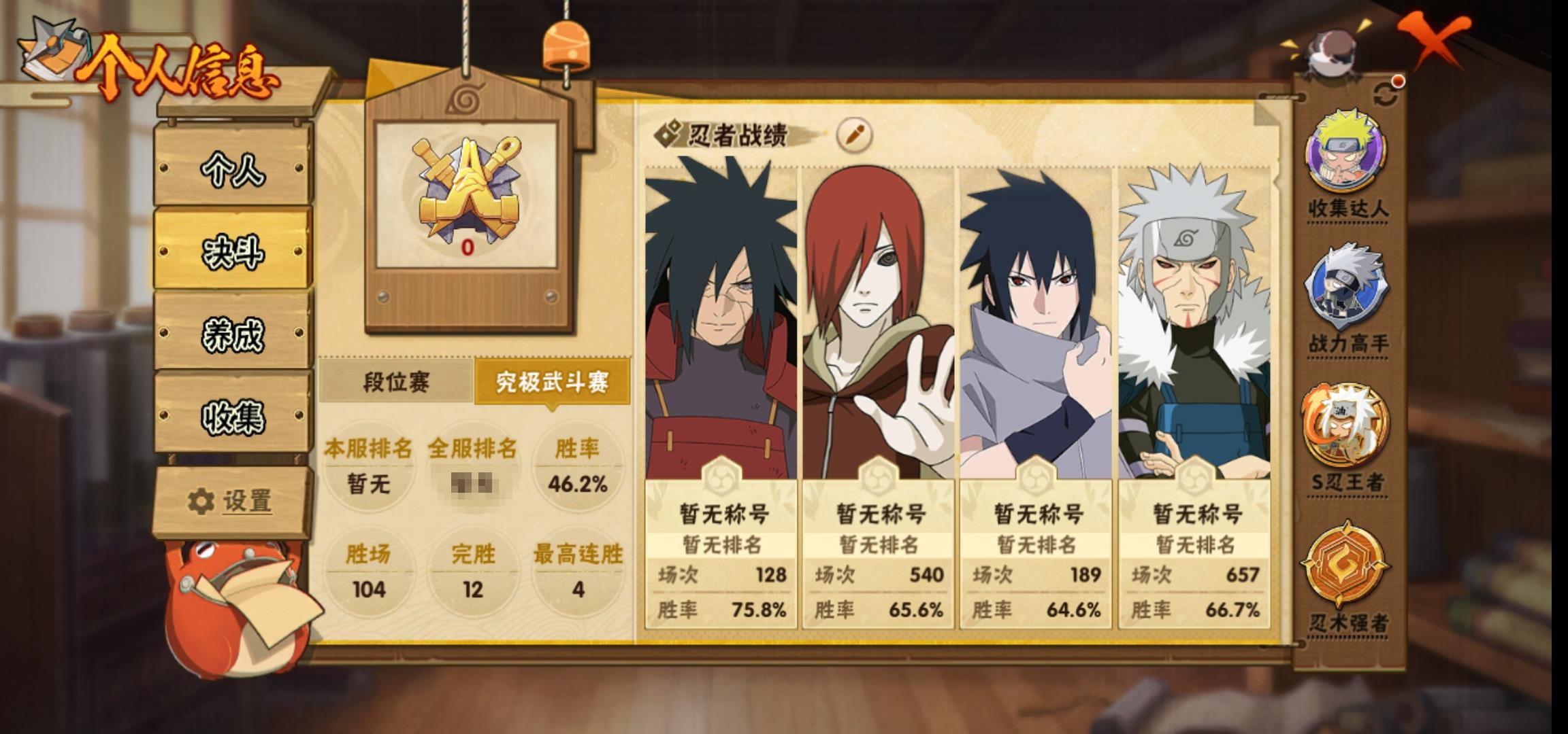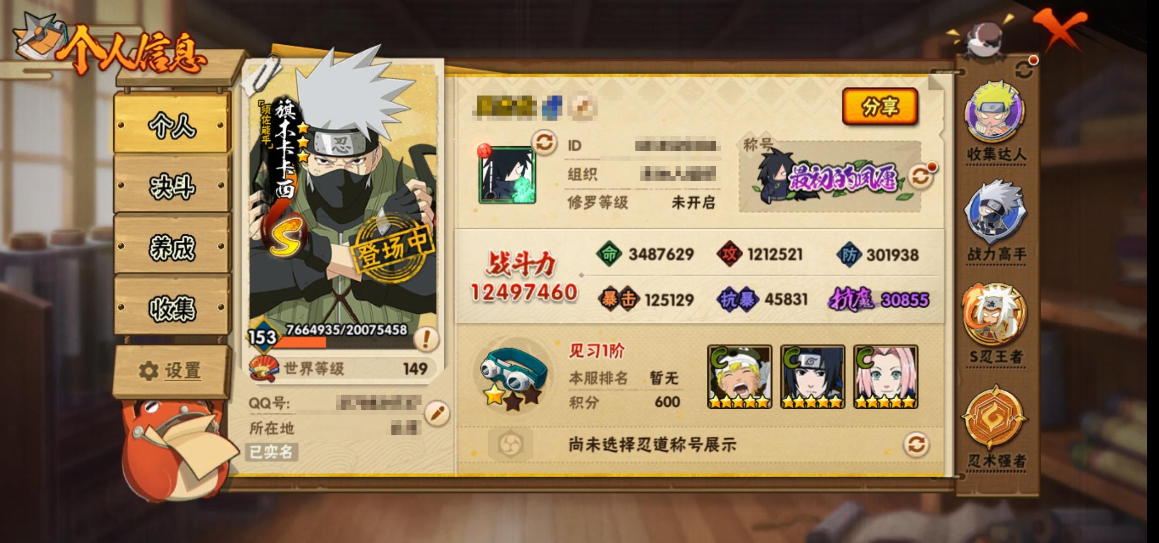 [15266537]0atypq 号 vip12,1249w战力,s忍30个,a忍39个,本服排名557,战区排名未上榜,通灵兽20个,3时装,见习1阶,忍者星数561