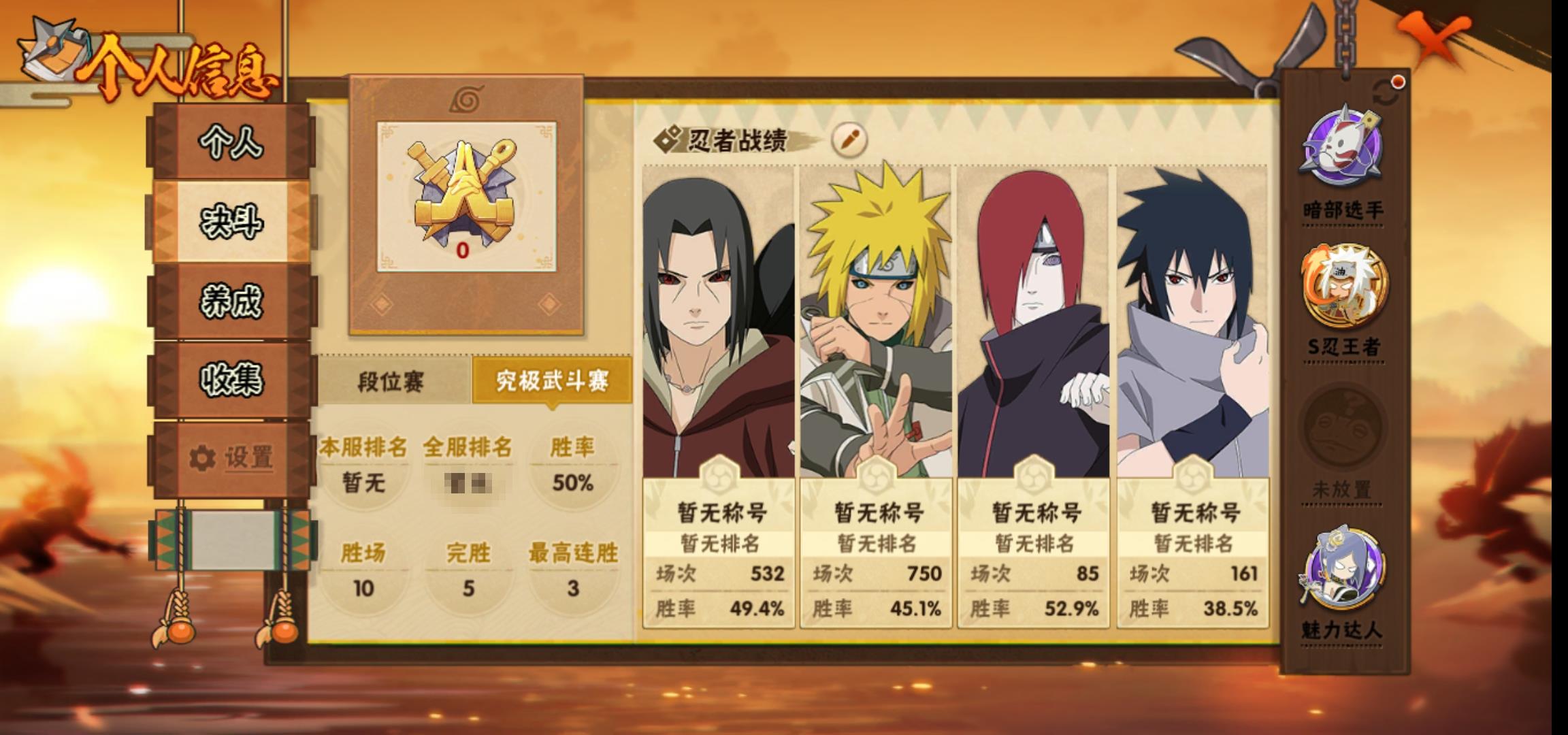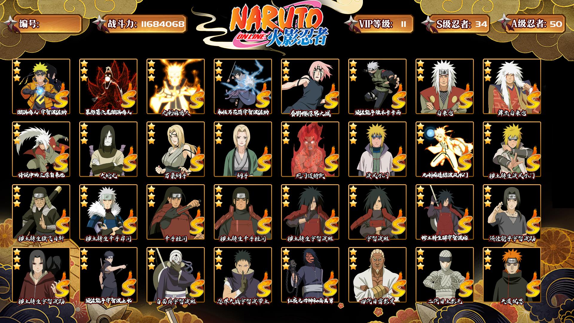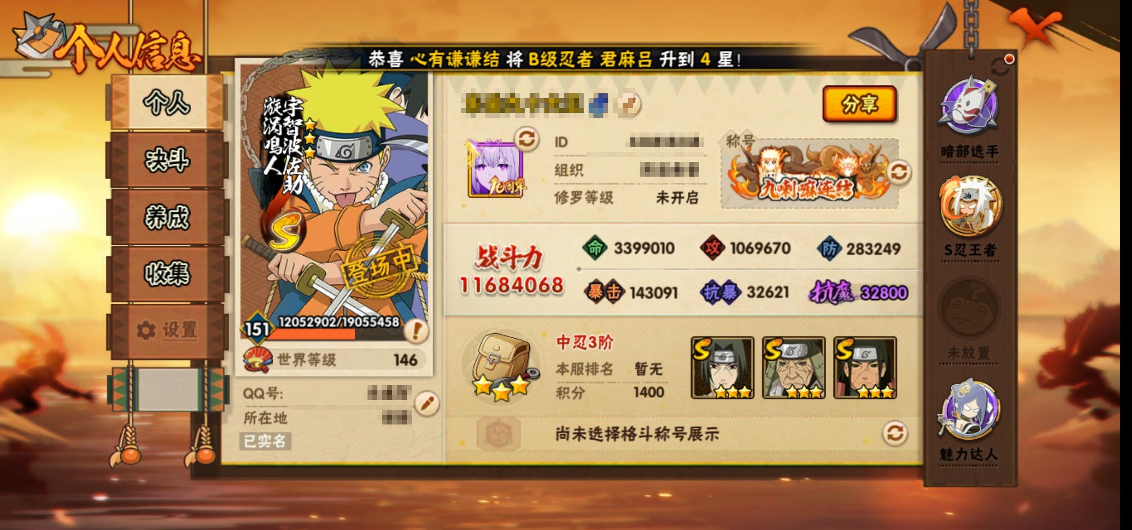 [15407251]0auqqt 号 vip11,1168w战力,s忍34个,a忍50个,本服排名419,战区排名未上榜,通灵兽19个,9时装,中忍3阶,忍者星数616