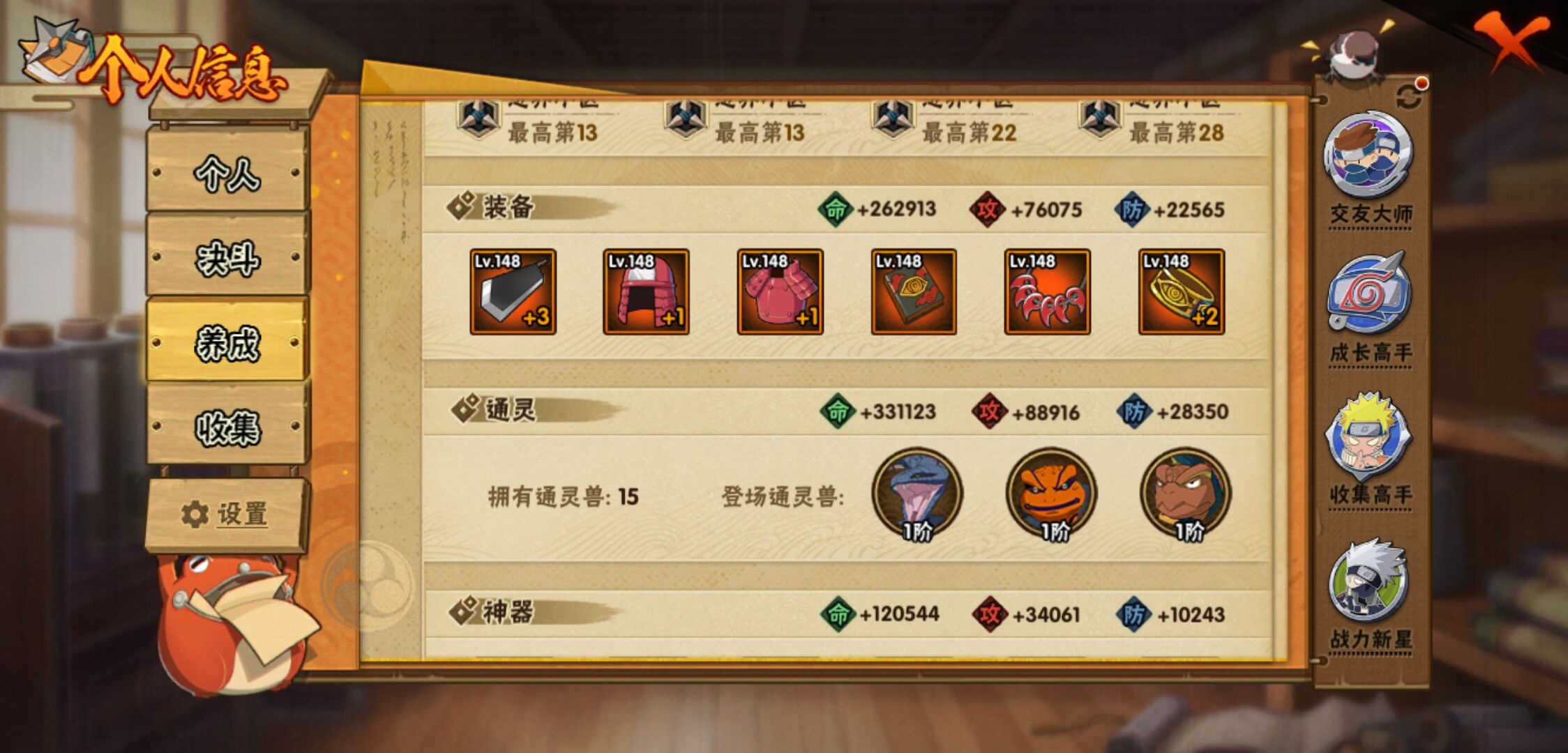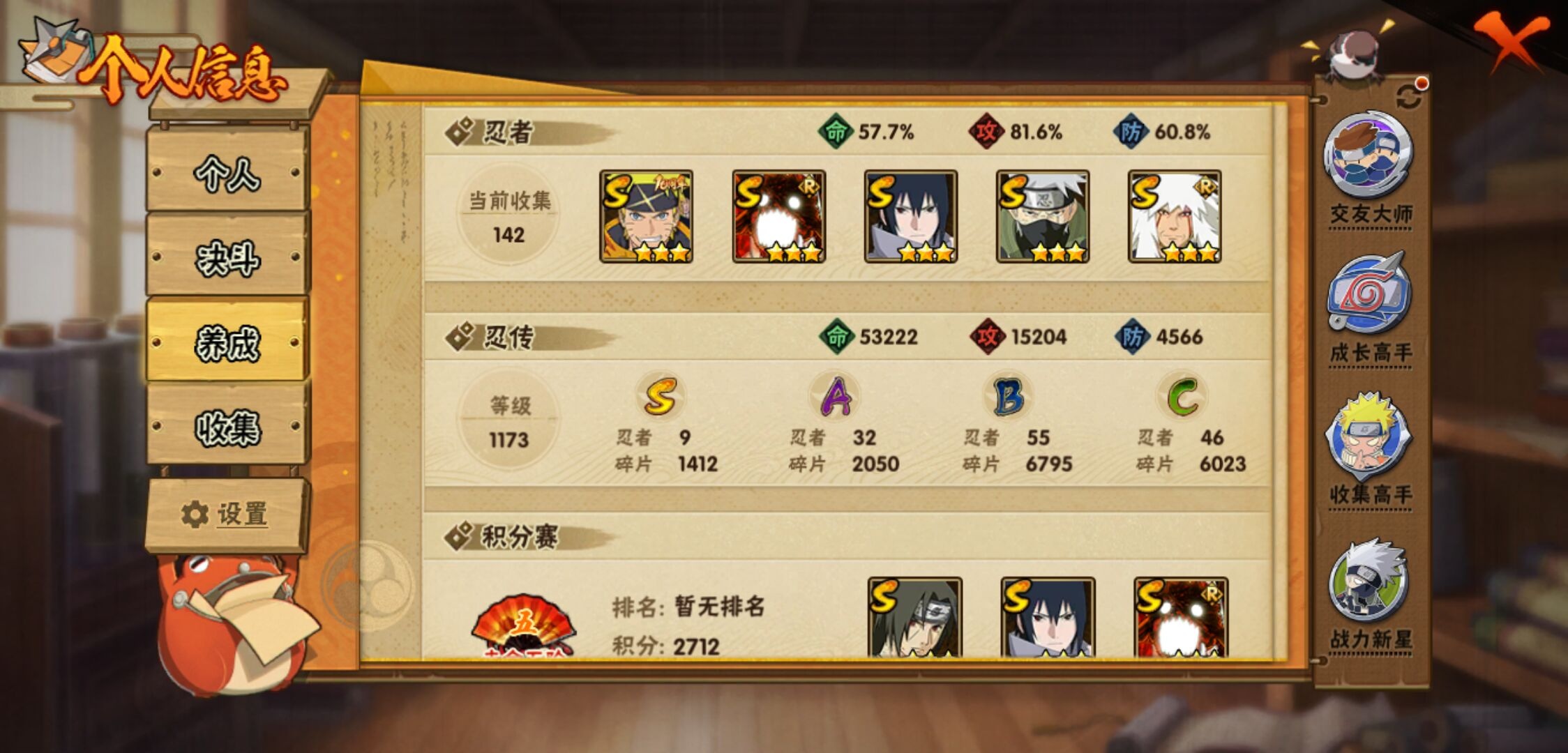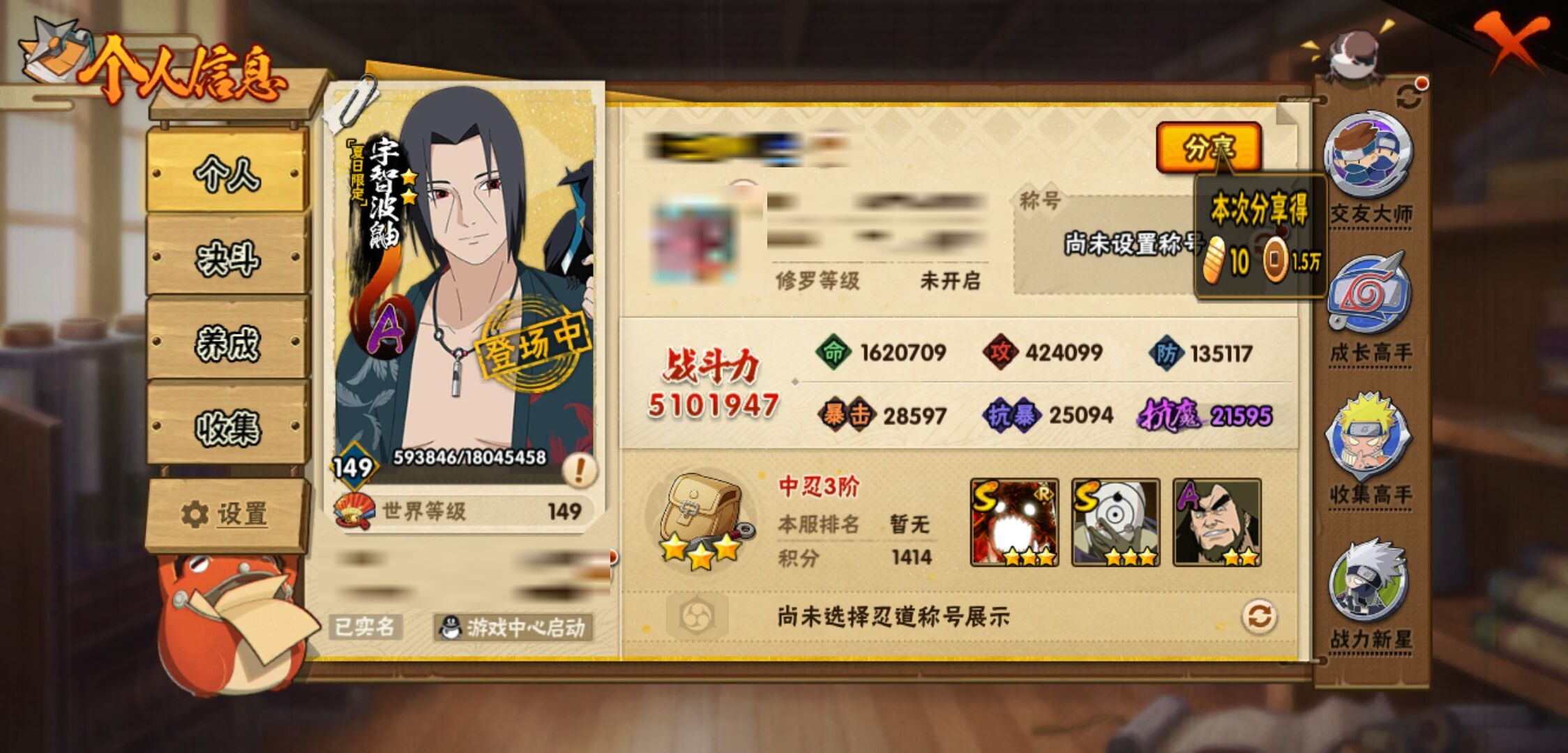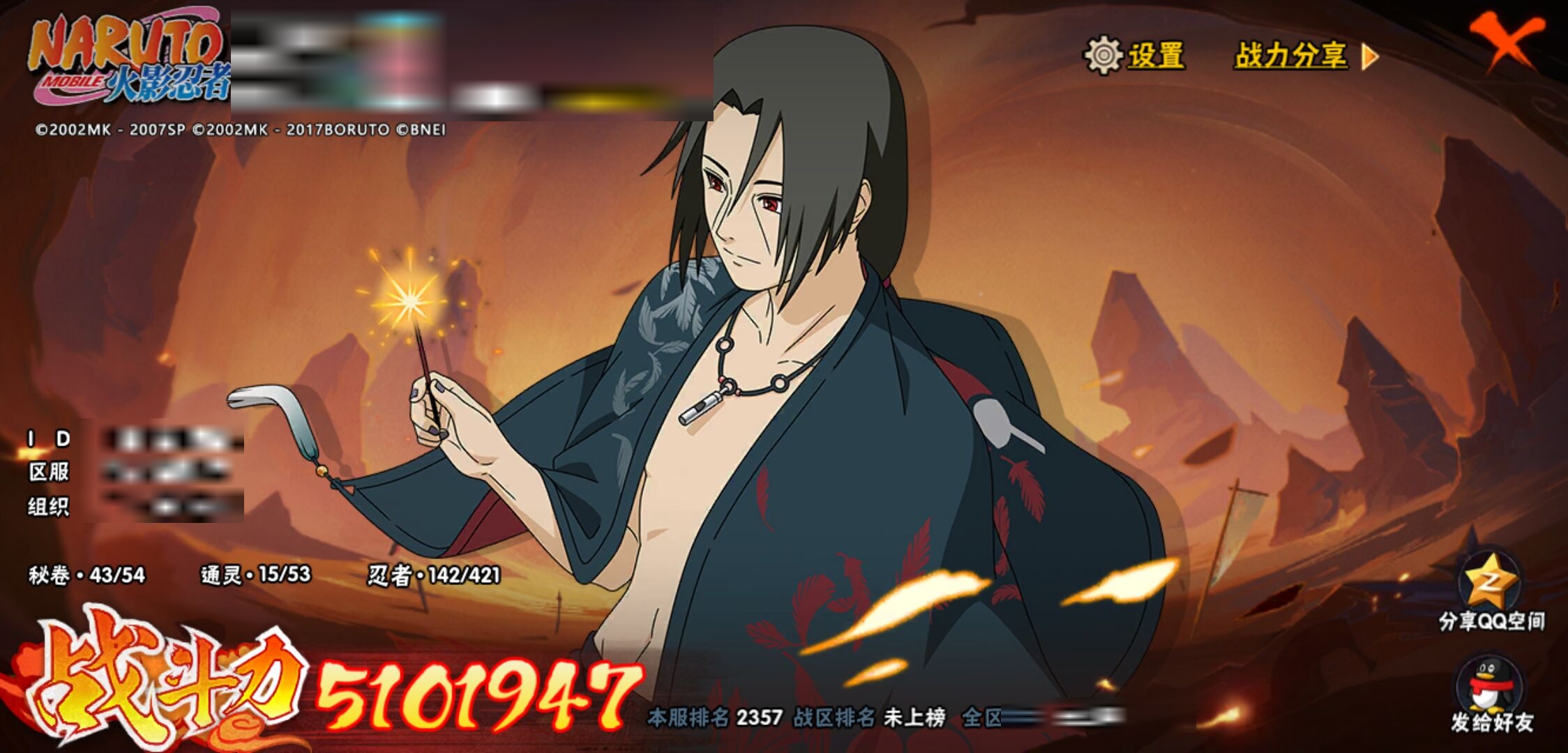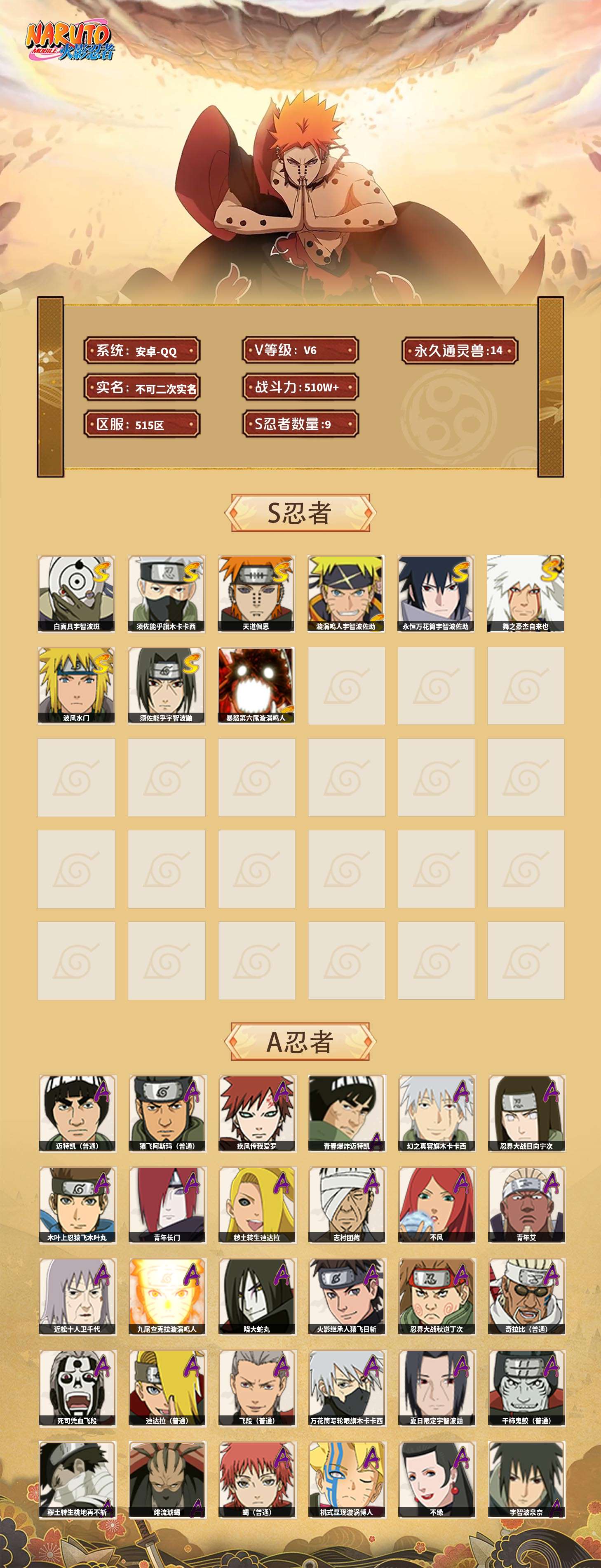 【火影忍者】【lyhy10427】战斗力:510w;段位:中忍3阶;vip:v6级;s忍:9个;a忍:32个;通灵兽:14个,s忍:白面具宇智波斑|须佐能乎旗木卡卡西|天道佩恩|漩涡鸣人宇智波佐助|永恒万花筒宇智波佐助|舞之豪杰自来也|波风水门|须佐能乎宇智波鼬|暴怒第六尾漩涡鸣人__a忍:青春爆炸迈特凯|幻之真容旗木卡卡西|忍界大战日向宁次|木叶上忍猿飞木叶丸|青年长门|秽土转生迪达拉|志村团藏|不风|青年艾|近松十人卫千代|九尾查克拉漩涡鸣人|晓大蛇丸|火影继承人猿飞日斩|忍界大战秋道丁次|奇拉比(普通)|死司凭血飞段|疾风传我爱罗 3星|迪达拉(普通)|飞段(普通)|万花筒写轮眼旗木卡卡西|迈特凯(普通) 4星|夏日限定宇智波鼬|干柿鬼鲛(普通)|秽土转生桃地再不斩|绯流琥蝎|蝎(普通)|猿飞阿斯玛(普通) 4星|桃式显现漩涡博人|不缘|宇智波泉奈|羁绊神农|初始形态机械鸣人__通灵兽:忍犬(普通)|蓝蛇|蛤蟆吉|忍龟|镰鼬|猿魔|山椒鱼|蜃|蛤蟆仙人|鲛鲨|蛤蟆健|砂之守鹤|乌鸦(普通)|蛤蟆龙