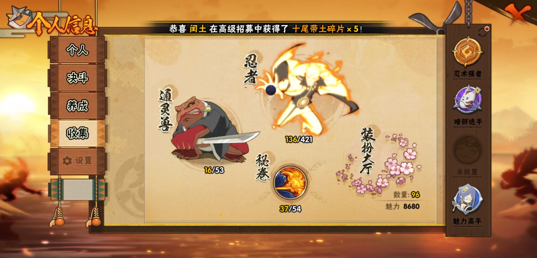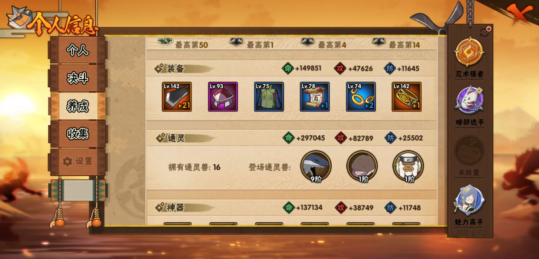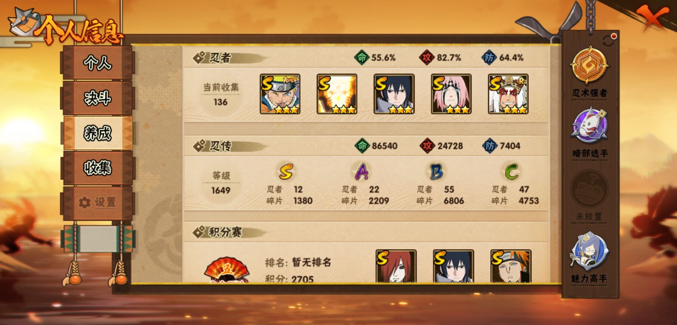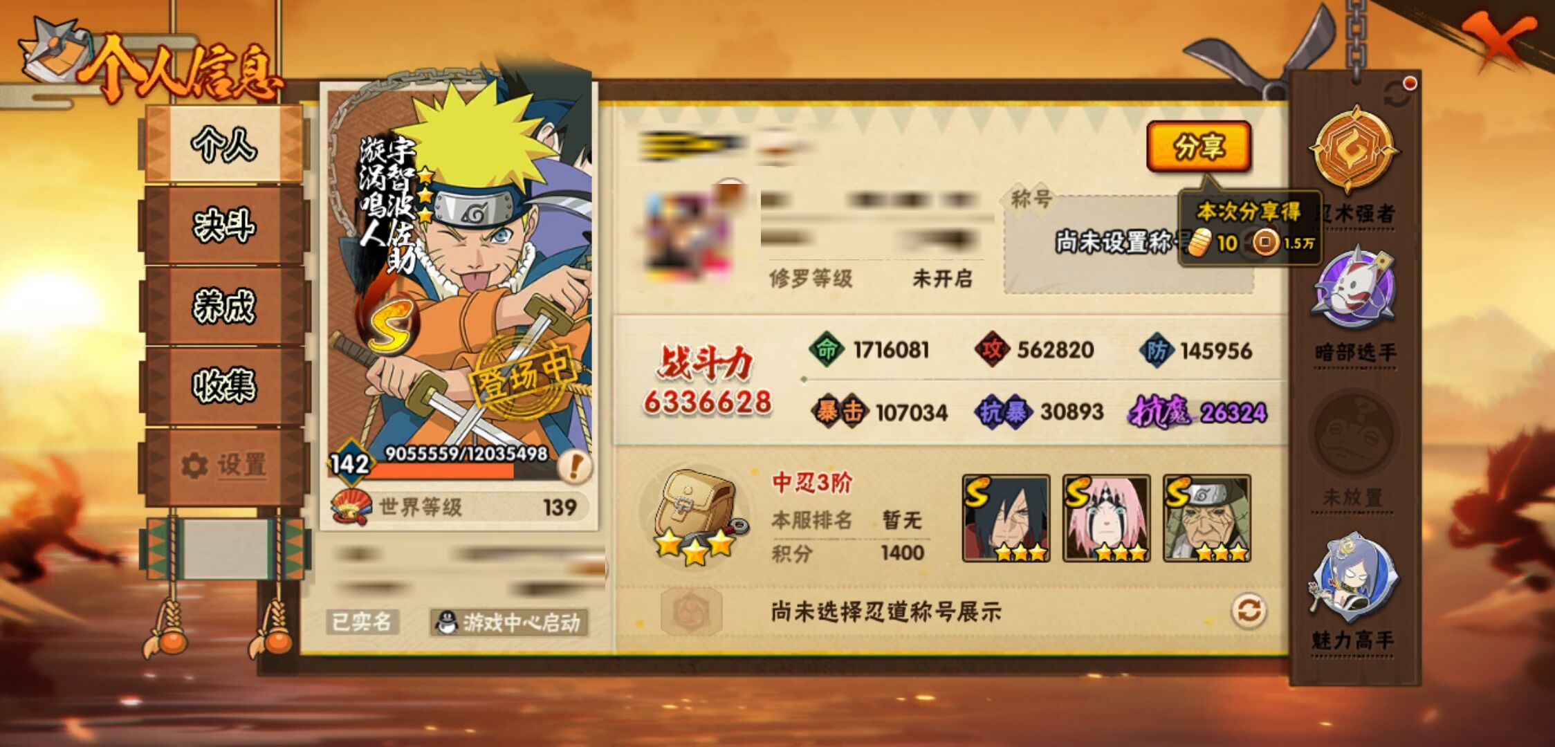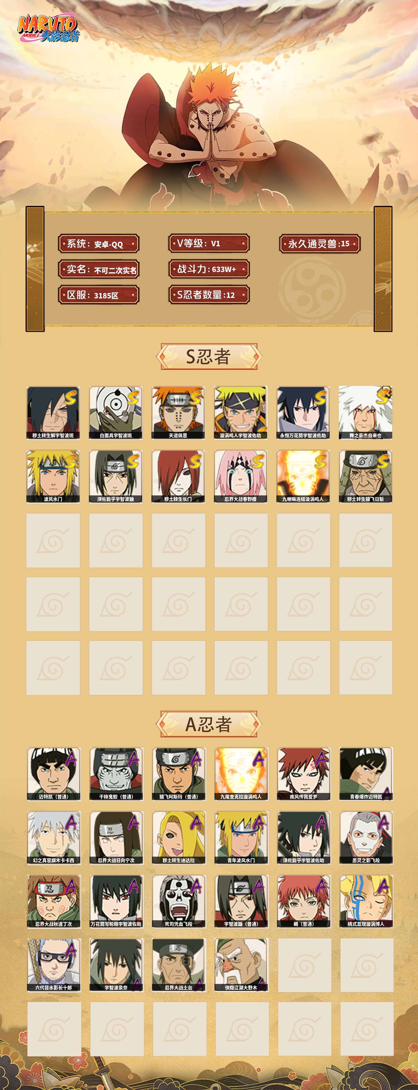【火影忍者】【lyhy10685】战斗力:633w;段位:中忍3阶;本服排名:1693;vip:v1级;s忍:12个;a忍:22个;通灵兽:15个,s忍:秽土转生解宇智波斑|白面具宇智波斑|天道佩恩|漩涡鸣人宇智波佐助|永恒万花筒宇智波佐助|舞之豪杰自来也|波风水门|须佐能乎宇智波鼬|秽土转生长门|忍界大战春野樱|九喇嘛连结漩涡鸣人|秽土转生猿飞日斩__a忍:青春爆炸迈特凯|幻之真容旗木卡卡西|忍界大战日向宁次|秽土转生迪达拉|青年波风水门|须佐能乎宇智波佐助|九尾查克拉漩涡鸣人 3星|恶灵之影飞段|忍界大战秋道丁次|万花筒写轮眼宇智波佐助|死司凭血飞段|疾风传我爱罗 3星|迈特凯(普通) 5星|宇智波鼬(普通)|干柿鬼鲛(普通) 5星|蝎(普通)|猿飞阿斯玛(普通) 5星|桃式显现漩涡博人|六代目水影长十郎|宇智波泉奈|忍界大战土台|侠隐江湖大野木__通灵兽:忍犬(普通)|蓝蛇|砂之守鹤|蛤蟆吉|忍龟|镰鼬|猿魔|山椒鱼|蜃|蛤蟆仙人|鲛鲨|蛤蟆健|乌鸦(普通)|蛤蟆龙|蛤蟆广