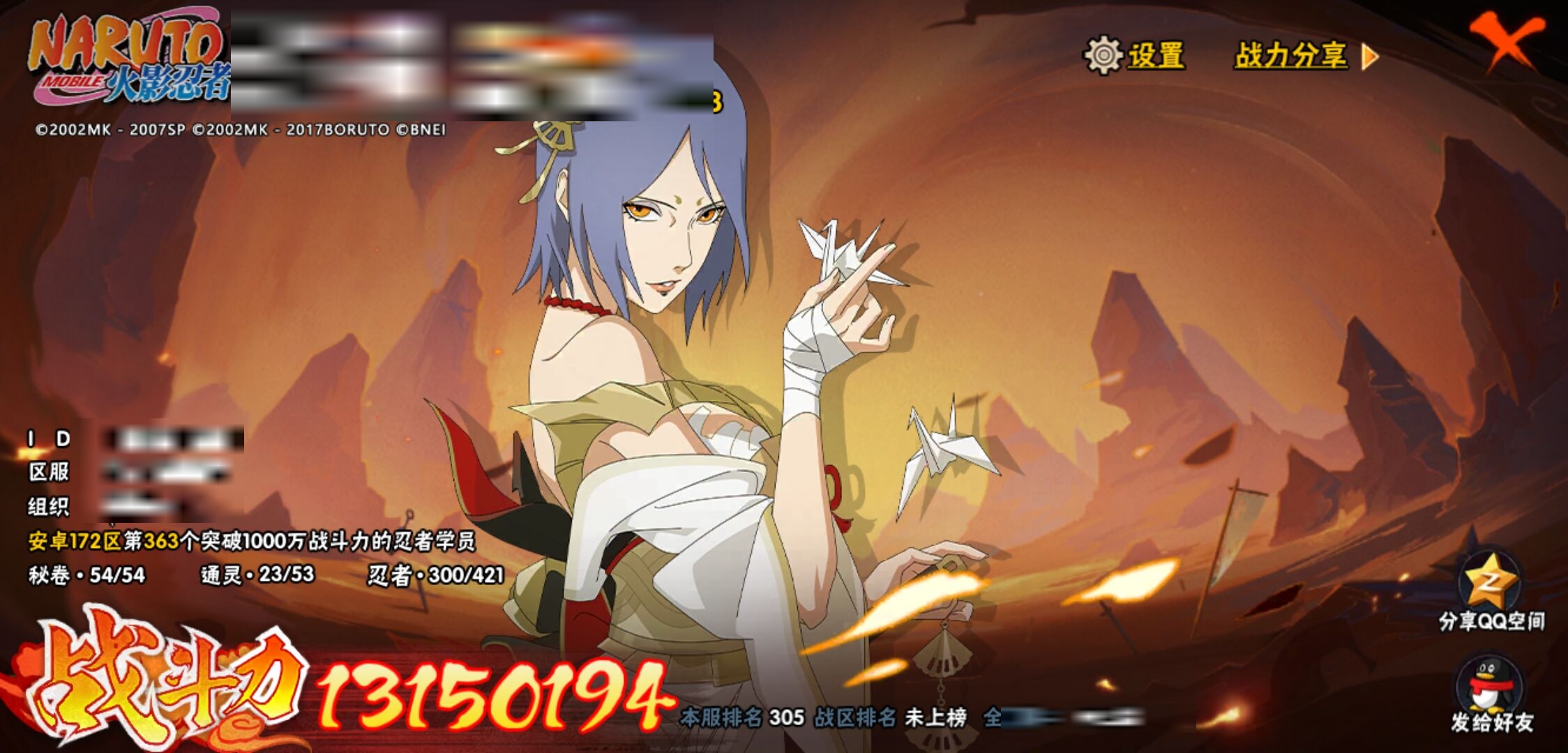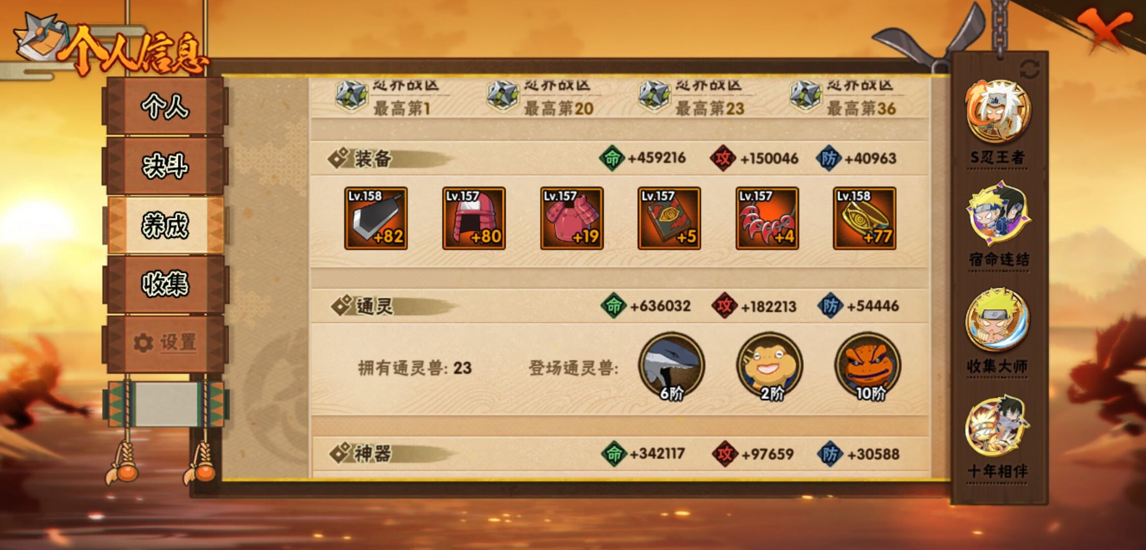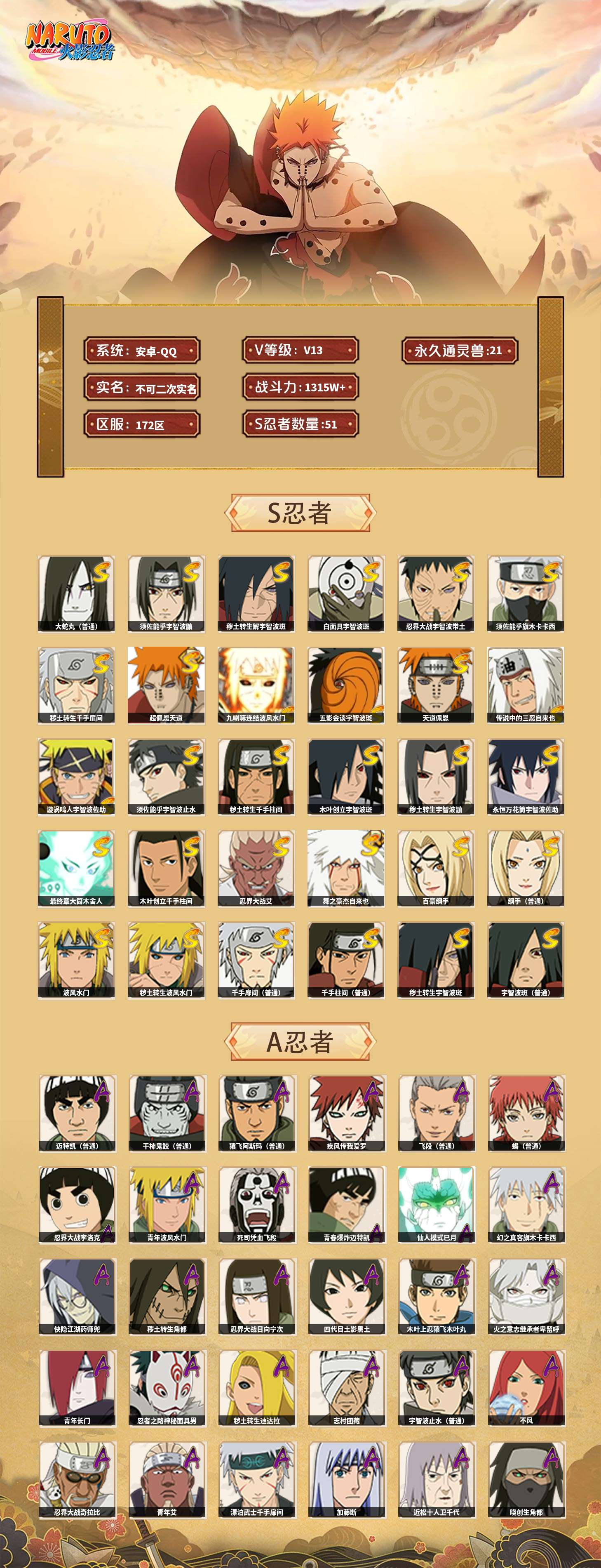 【火影忍者】【lyhy10680】战斗力:1315w;段位:暗部2阶;本服排名:305;vip:v13级;s忍:51个;a忍:61个;通灵兽:21个,s忍:秽土转生解宇智波斑|白面具宇智波斑|忍界大战宇智波带土|须佐能乎旗木卡卡西|秽土转生千手扉间|超佩恩天道|九喇嘛连结波风水门|五影会谈宇智波斑|天道佩恩|传说中的三忍自来也|漩涡鸣人宇智波佐助|须佐能乎宇智波止水|秽土转生千手柱间|木叶创立宇智波斑|秽土转生宇智波鼬|永恒万花筒宇智波佐助|最终章大筒木舍人|木叶创立千手柱间|忍界大战艾|舞之豪杰自来也|大蛇丸(普通) 4星|百豪纲手|纲手(普通)|波风水门|秽土转生波风水门|千手扉间(普通)|千手柱间(普通)|秽土转生宇智波斑|宇智波斑(普通)|须佐能乎宇智波鼬 4星|神秘面具男(普通)|红夜之刃神秘面具男|秽土转生长门|秽土转生半藏|秽土转生金角银角|二代目土影无|二代目水影鬼灯幻月|三代目雷影艾|四代目雷影艾|四代目风影罗砂|仙人模式药师兜|死门迈特凯|忍界大战大野木|忍界大战春野樱|九喇嘛连结漩涡鸣人|博人传大筒木金式|大筒木桃式|猿飞日斩(普通)|秽土转生猿飞日斩|自来也(普通)|暴怒第六尾漩涡鸣人__a忍:青春爆炸迈特凯|仙人模式巳月|幻之真容旗木卡卡西|侠隐江湖药师兜|忍界大战李洛克 3星|秽土转生角都|忍界大战日向宁次|四代目土影黑土|木叶上忍猿飞木叶丸|火之意志继承者卑留呼|青年长门|忍者之路神秘面具男|秽土转生迪达拉|志村团藏|宇智波止水(普通)|不风|忍界大战奇拉比|青年波风水门 3星|青年艾|漂泊武士千手扉间|加藤断|近松十人卫千代|晓创生角都|半蛇斗篷药师兜|须佐能乎宇智波佐助|九尾查克拉漩涡鸣人|晓大蛇丸|百豪春野樱|忍界大战秋道丁次|忍界大战我爱罗|新春限定波风水门|新春限定宇智波鼬|奇拉比(普通)|万花筒写轮眼宇智波佐助|五代目水影照美冥|五代目雷影达鲁伊|死司凭血飞段 3星|地怨虞角都|疾风传我爱罗 4星|迪达拉(普通)|飞段(普通) 4星|小南(普通)|漂泊浪客小南|仙人模式漩涡鸣人|万花筒写轮眼旗木卡卡西|迈特凯(普通) 5星|宇智波鼬(普通)|干柿鬼鲛(普通) 5星|秽土转生桃地再不斩|蝎(普通) 4星|绯流琥蝎|猿飞阿斯玛(普通) 5星|桃式显现漩涡博人|最终章日向雏田|六代目水影长十郎|不缘|不动|宇智波泉奈|羁绊神农|忍界大战土台|初始形态机械鸣人__通灵兽:忍犬(普通)|蓝蛇|蛤蟆吉|忍龟|镰鼬|猿魔|山椒鱼|蜃|蛞蝓(普通)|蛤蟆仙人|鲛鲨|蛤蟆健|乌鸦(普通)|蛤蟆龙|砂之守鹤|蛤蟆广|梦貘|熊猫|鹰|蜘蛛|辛牙1