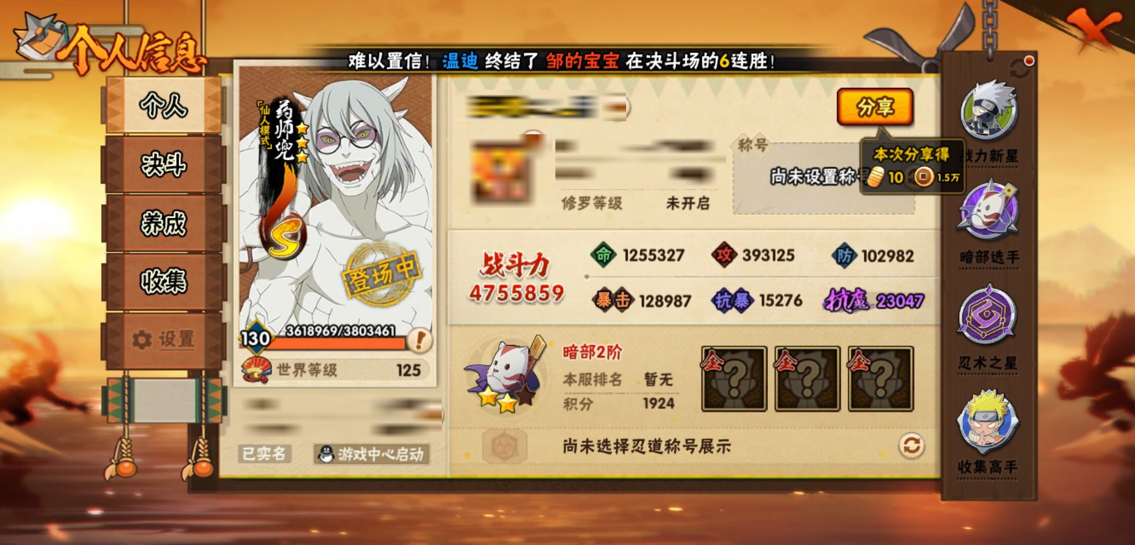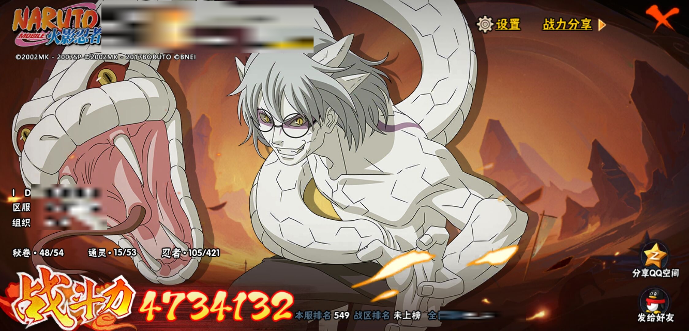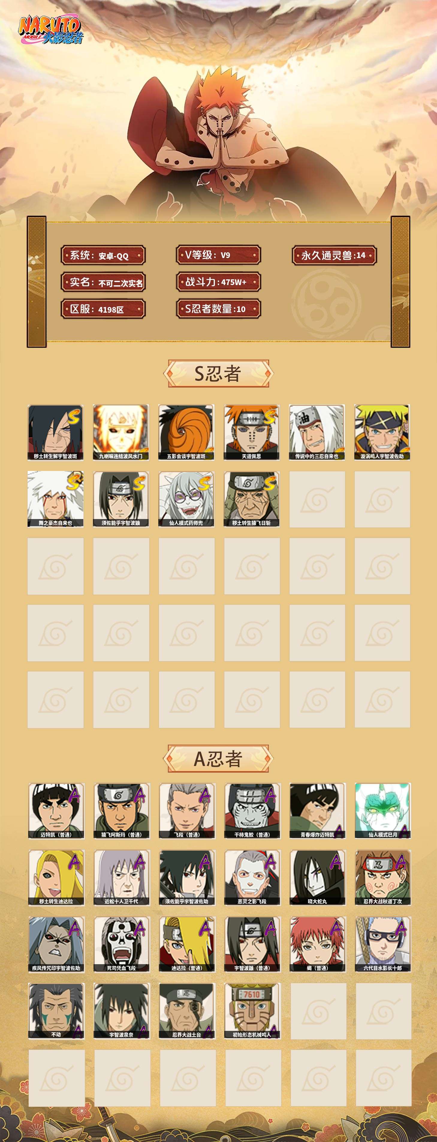 【火影忍者】【lyhy10691】战斗力:475w;段位:暗部2阶;本服排名:549;vip:v9级;s忍:10个;a忍:22个;通灵兽:14个,s忍:秽土转生解宇智波斑|九喇嘛连结波风水门|五影会谈宇智波斑|天道佩恩|传说中的三忍自来也|漩涡鸣人宇智波佐助|舞之豪杰自来也|须佐能乎宇智波鼬|仙人模式药师兜|秽土转生猿飞日斩__a忍:青春爆炸迈特凯|仙人模式巳月|秽土转生迪达拉|近松十人卫千代|须佐能乎宇智波佐助|恶灵之影飞段|晓大蛇丸|忍界大战秋道丁次|疾风传咒印宇智波佐助|死司凭血飞段|迪达拉(普通)|飞段(普通) 3星|迈特凯(普通) 4星|宇智波鼬(普通)|干柿鬼鲛(普通) 3星|蝎(普通)|猿飞阿斯玛(普通) 4星|六代目水影长十郎|不动|宇智波泉奈|忍界大战土台|初始形态机械鸣人__通灵兽:忍犬(普通)|蓝蛇|蛤蟆吉|忍龟|镰鼬|猿魔|山椒鱼|蜃|蛤蟆仙人|鲛鲨|蛤蟆健|乌鸦(普通)|砂之守鹤|蛞蝓(普通)