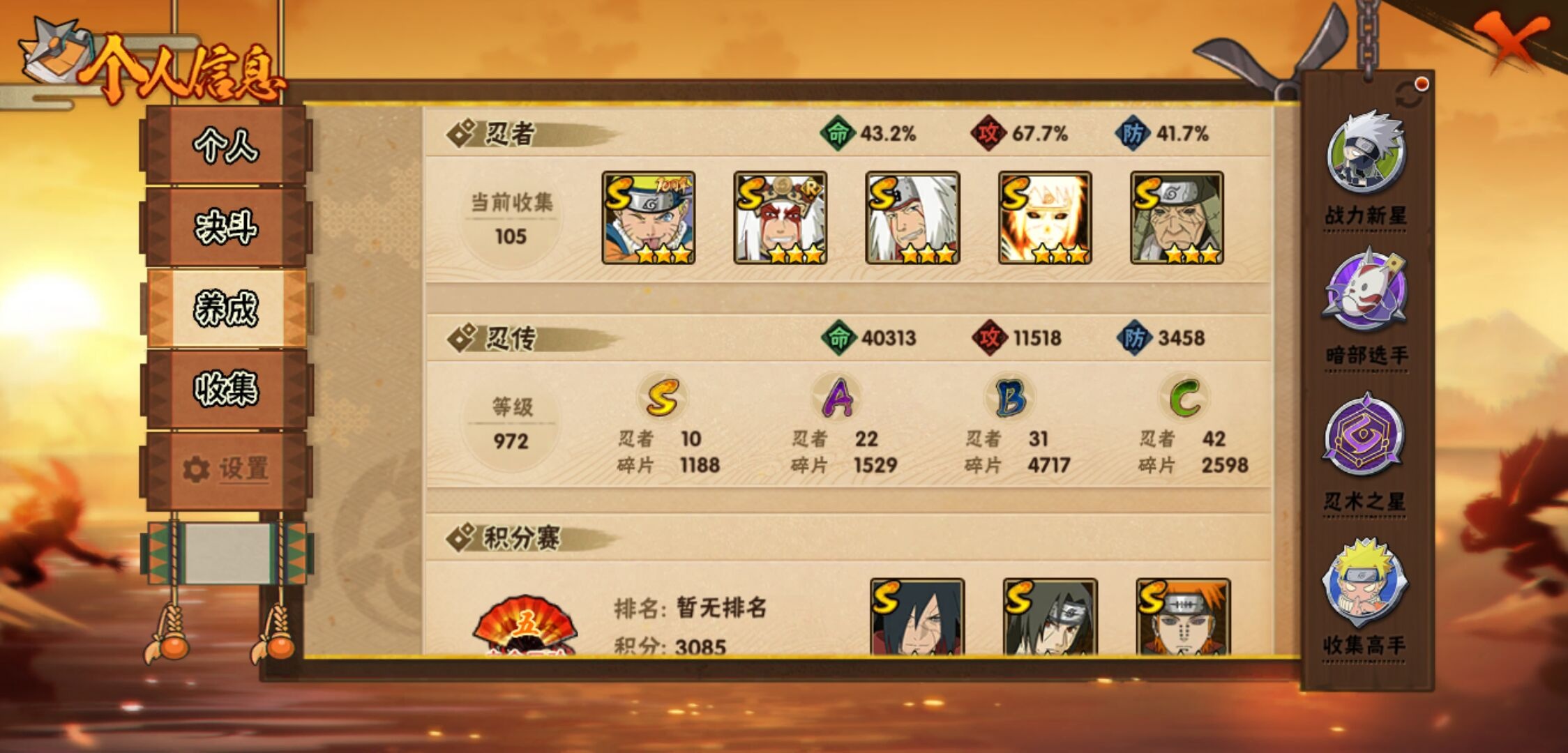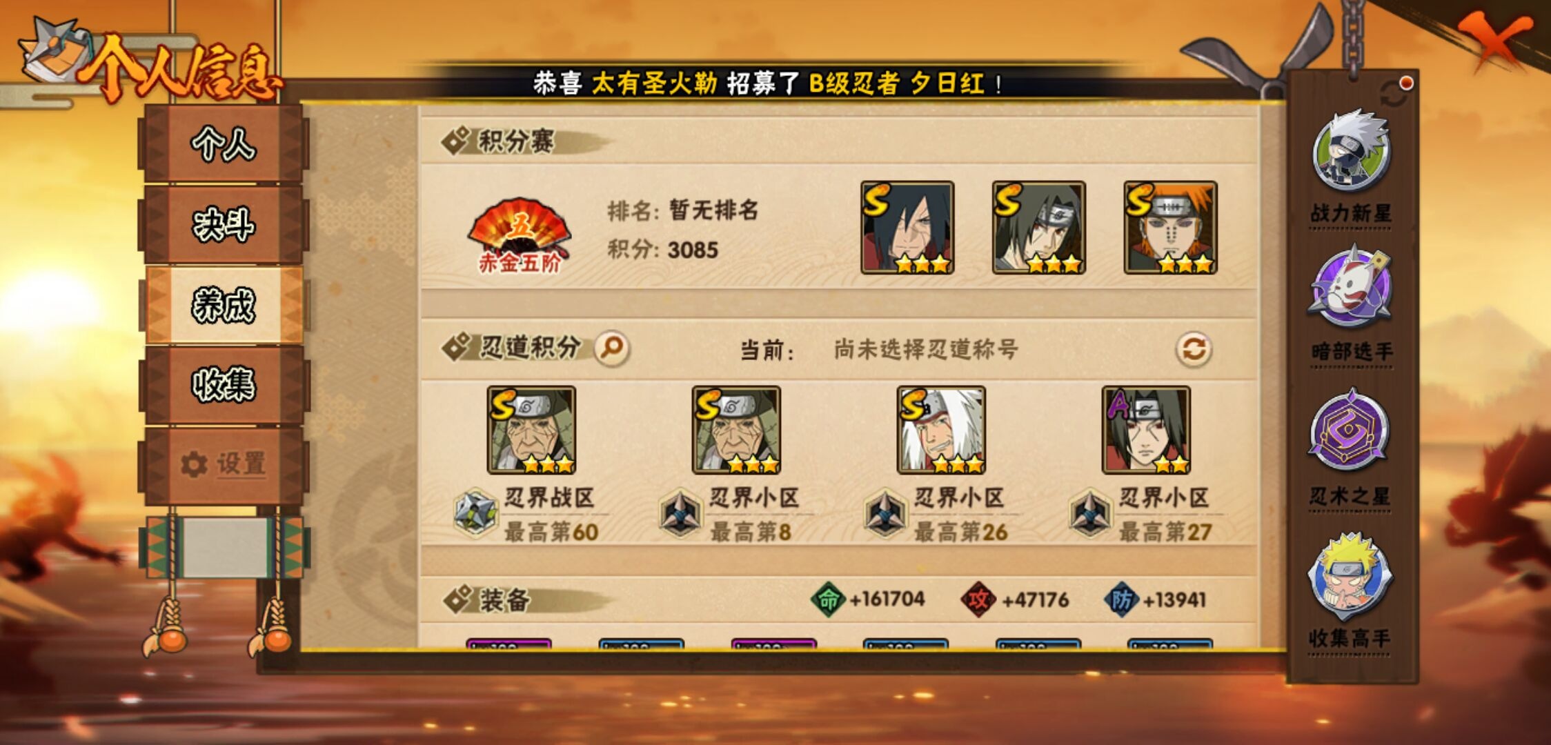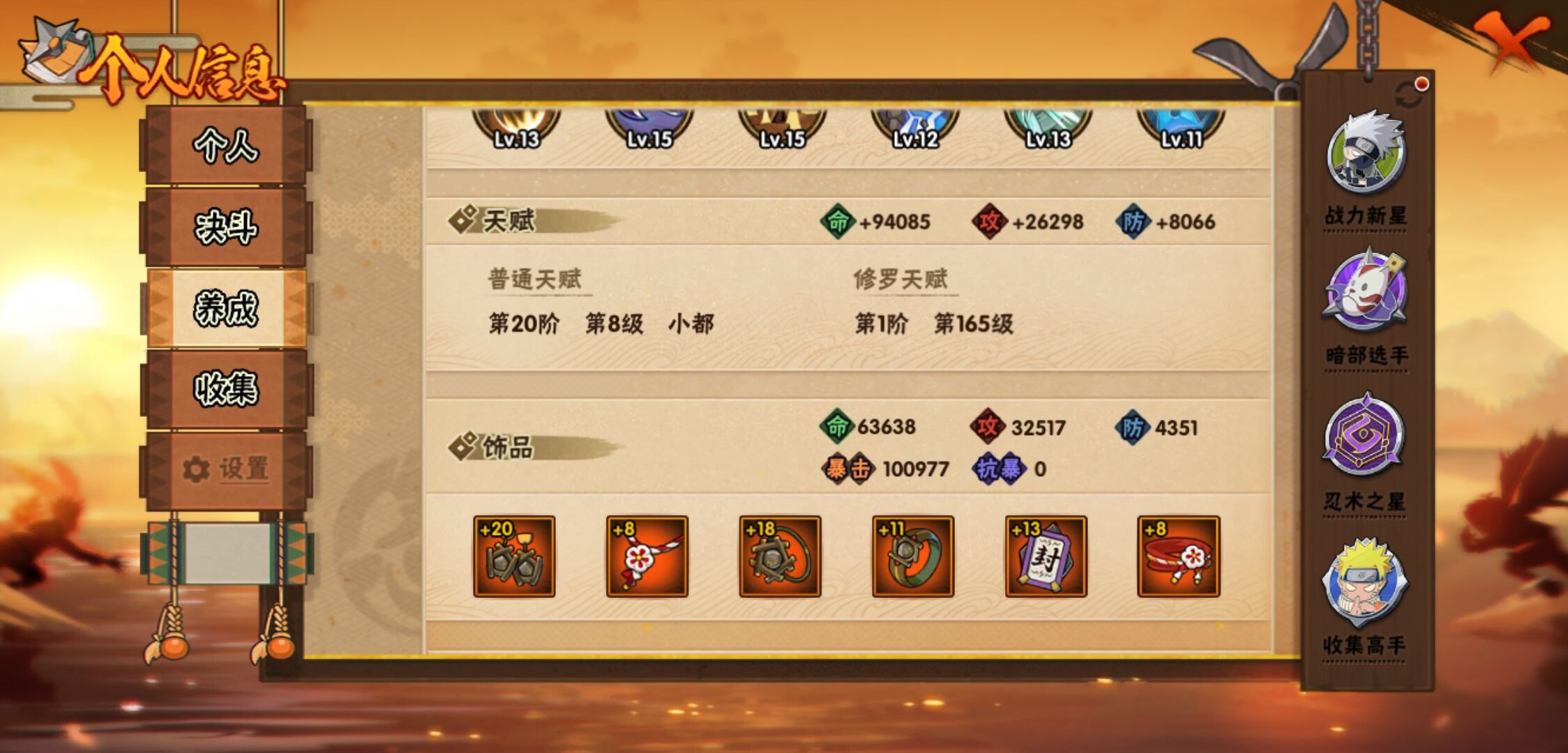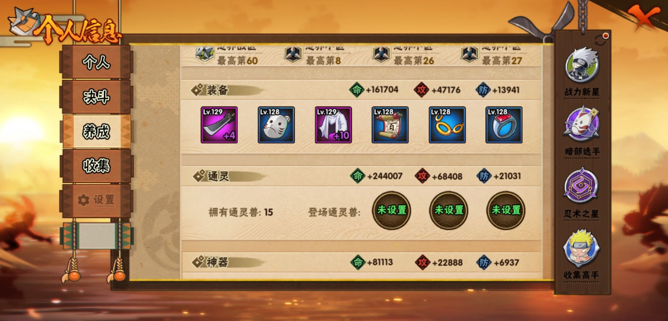 【火影忍者】【lyhy10691】战斗力:475w;段位:暗部2阶;本服排名:549;vip:v9级;s忍:10个;a忍:22个;通灵兽:14个,s忍:秽土转生解宇智波斑|九喇嘛连结波风水门|五影会谈宇智波斑|天道佩恩|传说中的三忍自来也|漩涡鸣人宇智波佐助|舞之豪杰自来也|须佐能乎宇智波鼬|仙人模式药师兜|秽土转生猿飞日斩__a忍:青春爆炸迈特凯|仙人模式巳月|秽土转生迪达拉|近松十人卫千代|须佐能乎宇智波佐助|恶灵之影飞段|晓大蛇丸|忍界大战秋道丁次|疾风传咒印宇智波佐助|死司凭血飞段|迪达拉(普通)|飞段(普通) 3星|迈特凯(普通) 4星|宇智波鼬(普通)|干柿鬼鲛(普通) 3星|蝎(普通)|猿飞阿斯玛(普通) 4星|六代目水影长十郎|不动|宇智波泉奈|忍界大战土台|初始形态机械鸣人__通灵兽:忍犬(普通)|蓝蛇|蛤蟆吉|忍龟|镰鼬|猿魔|山椒鱼|蜃|蛤蟆仙人|鲛鲨|蛤蟆健|乌鸦(普通)|砂之守鹤|蛞蝓(普通)