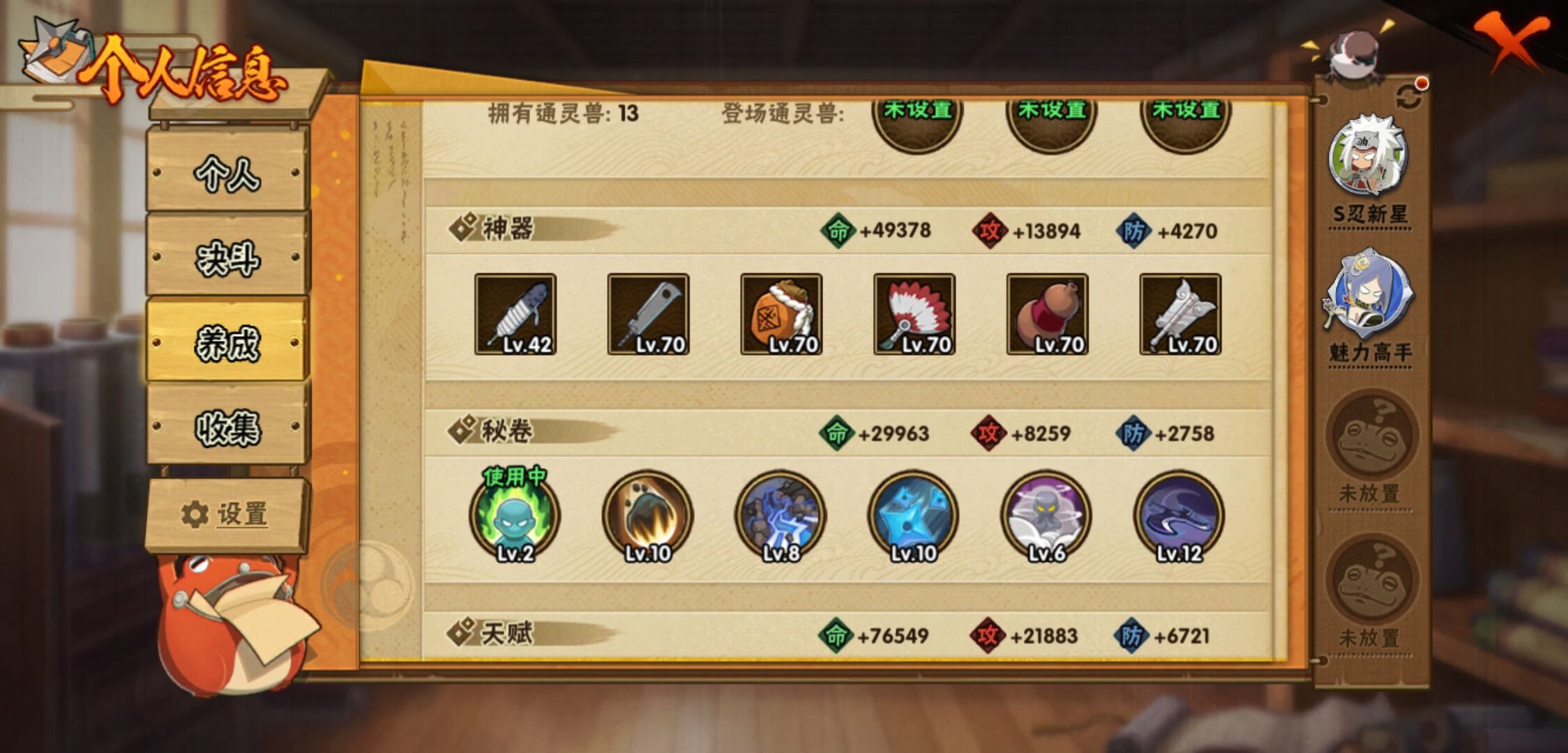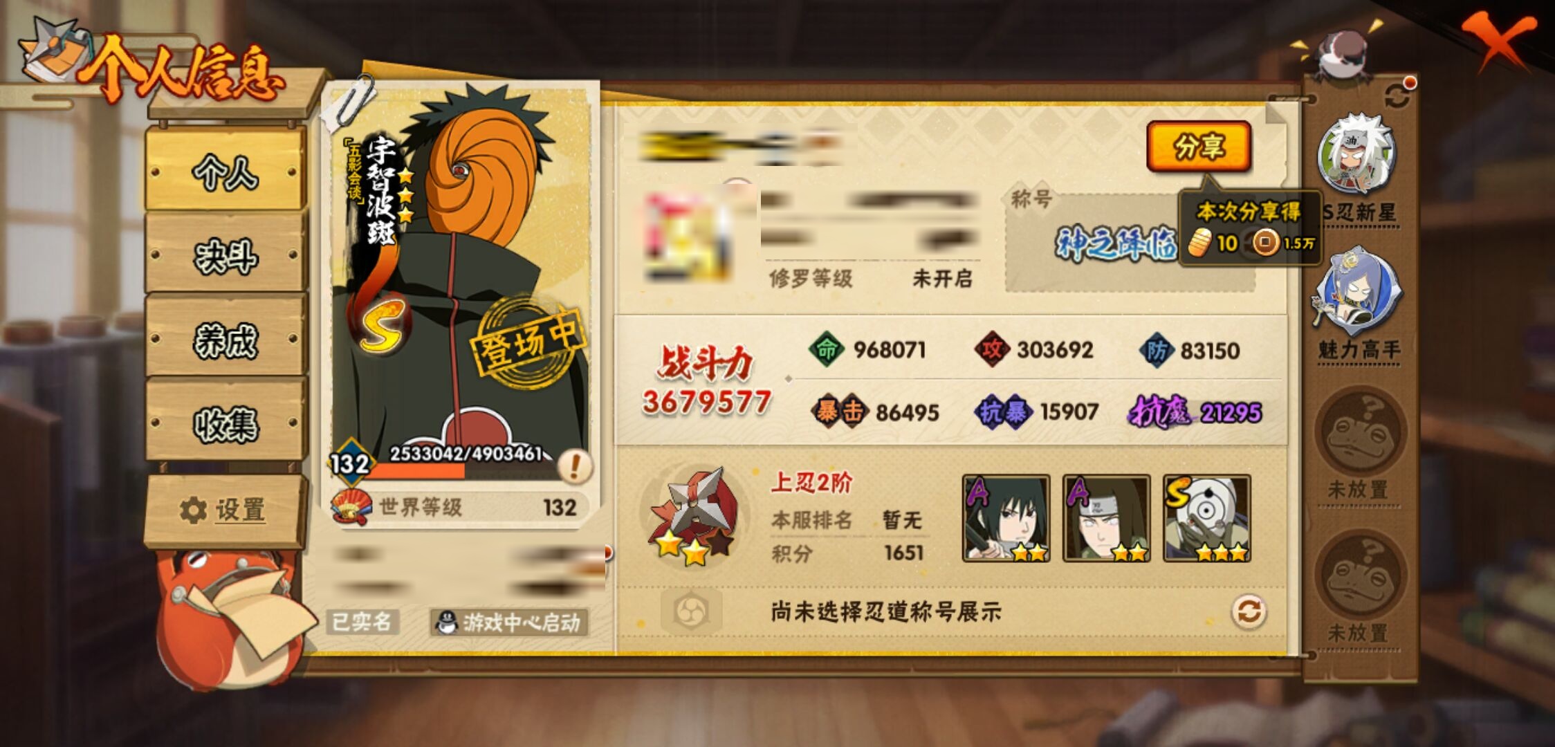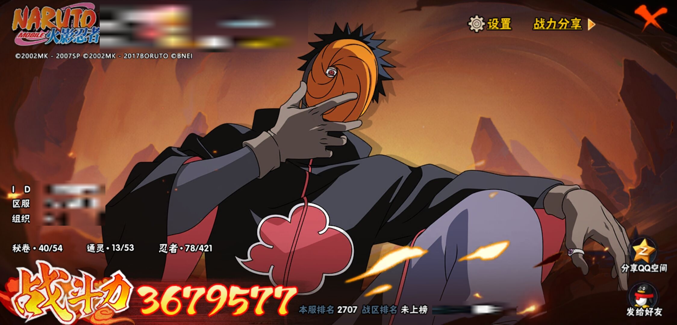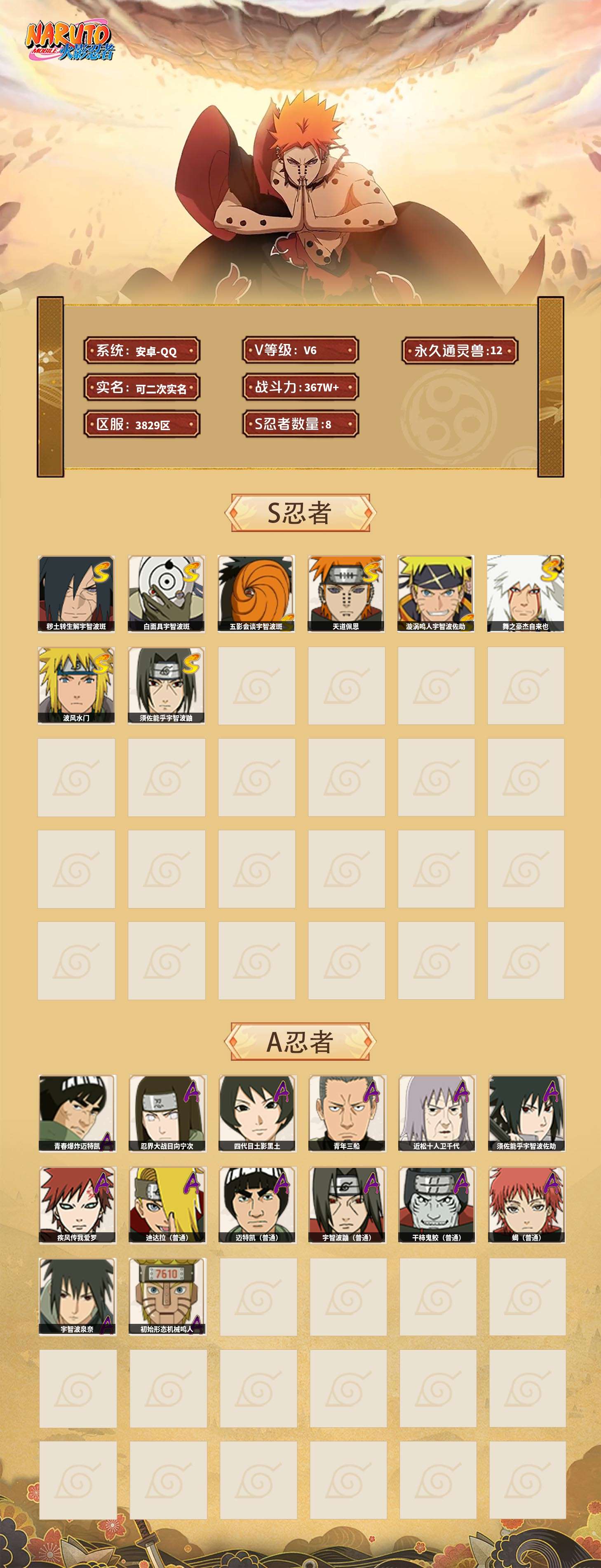 【火影忍者】【lyhy10703】战斗力:367w;段位:上忍2阶;本服排名:2707;vip:v6级;s忍:8个;a忍:14个;通灵兽:12个,s忍:秽土转生解宇智波斑|白面具宇智波斑|五影会谈宇智波斑|天道佩恩|漩涡鸣人宇智波佐助|舞之豪杰自来也|波风水门|须佐能乎宇智波鼬__a忍:青春爆炸迈特凯|忍界大战日向宁次|四代目土影黑土|青年三船|近松十人卫千代|须佐能乎宇智波佐助|疾风传我爱罗|迪达拉(普通)|迈特凯(普通)|宇智波鼬(普通)|干柿鬼鲛(普通)|蝎(普通)|宇智波泉奈|初始形态机械鸣人__通灵兽:忍犬(普通)|蓝蛇|蛤蟆吉|忍龟|镰鼬|猿魔|砂之守鹤|山椒鱼|蜃|蛤蟆仙人|鲛鲨|蛤蟆健