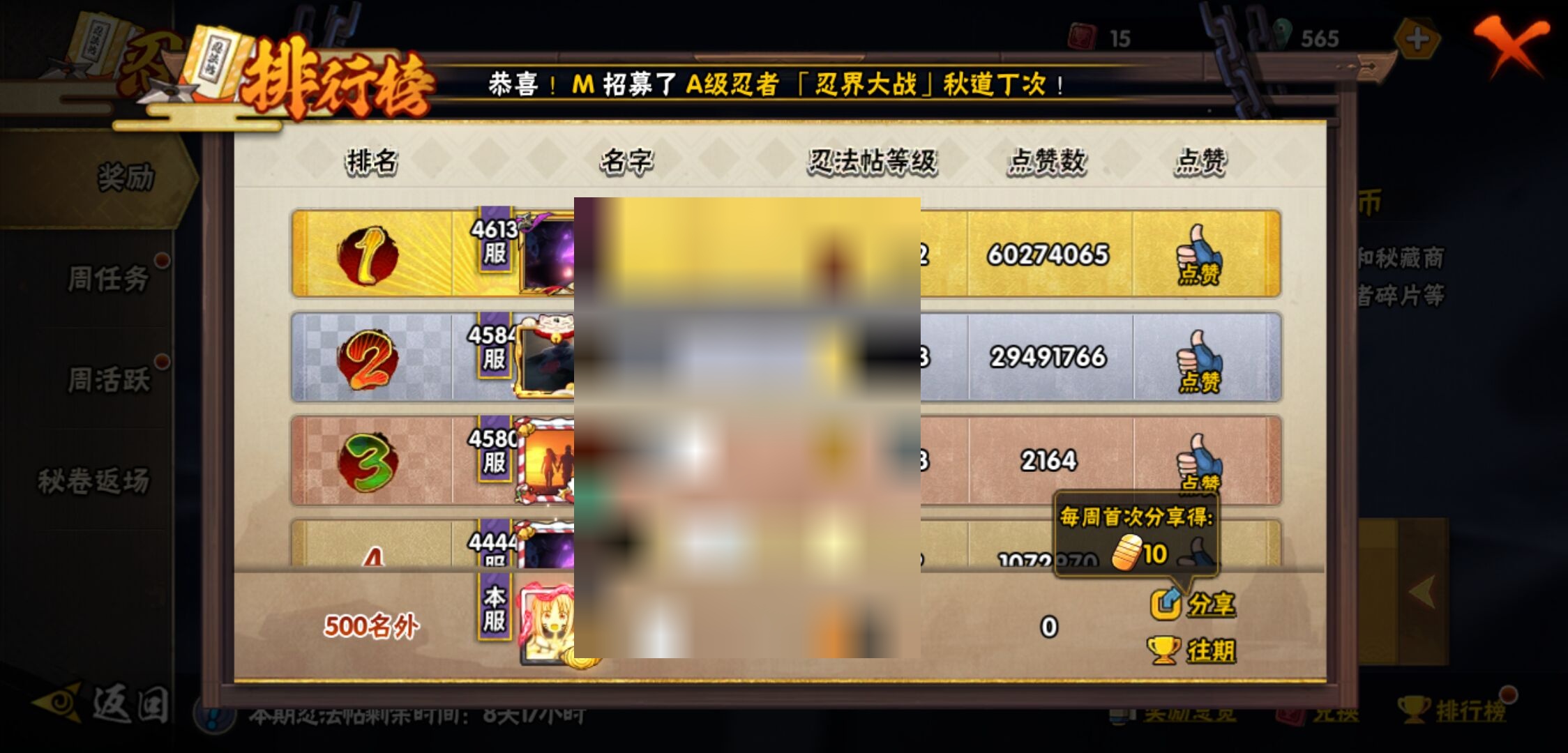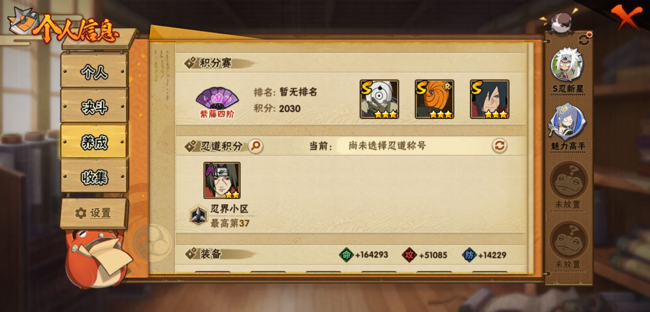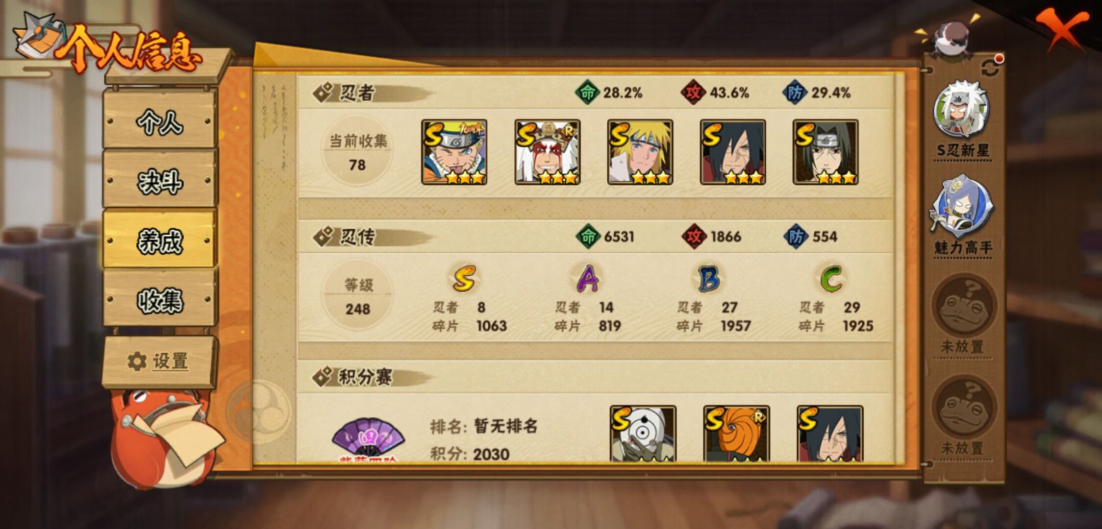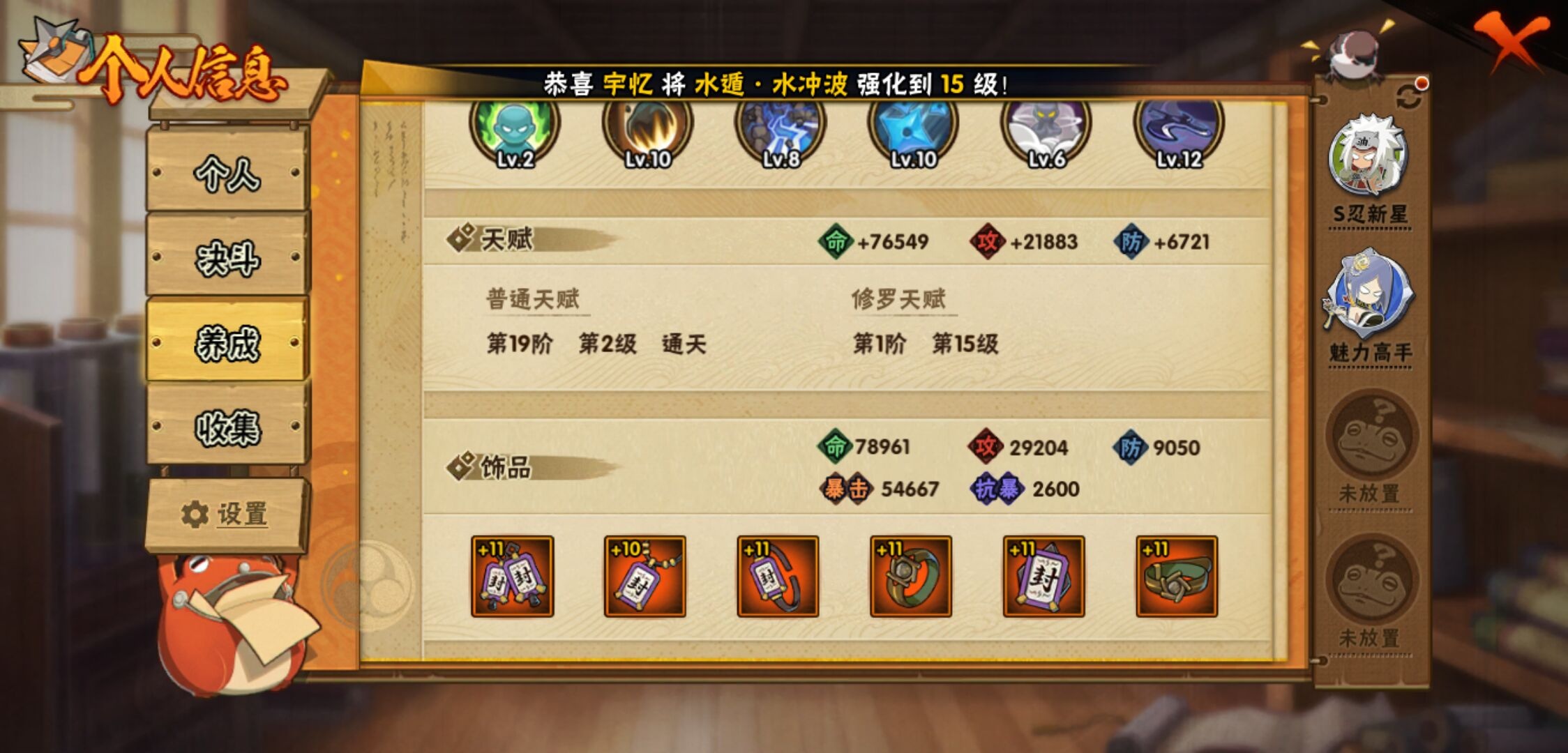 【火影忍者】【lyhy10703】战斗力:367w;段位:上忍2阶;本服排名:2707;vip:v6级;s忍:8个;a忍:14个;通灵兽:12个,s忍:秽土转生解宇智波斑|白面具宇智波斑|五影会谈宇智波斑|天道佩恩|漩涡鸣人宇智波佐助|舞之豪杰自来也|波风水门|须佐能乎宇智波鼬__a忍:青春爆炸迈特凯|忍界大战日向宁次|四代目土影黑土|青年三船|近松十人卫千代|须佐能乎宇智波佐助|疾风传我爱罗|迪达拉(普通)|迈特凯(普通)|宇智波鼬(普通)|干柿鬼鲛(普通)|蝎(普通)|宇智波泉奈|初始形态机械鸣人__通灵兽:忍犬(普通)|蓝蛇|蛤蟆吉|忍龟|镰鼬|猿魔|砂之守鹤|山椒鱼|蜃|蛤蟆仙人|鲛鲨|蛤蟆健