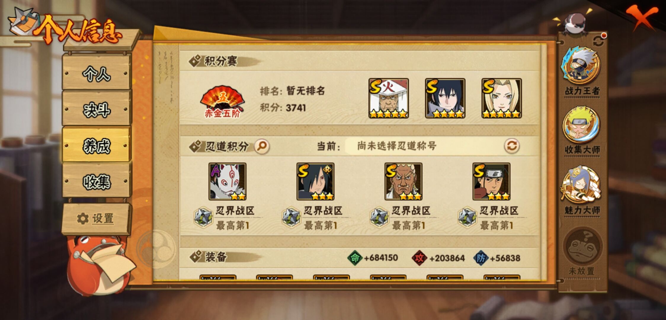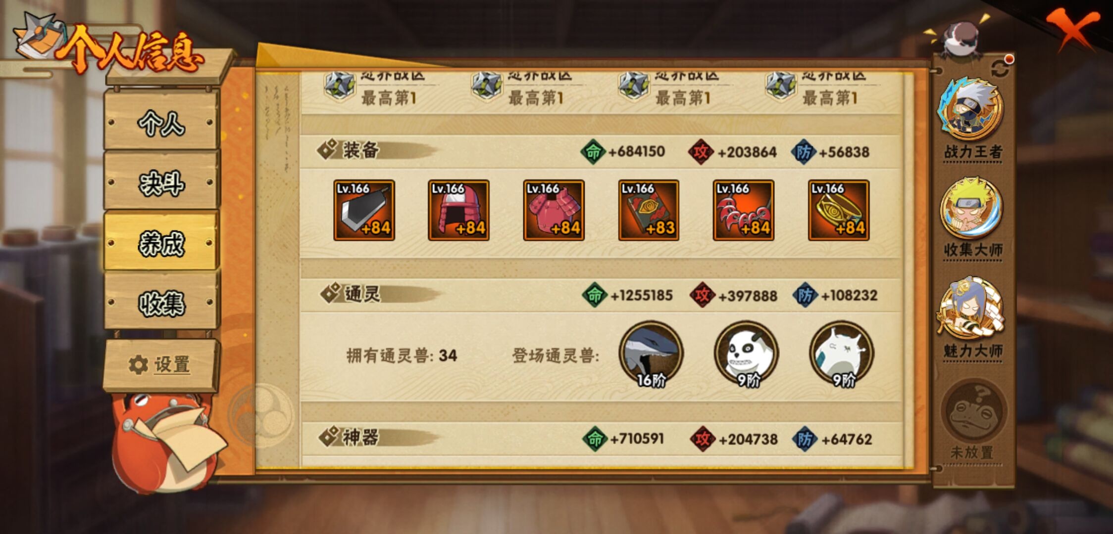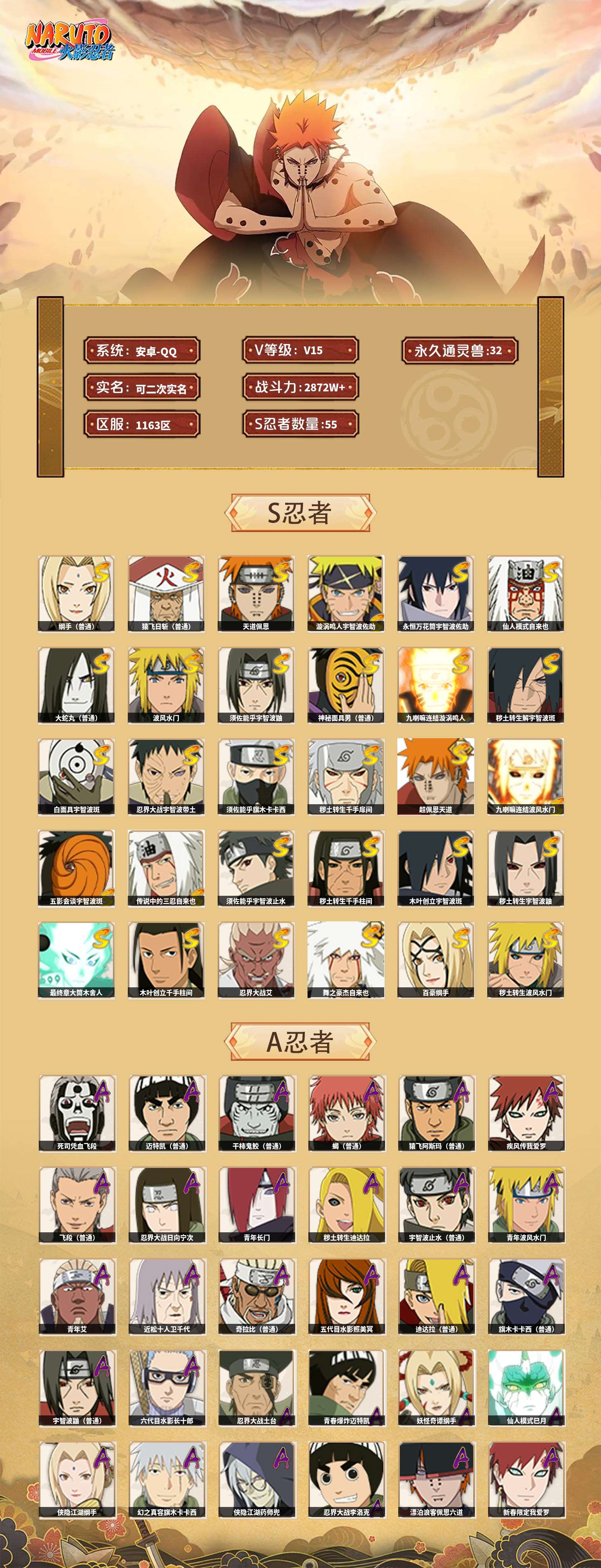 【火影忍者】【lyhy10721】战斗力:2872w;段位:中忍2阶;本服排名:16;vip:v15级;s忍:55个;a忍:93个;通灵兽:32个,s忍:秽土转生解宇智波斑|白面具宇智波斑|忍界大战宇智波带土|须佐能乎旗木卡卡西|秽土转生千手扉间|超佩恩天道|九喇嘛连结波风水门|五影会谈宇智波斑|天道佩恩 4星|传说中的三忍自来也|漩涡鸣人宇智波佐助 4星|须佐能乎宇智波止水|秽土转生千手柱间|木叶创立宇智波斑|秽土转生宇智波鼬|永恒万花筒宇智波佐助 4星|最终章大筒木舍人|仙人模式自来也 4星|木叶创立千手柱间|忍界大战艾|舞之豪杰自来也|大蛇丸(普通) 4星|纲手(普通) 5星|百豪纲手|波风水门 4星|秽土转生波风水门|千手扉间(普通)|千手柱间(普通)|秽土转生宇智波斑|宇智波斑(普通)|须佐能乎宇智波鼬 4星|神秘面具男(普通) 4星|红夜之刃神秘面具男|秽土转生长门|秽土转生半藏|秽土转生三代目风影|秽土转生金角银角|二代目土影无|二代目水影鬼灯幻月|三代目土影大野木|三代目雷影艾|四代目雷影艾|四代目风影罗砂|仙人模式药师兜|死门迈特凯|忍界大战大野木|忍界大战春野樱|九喇嘛连结漩涡鸣人 4星|博人传大筒木金式|大筒木桃式|猿飞日斩(普通) 5星|秽土转生猿飞日斩|自来也(普通)|暴怒第六尾漩涡鸣人|初代目风影烈斗__a忍:青春爆炸迈特凯|妖怪奇谭纲手|仙人模式巳月|侠隐江湖纲手|幻之真容旗木卡卡西|侠隐江湖药师兜|忍界大战李洛克|漂泊浪客佩恩六道|新春限定我爱罗|秽土转生角都|忍界大战日向宁次 3星|四代目土影黑土|木叶上忍猿飞木叶丸|火之意志继承者卑留呼|青年长门 3星|晓创生飞段|侠隐江湖照美冥|忍者之路神秘面具男|秽土转生迪达拉 3星|志村团藏|宇智波止水(普通) 3星|新春限定宇智波止水|青年三船|元气夏日旗木卡卡西|不风|新春限定迪达拉|忍界大战奇拉比|青年波风水门 3星|青年艾 3星|三忍之师猿飞日斩|漂泊武士千手扉间|鲛肌融合干柿鬼鲛|加藤断|忍界大战旗木卡卡西|漂泊武士桃地再不斩|近松十人卫千代 3星|夏日泳装照美冥|晓创生蝎|晓创生角都|忍界大战迈特凯|半蛇斗篷药师兜|须佐能乎宇智波佐助|九尾查克拉漩涡鸣人|七夕限定猿飞阿斯玛|恶灵之影飞段|暴怒宇智波带土|晓大蛇丸|地陆|火影继承人猿飞日斩|百豪春野樱|忍界大战秋道丁次|忍界大战我爱罗|忍界大战勘九郎|秽土转生猿飞阿斯玛|新春限定波风水门|夏日泳装小南|新春限定宇智波鼬|奇拉比(普通) 3星|万花筒写轮眼宇智波佐助|五代目水影照美冥 3星|五代目雷影达鲁伊|惊门迈特凯|绝|死司凭血飞段 5星|角都(普通)|地怨虞角都|疾风传我爱罗 4星|迪达拉(普通) 3星|飞段(普通) 4星|小南(普通)|仙人模式漩涡鸣人|万花筒写轮眼旗木卡卡西|旗木卡卡西(普通) 3星|迈特凯(普通) 5星|宇智波鼬(普通) 3星|夏日限定宇智波鼬|干柿鬼鲛(普通) 5星|秽土转生桃地再不斩|桃地再不斩|蝎(普通) 5星|绯流琥蝎|猿飞阿斯玛(普通) 5星|桃式显现漩涡博人|最终章日向雏田|六代目水影长十郎 3星|不缘|新春限定大蛇丸|不动|宇智波泉奈|羁绊神农|夏日限定黑土|忍界大战土台 3星|初始形态机械鸣人__通灵兽:忍犬(普通)|蓝蛇|蛤蟆吉|忍龟|镰鼬|猿魔|山椒鱼|蜃|蛤蟆仙人|鲛鲨|蛤蟆健|乌鸦(普通)|熊猫|二尾又旅|蛞蝓(普通)|蛤蟆龙|蛤蟆广|梦貘|砂之守鹤|鹰|螃蟹|五尾穆王|万蛇|蜘蛛|四尾孙悟空|九尾九喇嘛|怒鬼爪|蛞蝓侠隐江湖|公牛|怒鬼(普通)|怒鬼无臂|辛牙