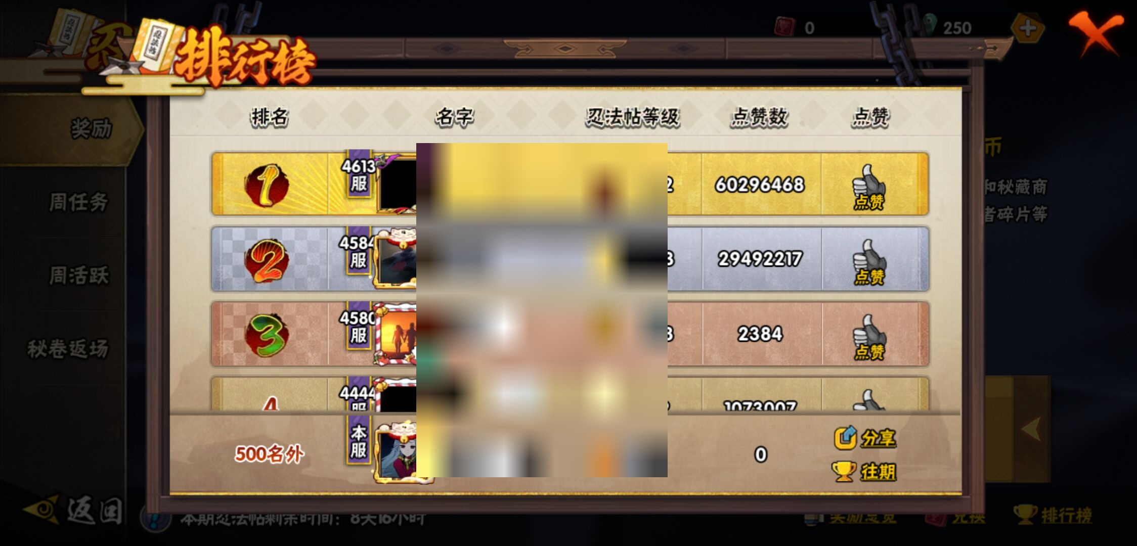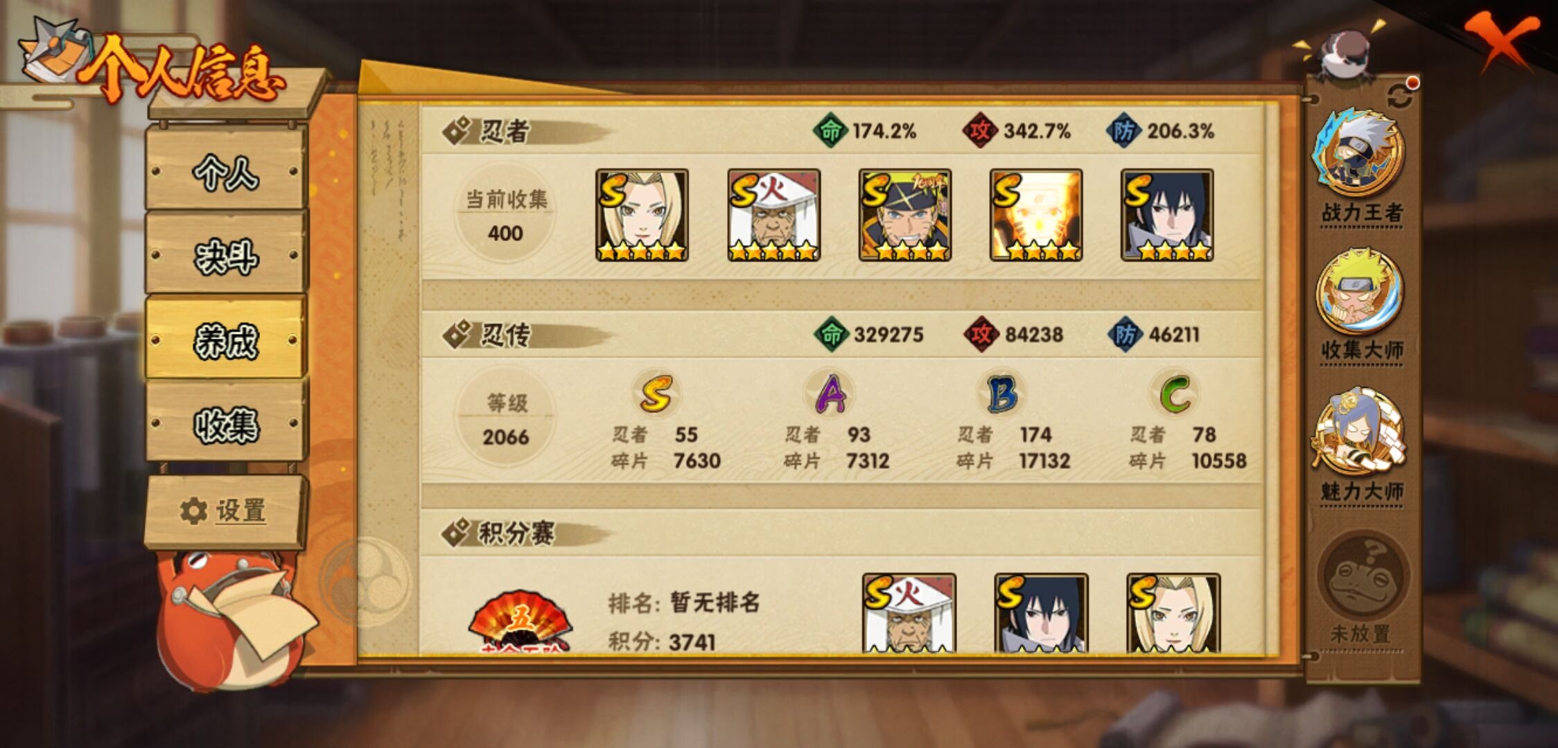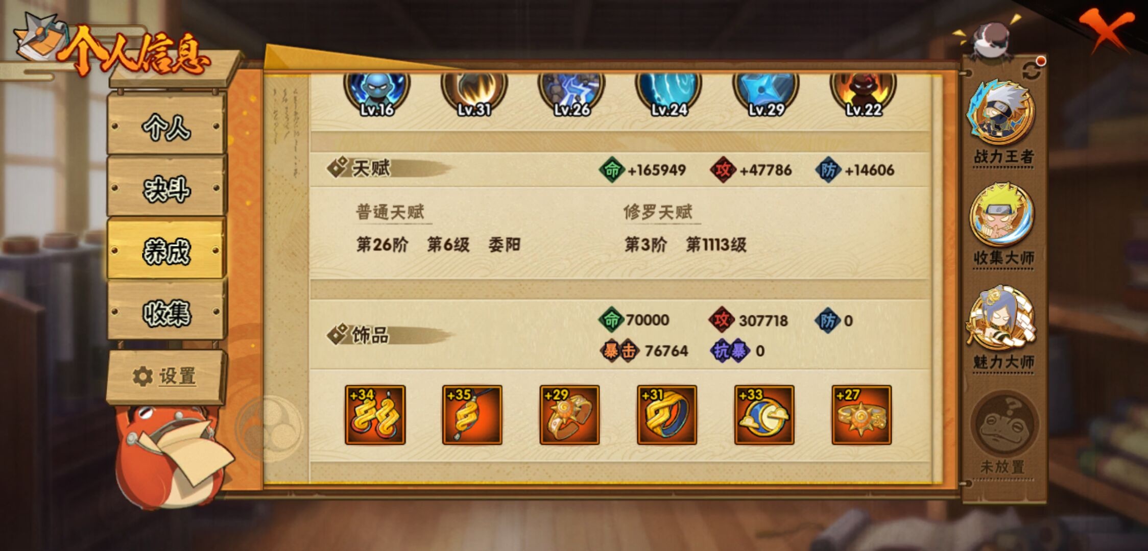 【火影忍者】【lyhy10721】战斗力:2872w;段位:中忍2阶;本服排名:16;vip:v15级;s忍:55个;a忍:93个;通灵兽:32个,s忍:秽土转生解宇智波斑|白面具宇智波斑|忍界大战宇智波带土|须佐能乎旗木卡卡西|秽土转生千手扉间|超佩恩天道|九喇嘛连结波风水门|五影会谈宇智波斑|天道佩恩 4星|传说中的三忍自来也|漩涡鸣人宇智波佐助 4星|须佐能乎宇智波止水|秽土转生千手柱间|木叶创立宇智波斑|秽土转生宇智波鼬|永恒万花筒宇智波佐助 4星|最终章大筒木舍人|仙人模式自来也 4星|木叶创立千手柱间|忍界大战艾|舞之豪杰自来也|大蛇丸(普通) 4星|纲手(普通) 5星|百豪纲手|波风水门 4星|秽土转生波风水门|千手扉间(普通)|千手柱间(普通)|秽土转生宇智波斑|宇智波斑(普通)|须佐能乎宇智波鼬 4星|神秘面具男(普通) 4星|红夜之刃神秘面具男|秽土转生长门|秽土转生半藏|秽土转生三代目风影|秽土转生金角银角|二代目土影无|二代目水影鬼灯幻月|三代目土影大野木|三代目雷影艾|四代目雷影艾|四代目风影罗砂|仙人模式药师兜|死门迈特凯|忍界大战大野木|忍界大战春野樱|九喇嘛连结漩涡鸣人 4星|博人传大筒木金式|大筒木桃式|猿飞日斩(普通) 5星|秽土转生猿飞日斩|自来也(普通)|暴怒第六尾漩涡鸣人|初代目风影烈斗__a忍:青春爆炸迈特凯|妖怪奇谭纲手|仙人模式巳月|侠隐江湖纲手|幻之真容旗木卡卡西|侠隐江湖药师兜|忍界大战李洛克|漂泊浪客佩恩六道|新春限定我爱罗|秽土转生角都|忍界大战日向宁次 3星|四代目土影黑土|木叶上忍猿飞木叶丸|火之意志继承者卑留呼|青年长门 3星|晓创生飞段|侠隐江湖照美冥|忍者之路神秘面具男|秽土转生迪达拉 3星|志村团藏|宇智波止水(普通) 3星|新春限定宇智波止水|青年三船|元气夏日旗木卡卡西|不风|新春限定迪达拉|忍界大战奇拉比|青年波风水门 3星|青年艾 3星|三忍之师猿飞日斩|漂泊武士千手扉间|鲛肌融合干柿鬼鲛|加藤断|忍界大战旗木卡卡西|漂泊武士桃地再不斩|近松十人卫千代 3星|夏日泳装照美冥|晓创生蝎|晓创生角都|忍界大战迈特凯|半蛇斗篷药师兜|须佐能乎宇智波佐助|九尾查克拉漩涡鸣人|七夕限定猿飞阿斯玛|恶灵之影飞段|暴怒宇智波带土|晓大蛇丸|地陆|火影继承人猿飞日斩|百豪春野樱|忍界大战秋道丁次|忍界大战我爱罗|忍界大战勘九郎|秽土转生猿飞阿斯玛|新春限定波风水门|夏日泳装小南|新春限定宇智波鼬|奇拉比(普通) 3星|万花筒写轮眼宇智波佐助|五代目水影照美冥 3星|五代目雷影达鲁伊|惊门迈特凯|绝|死司凭血飞段 5星|角都(普通)|地怨虞角都|疾风传我爱罗 4星|迪达拉(普通) 3星|飞段(普通) 4星|小南(普通)|仙人模式漩涡鸣人|万花筒写轮眼旗木卡卡西|旗木卡卡西(普通) 3星|迈特凯(普通) 5星|宇智波鼬(普通) 3星|夏日限定宇智波鼬|干柿鬼鲛(普通) 5星|秽土转生桃地再不斩|桃地再不斩|蝎(普通) 5星|绯流琥蝎|猿飞阿斯玛(普通) 5星|桃式显现漩涡博人|最终章日向雏田|六代目水影长十郎 3星|不缘|新春限定大蛇丸|不动|宇智波泉奈|羁绊神农|夏日限定黑土|忍界大战土台 3星|初始形态机械鸣人__通灵兽:忍犬(普通)|蓝蛇|蛤蟆吉|忍龟|镰鼬|猿魔|山椒鱼|蜃|蛤蟆仙人|鲛鲨|蛤蟆健|乌鸦(普通)|熊猫|二尾又旅|蛞蝓(普通)|蛤蟆龙|蛤蟆广|梦貘|砂之守鹤|鹰|螃蟹|五尾穆王|万蛇|蜘蛛|四尾孙悟空|九尾九喇嘛|怒鬼爪|蛞蝓侠隐江湖|公牛|怒鬼(普通)|怒鬼无臂|辛牙