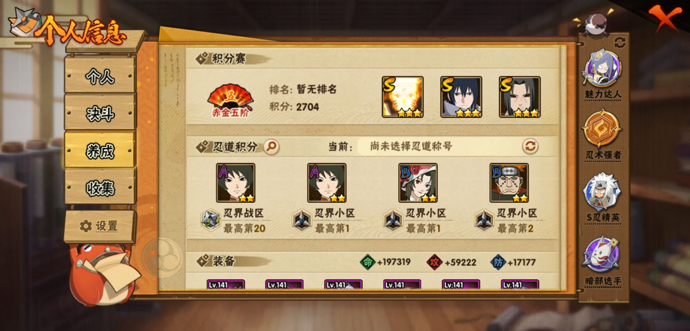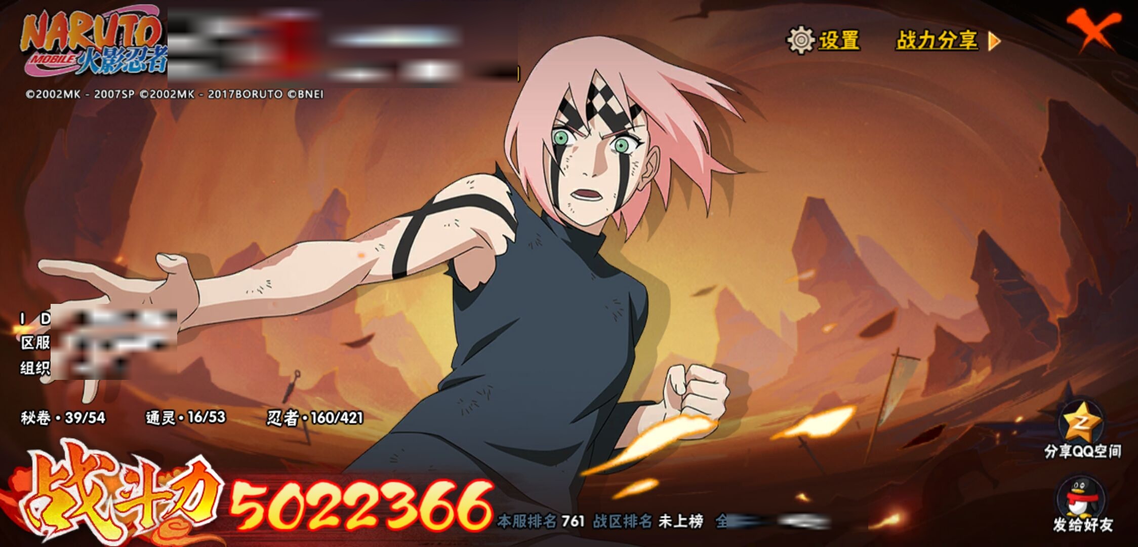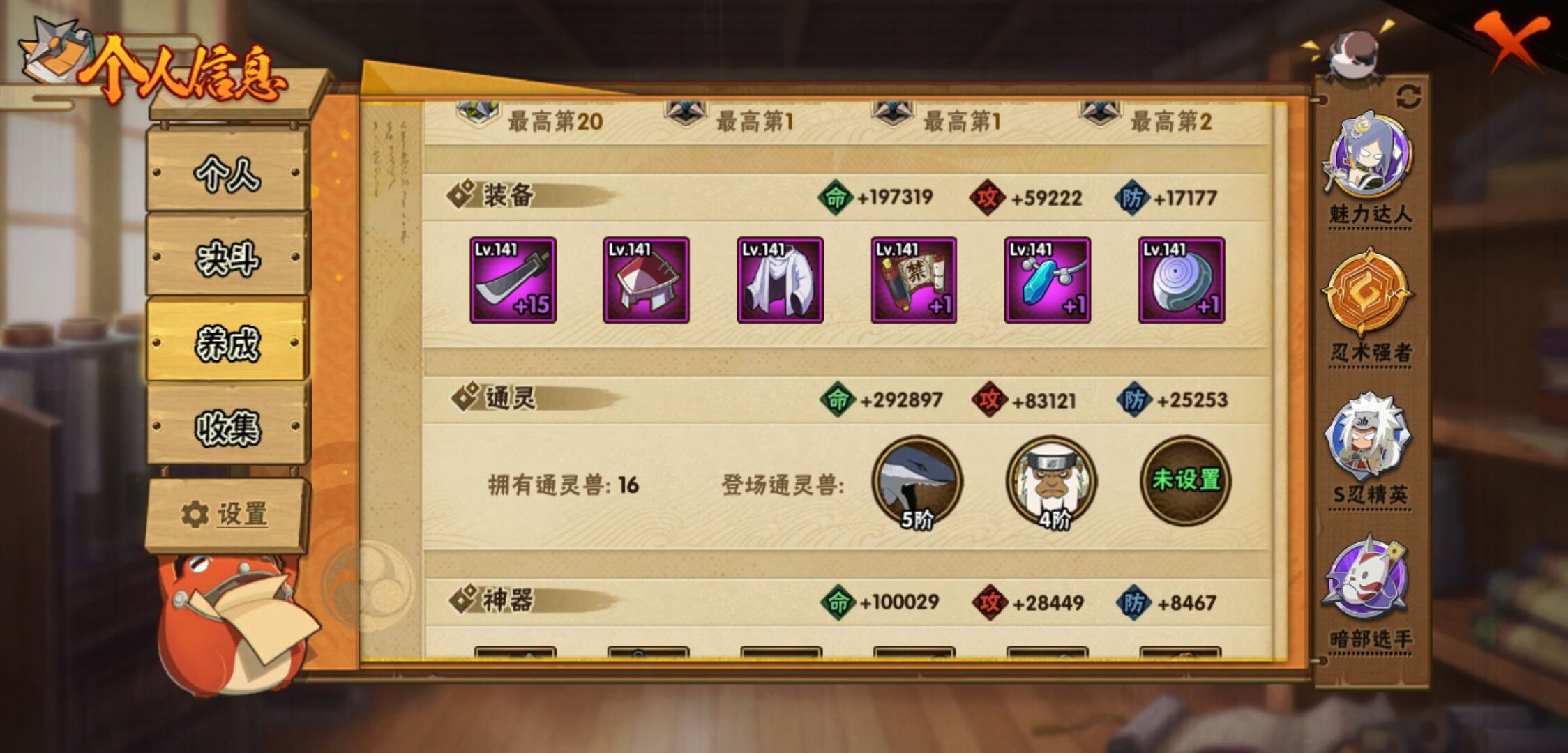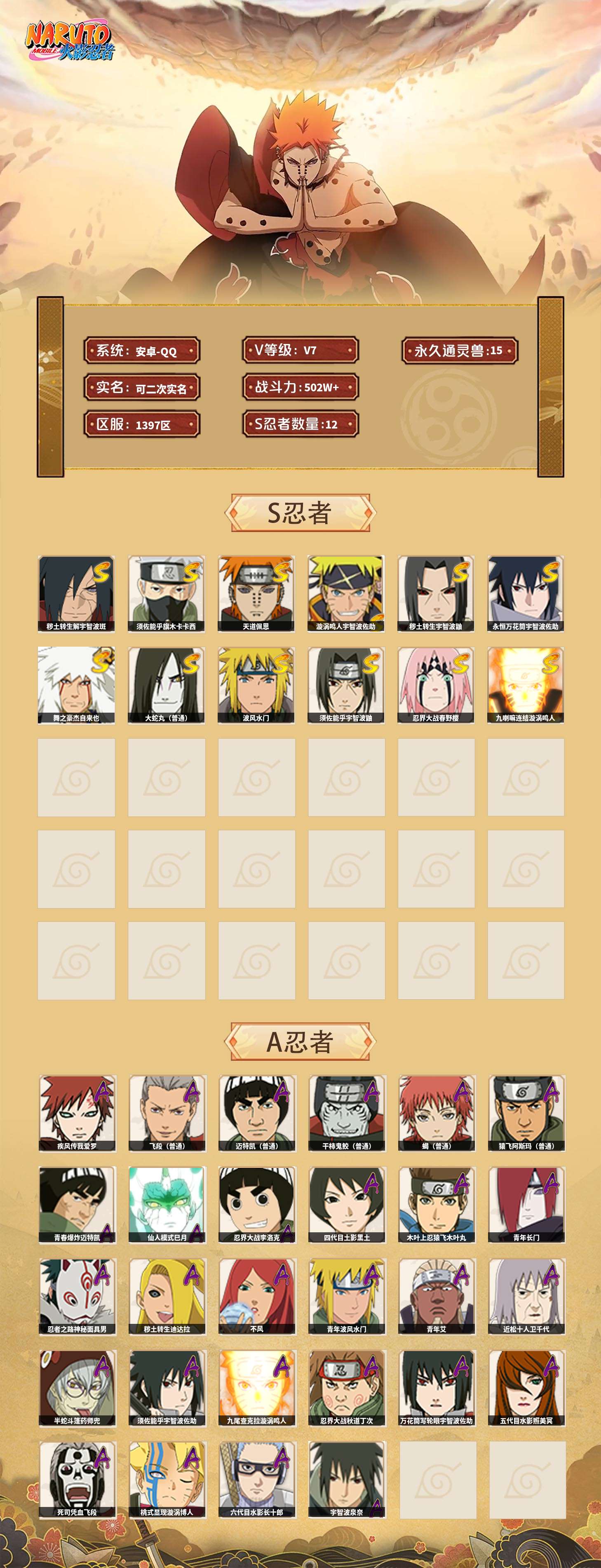 【火影忍者】【lyhy10717】战斗力:502w;段位:暗部2阶;本服排名:761;vip:v7级;s忍:12个;a忍:28个;通灵兽:15个,s忍:秽土转生解宇智波斑|须佐能乎旗木卡卡西|天道佩恩|漩涡鸣人宇智波佐助|秽土转生宇智波鼬|永恒万花筒宇智波佐助|舞之豪杰自来也|大蛇丸(普通)|波风水门|须佐能乎宇智波鼬|忍界大战春野樱|九喇嘛连结漩涡鸣人__a忍:青春爆炸迈特凯|仙人模式巳月|忍界大战李洛克|四代目土影黑土|木叶上忍猿飞木叶丸|青年长门|忍者之路神秘面具男|秽土转生迪达拉|不风|青年波风水门|青年艾|近松十人卫千代|半蛇斗篷药师兜|须佐能乎宇智波佐助|九尾查克拉漩涡鸣人|忍界大战秋道丁次|万花筒写轮眼宇智波佐助|五代目水影照美冥|死司凭血飞段|疾风传我爱罗 3星|飞段(普通) 3星|迈特凯(普通) 3星|干柿鬼鲛(普通) 3星|蝎(普通) 3星|猿飞阿斯玛(普通) 3星|桃式显现漩涡博人|六代目水影长十郎|宇智波泉奈__通灵兽:忍犬(普通)|蓝蛇|蛤蟆吉|忍龟|镰鼬|猿魔|山椒鱼|蜃|砂之守鹤|蛤蟆仙人|鲛鲨|蛤蟆健|乌鸦(普通)|蛤蟆龙|乌鸦夏日限定