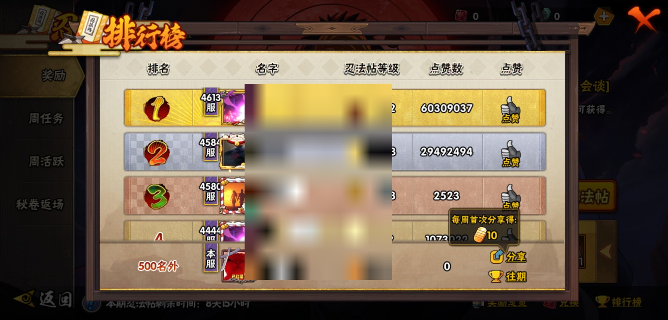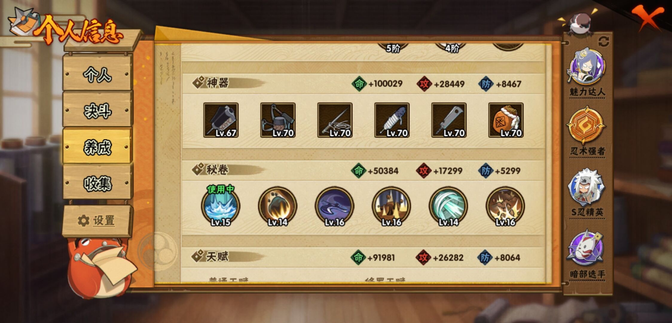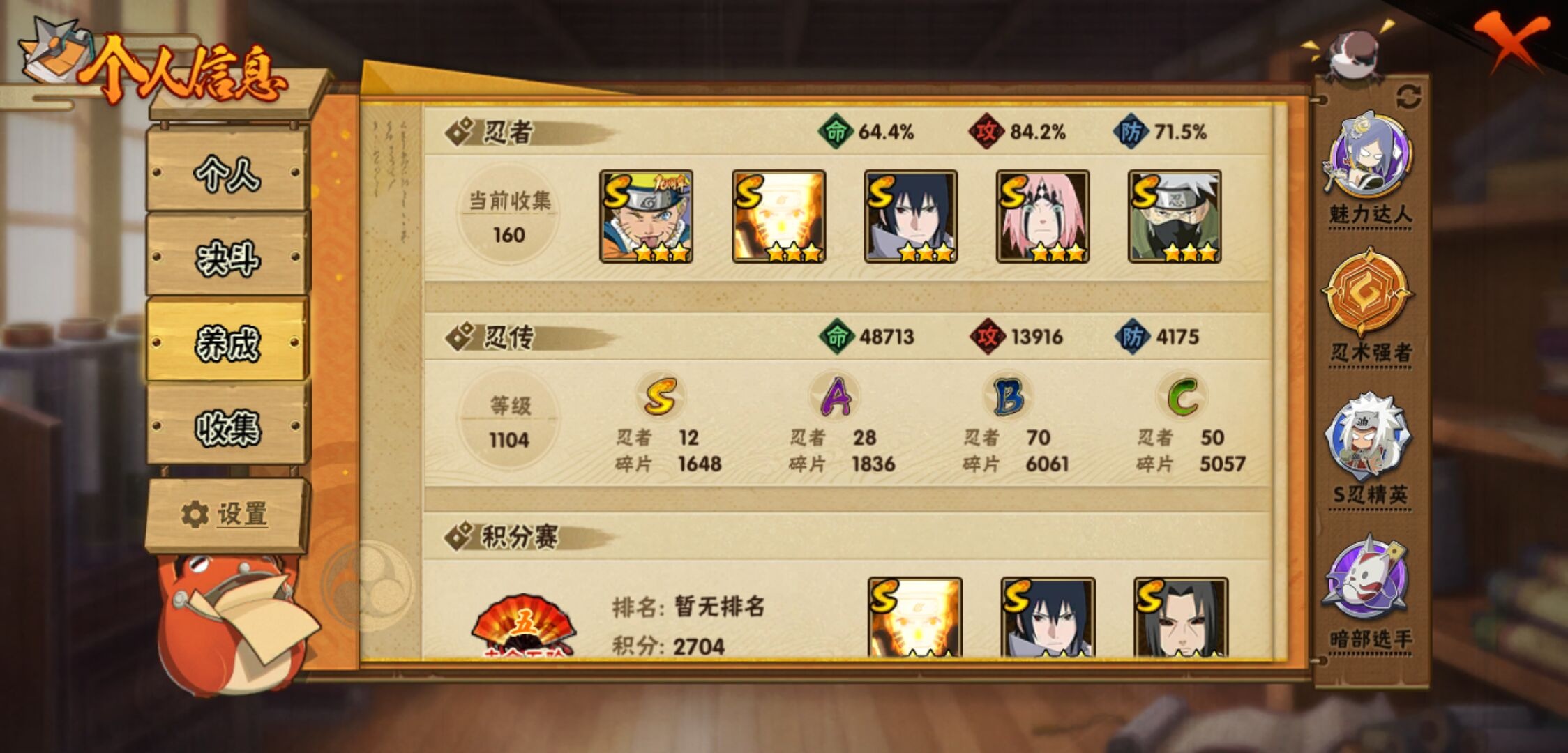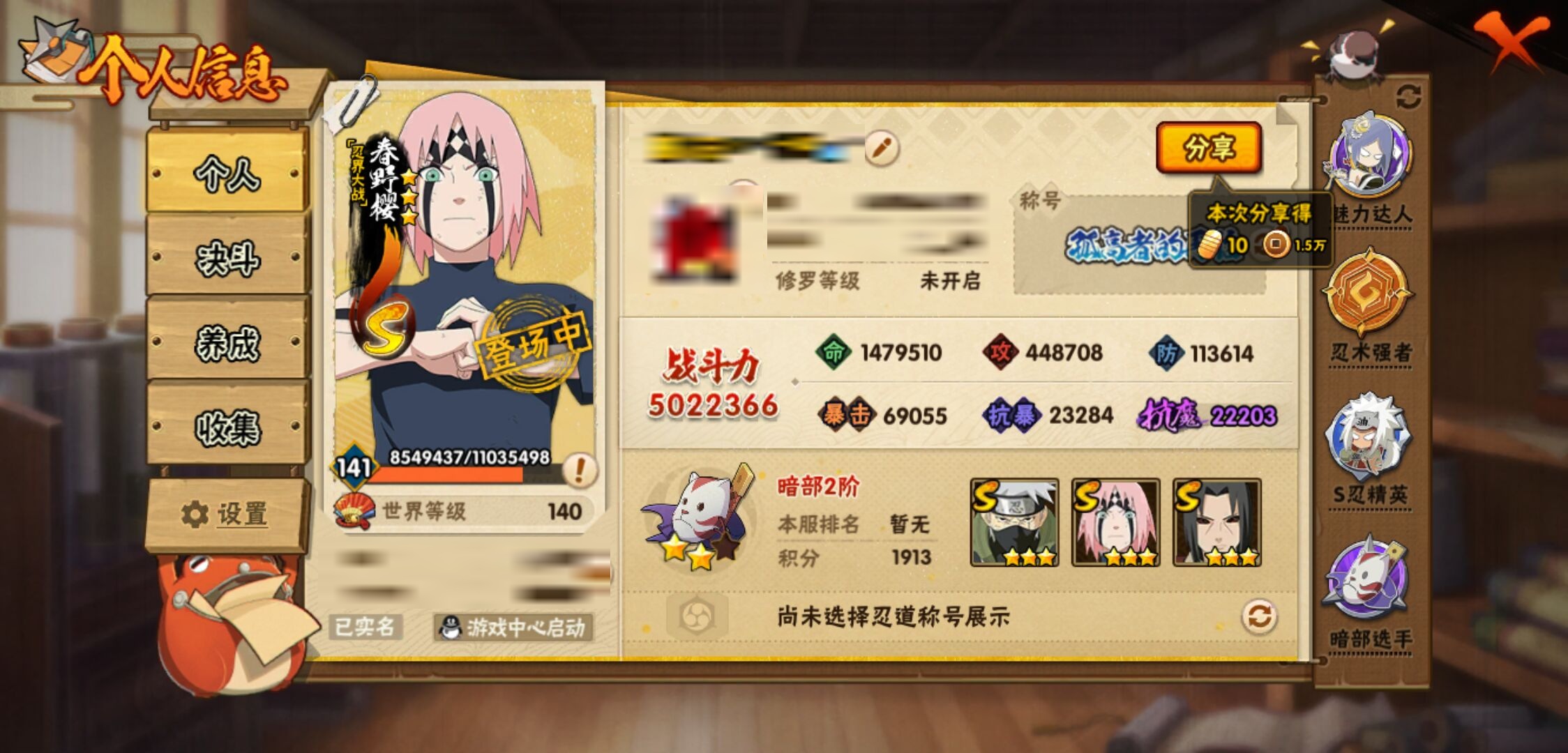 【火影忍者】【lyhy10717】战斗力:502w;段位:暗部2阶;本服排名:761;vip:v7级;s忍:12个;a忍:28个;通灵兽:15个,s忍:秽土转生解宇智波斑|须佐能乎旗木卡卡西|天道佩恩|漩涡鸣人宇智波佐助|秽土转生宇智波鼬|永恒万花筒宇智波佐助|舞之豪杰自来也|大蛇丸(普通)|波风水门|须佐能乎宇智波鼬|忍界大战春野樱|九喇嘛连结漩涡鸣人__a忍:青春爆炸迈特凯|仙人模式巳月|忍界大战李洛克|四代目土影黑土|木叶上忍猿飞木叶丸|青年长门|忍者之路神秘面具男|秽土转生迪达拉|不风|青年波风水门|青年艾|近松十人卫千代|半蛇斗篷药师兜|须佐能乎宇智波佐助|九尾查克拉漩涡鸣人|忍界大战秋道丁次|万花筒写轮眼宇智波佐助|五代目水影照美冥|死司凭血飞段|疾风传我爱罗 3星|飞段(普通) 3星|迈特凯(普通) 3星|干柿鬼鲛(普通) 3星|蝎(普通) 3星|猿飞阿斯玛(普通) 3星|桃式显现漩涡博人|六代目水影长十郎|宇智波泉奈__通灵兽:忍犬(普通)|蓝蛇|蛤蟆吉|忍龟|镰鼬|猿魔|山椒鱼|蜃|砂之守鹤|蛤蟆仙人|鲛鲨|蛤蟆健|乌鸦(普通)|蛤蟆龙|乌鸦夏日限定