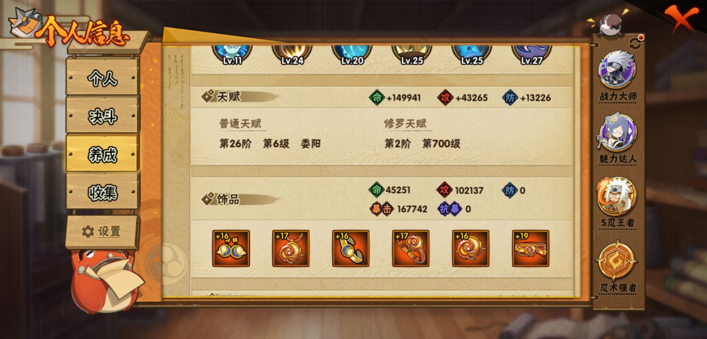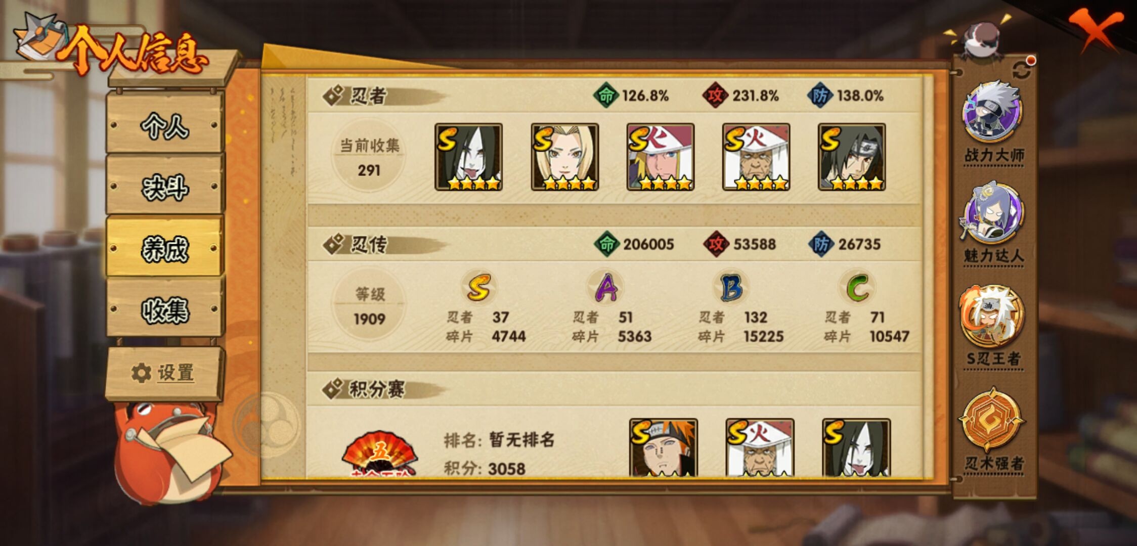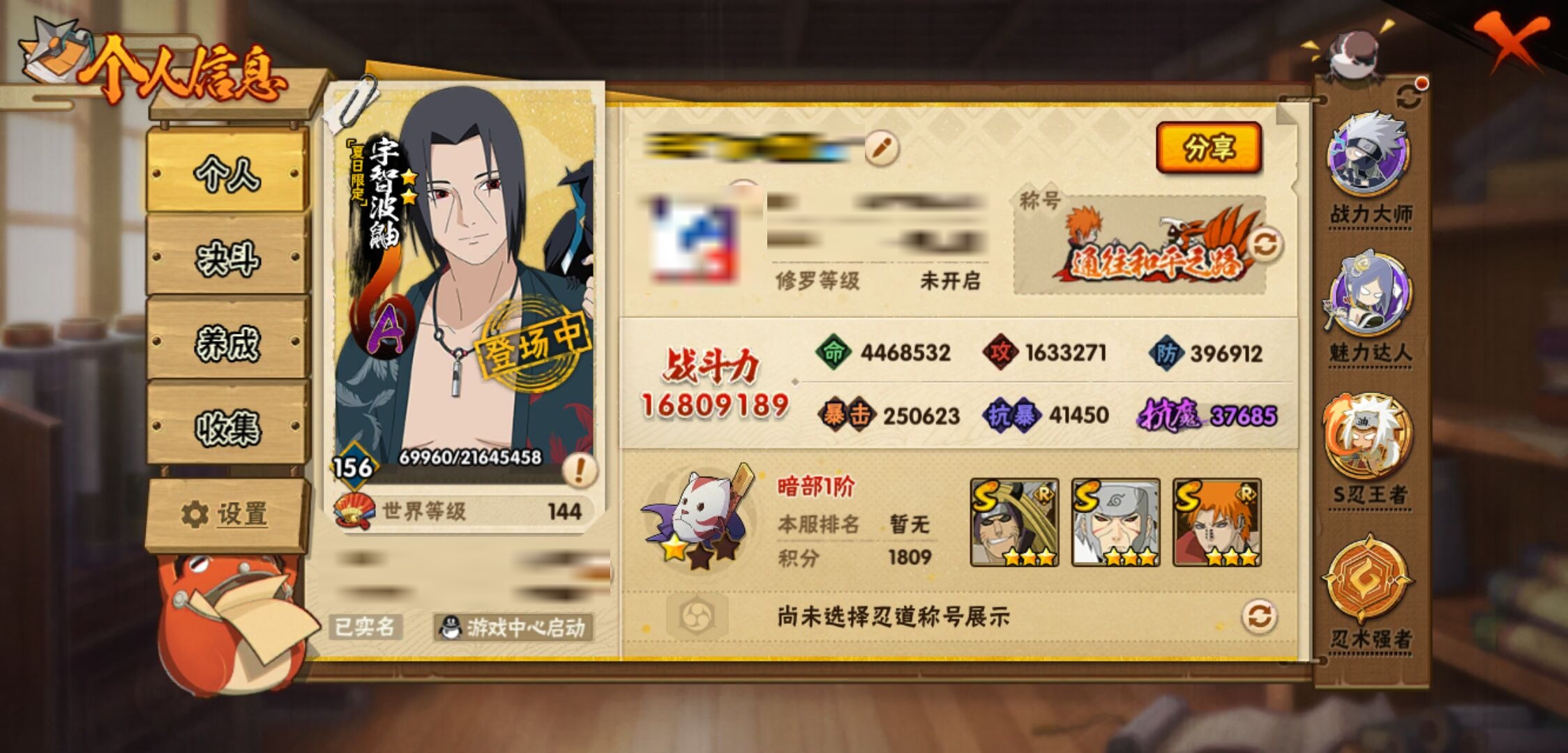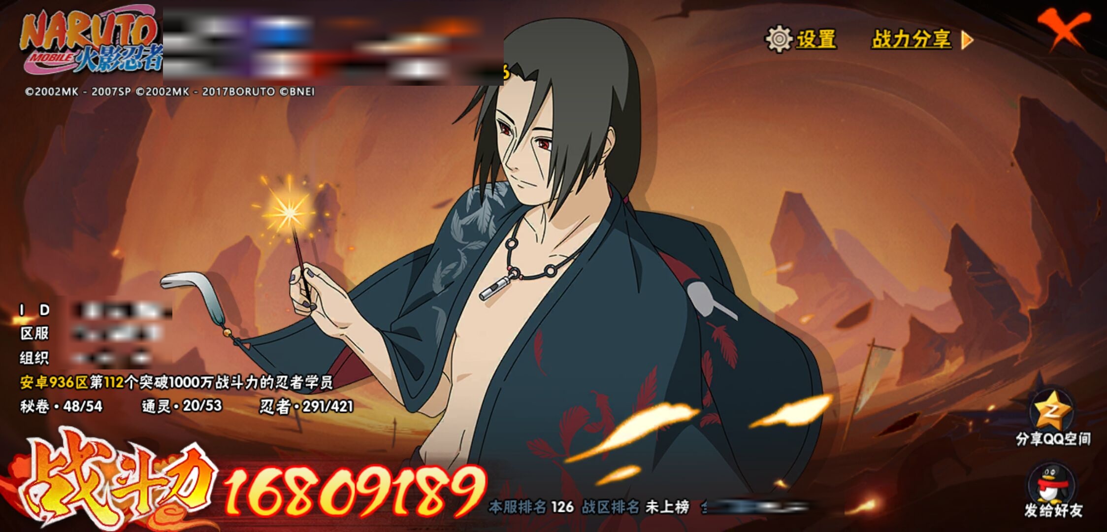 【火影忍者】【lyhy10713】战斗力:1680w;段位:暗部1阶;本服排名:126;vip:v13级;s忍:37个;a忍:51个;通灵兽:19个,s忍:秽土转生解宇智波斑|白面具宇智波斑|忍界大战宇智波带土|秽土转生千手扉间|超佩恩天道|天道佩恩 4星|传说中的三忍自来也|漩涡鸣人宇智波佐助|秽土转生千手柱间|木叶创立宇智波斑|秽土转生宇智波鼬|永恒万花筒宇智波佐助|忍界大战艾|舞之豪杰自来也|大蛇丸(普通) 4星|纲手(普通) 4星|百豪纲手|波风水门 4星|秽土转生波风水门|秽土转生宇智波斑|宇智波斑(普通)|须佐能乎宇智波鼬 4星|神秘面具男(普通)|秽土转生长门|秽土转生半藏|秽土转生金角银角|二代目土影无|三代目雷影艾|四代目风影罗砂|仙人模式药师兜|死门迈特凯|忍界大战大野木|九喇嘛连结漩涡鸣人|猿飞日斩(普通) 4星|秽土转生猿飞日斩|自来也(普通)|暴怒第六尾漩涡鸣人__a忍:青春爆炸迈特凯|仙人模式巳月|忍界大战日向宁次|四代目土影黑土|木叶上忍猿飞木叶丸 3星|青年长门|秽土转生迪达拉|宇智波止水(普通)|不风|忍界大战奇拉比|青年波风水门|青年艾|近松十人卫千代|半蛇斗篷药师兜|须佐能乎宇智波佐助|九尾查克拉漩涡鸣人 3星|暴怒宇智波带土|晓大蛇丸|百豪春野樱|忍界大战秋道丁次|忍界大战我爱罗|秽土转生猿飞阿斯玛|新春限定波风水门|夏日泳装小南|奇拉比(普通)|万花筒写轮眼宇智波佐助|五代目水影照美冥|五代目雷影达鲁伊|死司凭血飞段 4星|角都(普通)|疾风传我爱罗 4星|迪达拉(普通)|飞段(普通) 4星|小南(普通)|漂泊浪客小南|仙人模式漩涡鸣人 3星|万花筒写轮眼旗木卡卡西|迈特凯(普通) 5星|宇智波鼬(普通)|夏日限定宇智波鼬|干柿鬼鲛(普通) 5星|秽土转生桃地再不斩|桃地再不斩|蝎(普通) 5星|绯流琥蝎|猿飞阿斯玛(普通) 5星|桃式显现漩涡博人|六代目水影长十郎|宇智波泉奈|羁绊神农|初始形态机械鸣人__通灵兽:忍犬(普通)|蓝蛇|蛤蟆吉|忍龟|镰鼬|猿魔|山椒鱼|蜃|蛞蝓(普通)|蛤蟆仙人|鲛鲨|蛤蟆健|乌鸦(普通)|蛤蟆龙|砂之守鹤|蛤蟆广|梦貘|鹰|熊猫