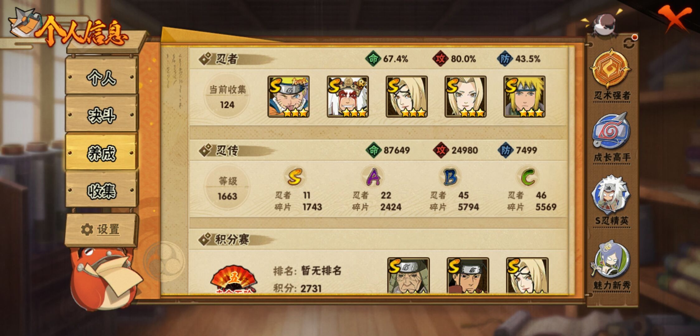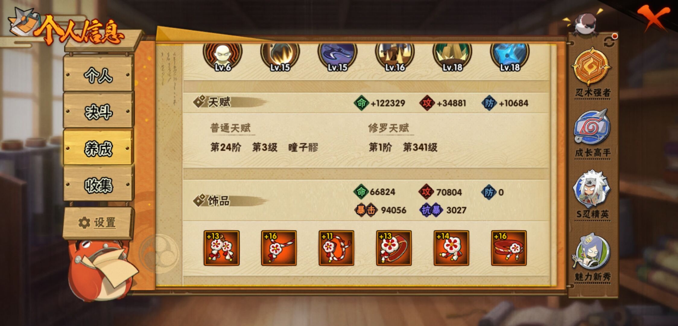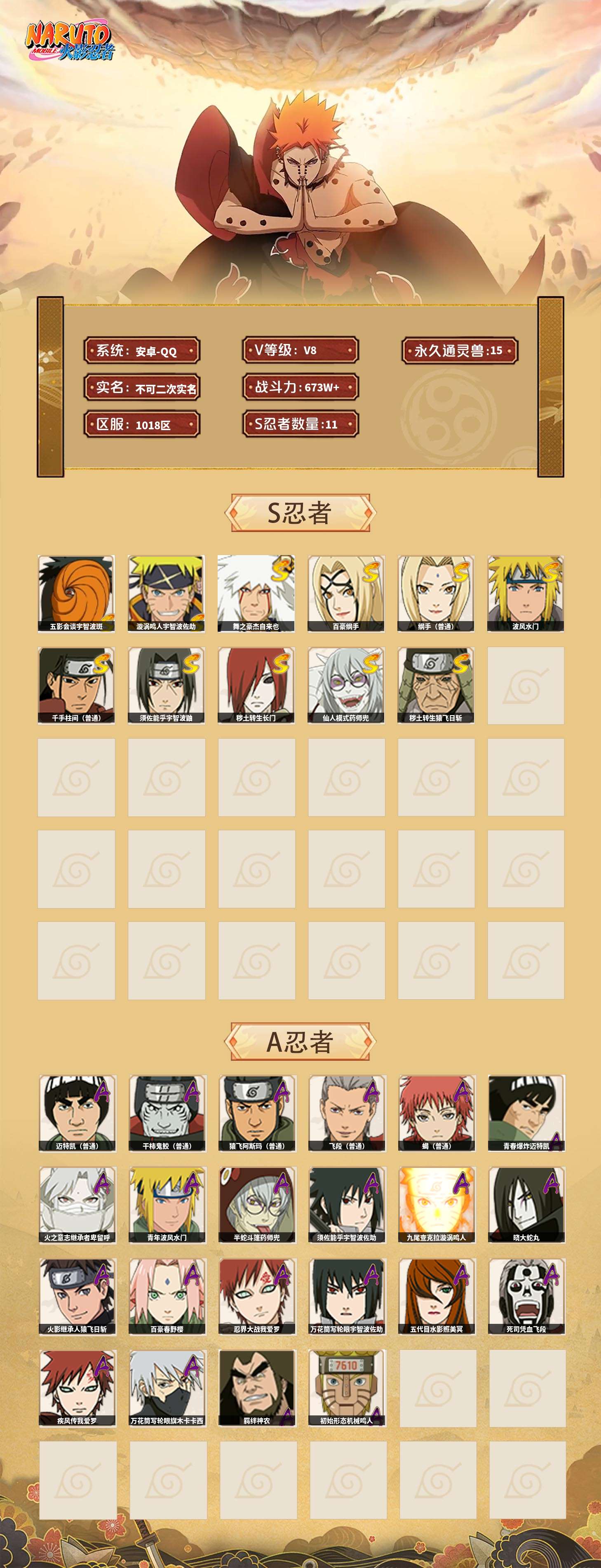 【火影忍者】【lyhy10718】战斗力:673w;段位:暗部3阶;本服排名:2147;vip:v8级;s忍:11个;a忍:22个;通灵兽:15个,s忍:五影会谈宇智波斑|漩涡鸣人宇智波佐助|舞之豪杰自来也|百豪纲手|纲手(普通)|波风水门|千手柱间(普通)|须佐能乎宇智波鼬|秽土转生长门|仙人模式药师兜|秽土转生猿飞日斩__a忍:青春爆炸迈特凯|火之意志继承者卑留呼|青年波风水门|半蛇斗篷药师兜|须佐能乎宇智波佐助|九尾查克拉漩涡鸣人|晓大蛇丸|火影继承人猿飞日斩|百豪春野樱|忍界大战我爱罗|万花筒写轮眼宇智波佐助|五代目水影照美冥|死司凭血飞段|疾风传我爱罗|飞段(普通) 3星|万花筒写轮眼旗木卡卡西|迈特凯(普通) 5星|干柿鬼鲛(普通) 5星|蝎(普通) 3星|猿飞阿斯玛(普通) 5星|羁绊神农|初始形态机械鸣人__通灵兽:忍犬(普通)|蓝蛇|蛤蟆吉|忍龟|镰鼬|猿魔|山椒鱼|蜃|蛤蟆仙人|鲛鲨|蛤蟆健|乌鸦(普通)|蛤蟆龙|砂之守鹤|蛤蟆广