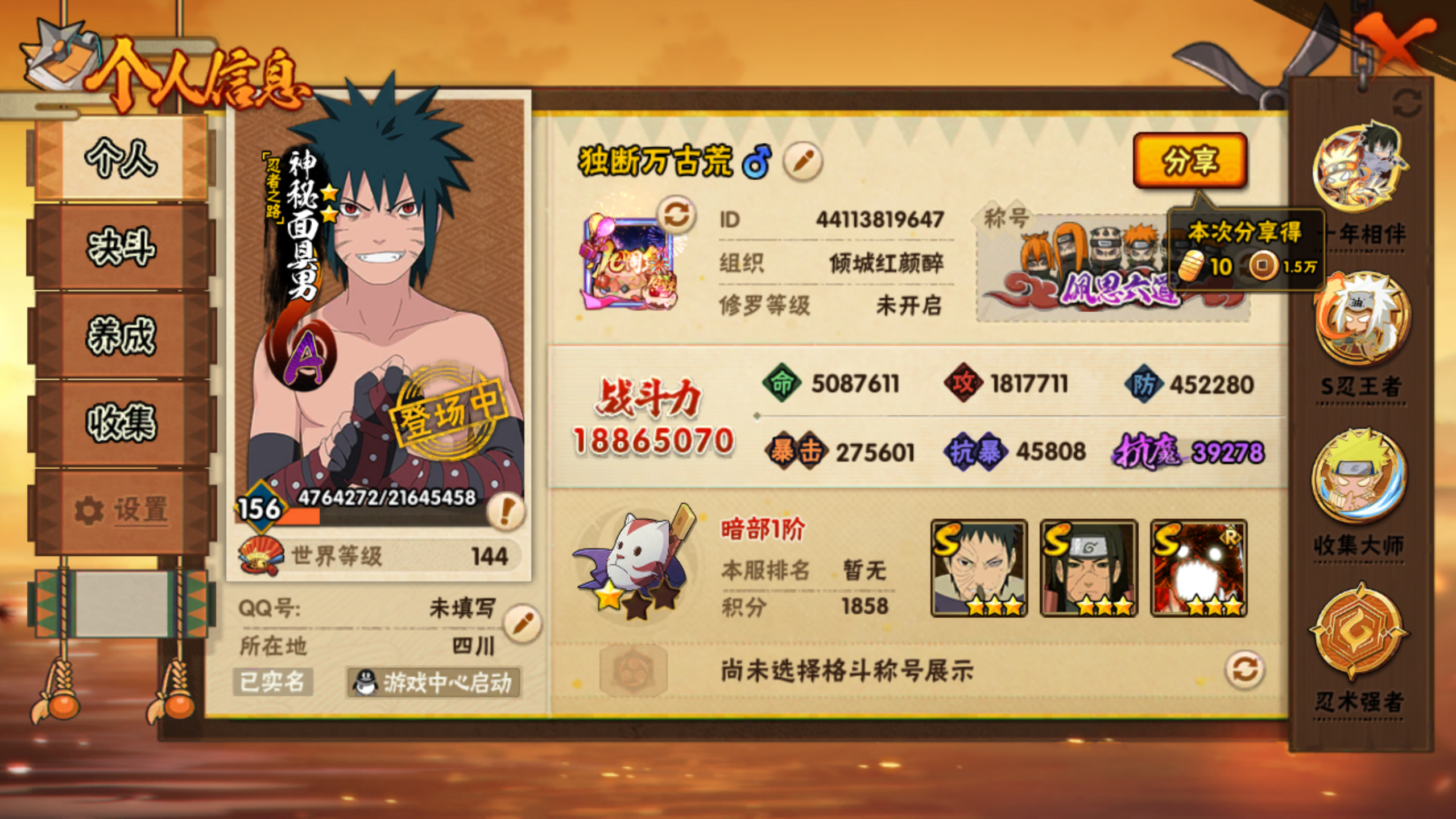 1,战斗力:1887w;vip:v13级