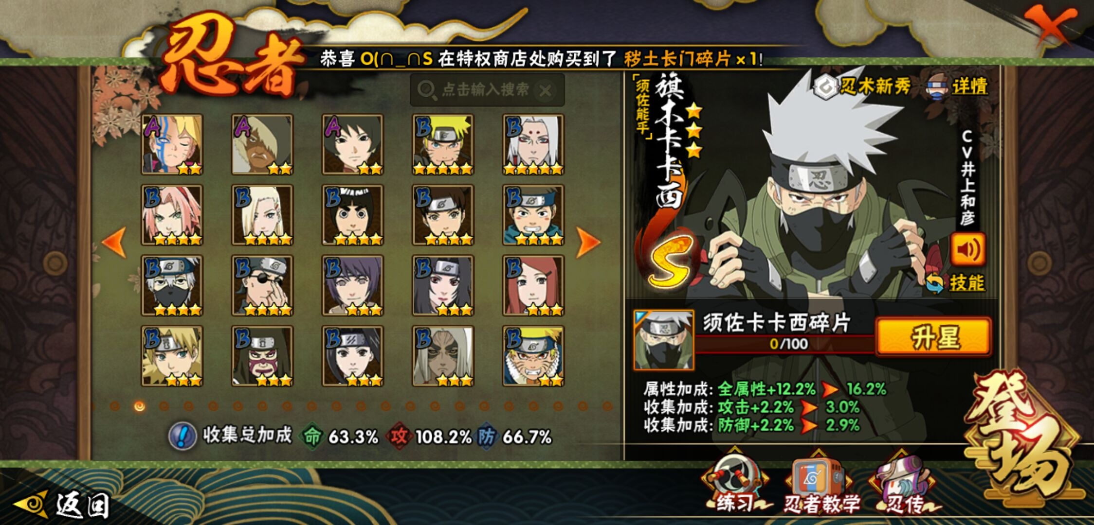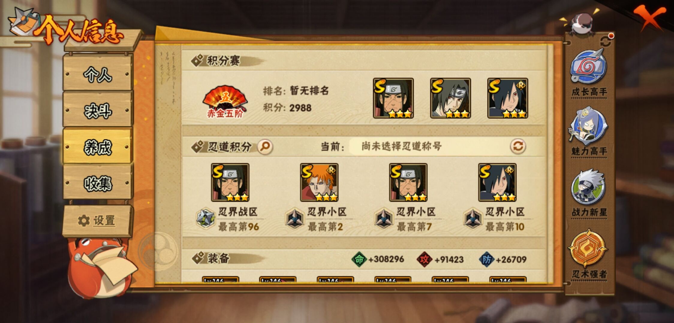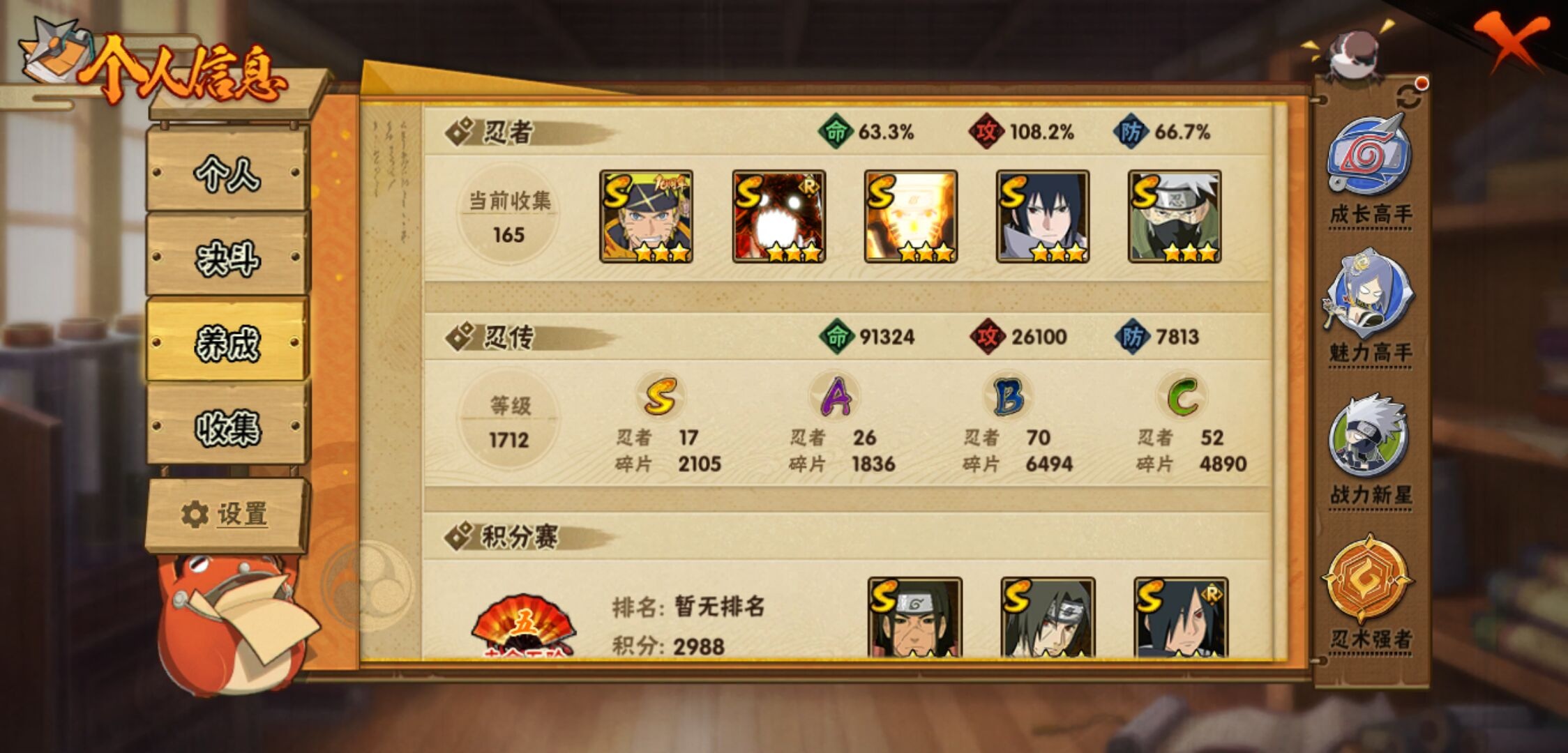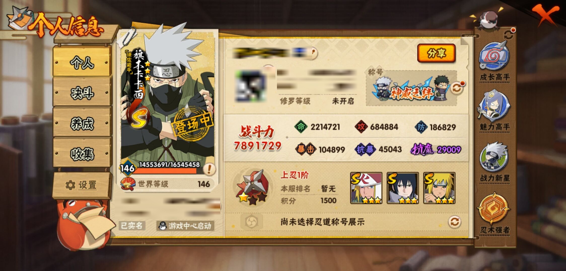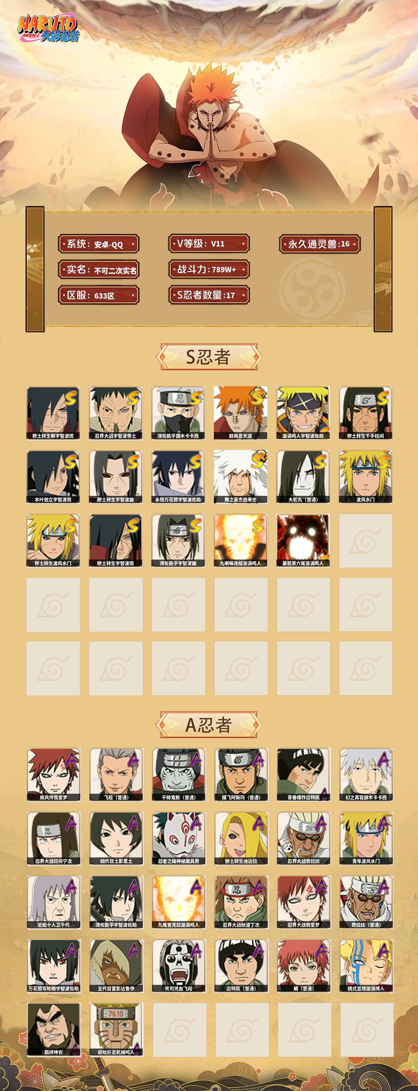 【火影忍者】【lyhy10772】战斗力:789w;段位:上忍1阶;本服排名:879;vip:v11级;s忍:17个;a忍:26个;通灵兽:16个,s忍:秽土转生解宇智波斑|忍界大战宇智波带土|须佐能乎旗木卡卡西|超佩恩天道|漩涡鸣人宇智波佐助|秽土转生千手柱间|木叶创立宇智波斑|秽土转生宇智波鼬|永恒万花筒宇智波佐助|舞之豪杰自来也|大蛇丸(普通)|波风水门|秽土转生波风水门|秽土转生宇智波斑|须佐能乎宇智波鼬|九喇嘛连结漩涡鸣人|暴怒第六尾漩涡鸣人__a忍:青春爆炸迈特凯|幻之真容旗木卡卡西|忍界大战日向宁次|四代目土影黑土|忍者之路神秘面具男|秽土转生迪达拉|忍界大战奇拉比|青年波风水门|近松十人卫千代|须佐能乎宇智波佐助|九尾查克拉漩涡鸣人|忍界大战秋道丁次|忍界大战我爱罗|奇拉比(普通)|万花筒写轮眼宇智波佐助|五代目雷影达鲁伊|死司凭血飞段|疾风传我爱罗 3星|飞段(普通) 3星|迈特凯(普通)|干柿鬼鲛(普通) 3星|蝎(普通)|猿飞阿斯玛(普通) 3星|桃式显现漩涡博人|羁绊神农|初始形态机械鸣人__通灵兽:忍犬(普通)|蓝蛇|蛤蟆吉|忍龟|镰鼬|猿魔|山椒鱼|砂之守鹤|蜃|蛤蟆仙人|鲛鲨|蛤蟆健|乌鸦(普通)|蛞蝓(普通)|蛤蟆龙|蛤蟆广