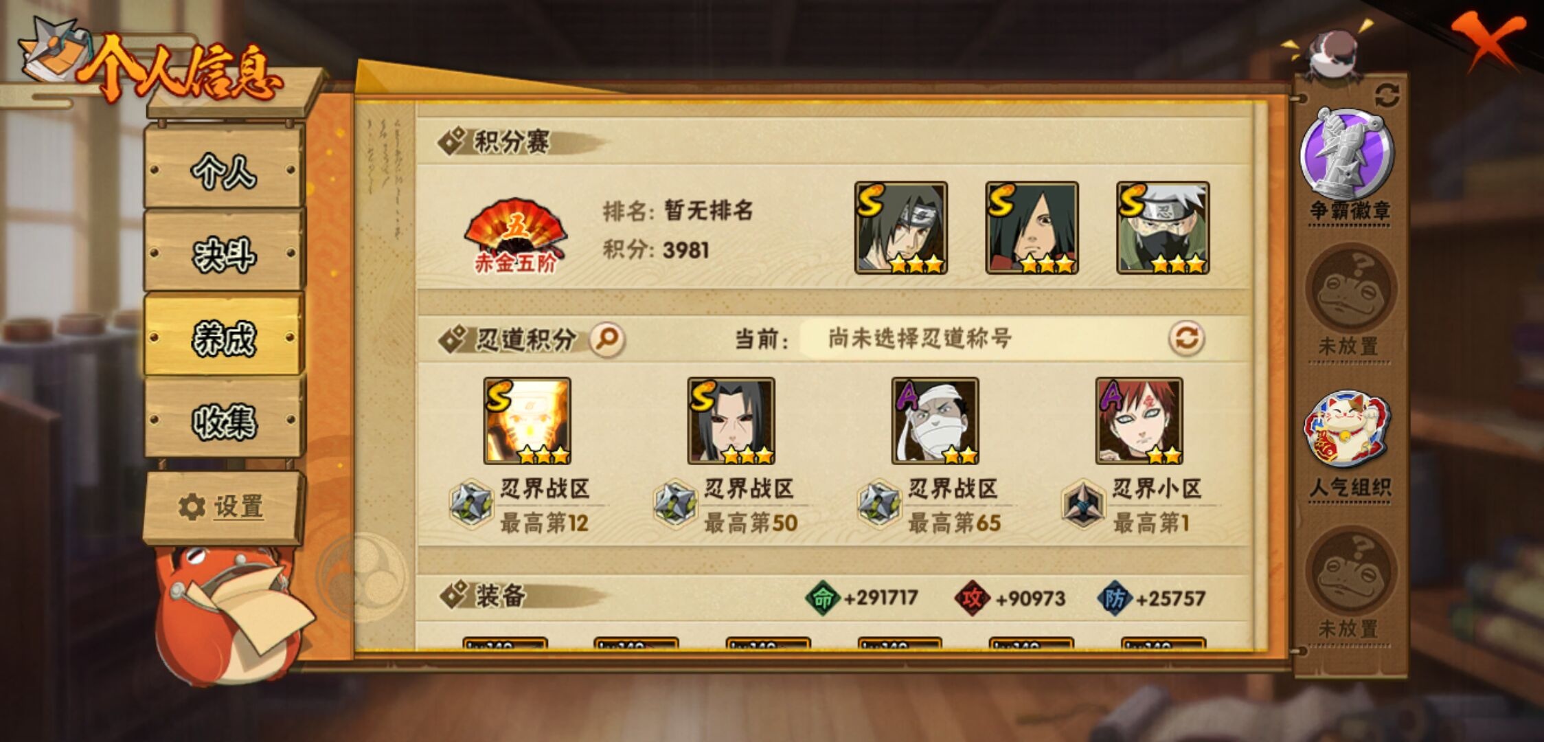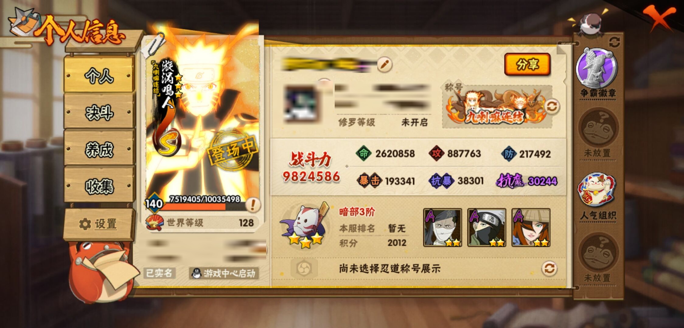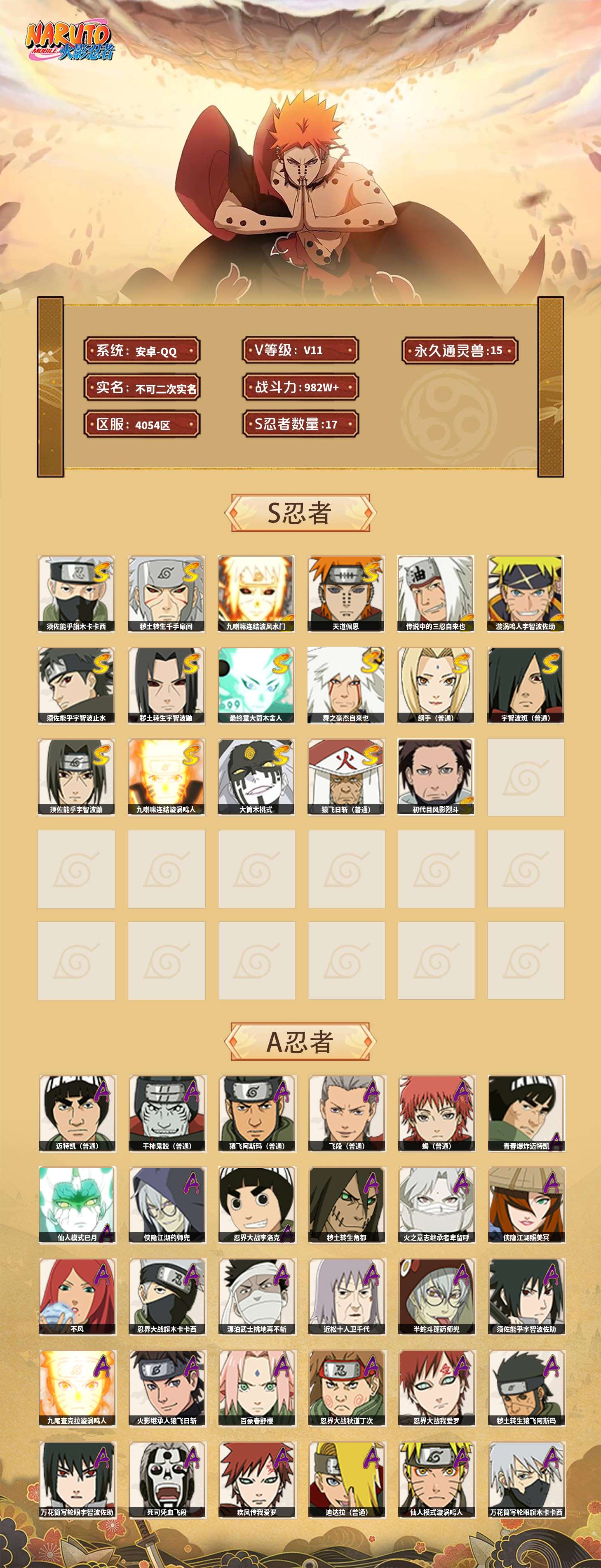 【火影忍者】【lyhy10750】战斗力:982w;段位:暗部3阶;本服排名:51;vip:v11级;s忍:17个;a忍:37个;通灵兽:15个,s忍:须佐能乎旗木卡卡西|秽土转生千手扉间|九喇嘛连结波风水门|天道佩恩|传说中的三忍自来也|漩涡鸣人宇智波佐助|须佐能乎宇智波止水|秽土转生宇智波鼬|最终章大筒木舍人|舞之豪杰自来也|纲手(普通)|宇智波斑(普通)|须佐能乎宇智波鼬|九喇嘛连结漩涡鸣人|大筒木桃式|猿飞日斩(普通)|初代目风影烈斗__a忍:青春爆炸迈特凯|仙人模式巳月|侠隐江湖药师兜|忍界大战李洛克|秽土转生角都|火之意志继承者卑留呼|侠隐江湖照美冥|不风|忍界大战旗木卡卡西|漂泊武士桃地再不斩|近松十人卫千代|半蛇斗篷药师兜|须佐能乎宇智波佐助|九尾查克拉漩涡鸣人|火影继承人猿飞日斩|百豪春野樱|忍界大战秋道丁次|忍界大战我爱罗|秽土转生猿飞阿斯玛|万花筒写轮眼宇智波佐助|死司凭血飞段|疾风传我爱罗|迪达拉(普通)|飞段(普通) 3星|仙人模式漩涡鸣人|万花筒写轮眼旗木卡卡西|迈特凯(普通) 5星|宇智波鼬(普通)|夏日限定宇智波鼬|干柿鬼鲛(普通) 5星|秽土转生桃地再不斩|蝎(普通) 3星|绯流琥蝎|猿飞阿斯玛(普通) 5星|宇智波泉奈|忍界大战土台|初始形态机械鸣人__通灵兽:忍犬(普通)|蓝蛇|蛤蟆吉|忍龟|砂之守鹤|镰鼬|猿魔|山椒鱼|蜃|蛤蟆仙人|鲛鲨|蛤蟆健|蛤蟆广|乌鸦(普通)|蛤蟆龙