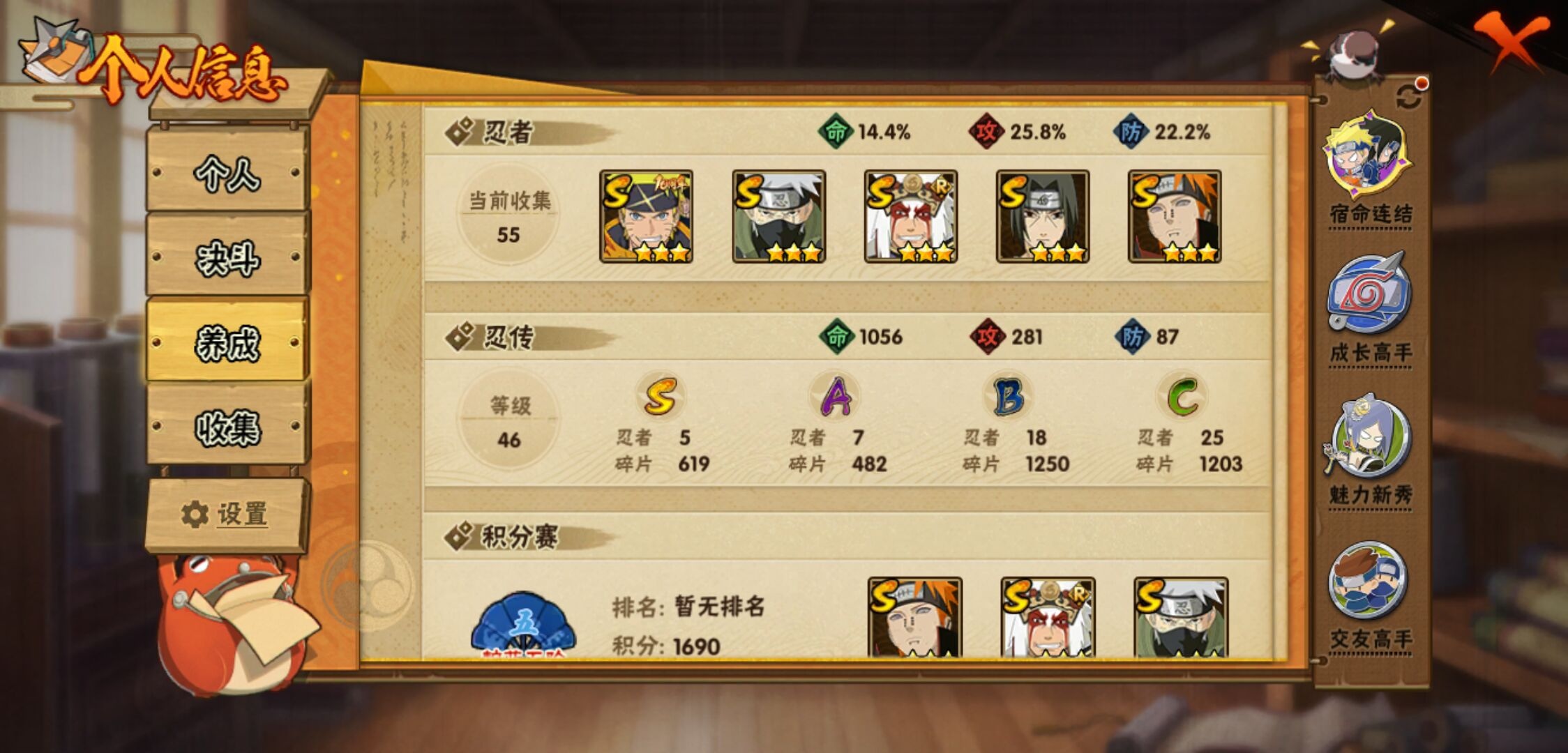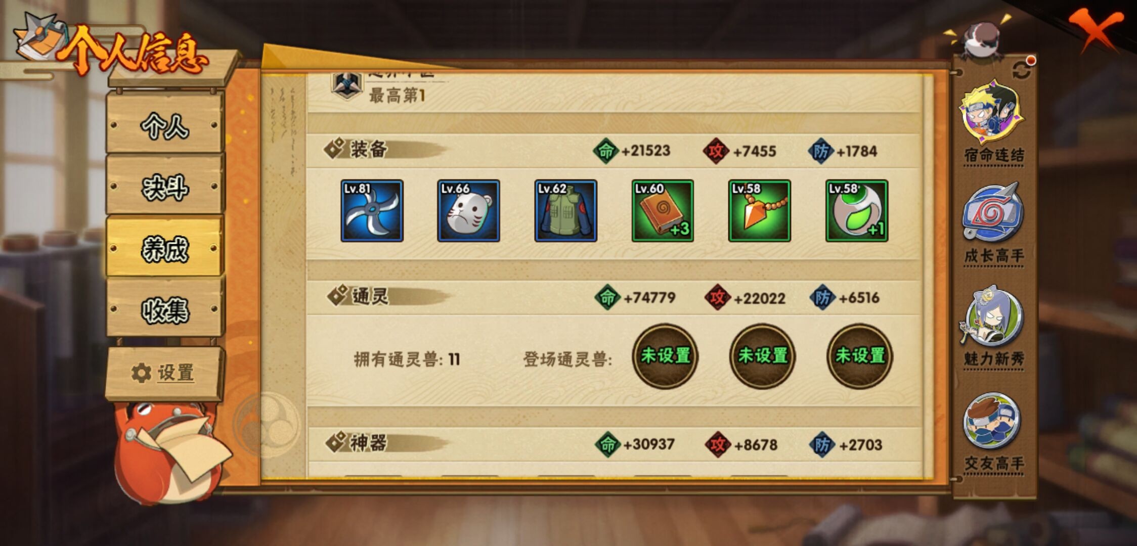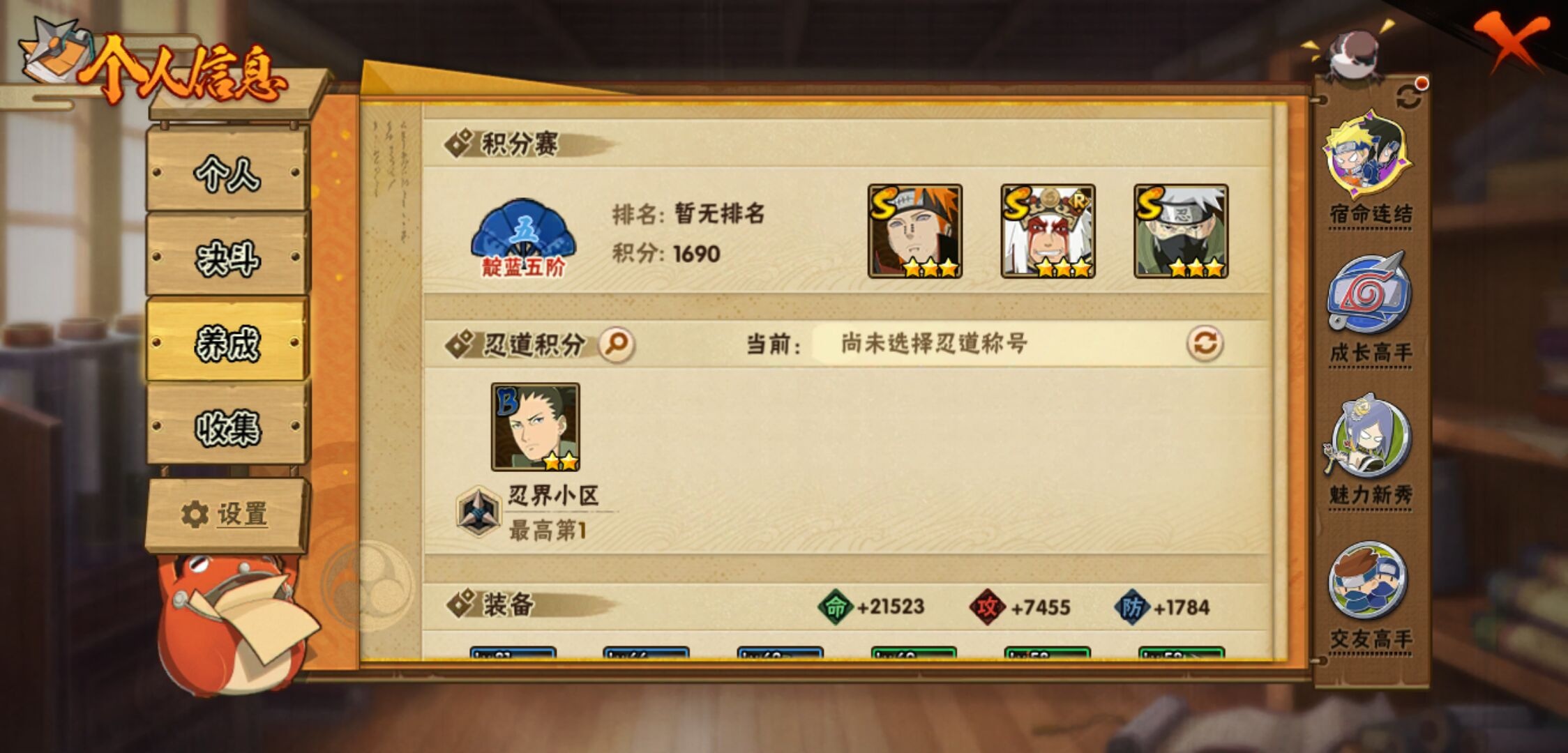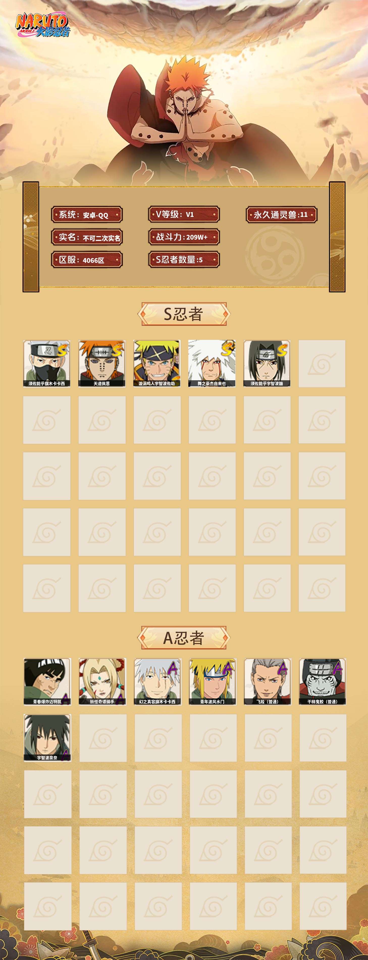 【火影忍者】【lyhy10748】战斗力:209w;段位:见习1阶;本服排名:3904;vip:v1级;s忍:5个;a忍:7个;通灵兽:11个,s忍:须佐能乎旗木卡卡西|天道佩恩|漩涡鸣人宇智波佐助|舞之豪杰自来也|须佐能乎宇智波鼬__a忍:青春爆炸迈特凯|妖怪奇谭纲手|幻之真容旗木卡卡西|青年波风水门|飞段(普通)|干柿鬼鲛(普通)|宇智波泉奈__通灵兽:忍犬(普通)|蓝蛇|蛤蟆吉|忍龟|砂之守鹤|镰鼬|猿魔|山椒鱼|蜃|蛤蟆仙人|鲛鲨