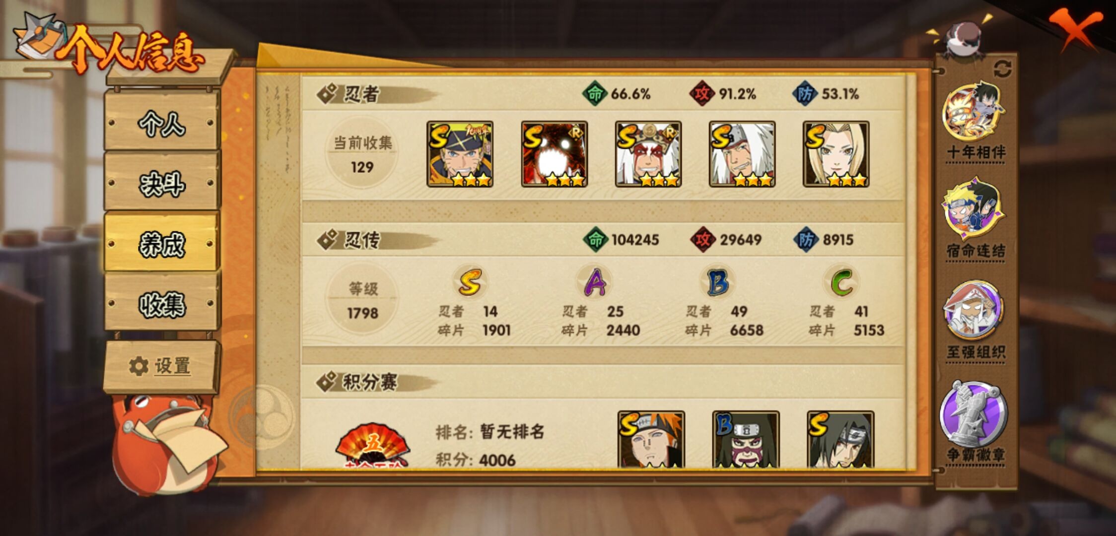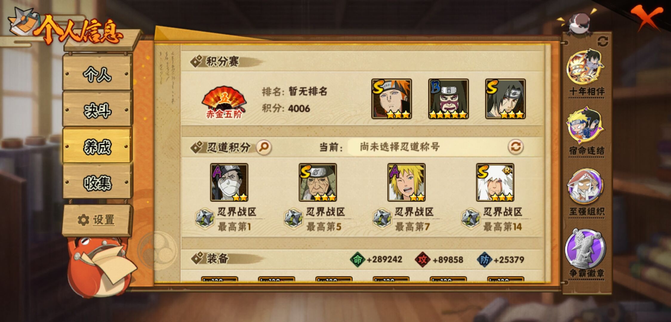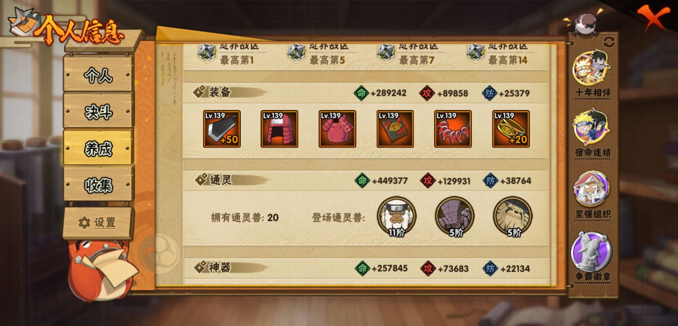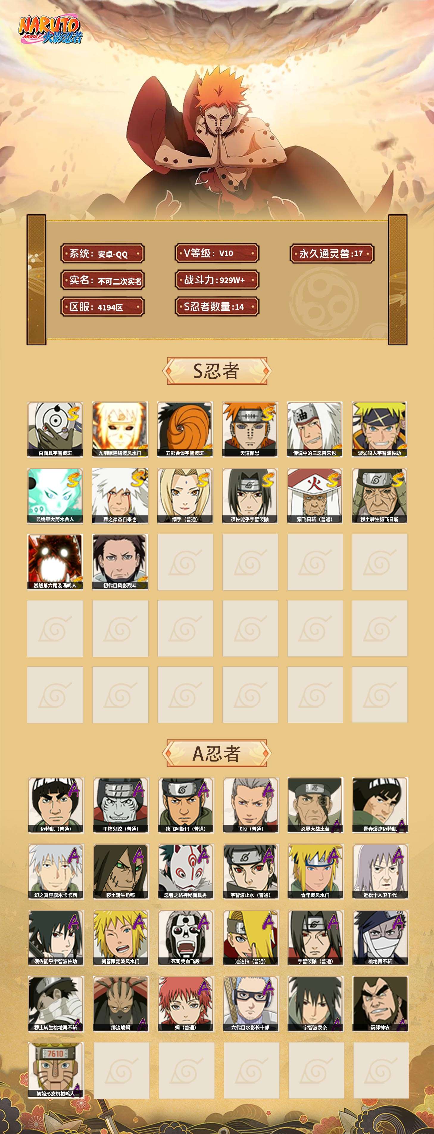 【火影忍者】【lyhy10759】战斗力:929w;段位:上忍1阶;本服排名:43;vip:v10级;s忍:14个;a忍:25个;通灵兽:17个,s忍:白面具宇智波斑|九喇嘛连结波风水门|五影会谈宇智波斑|天道佩恩|传说中的三忍自来也|漩涡鸣人宇智波佐助|最终章大筒木舍人|舞之豪杰自来也|纲手(普通)|须佐能乎宇智波鼬|猿飞日斩(普通)|秽土转生猿飞日斩|暴怒第六尾漩涡鸣人|初代目风影烈斗__a忍:青春爆炸迈特凯|幻之真容旗木卡卡西|秽土转生角都|忍者之路神秘面具男|宇智波止水(普通)|青年波风水门|近松十人卫千代|须佐能乎宇智波佐助|新春限定波风水门|死司凭血飞段|迪达拉(普通)|飞段(普通) 3星|迈特凯(普通) 5星|宇智波鼬(普通)|干柿鬼鲛(普通) 5星|桃地再不斩|秽土转生桃地再不斩|绯流琥蝎|蝎(普通)|猿飞阿斯玛(普通) 5星|六代目水影长十郎|宇智波泉奈|羁绊神农|忍界大战土台 3星|初始形态机械鸣人__通灵兽:忍犬(普通)|蓝蛇|蛤蟆吉|忍龟|镰鼬|砂之守鹤|猿魔|山椒鱼|蜃|蛤蟆仙人|鲛鲨|蛤蟆健|万蛇|蛞蝓(普通)|乌鸦(普通)|蛤蟆龙|蛤蟆广
