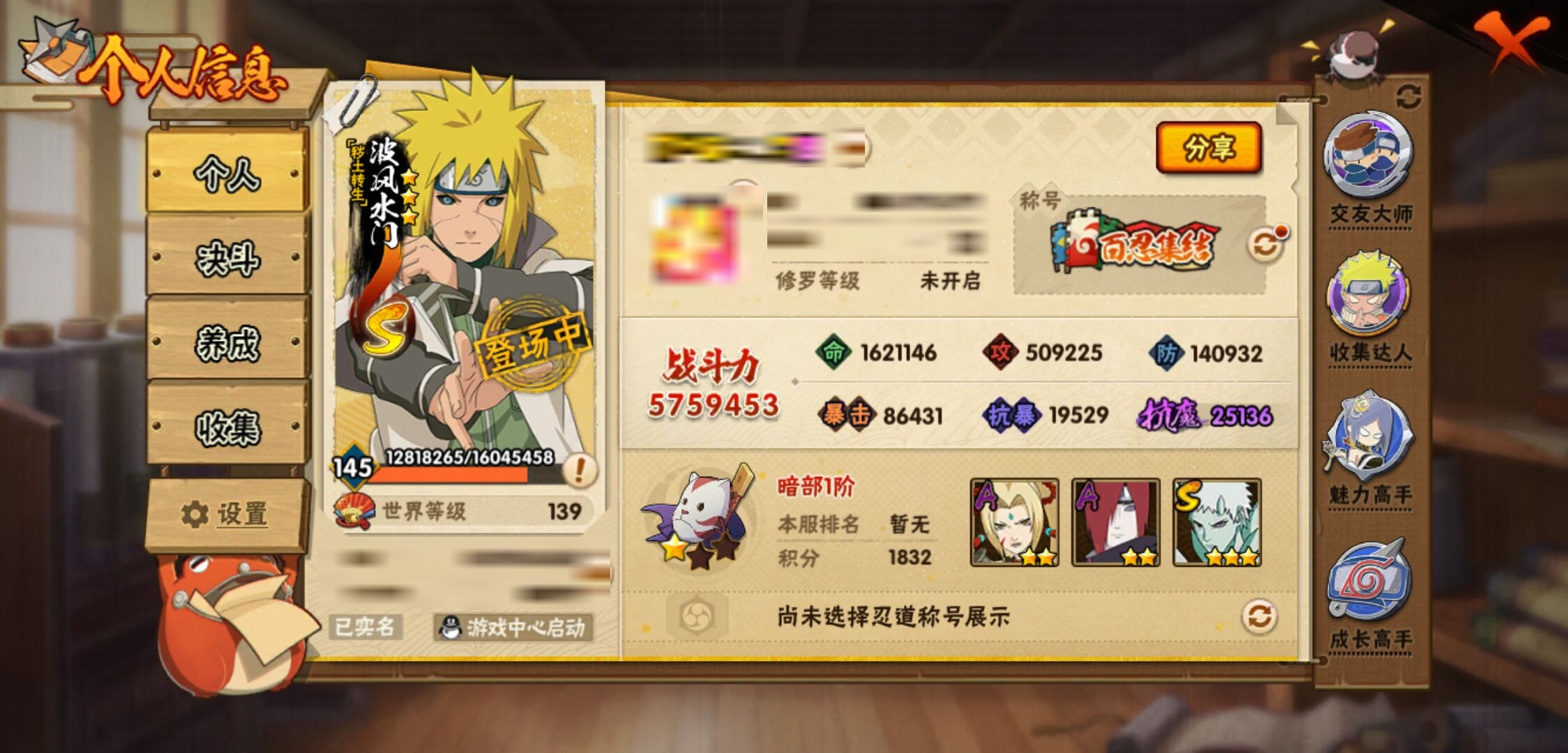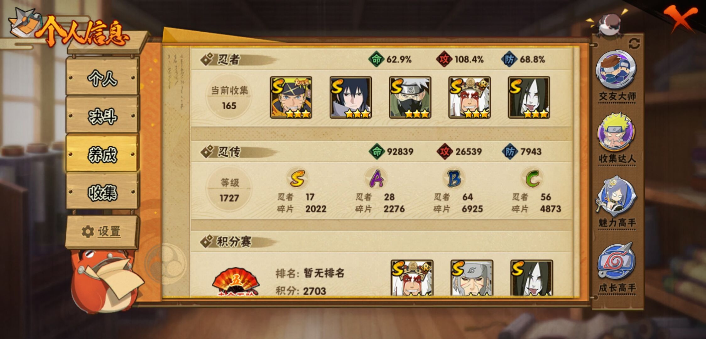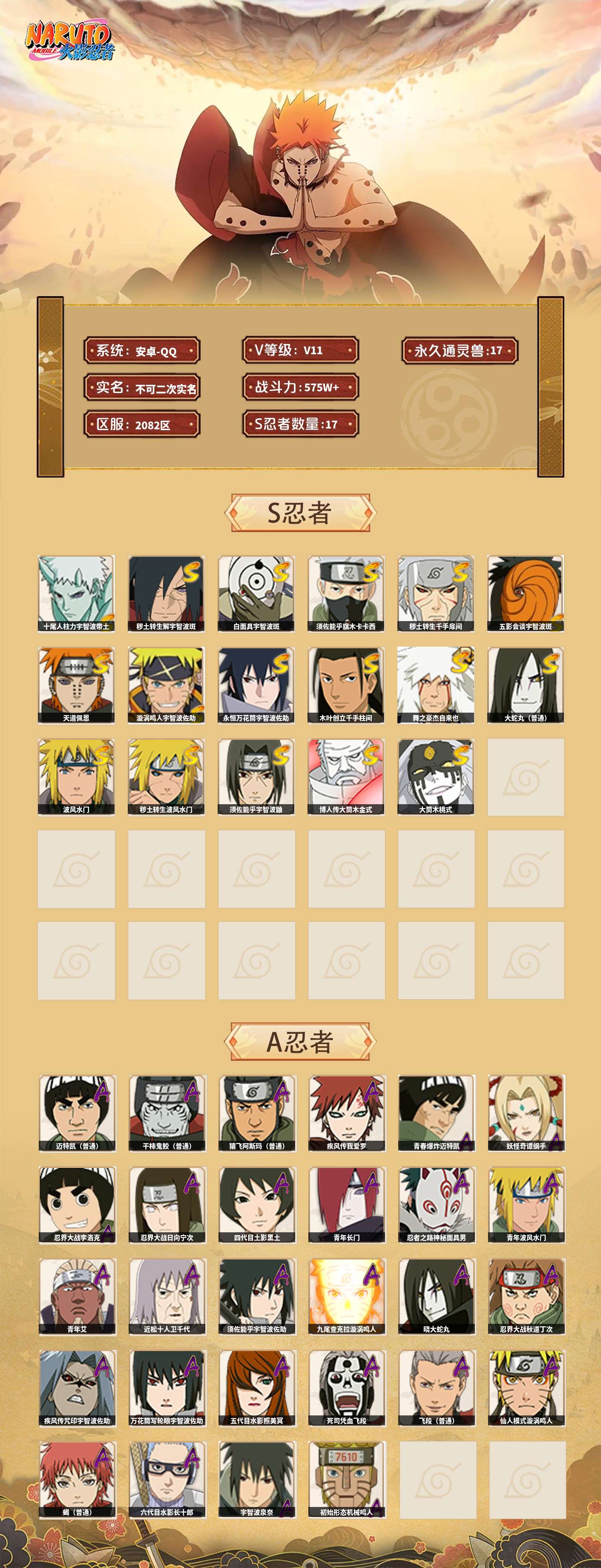 【火影忍者】【lyhy10755】战斗力:575w;段位:暗部1阶;本服排名:796;vip:v11级;s忍:17个;a忍:28个;通灵兽:17个,s忍:十尾人柱力宇智波带土|秽土转生解宇智波斑|白面具宇智波斑|须佐能乎旗木卡卡西|秽土转生千手扉间|五影会谈宇智波斑|天道佩恩|漩涡鸣人宇智波佐助|永恒万花筒宇智波佐助|木叶创立千手柱间|舞之豪杰自来也|大蛇丸(普通)|波风水门|秽土转生波风水门|须佐能乎宇智波鼬|博人传大筒木金式|大筒木桃式__a忍:青春爆炸迈特凯|妖怪奇谭纲手|忍界大战李洛克|忍界大战日向宁次|四代目土影黑土|青年长门|忍者之路神秘面具男|青年波风水门|青年艾|近松十人卫千代|须佐能乎宇智波佐助|九尾查克拉漩涡鸣人|晓大蛇丸|忍界大战秋道丁次|疾风传咒印宇智波佐助|万花筒写轮眼宇智波佐助|五代目水影照美冥|死司凭血飞段|疾风传我爱罗 3星|飞段(普通)|仙人模式漩涡鸣人|迈特凯(普通) 4星|干柿鬼鲛(普通) 4星|蝎(普通)|猿飞阿斯玛(普通) 4星|六代目水影长十郎|宇智波泉奈|初始形态机械鸣人__通灵兽:忍犬(普通)|蓝蛇|砂之守鹤|蛤蟆吉|忍龟|镰鼬|猿魔|山椒鱼|熊猫|蜃|蛤蟆仙人|鲛鲨|蛤蟆健|乌鸦(普通)|蛞蝓(普通)|蛤蟆龙|蛤蟆广
